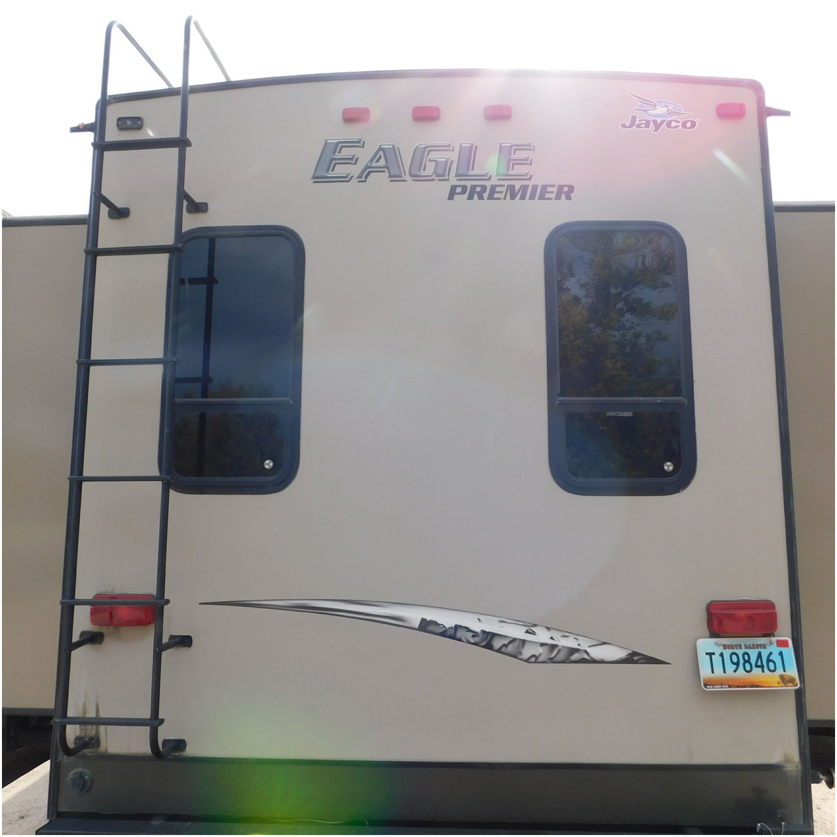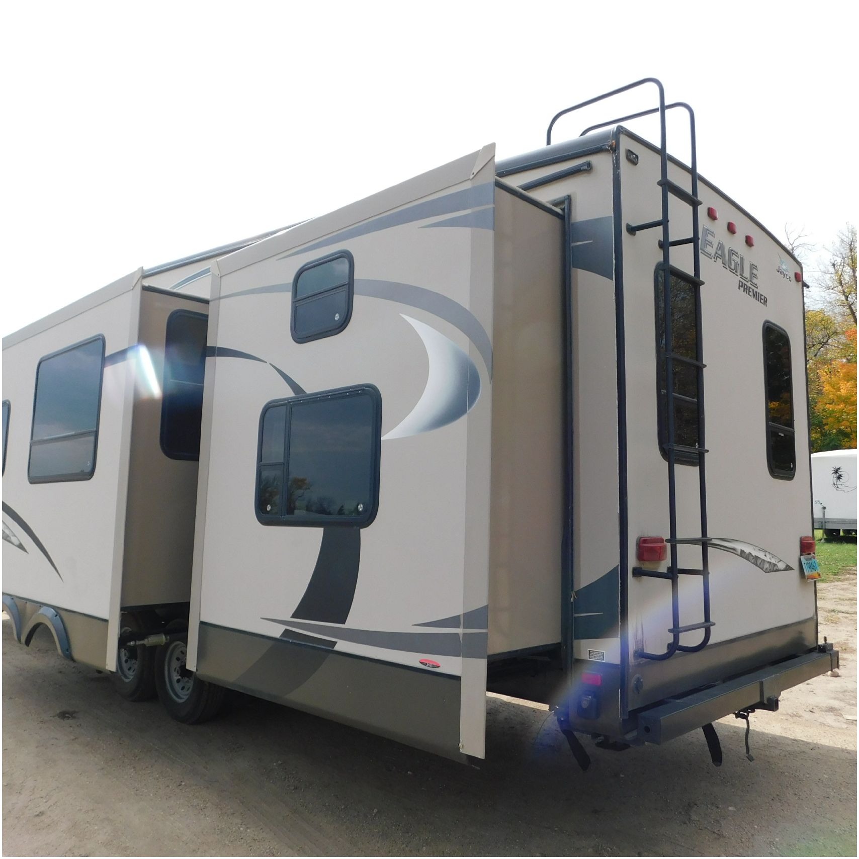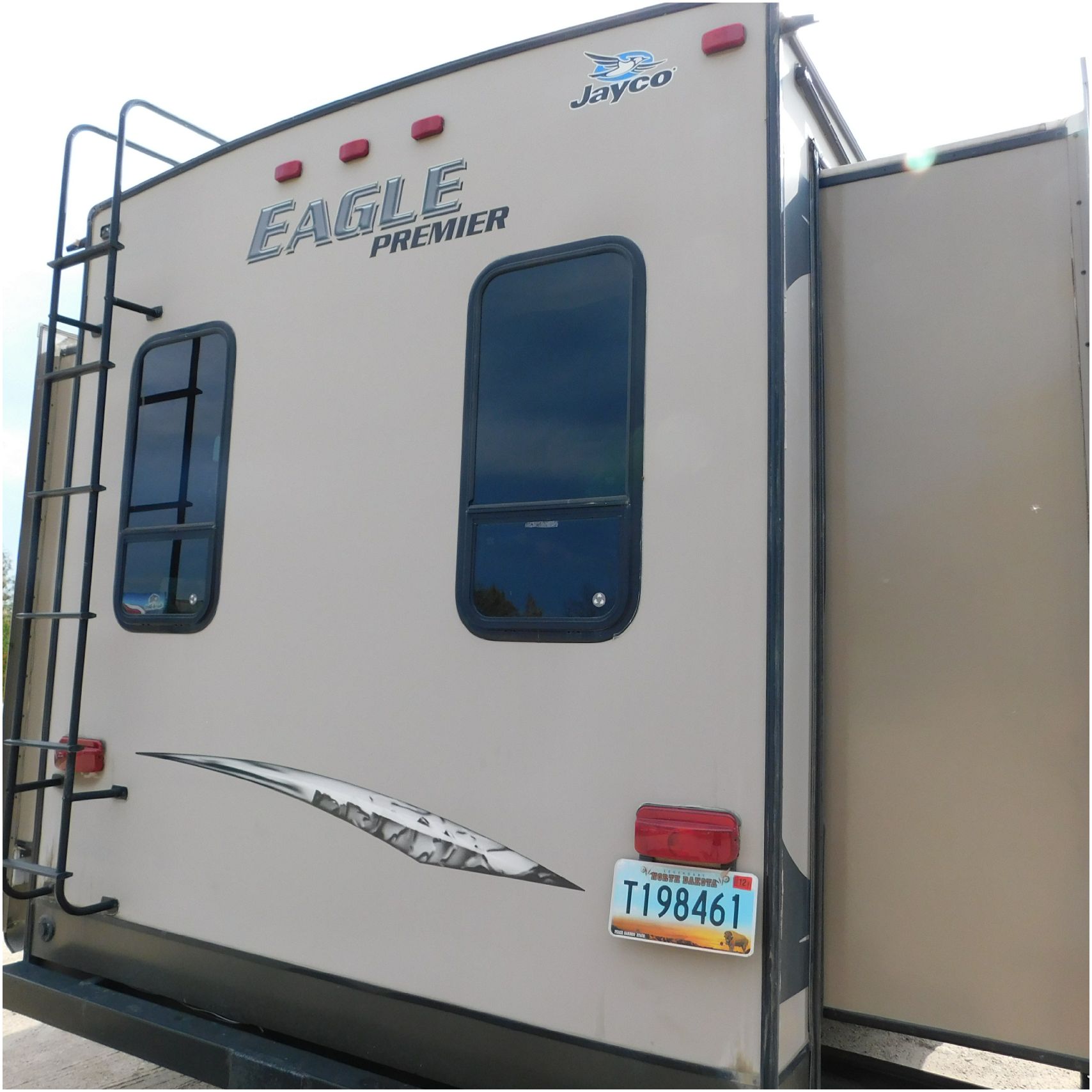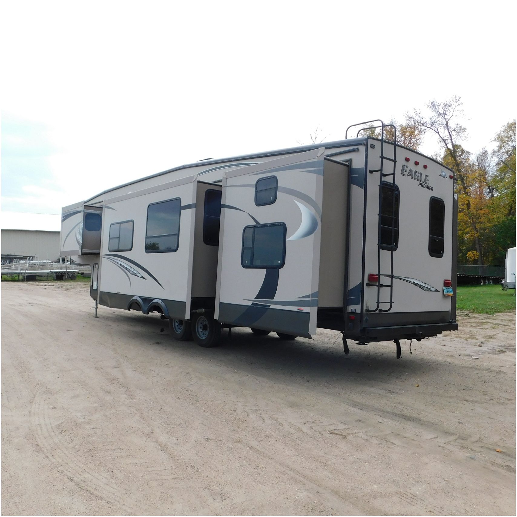 Up for auction is a 2013 Eagle Premier 365BHS. This 40’ 5th wheel camper comes to us with water damage. The front is weathered but in nice shape. The driver side bottom trim is dented. All three slides work as they should. The rear has one marker light lens broke. The passenger slide works as it should. The awing is ripped off. The roof looks to be as it should. We were told the black tank has water damage and caused damage to the underbody. The rear wall was water damage. The trim around the bathroom is broke off. The rest of the inside appears as it should. The floor does feel solid but there may be hidden water damage. Good Luck Bidding on this Camper!