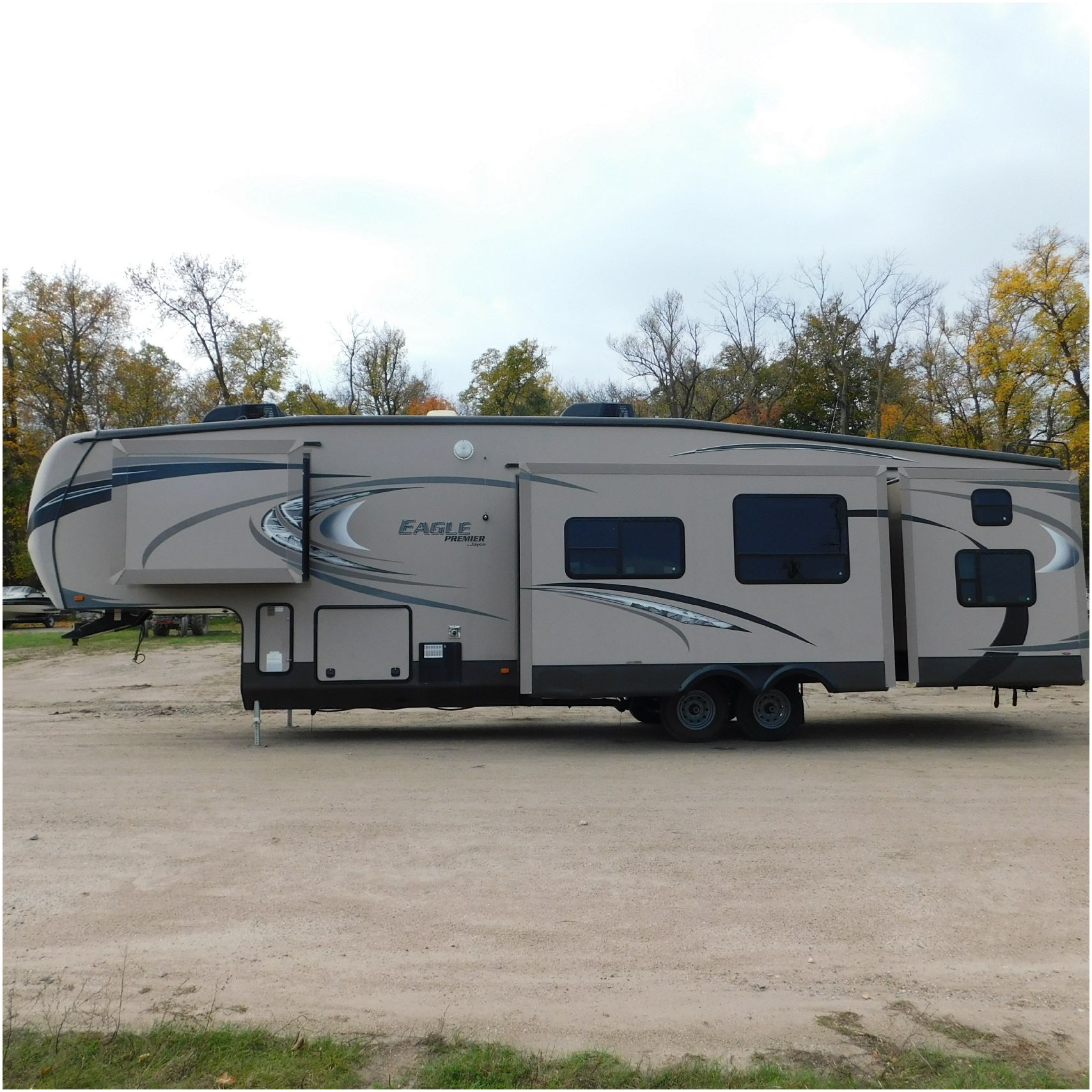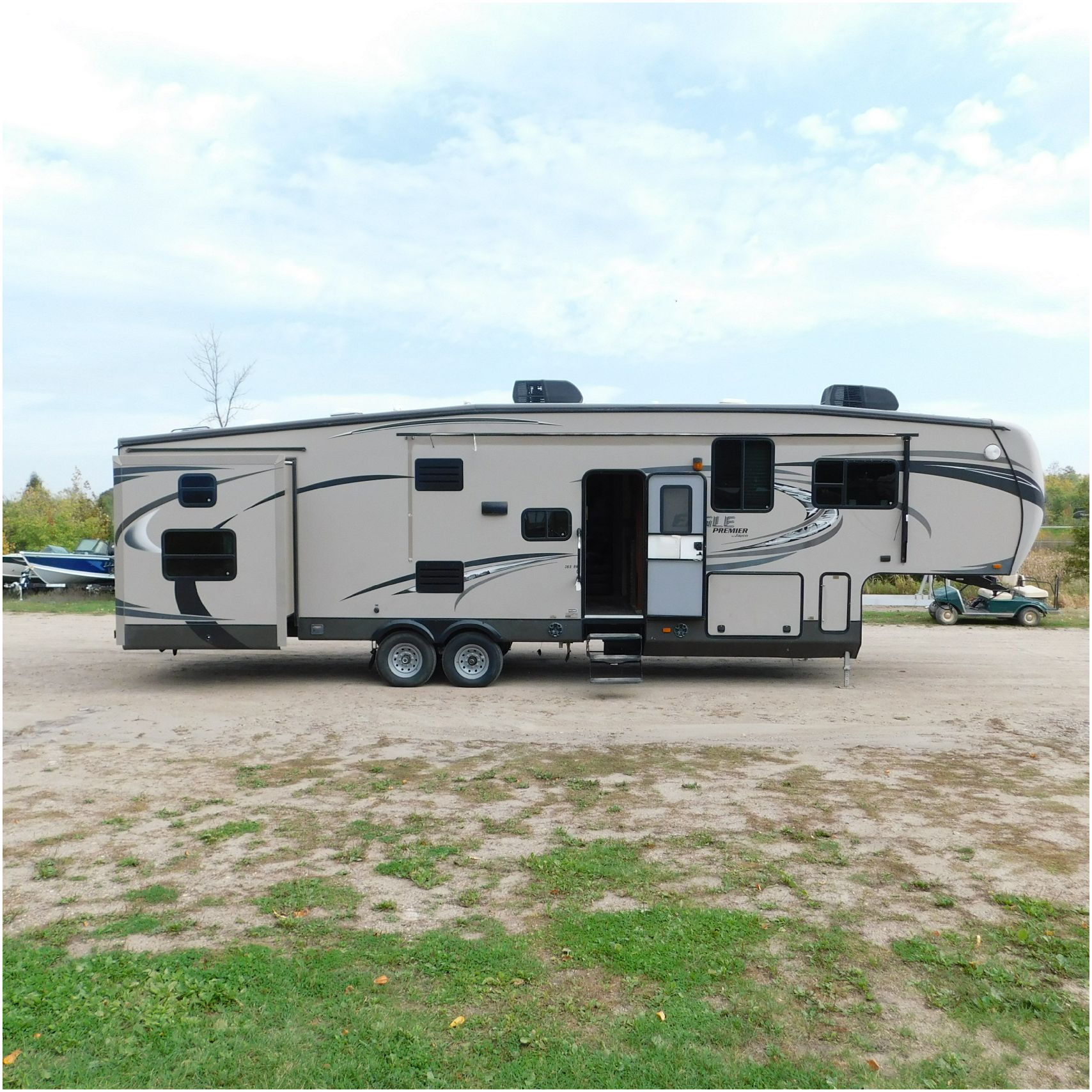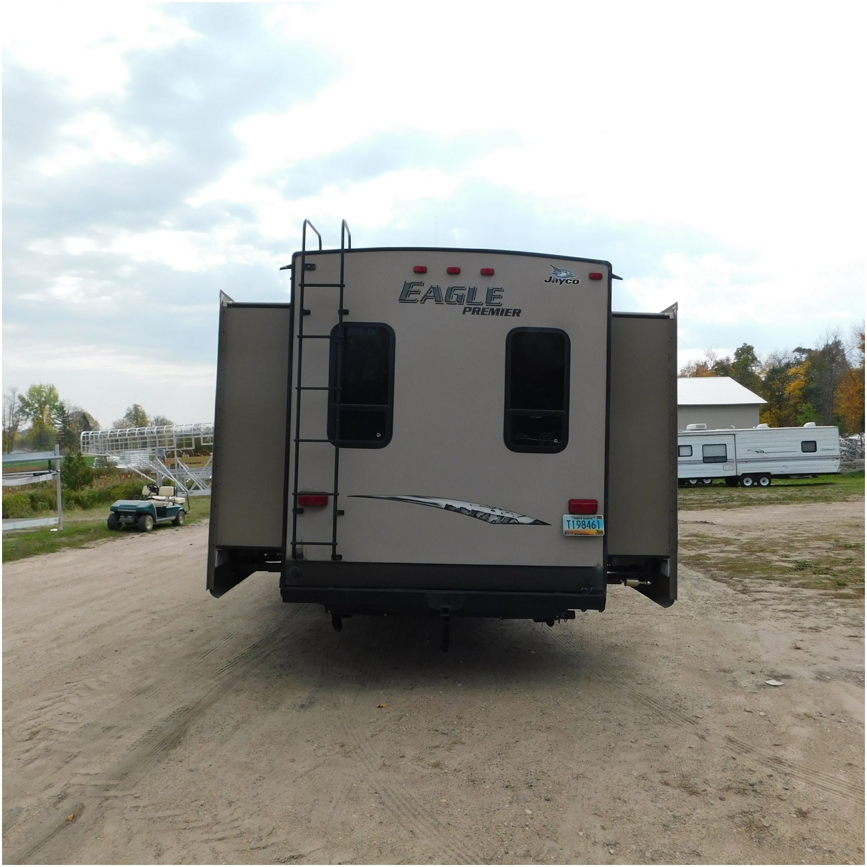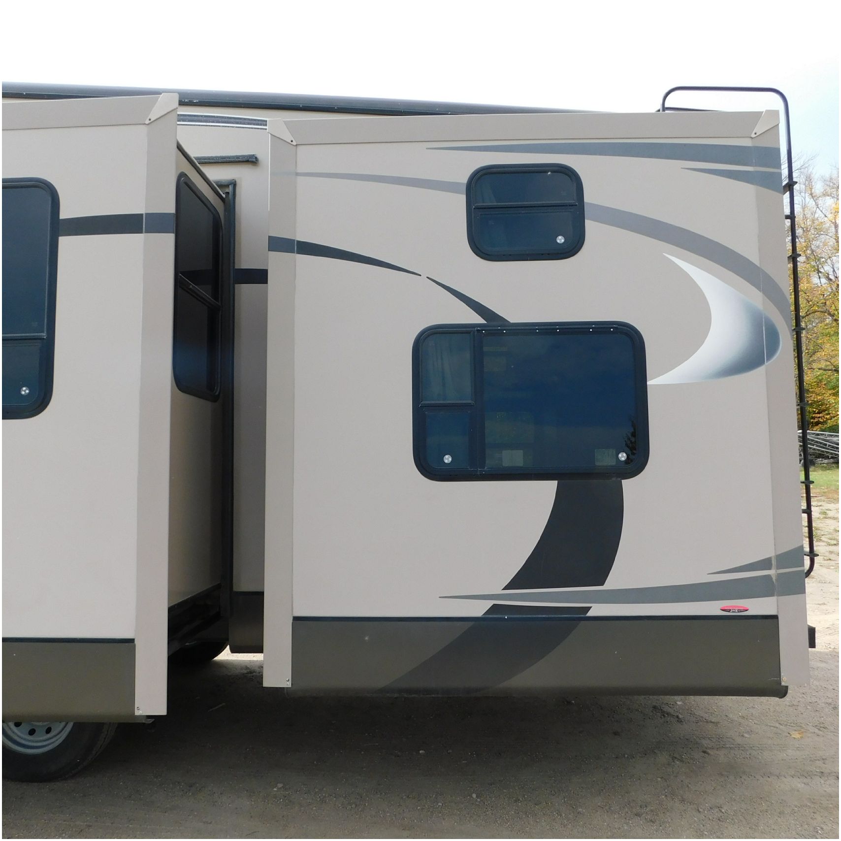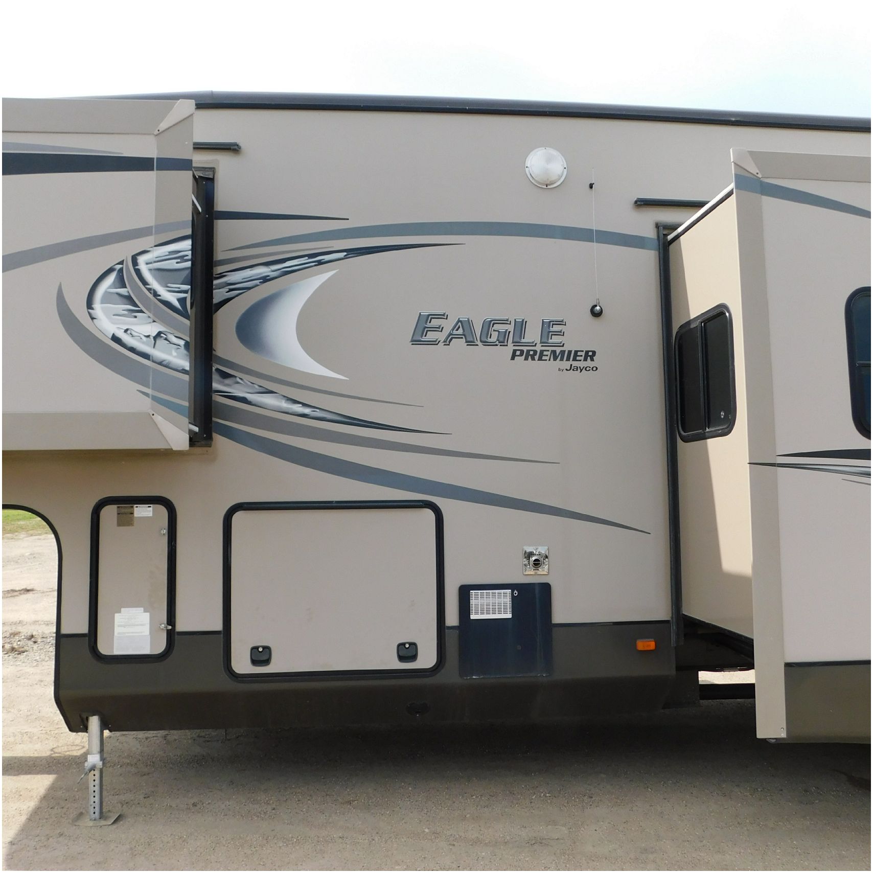 Up for auction is a 2013 Eagle Premier 365BHS. This 40’ 5th wheel camper comes to us with water damage. The front is weathered but in nice shape. The driver side bottom trim is dented. All three slides work as they should. The rear has one marker light lens broke. The passenger slide works as it should. The awing is ripped off. The roof looks to be as it should. We were told the black tank has water damage and caused damage to the underbody. The rear wall was water damage. The trim around the bathroom is broke off. The rest of the inside appears as it should. The floor does feel solid but there may be hidden water damage. Good Luck Bidding on this Camper!
