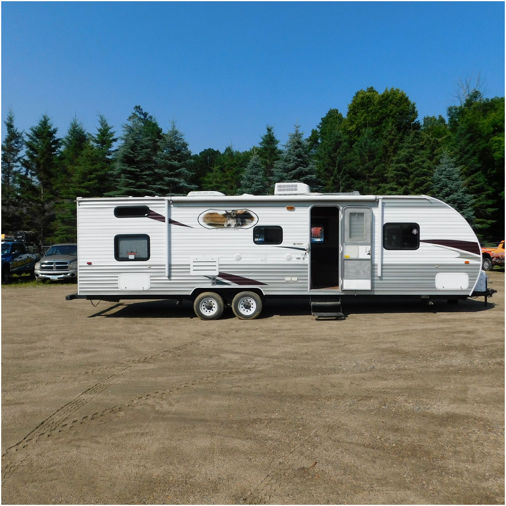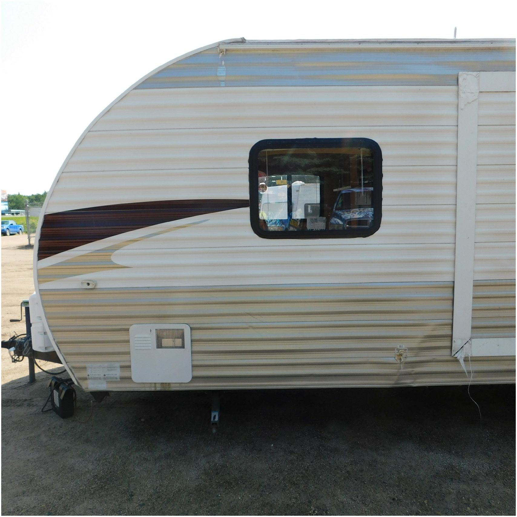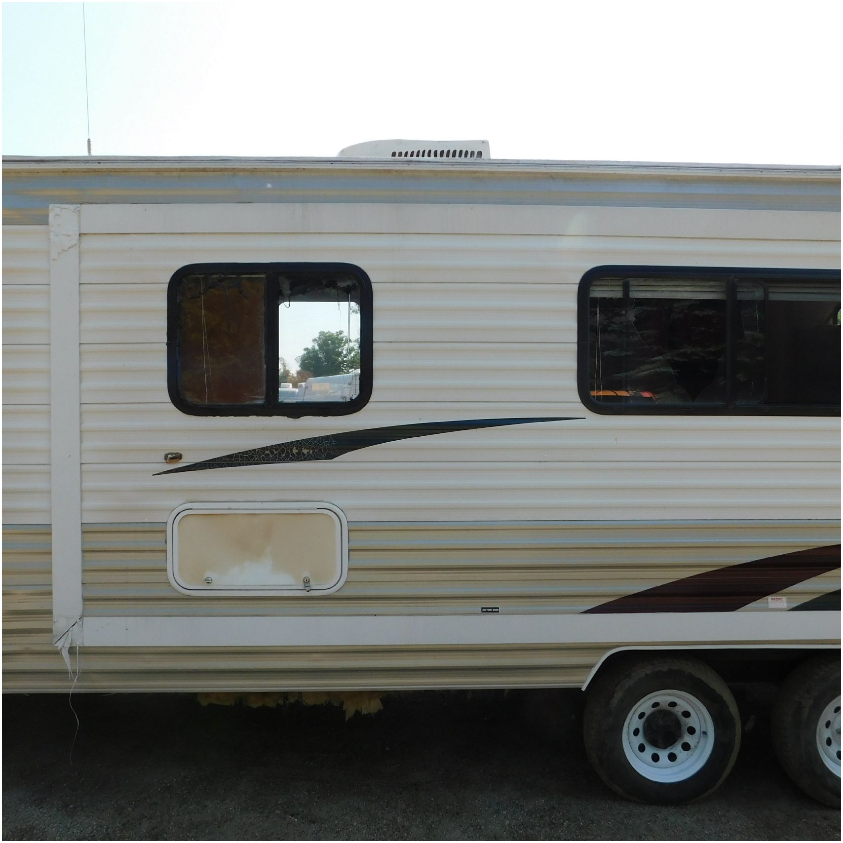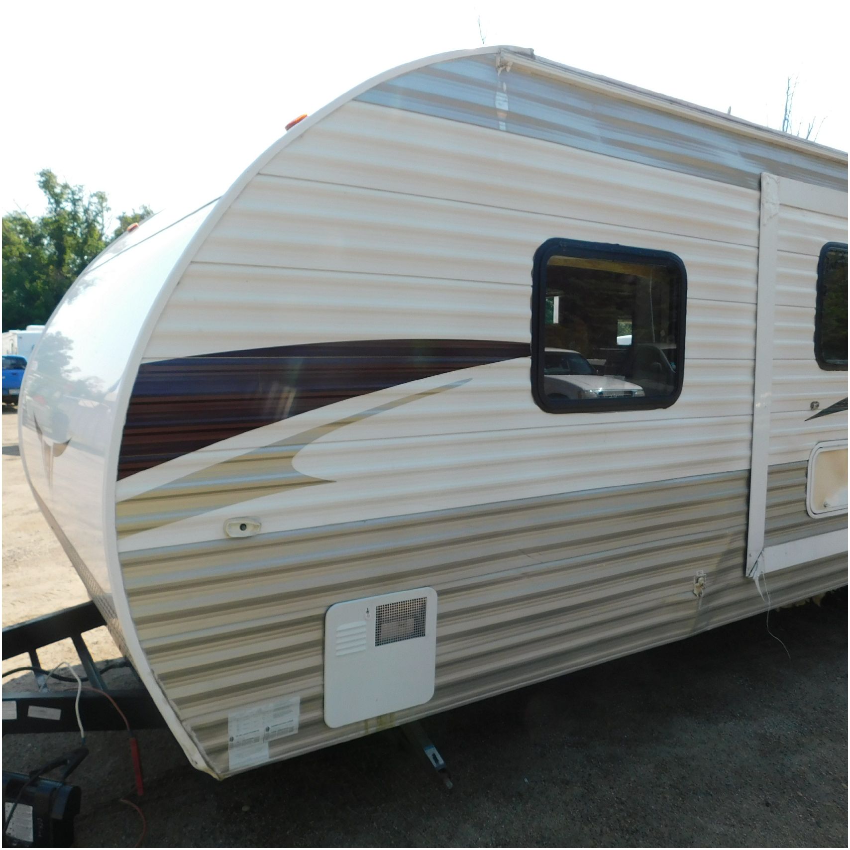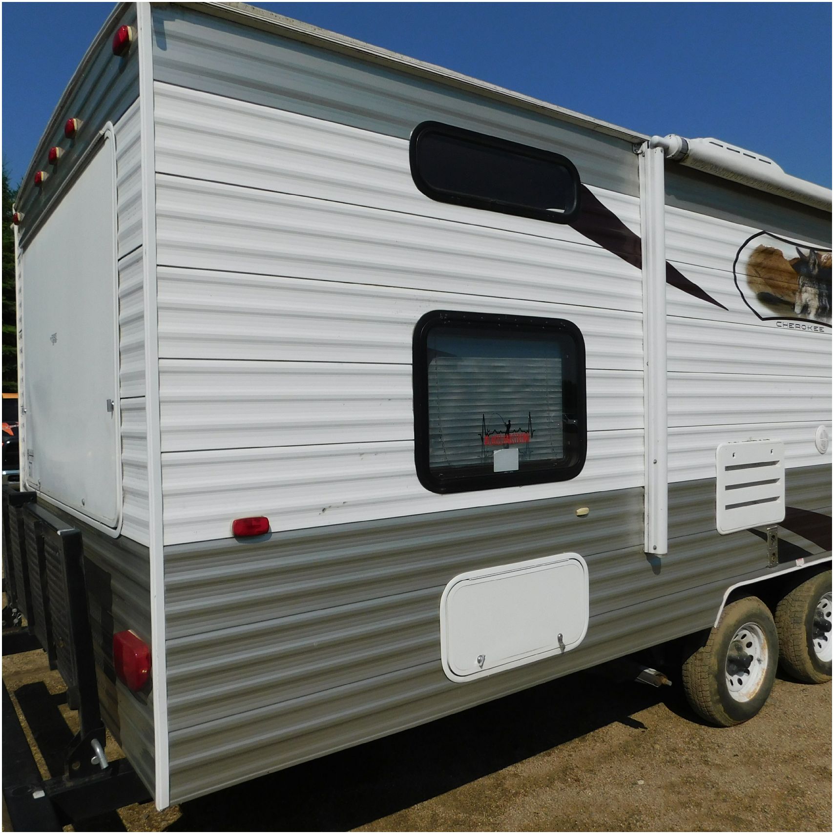 2011 Cherokee 28BHG. This camper comes to us due heat warping damage. A camper next to this one started on fire and the heat from the other camper warped and melted the camper. The front of the camper has a couple dents toward the top but is in nice shape. The driver side slide out does not work. We are thinking some electrical issues due to the heat. The siding is really rippling and it appears as the whole side is out of whack and wavy. A few of the vents and outlets are melted. The middle window is shattered. The rear is weathered some but mainly in ok shape. The passenger side awing does not work and the siding has a couple scuffs. The roof has a few patches. The inside front room appears as it should. The kitchen/living area feels like it was abused and used. The wall all around have some peeling and chipping. The bathroom and rear bunk room appears as it should.