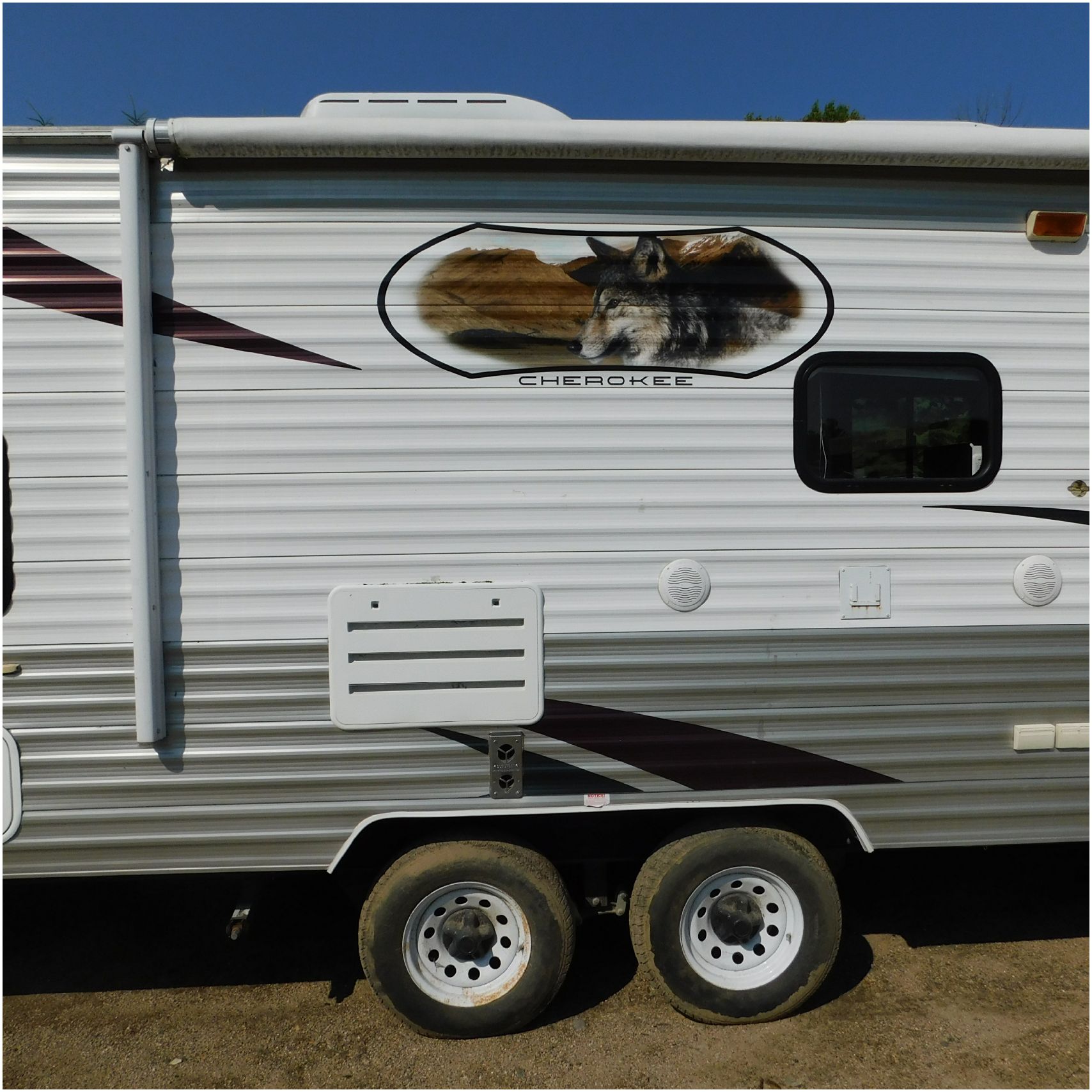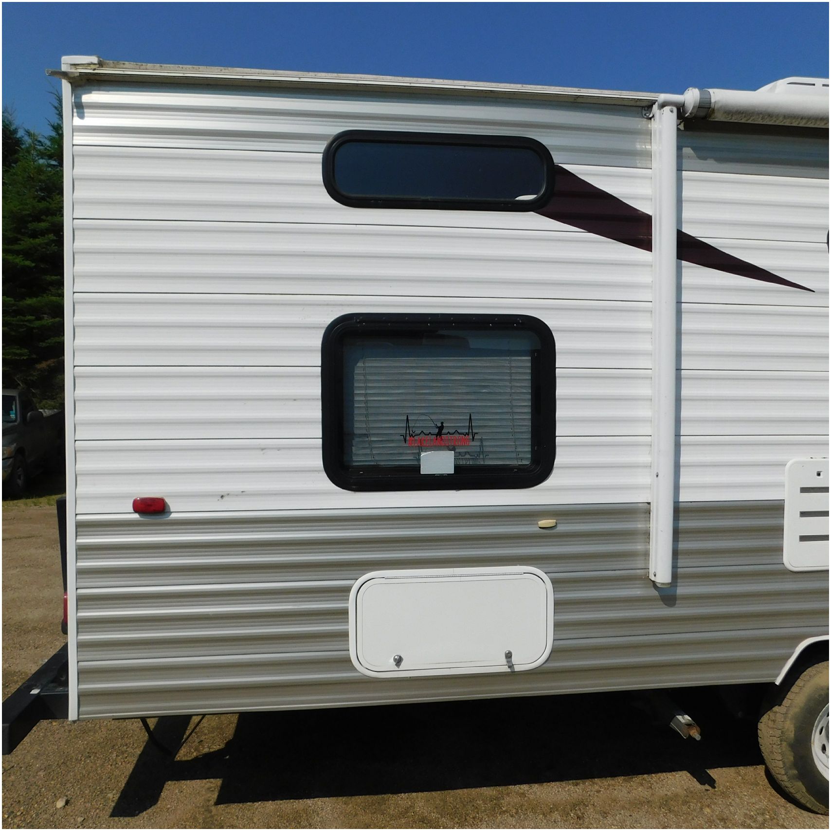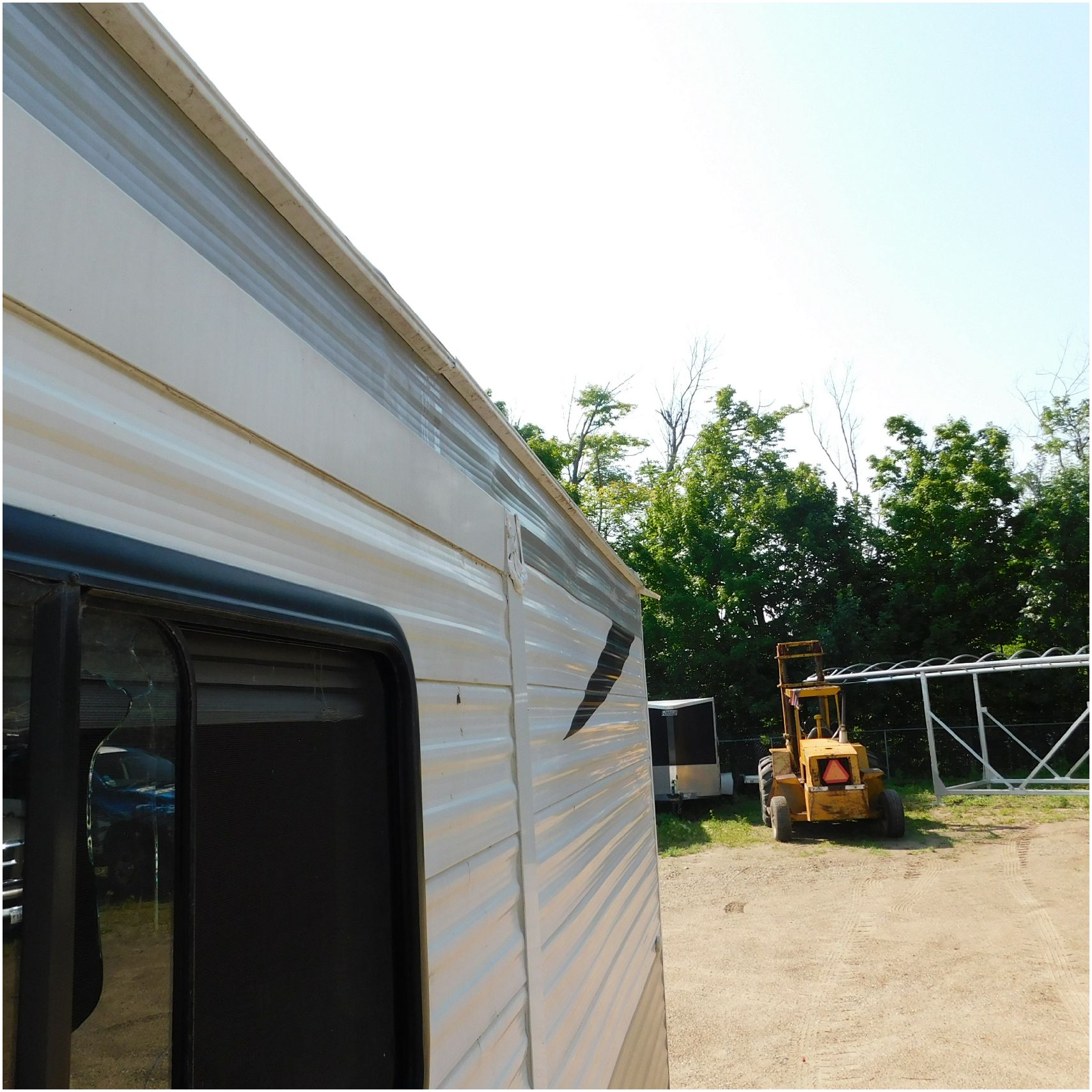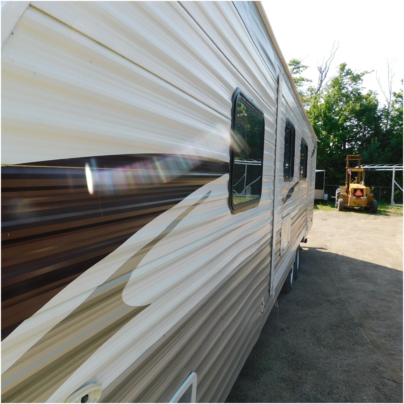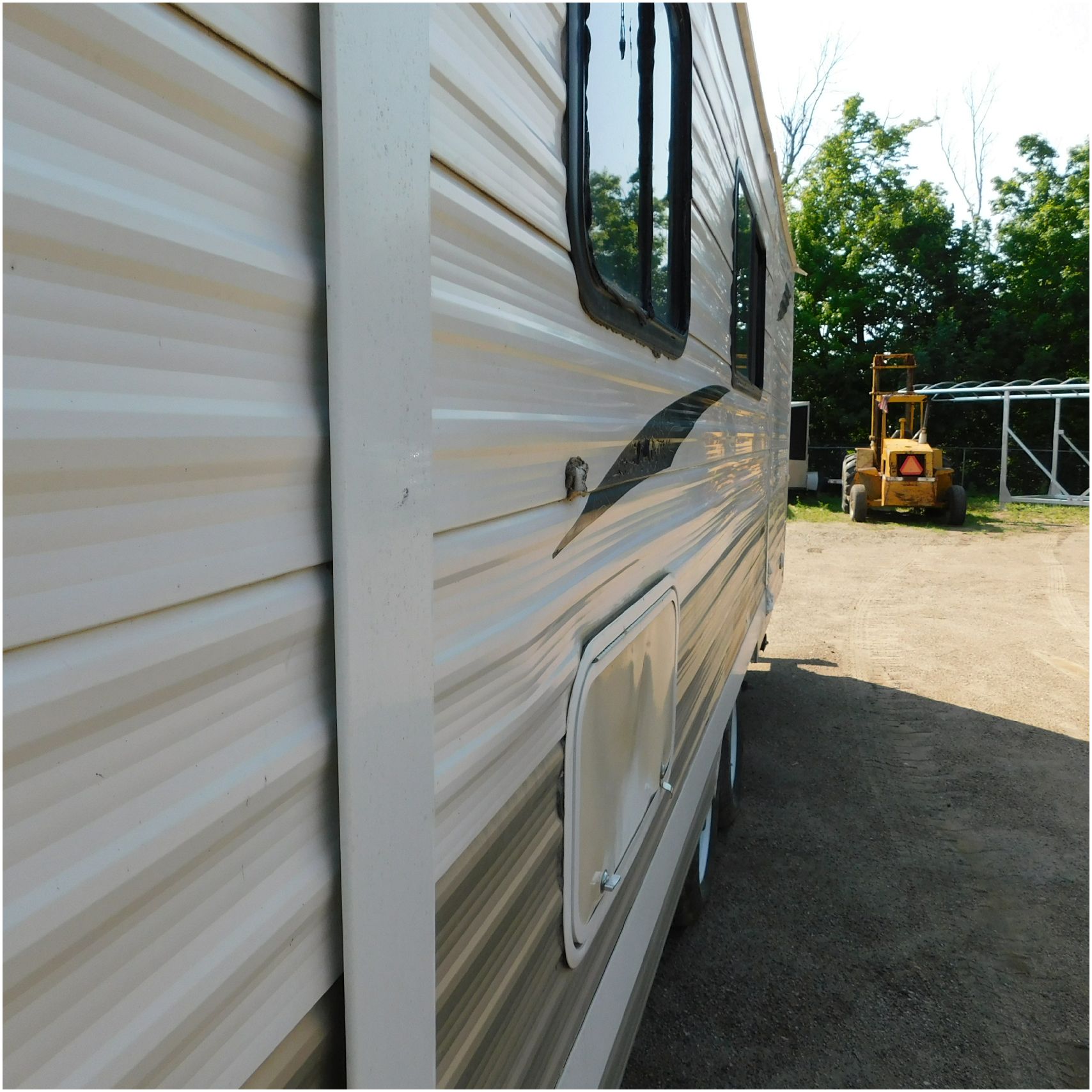 2011 Cherokee 28BHG. This camper comes to us due heat warping damage. A camper next to this one started on fire and the heat from the other camper warped and melted the camper. The front of the camper has a couple dents toward the top but is in nice shape. The driver side slide out does not work. We are thinking some electrical issues due to the heat. The siding is really rippling and it appears as the whole side is out of whack and wavy. A few of the vents and outlets are melted. The middle window is shattered. The rear is weathered some but mainly in ok shape. The passenger side awing does not work and the siding has a couple scuffs. The roof has a few patches. The inside front room appears as it should. The kitchen/living area feels like it was abused and used. The wall all around have some peeling and chipping. The bathroom and rear bunk room appears as it should.
