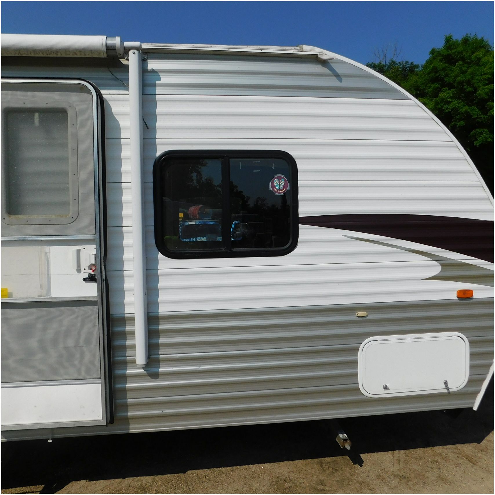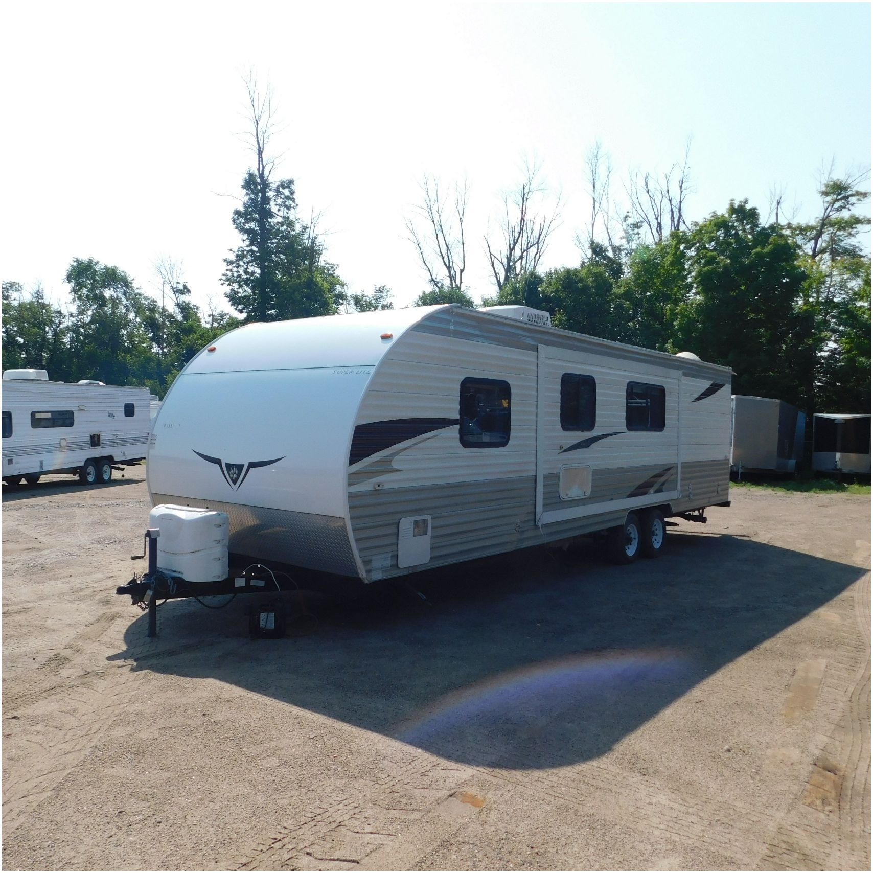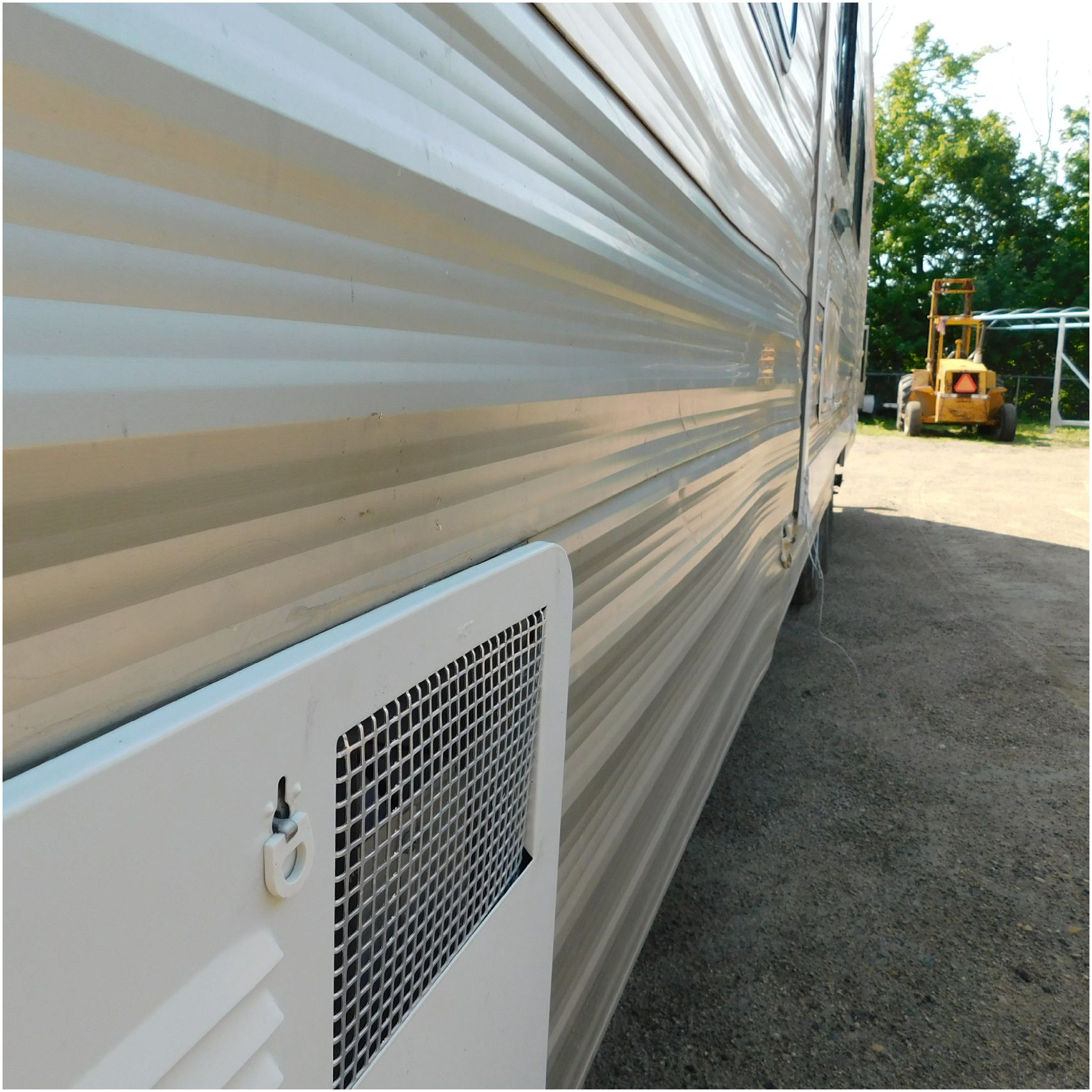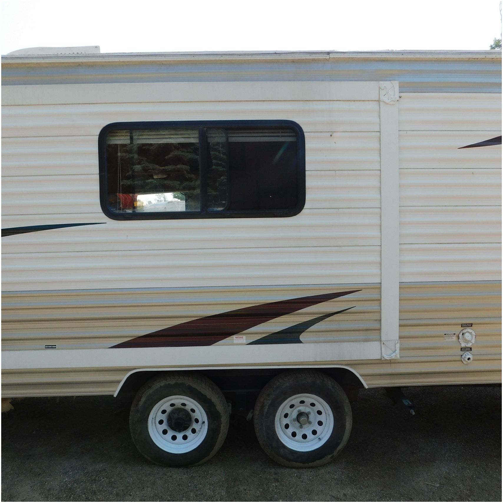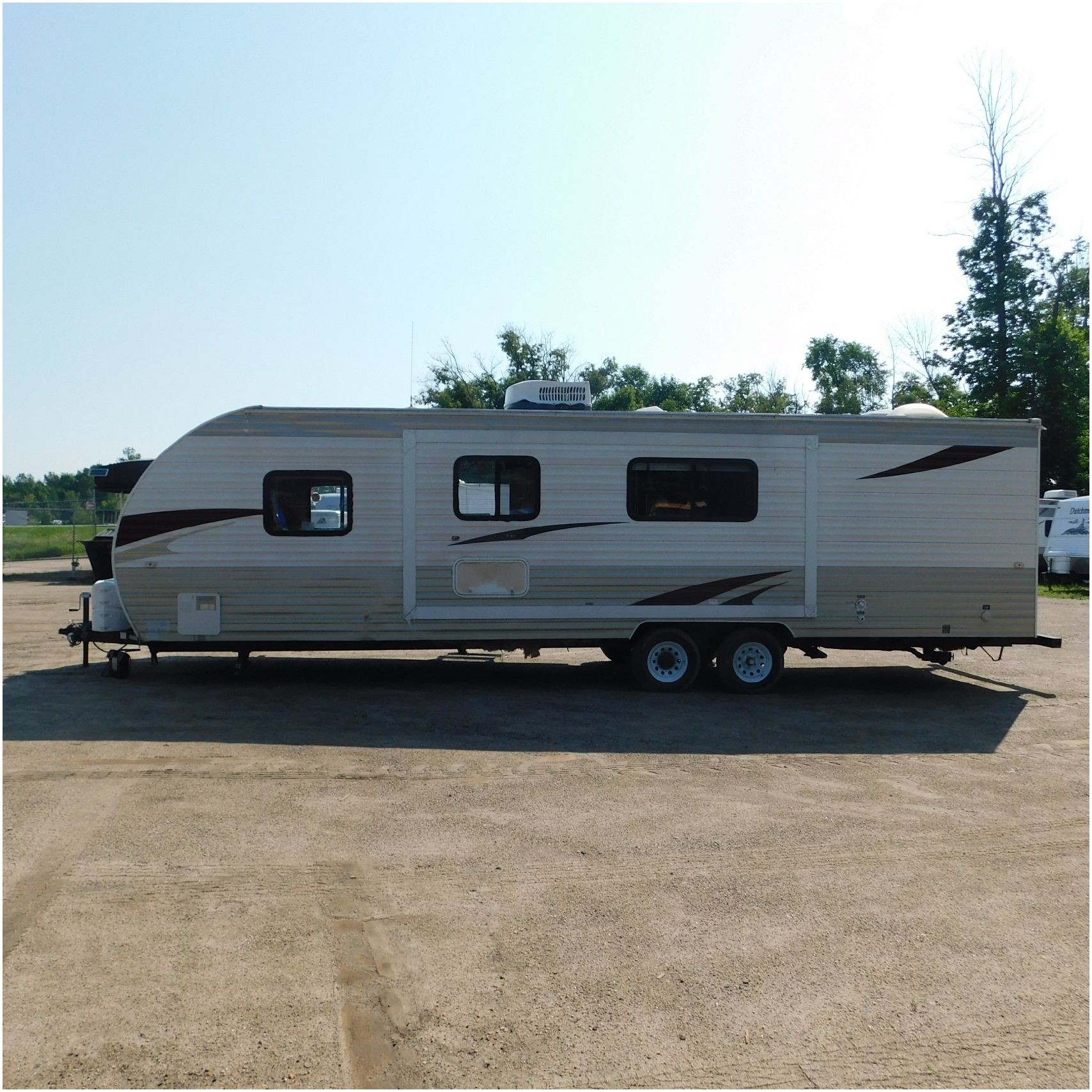 2011 Cherokee 28BHG. This camper comes to us due heat warping damage. A camper next to this one started on fire and the heat from the other camper warped and melted the camper. The front of the camper has a couple dents toward the top but is in nice shape. The driver side slide out does not work. We are thinking some electrical issues due to the heat. The siding is really rippling and it appears as the whole side is out of whack and wavy. A few of the vents and outlets are melted. The middle window is shattered. The rear is weathered some but mainly in ok shape. The passenger side awing does not work and the siding has a couple scuffs. The roof has a few patches. The inside front room appears as it should. The kitchen/living area feels like it was abused and used. The wall all around have some peeling and chipping. The bathroom and rear bunk room appears as it should.