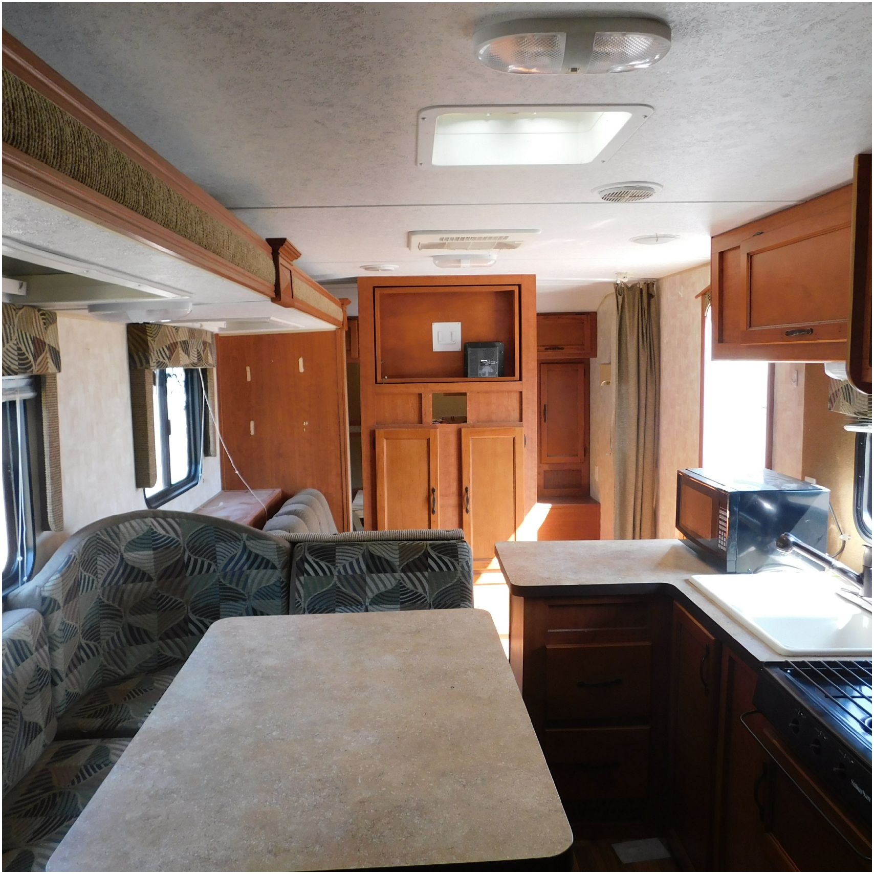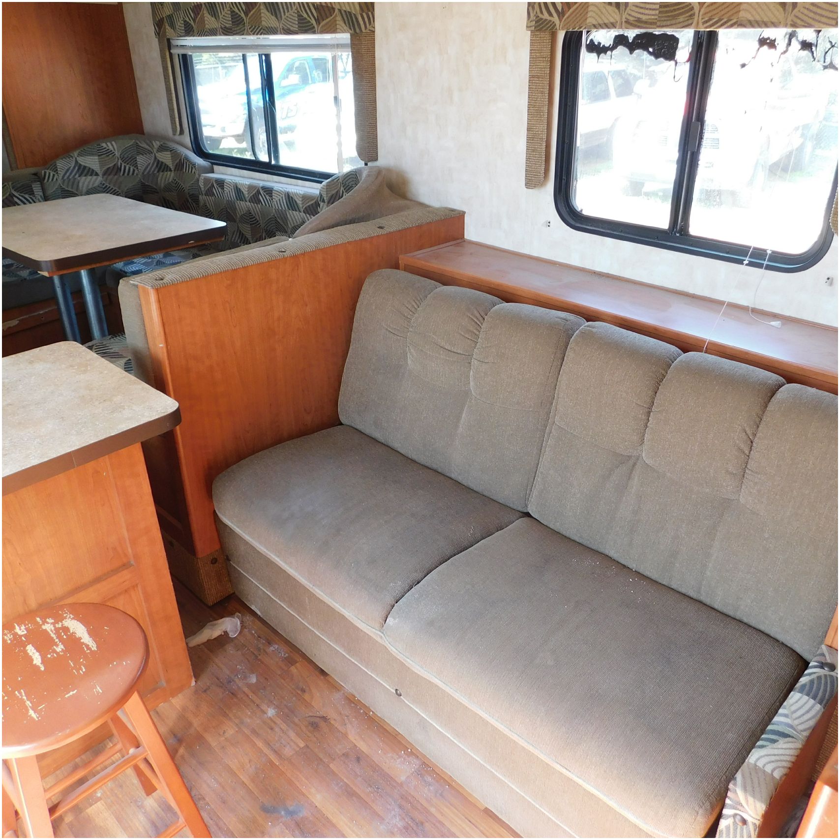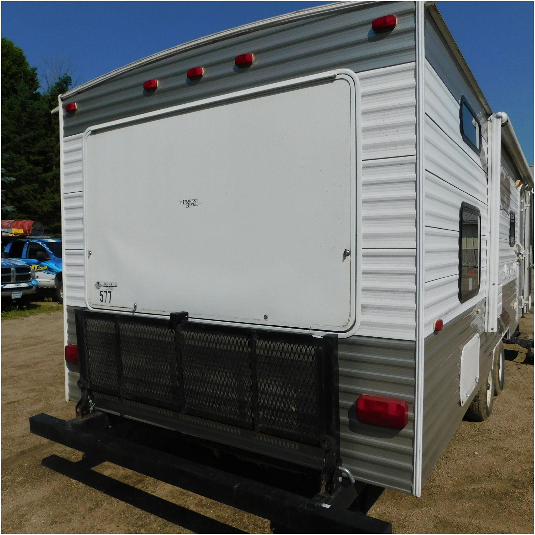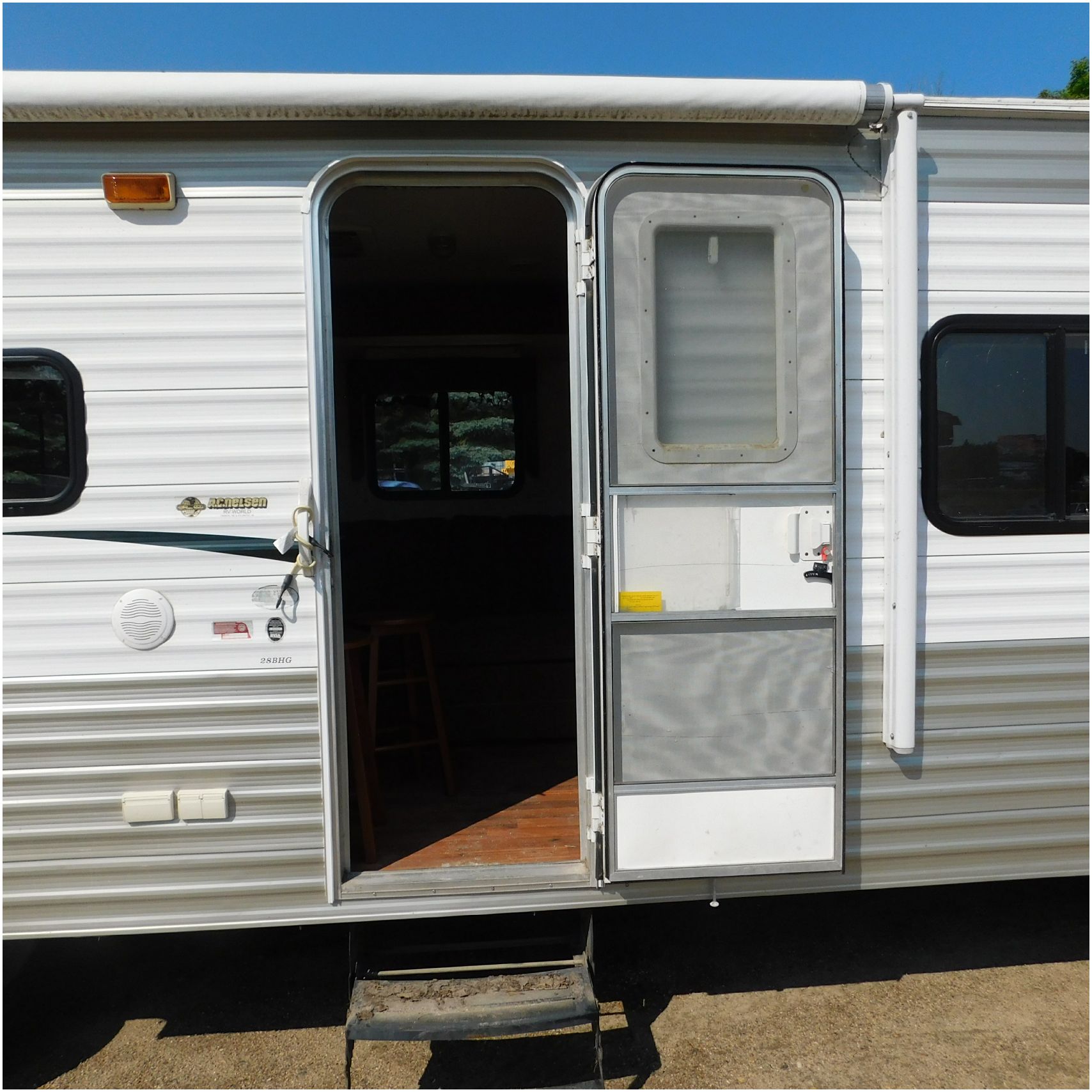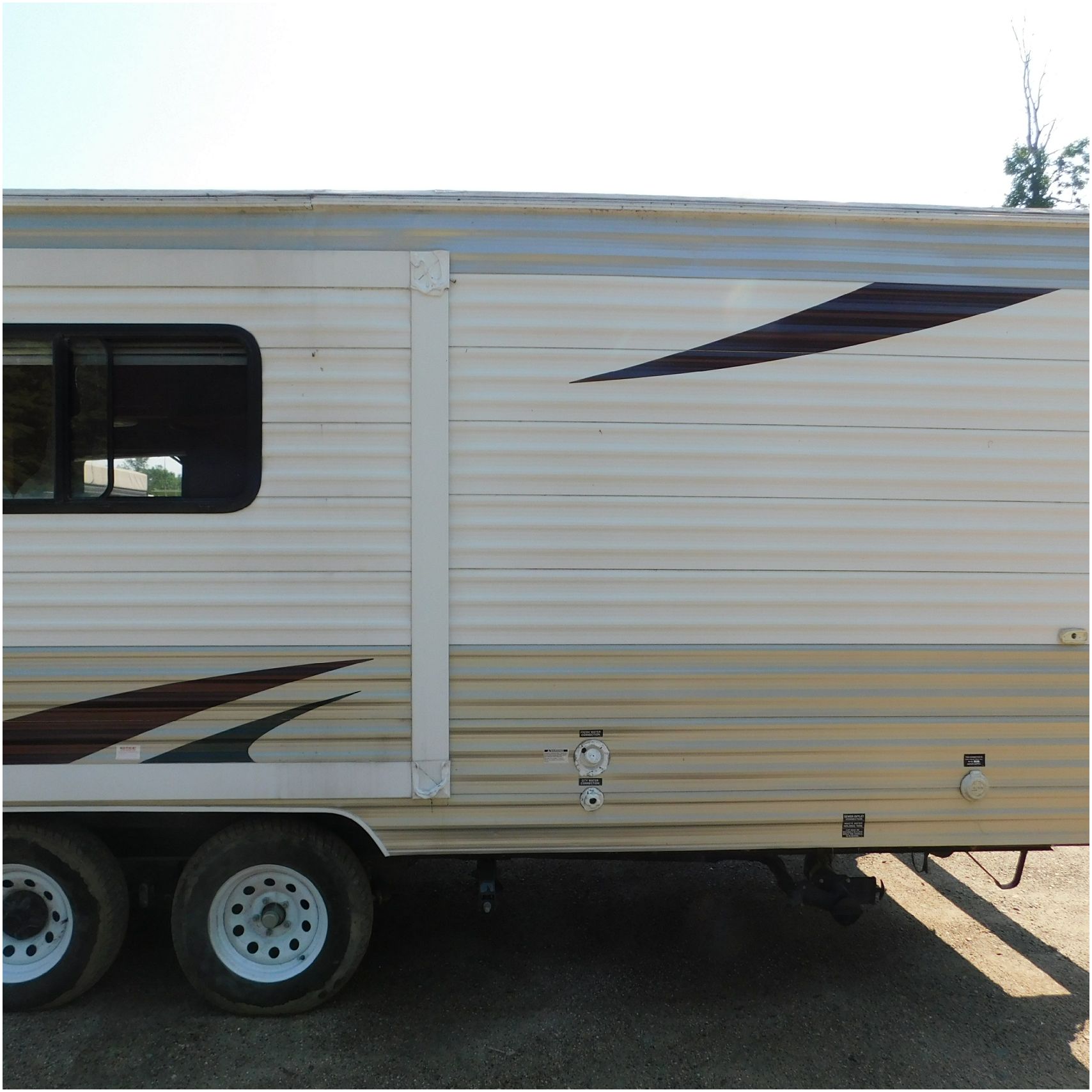 2011 Cherokee 28BHG. This camper comes to us due heat warping damage. A camper next to this one started on fire and the heat from the other camper warped and melted the camper. The front of the camper has a couple dents toward the top but is in nice shape. The driver side slide out does not work. We are thinking some electrical issues due to the heat. The siding is really rippling and it appears as the whole side is out of whack and wavy. A few of the vents and outlets are melted. The middle window is shattered. The rear is weathered some but mainly in ok shape. The passenger side awing does not work and the siding has a couple scuffs. The roof has a few patches. The inside front room appears as it should. The kitchen/living area feels like it was abused and used. The wall all around have some peeling and chipping. The bathroom and rear bunk room appears as it should.