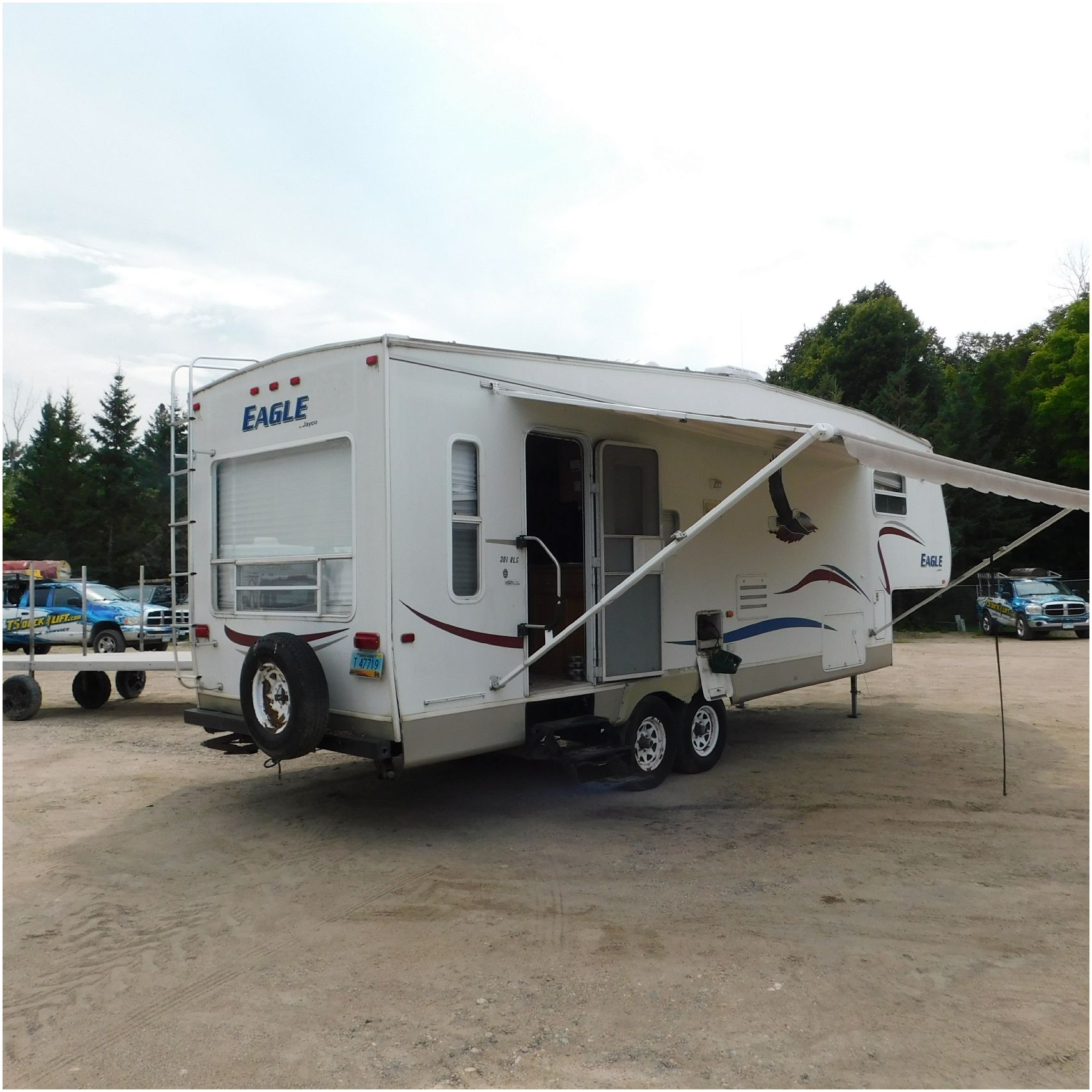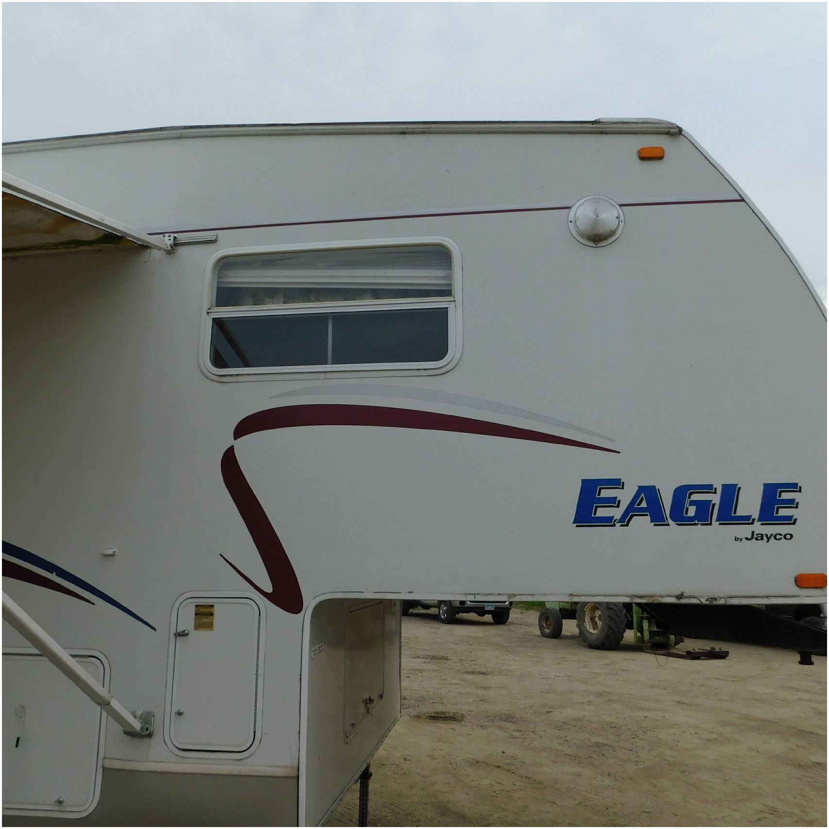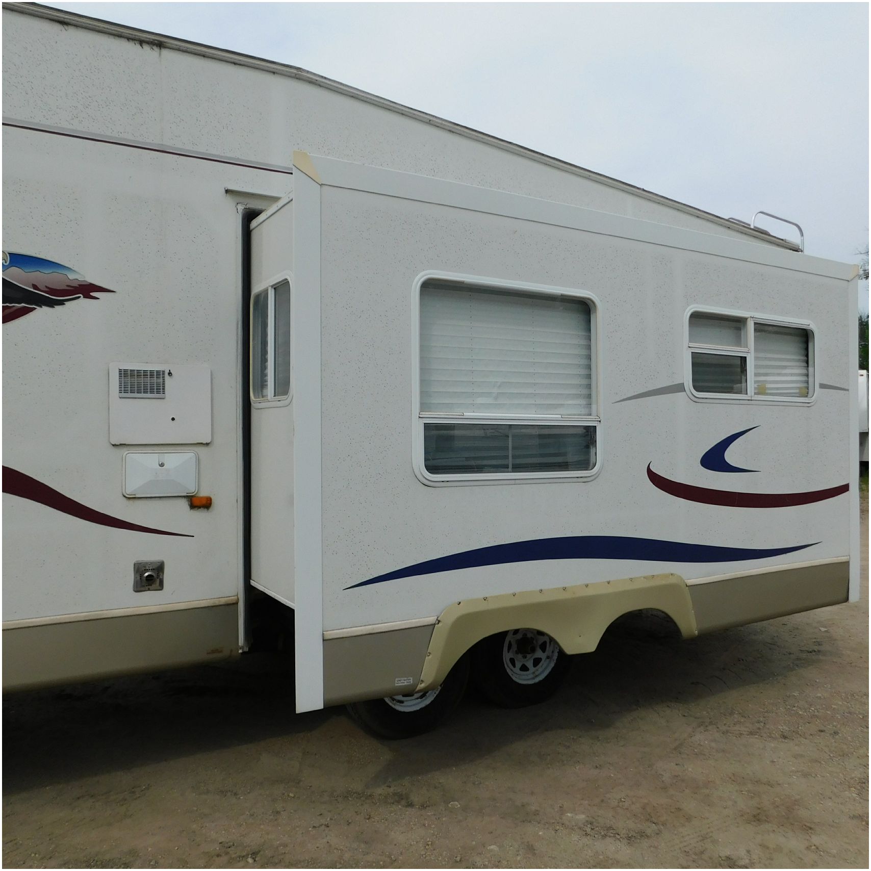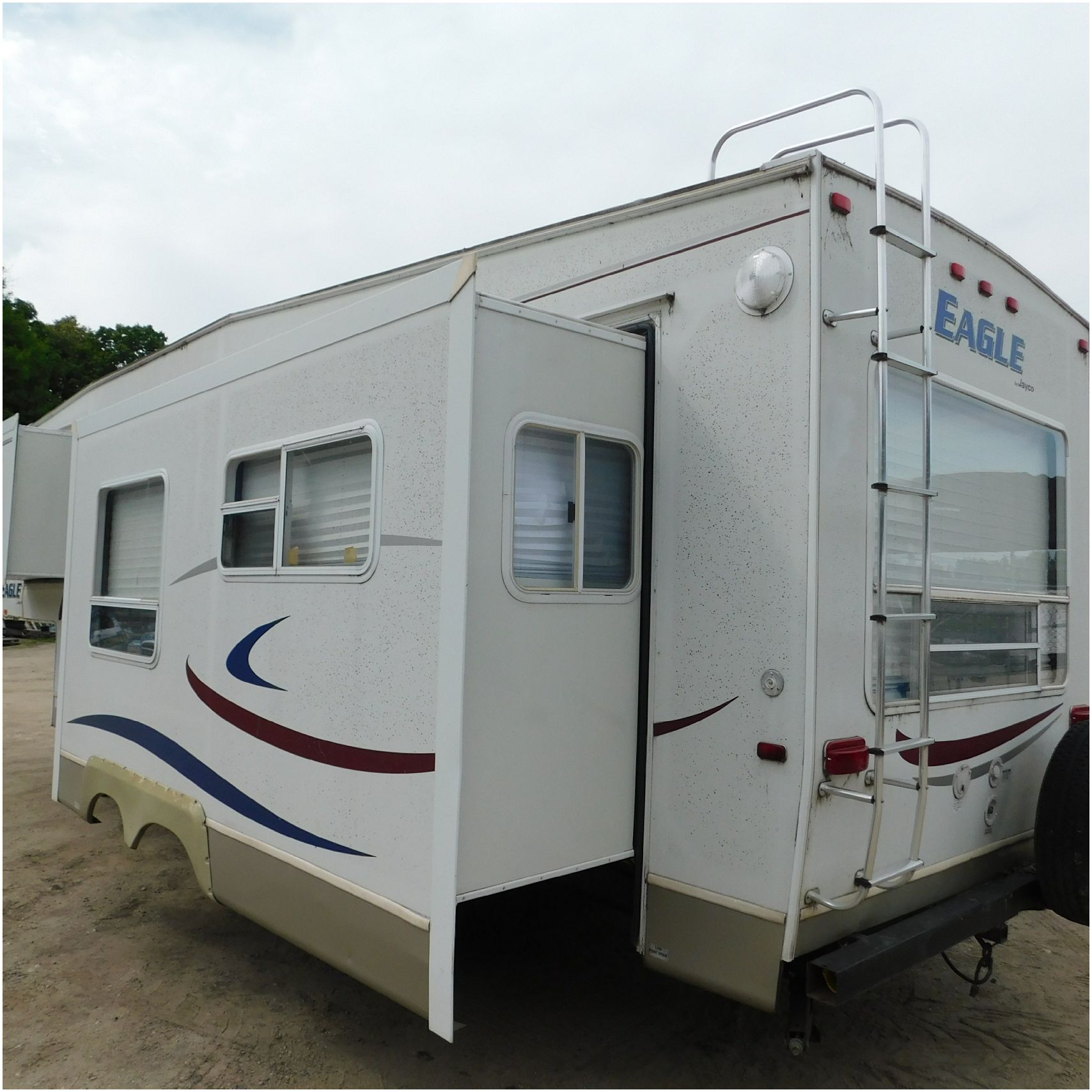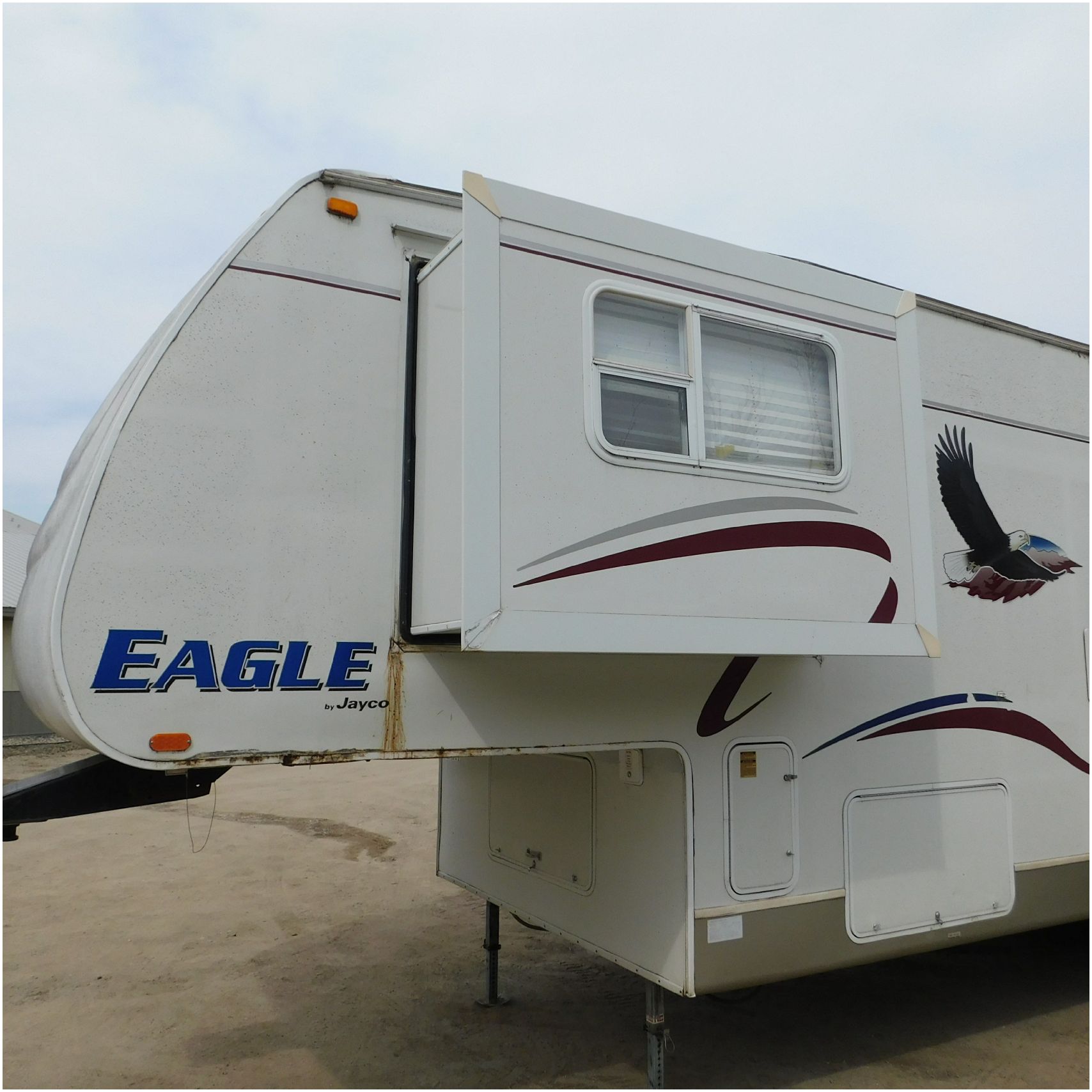 Up for auction is a 2005 Jayco Eagle 301RLS. This 33’ 5th wheel comes to us with roof damage. The front of the camper is weathered. The driver side is pretty beat up and weathered. The rear is also weathered. The passenger side is weathered and the awing is in pretty tough shape. The bottom trim is dented and the fender is cracked. The roof is caving in and the rafters are damaged. The roof does have a couple holes in the rubber. The inside all around is in tough shape with the roof being damaged causing a hole. The camper has water damage all throughout the inside. The complete camper all around is pretty beat up and in toughs shape. Good Luck Bidding on this Camper!