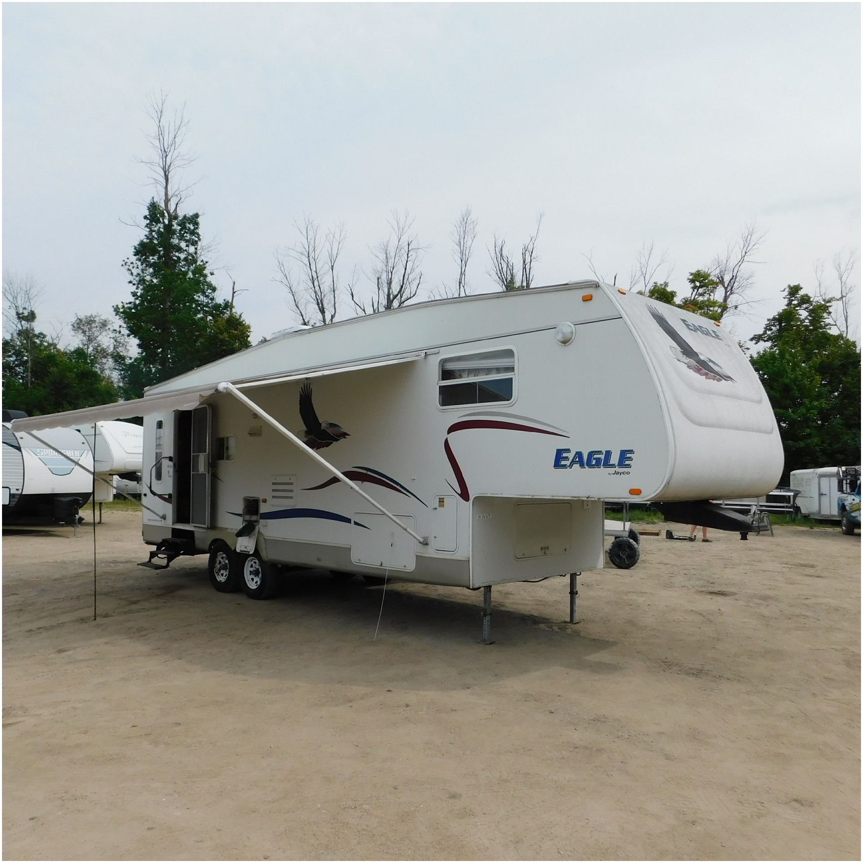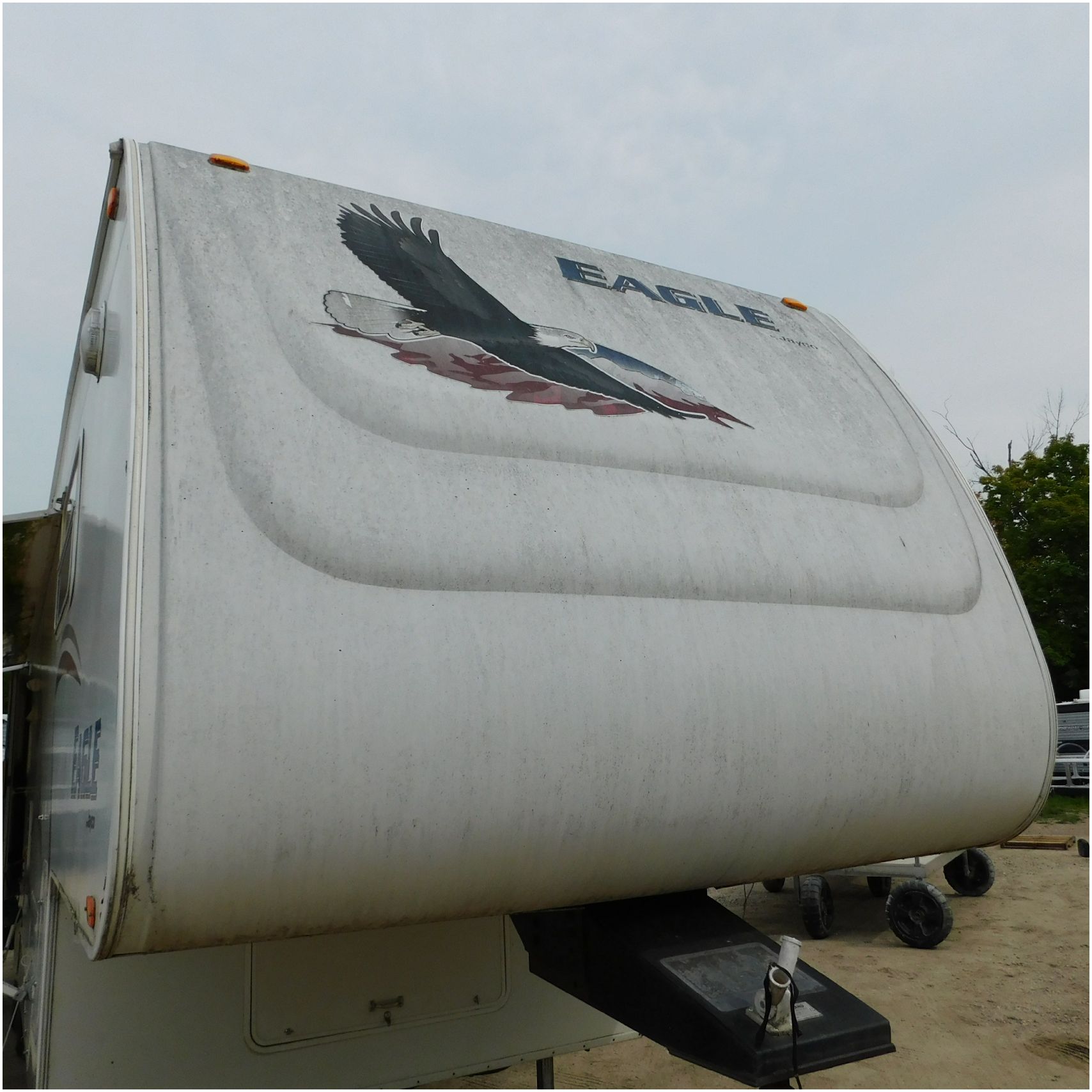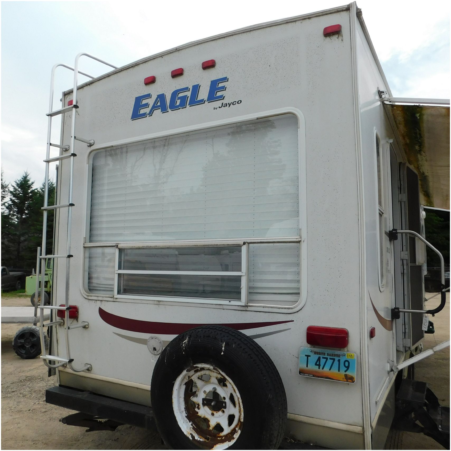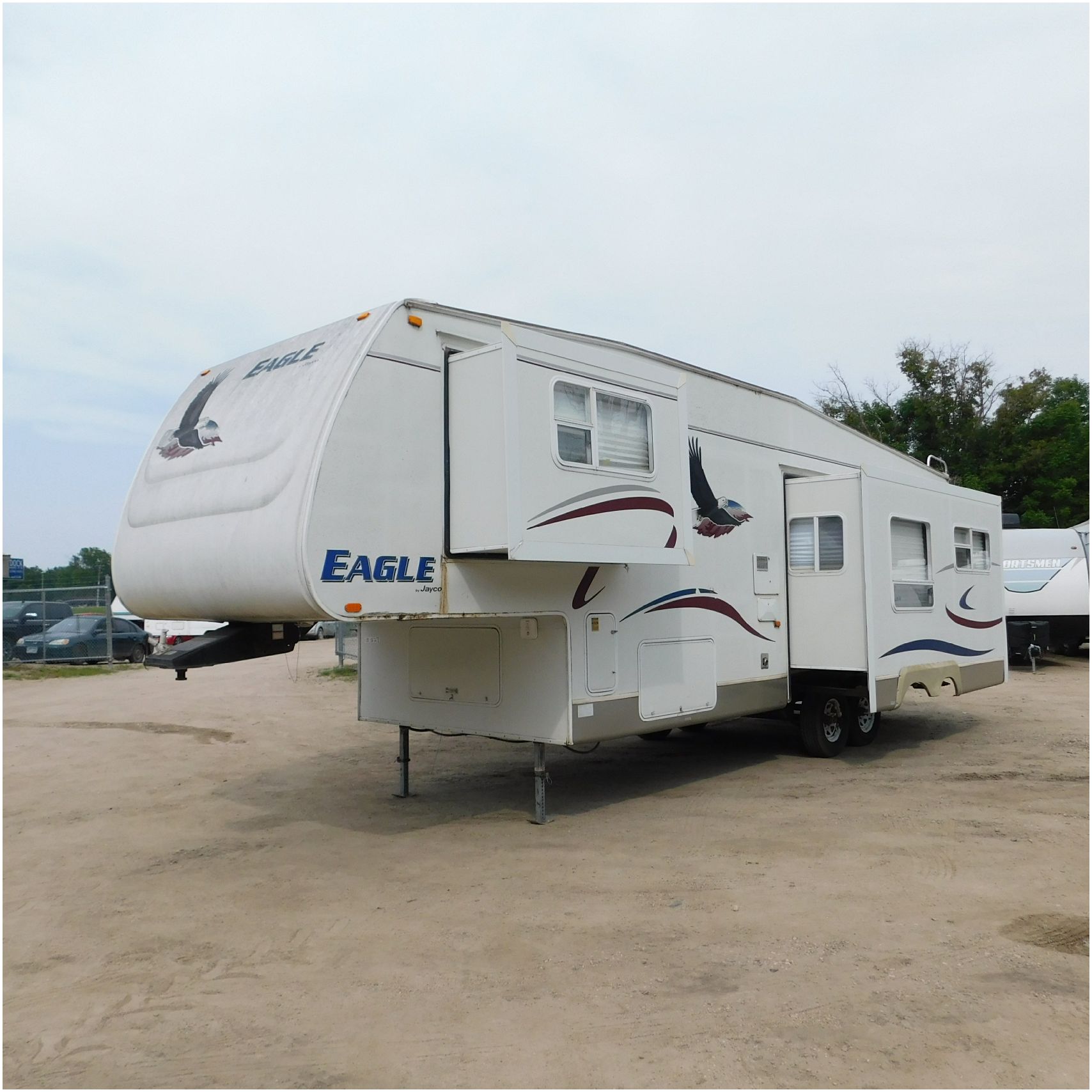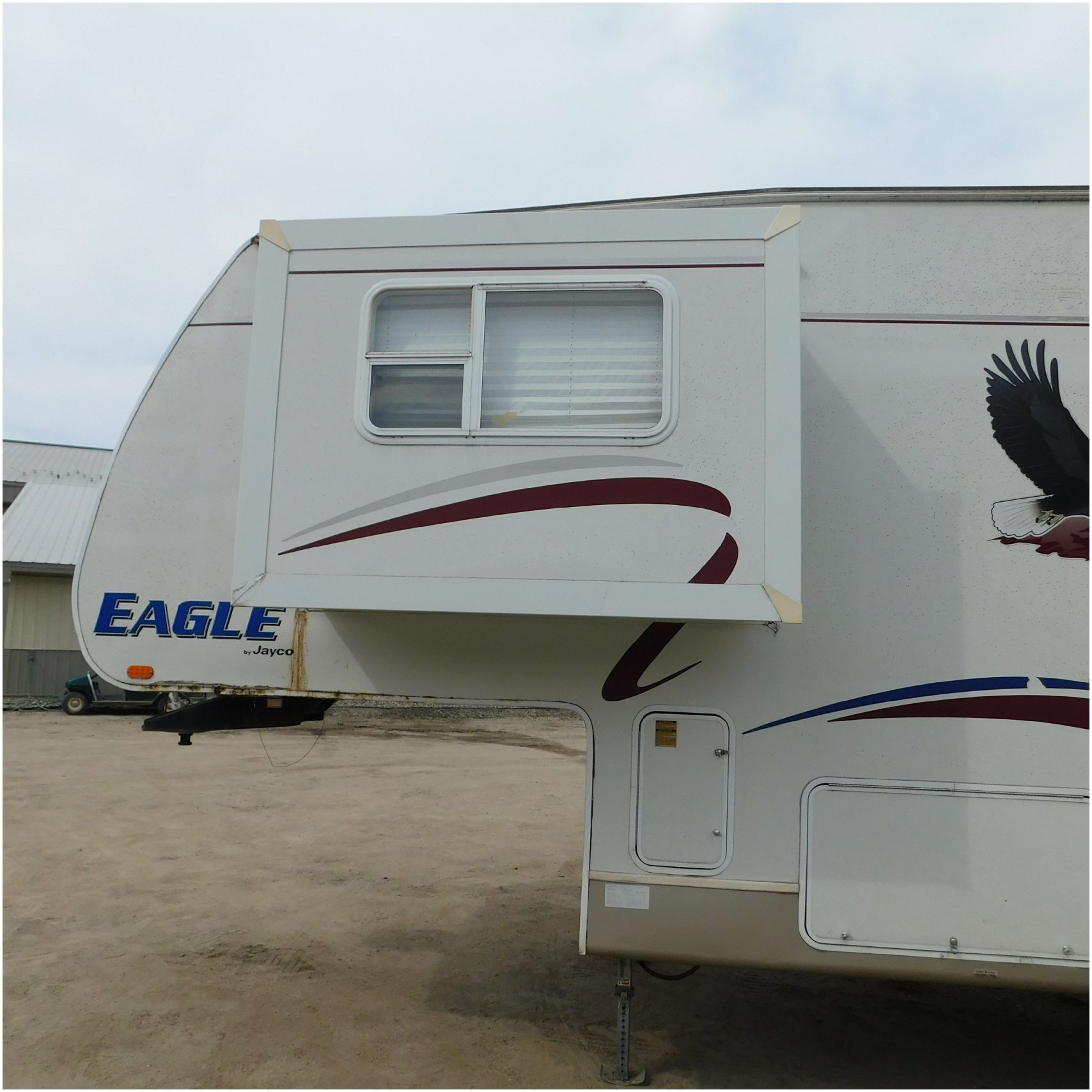 Up for auction is a 2005 Jayco Eagle 301RLS. This 33’ 5th wheel comes to us with roof damage. The front of the camper is weathered. The driver side is pretty beat up and weathered. The rear is also weathered. The passenger side is weathered and the awing is in pretty tough shape. The bottom trim is dented and the fender is cracked. The roof is caving in and the rafters are damaged. The roof does have a couple holes in the rubber. The inside all around is in tough shape with the roof being damaged causing a hole. The camper has water damage all throughout the inside. The complete camper all around is pretty beat up and in toughs shape. Good Luck Bidding on this Camper!
