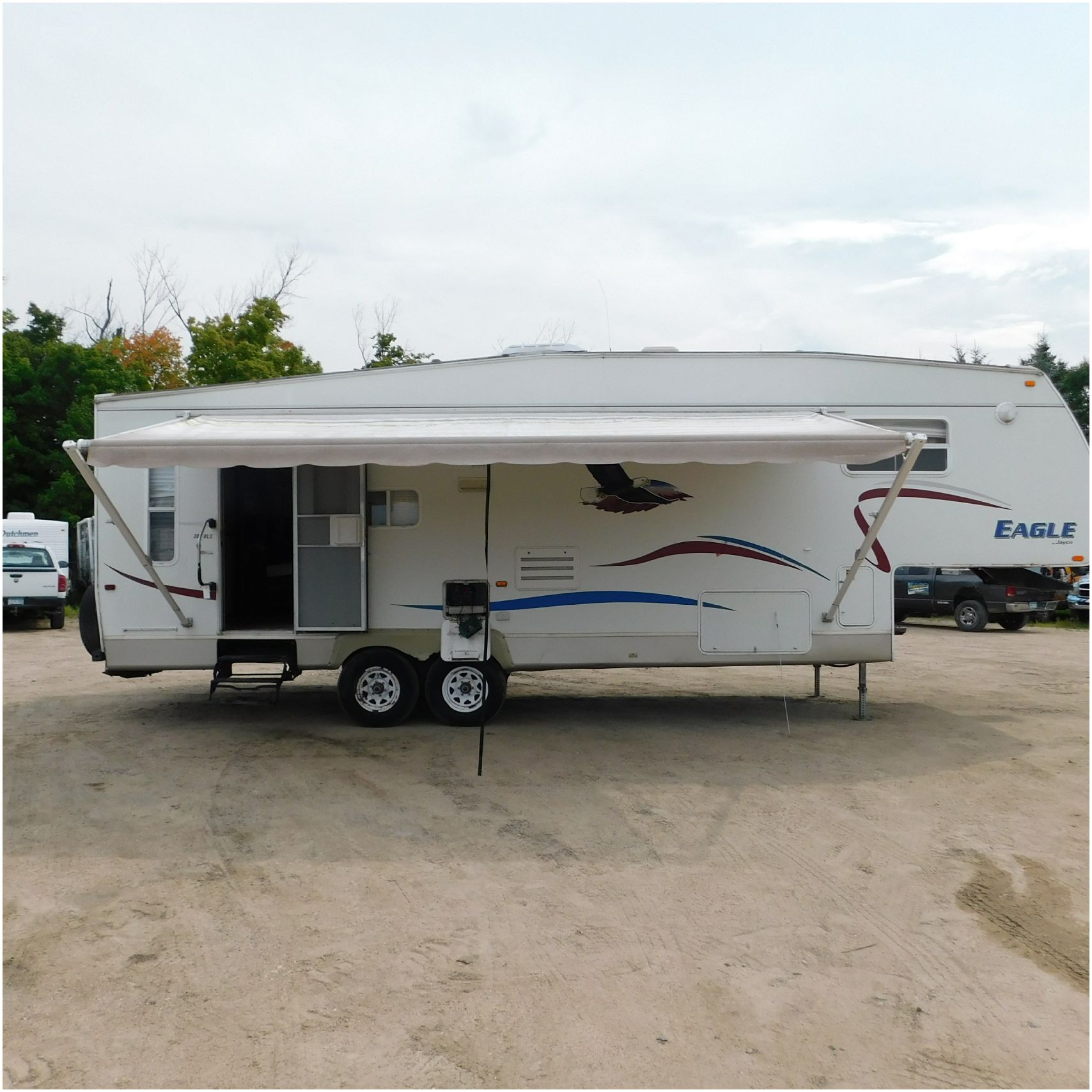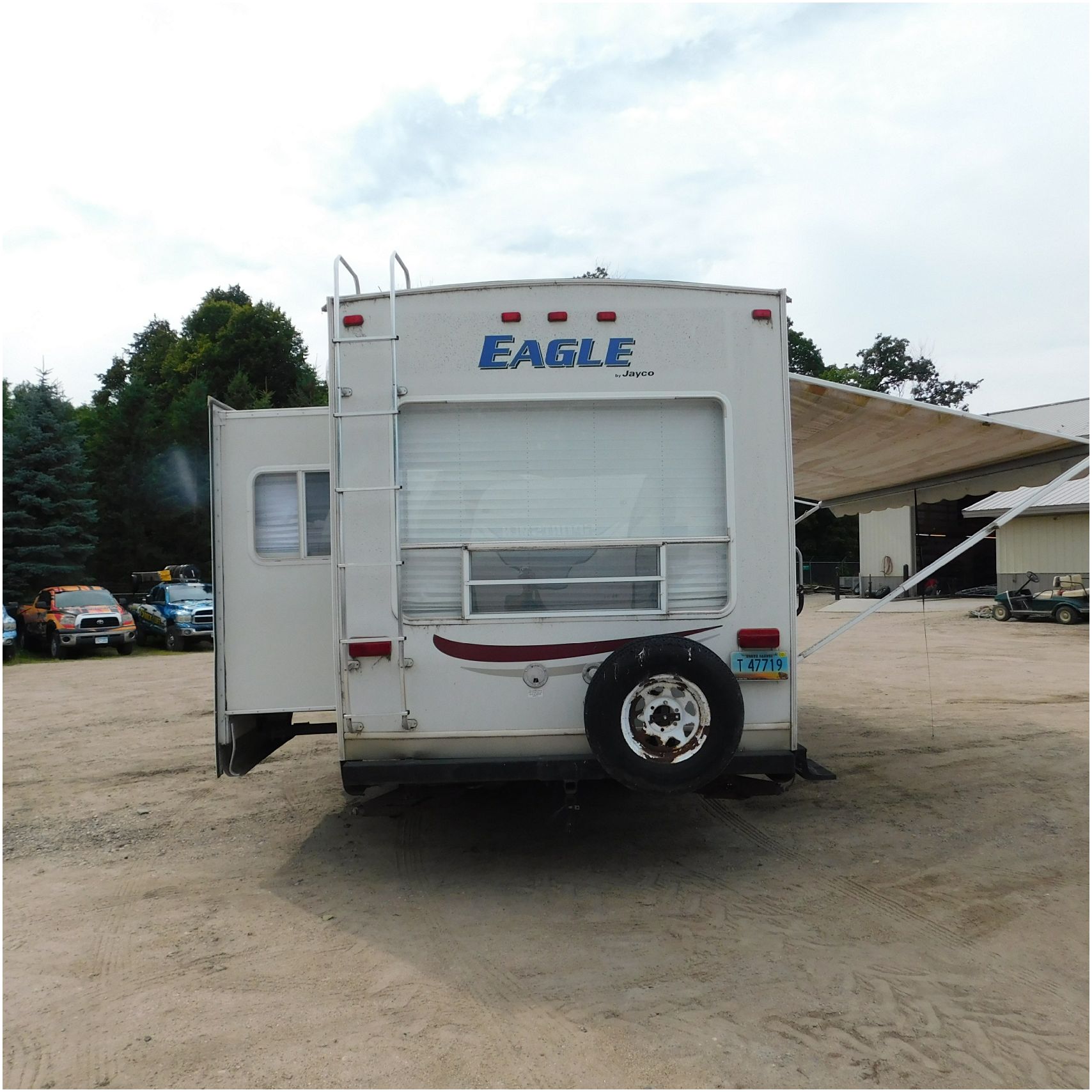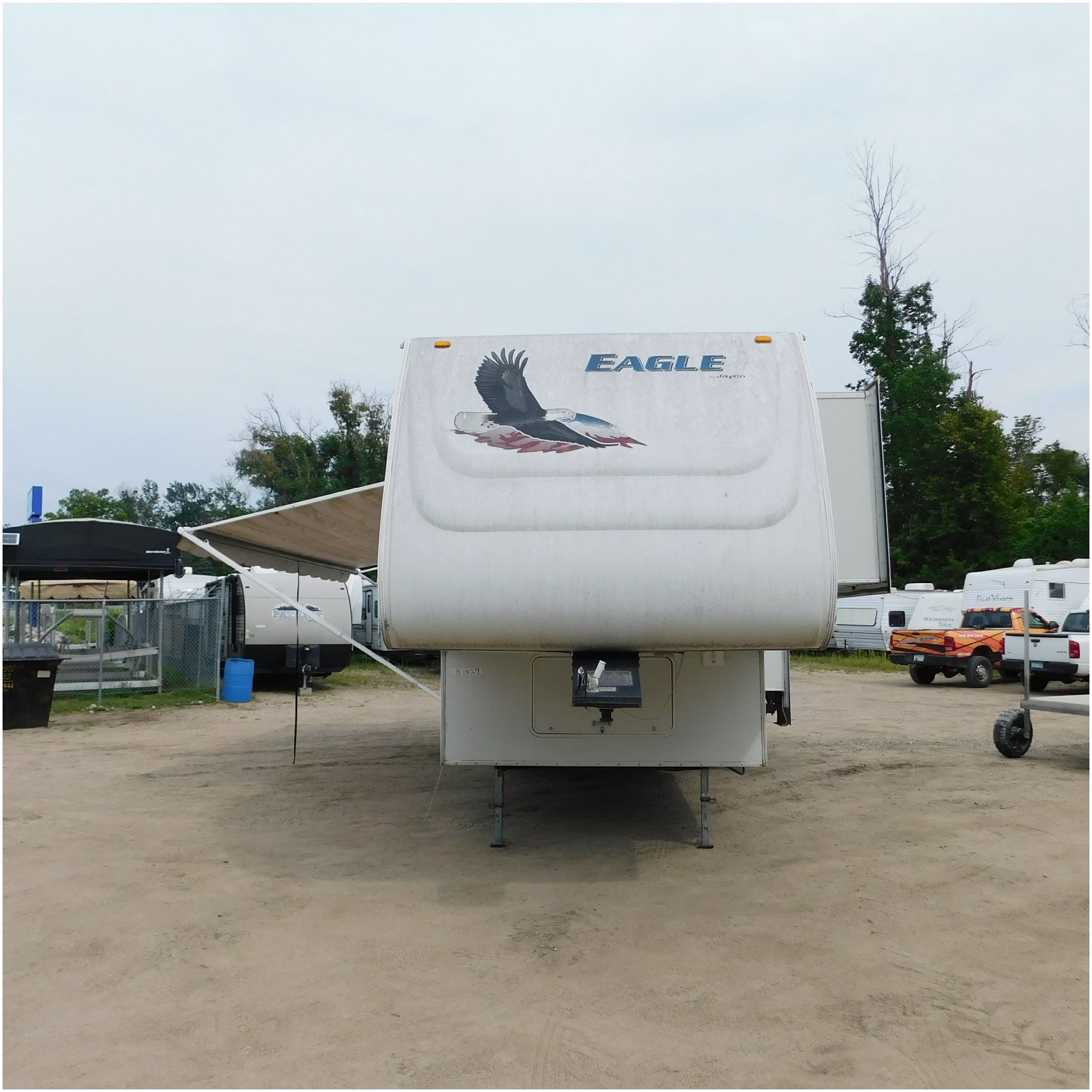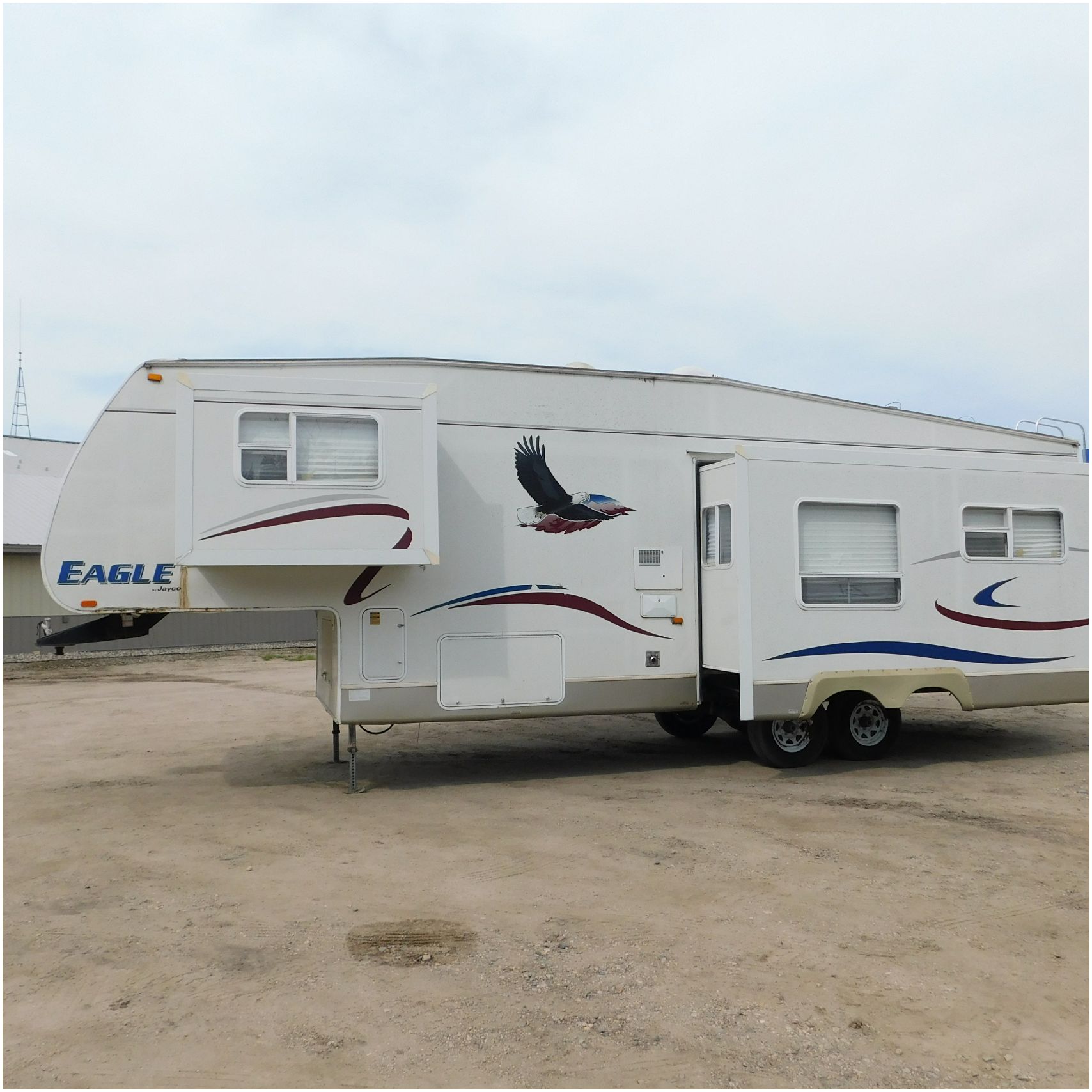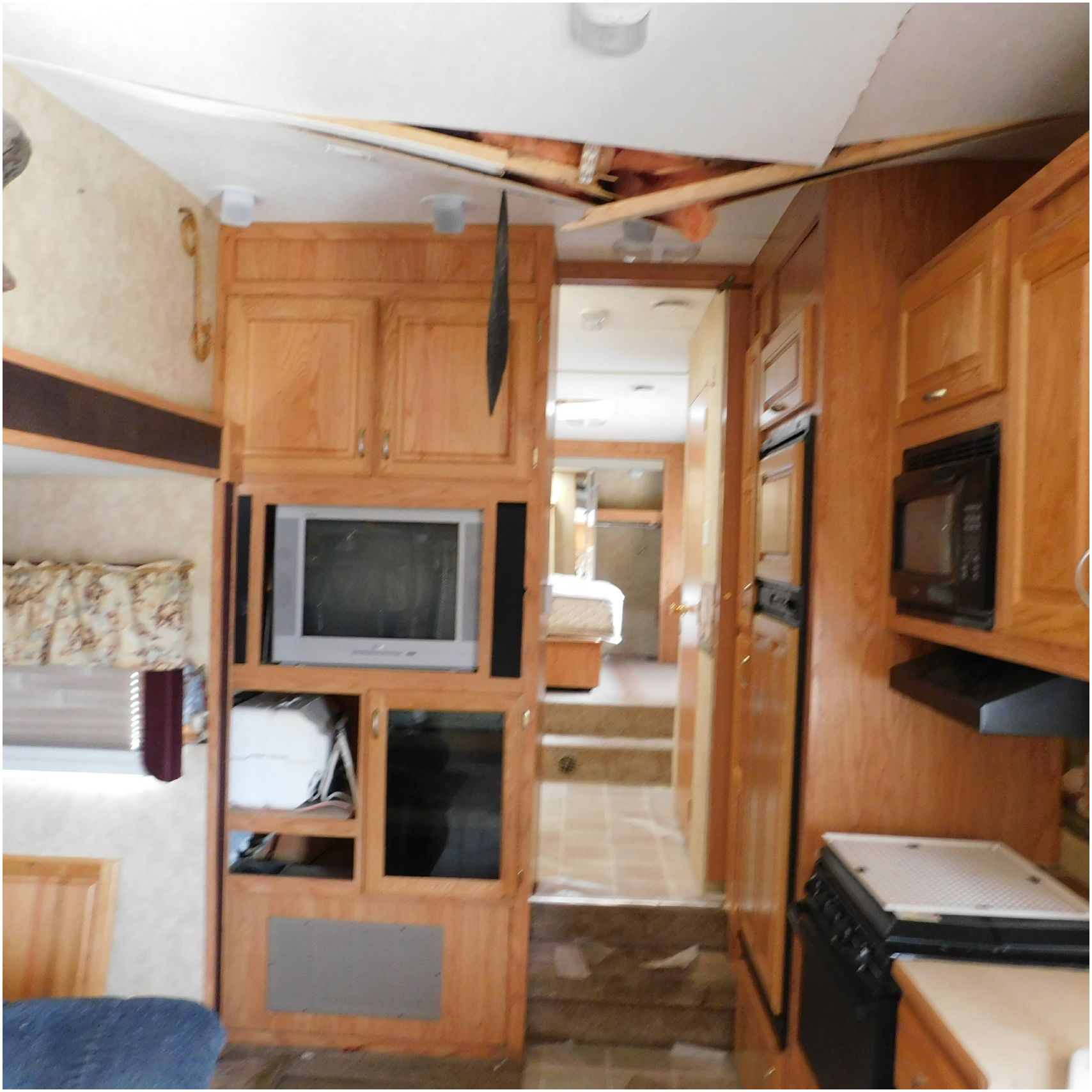 Up for auction is a 2005 Jayco Eagle 301RLS. This 33’ 5th wheel comes to us with roof damage. The front of the camper is weathered. The driver side is pretty beat up and weathered. The rear is also weathered. The passenger side is weathered and the awing is in pretty tough shape. The bottom trim is dented and the fender is cracked. The roof is caving in and the rafters are damaged. The roof does have a couple holes in the rubber. The inside all around is in tough shape with the roof being damaged causing a hole. The camper has water damage all throughout the inside. The complete camper all around is pretty beat up and in toughs shape. Good Luck Bidding on this Camper!