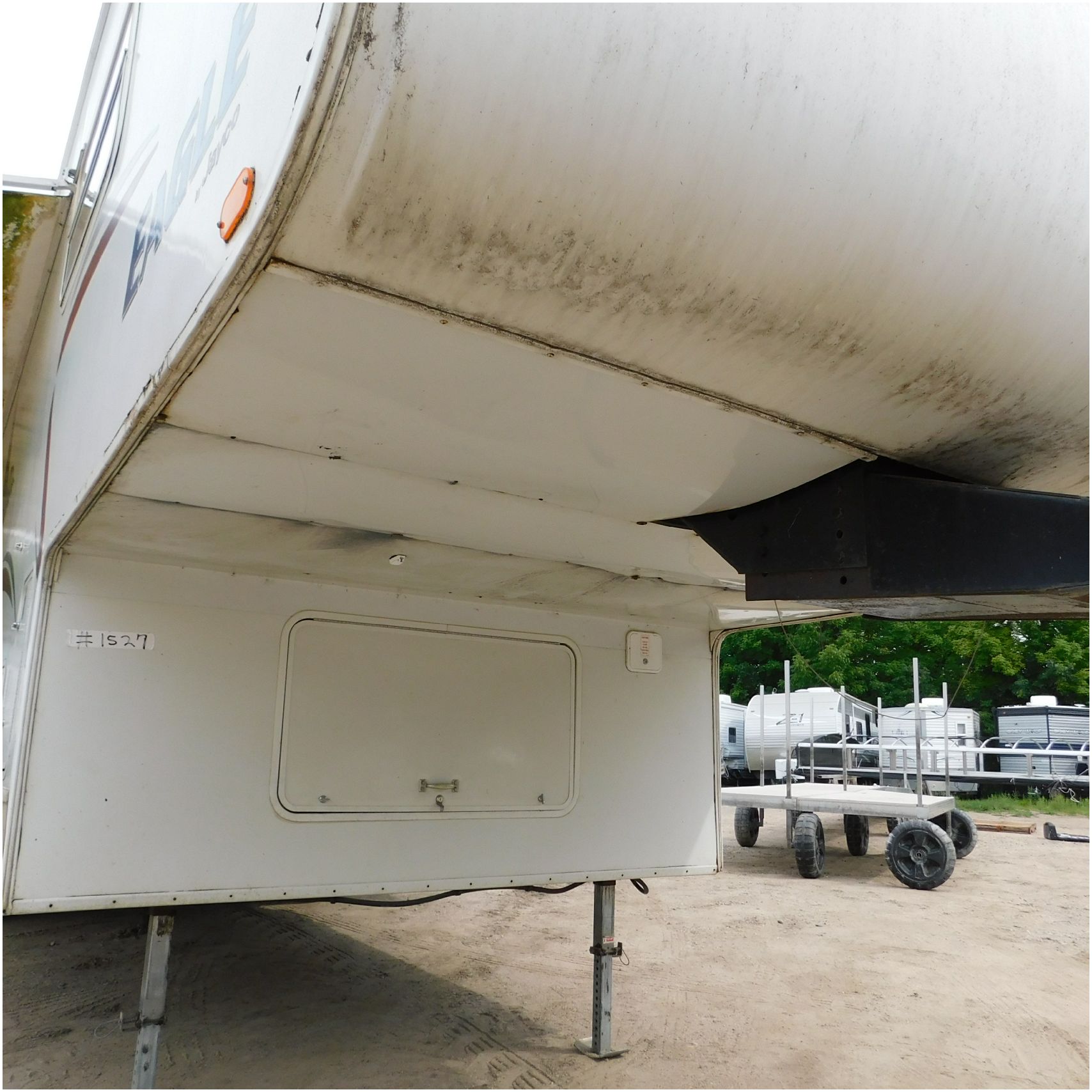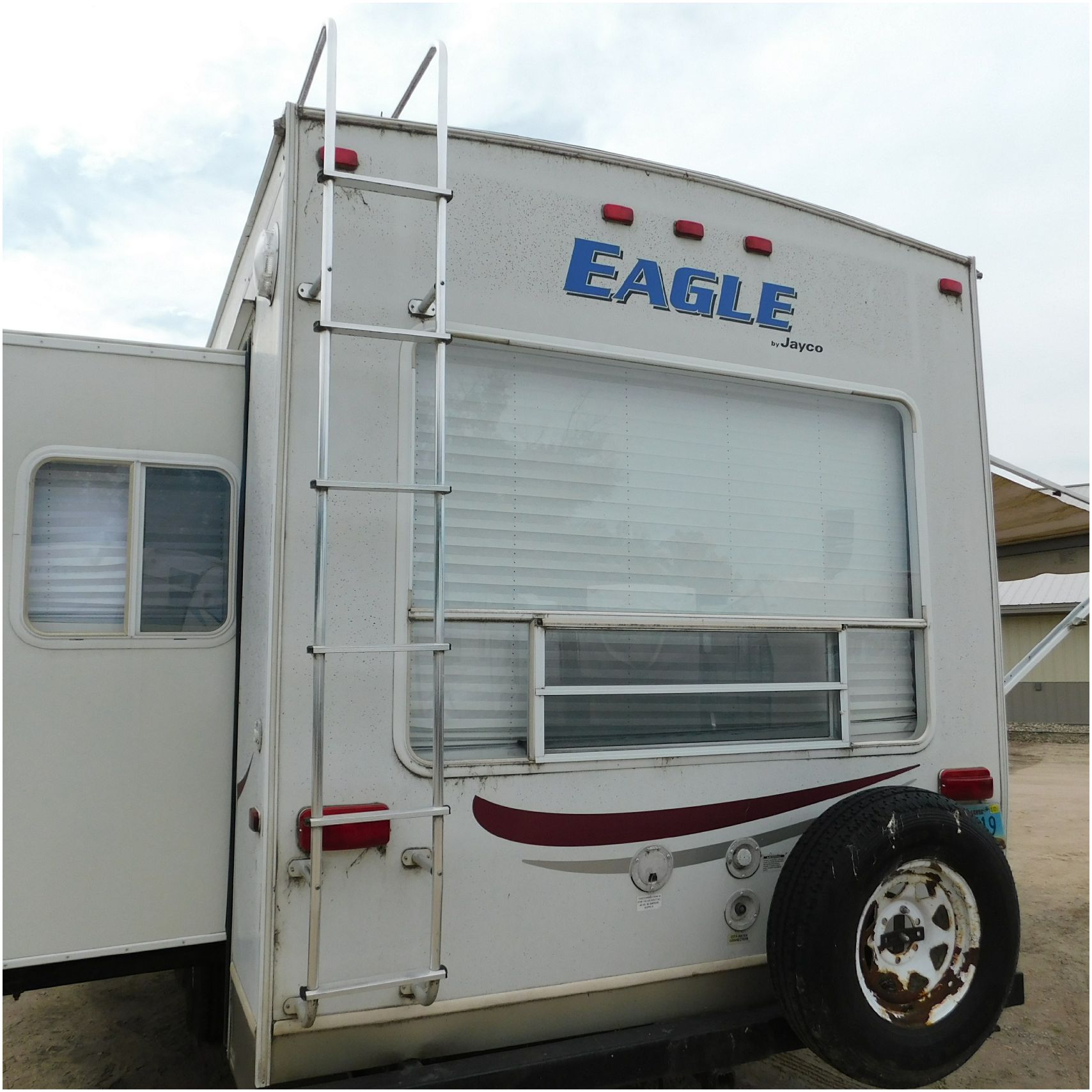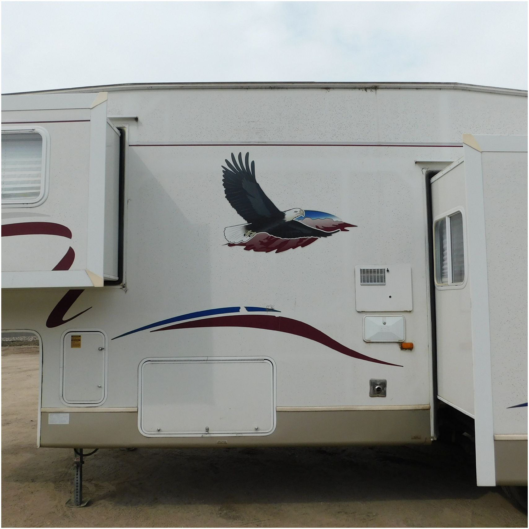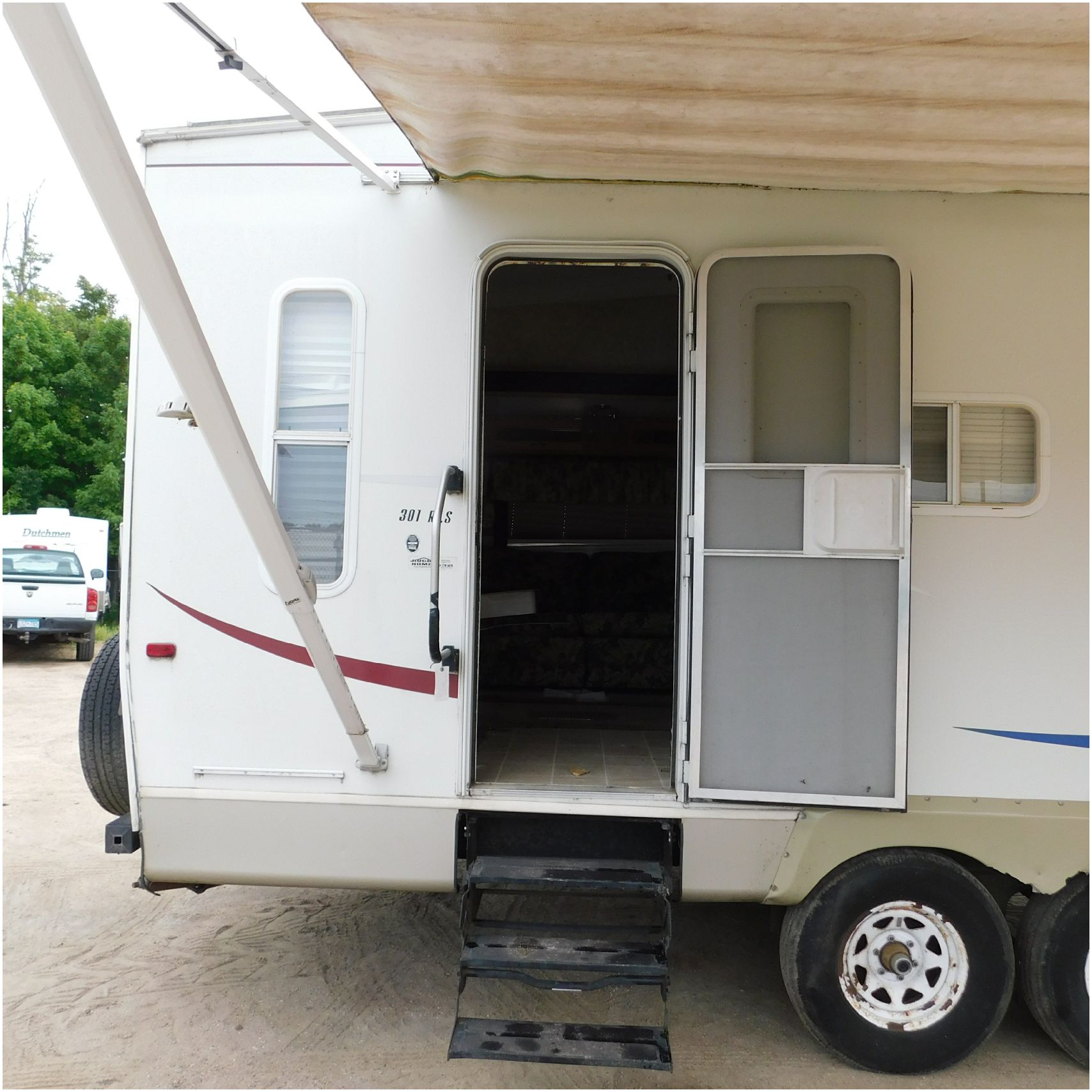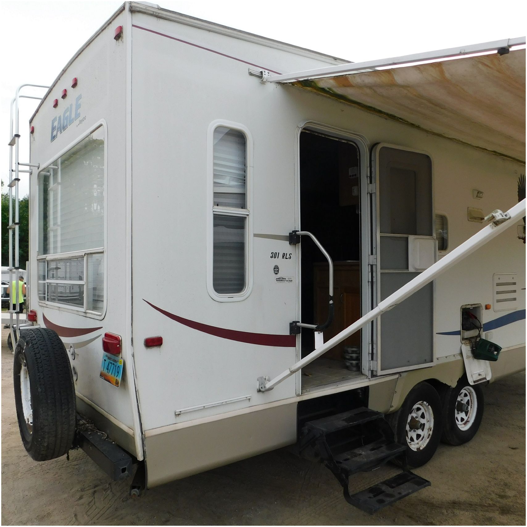 Up for auction is a 2005 Jayco Eagle 301RLS. This 33’ 5th wheel comes to us with roof damage. The front of the camper is weathered. The driver side is pretty beat up and weathered. The rear is also weathered. The passenger side is weathered and the awing is in pretty tough shape. The bottom trim is dented and the fender is cracked. The roof is caving in and the rafters are damaged. The roof does have a couple holes in the rubber. The inside all around is in tough shape with the roof being damaged causing a hole. The camper has water damage all throughout the inside. The complete camper all around is pretty beat up and in toughs shape. Good Luck Bidding on this Camper!
