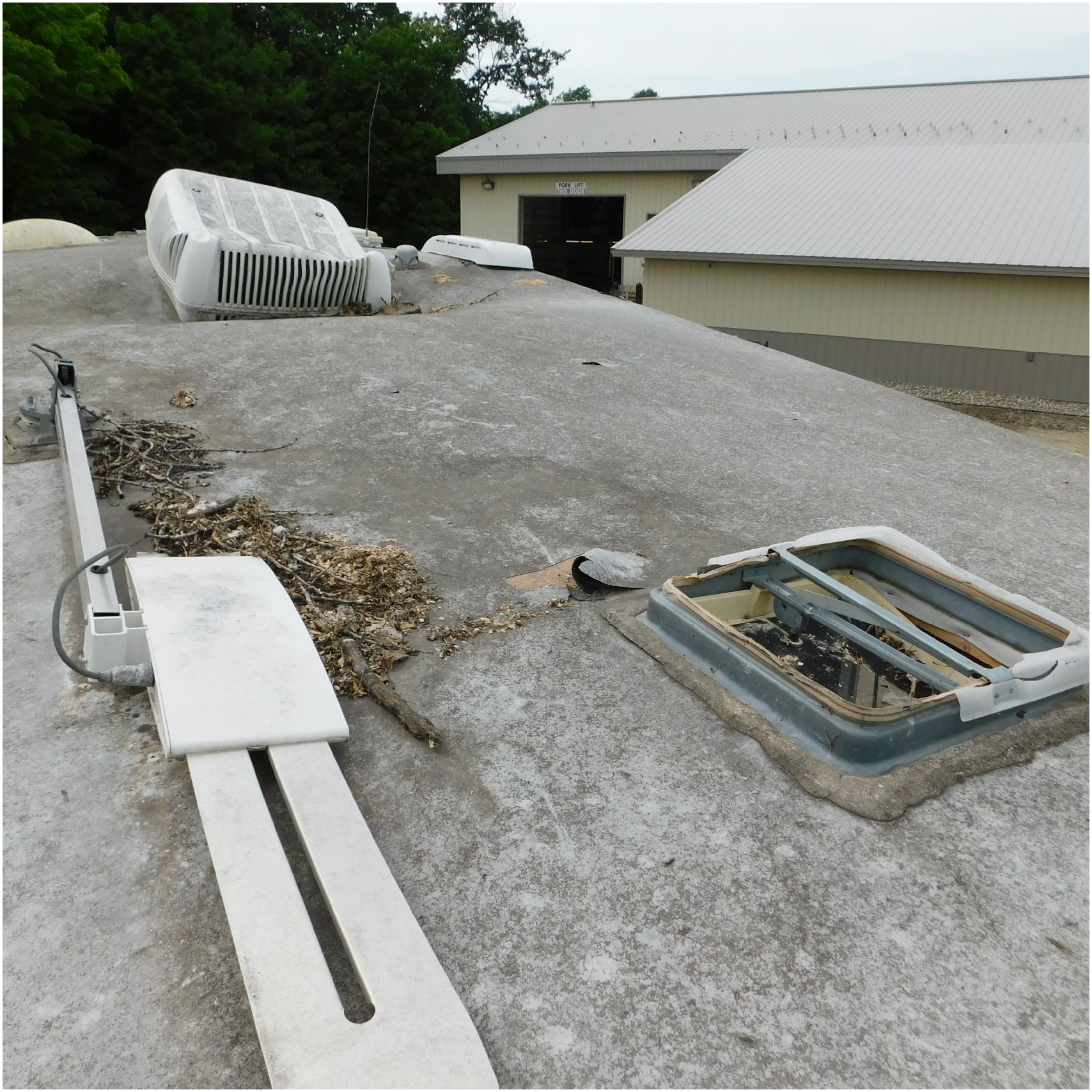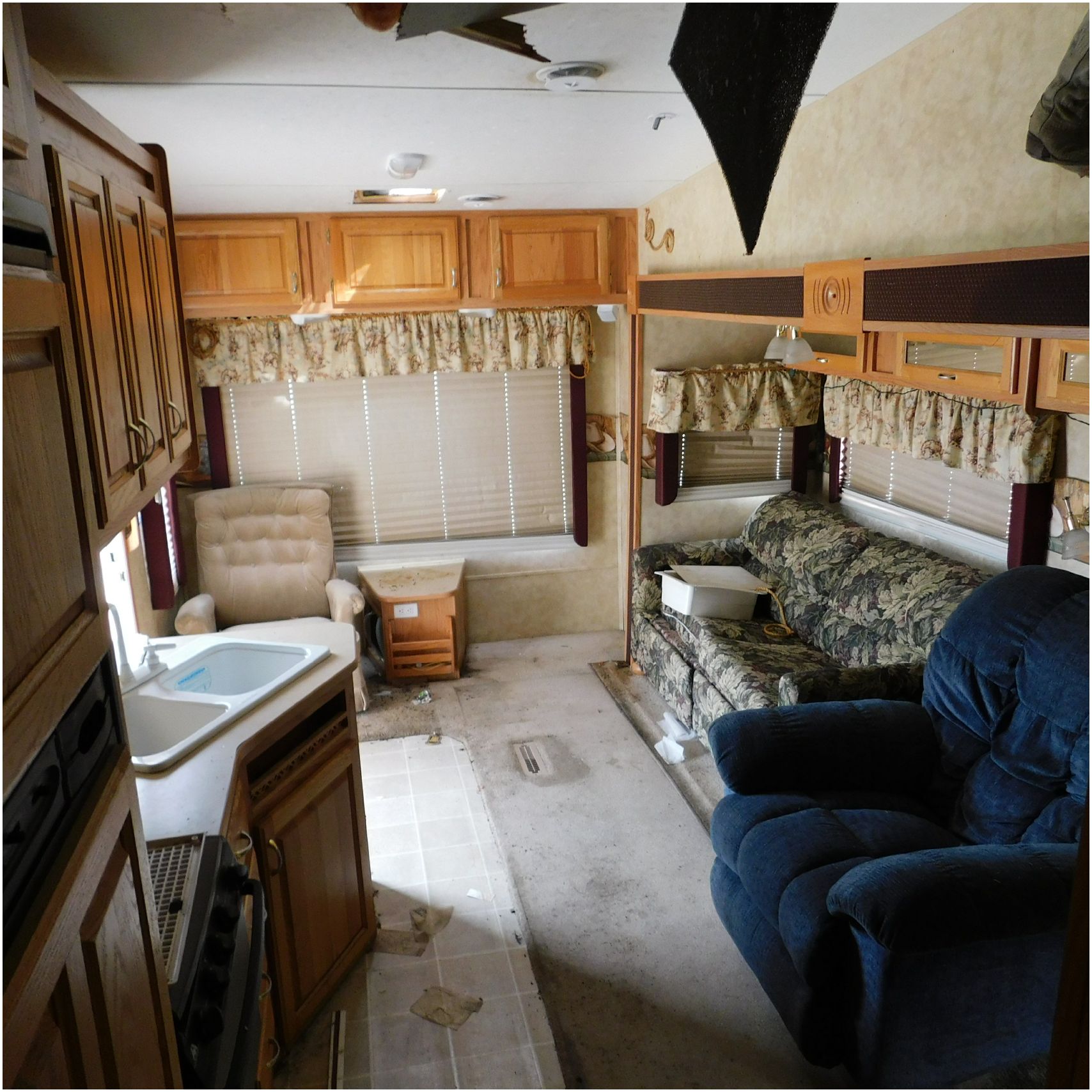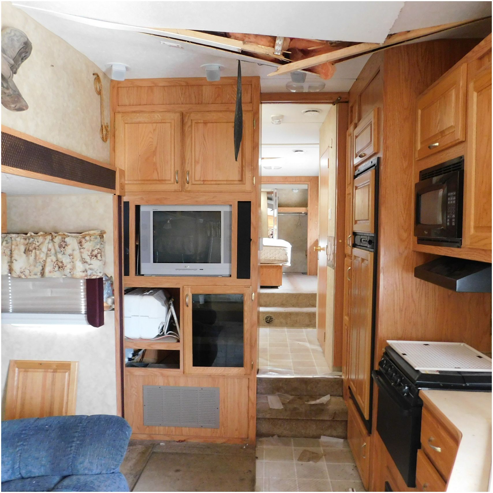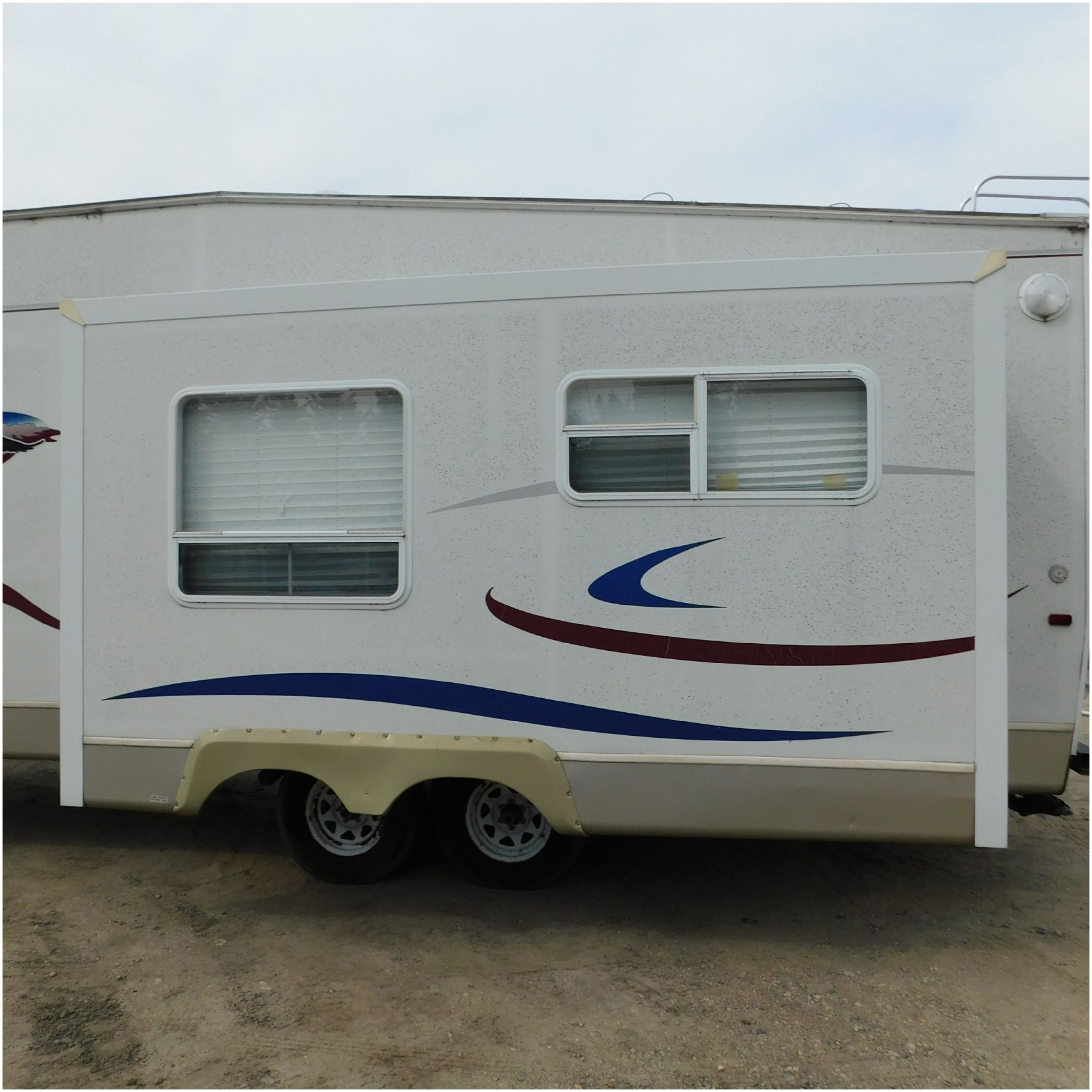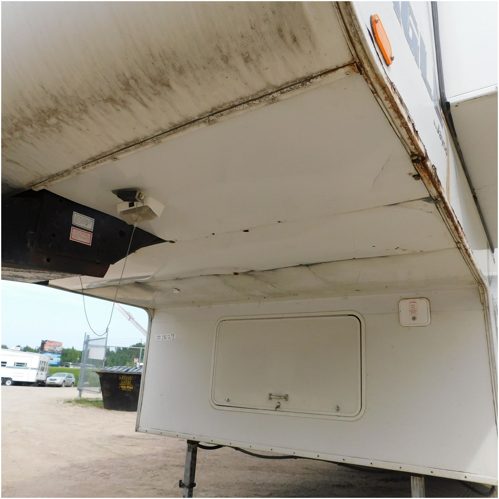 Up for auction is a 2005 Jayco Eagle 301RLS. This 33’ 5th wheel comes to us with roof damage. The front of the camper is weathered. The driver side is pretty beat up and weathered. The rear is also weathered. The passenger side is weathered and the awing is in pretty tough shape. The bottom trim is dented and the fender is cracked. The roof is caving in and the rafters are damaged. The roof does have a couple holes in the rubber. The inside all around is in tough shape with the roof being damaged causing a hole. The camper has water damage all throughout the inside. The complete camper all around is pretty beat up and in toughs shape. Good Luck Bidding on this Camper!