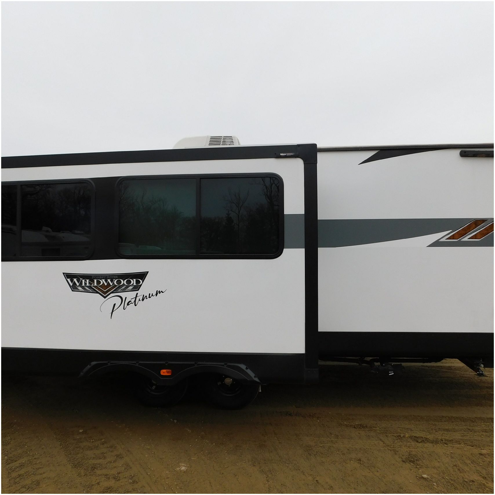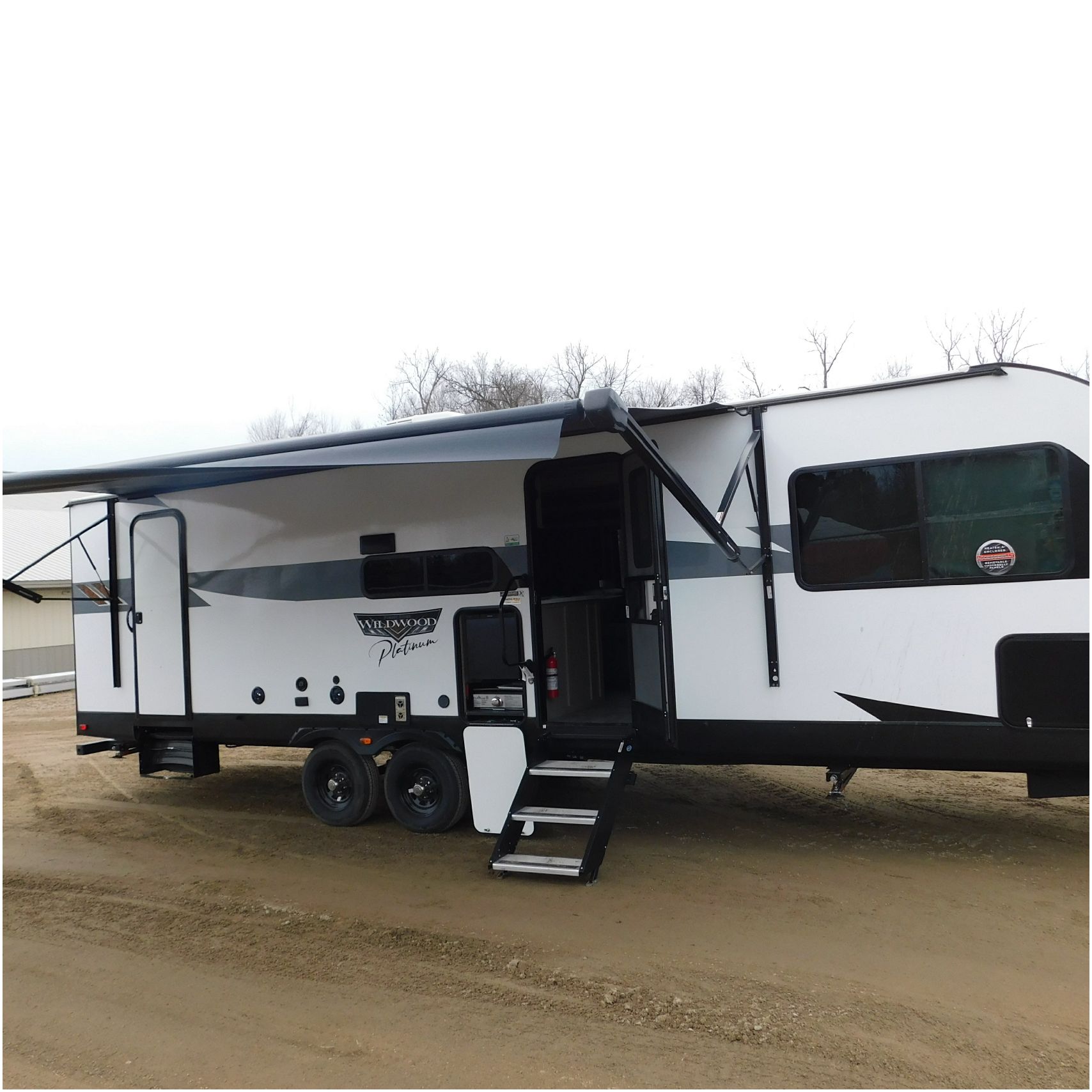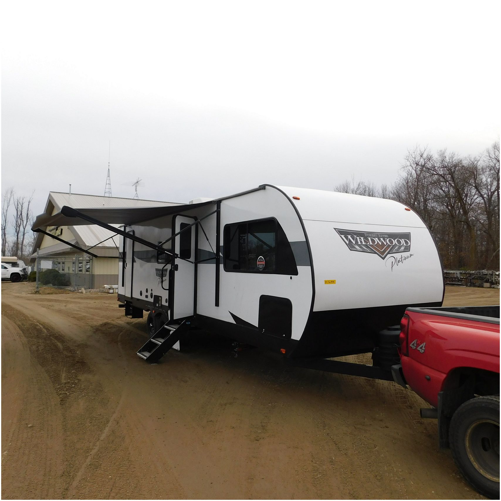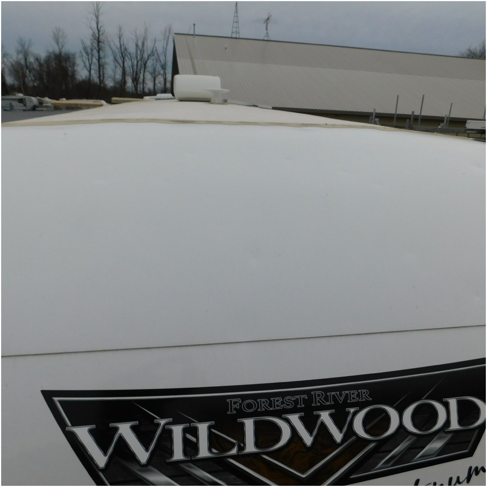 2014 Wildwood Platinum 26DBUD. This travel trailer comes to us with hail damage. The front has hail dents along the rounded part up top. The driver side is in nice shape and the slide out works as it should. The rear looks as it should. The passenger side has a couple small light hail dents. The awing extends and retracts as it should. The roof appears as it should besides the skylights having some stress marks from the hail and the solar panel is damaged from the hail. The inside completely all around is in very nice shape and clean!