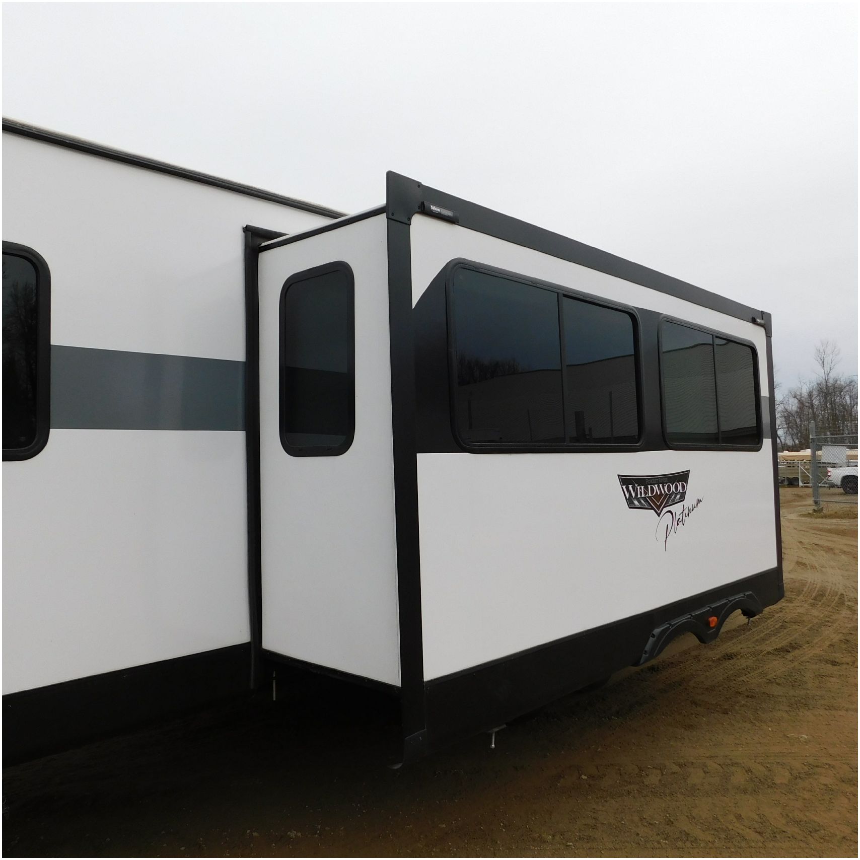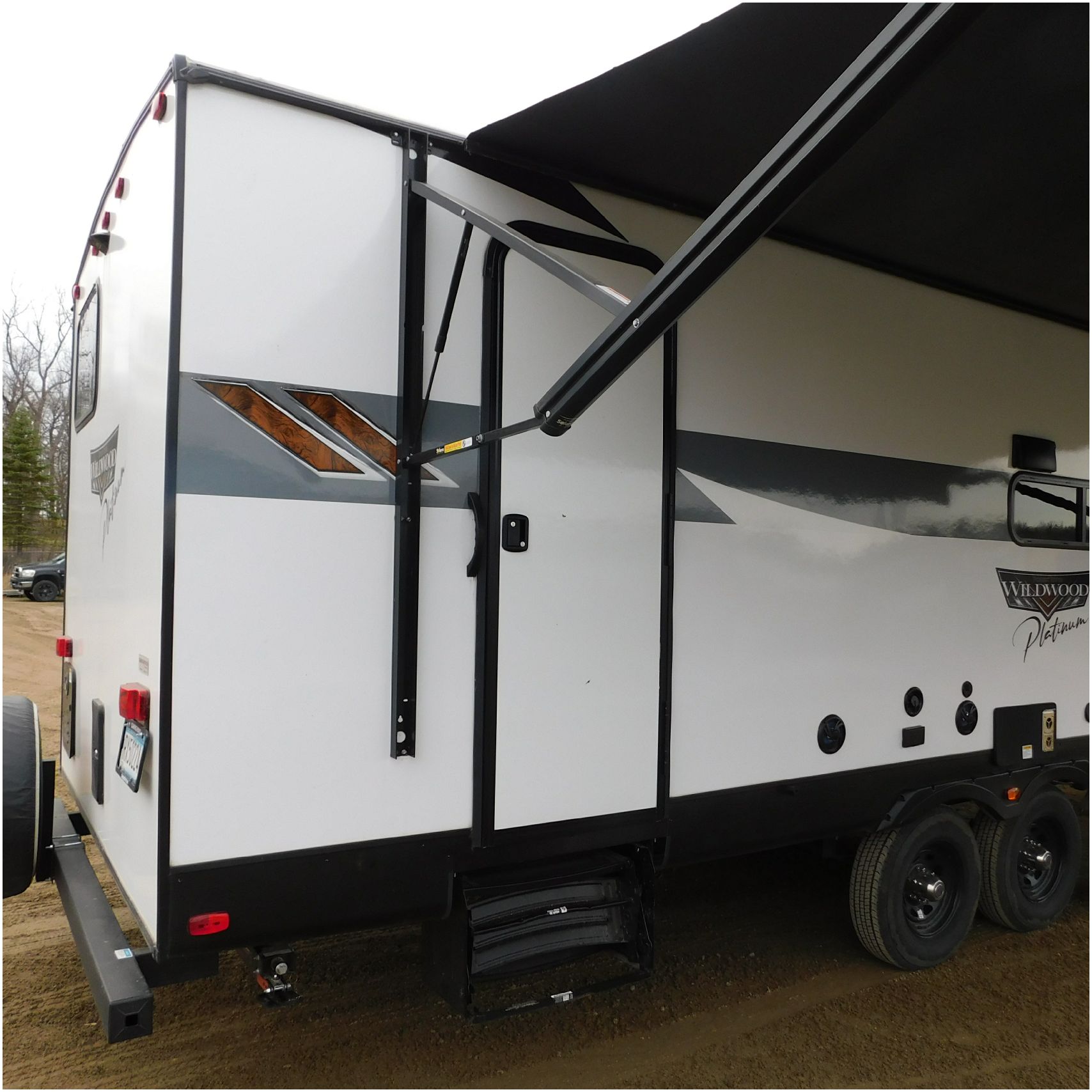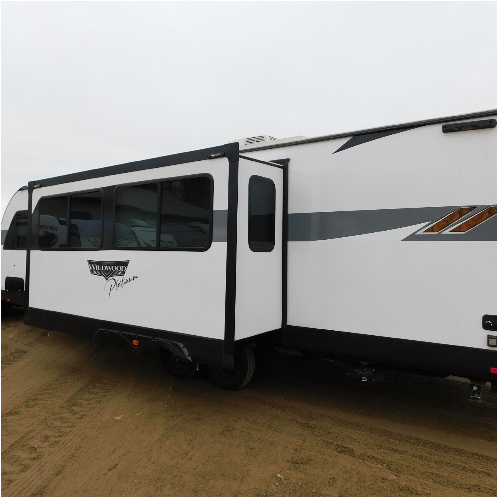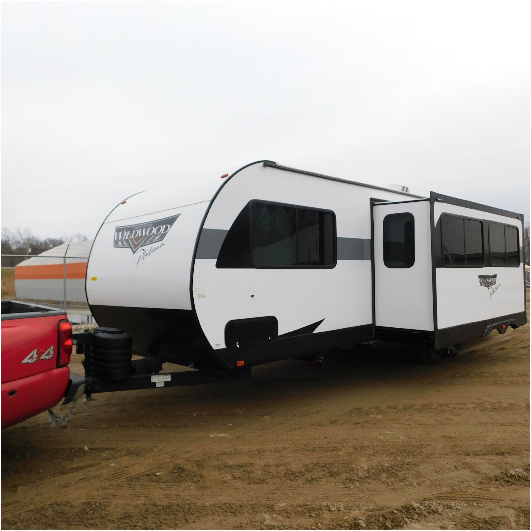 2014 Wildwood Platinum 26DBUD. This travel trailer comes to us with hail damage. The front has hail dents along the rounded part up top. The driver side is in nice shape and the slide out works as it should. The rear looks as it should. The passenger side has a couple small light hail dents. The awing extends and retracts as it should. The roof appears as it should besides the skylights having some stress marks from the hail and the solar panel is damaged from the hail. The inside completely all around is in very nice shape and clean!