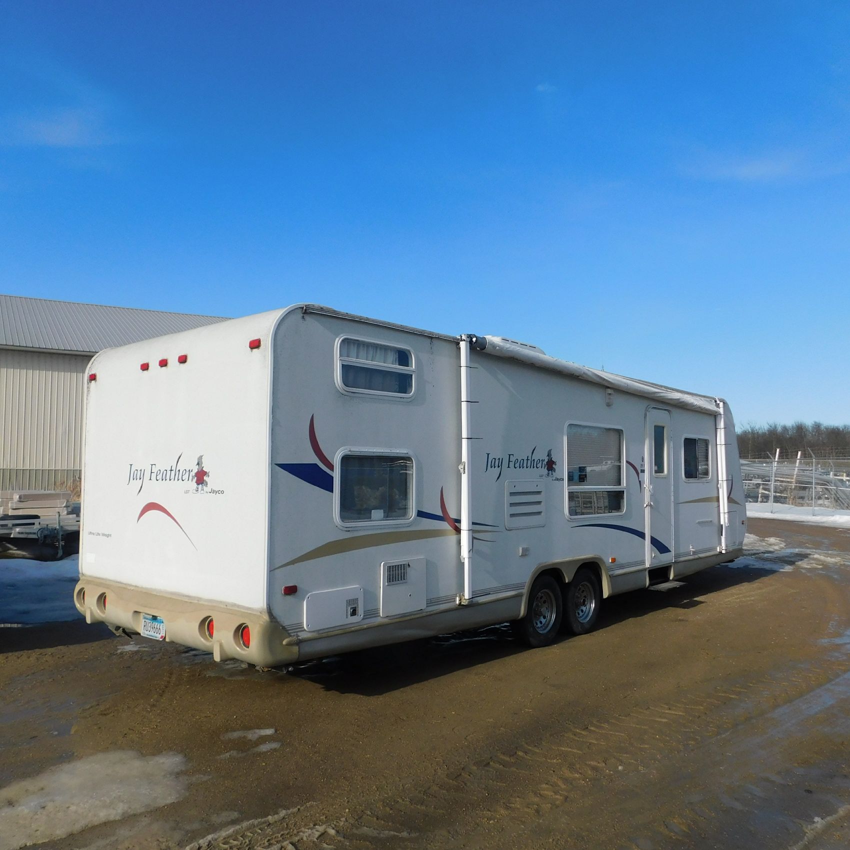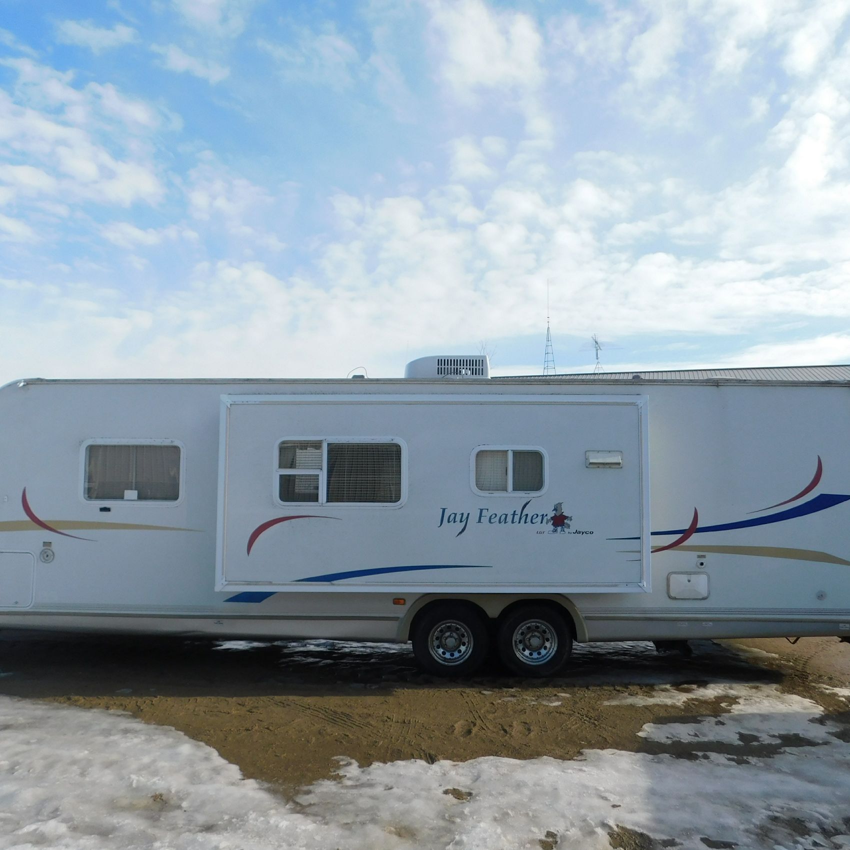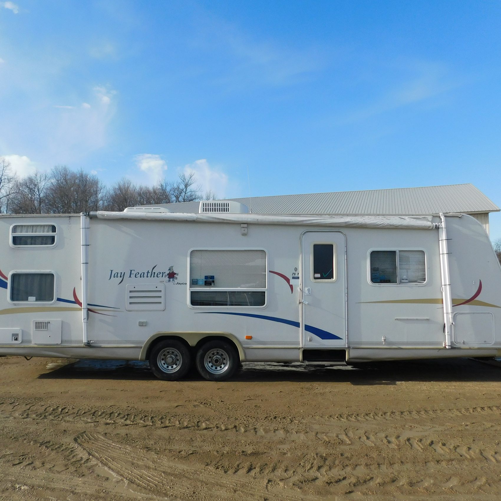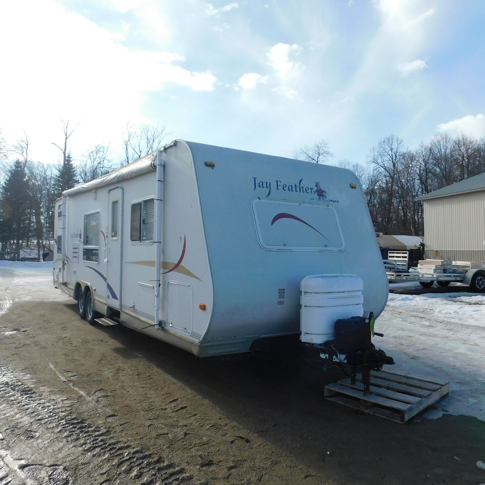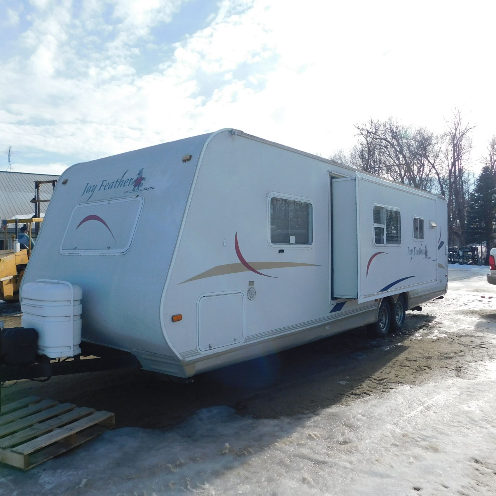 Coming to us is Stock # 1814 2005 Jayco Jay Feather LGT 29Y travel trailer camper that is 29FT in length a bumper style hitch and has one slide out in the living room area that comes to us with. This camper came to us with water damage, and the outside appears weathered with faded paint all around and some of the decals are either cracking/ peeling or in spots coming off. Starting at the front there is some mildew built up around the roof marker lamps and the rest looks ok, on the drivers side you will notice the wheels have some surface rust, the rear of the camper the finish on the plastic bumper is peeling off, the left side of the bumper is hanging a little loose and unfastened on one part. On the passenger side the awning appears to be not too good of shape, and we did not deploy it for pictures for that reason. The roof appears to be in ok shape from what we could see. On the inside of the camper the linoleum flooring is taped up in areas and looks water damaged, as it is cracked and bowing in some areas and there are noticeable water stains, the main floor seems sturdy but could have water damage also that we cannot see because it is covered. This camper is being sold AS-IS and is ready for the next buyer to fix it up and enjoy. Good luck bidding on this item.
