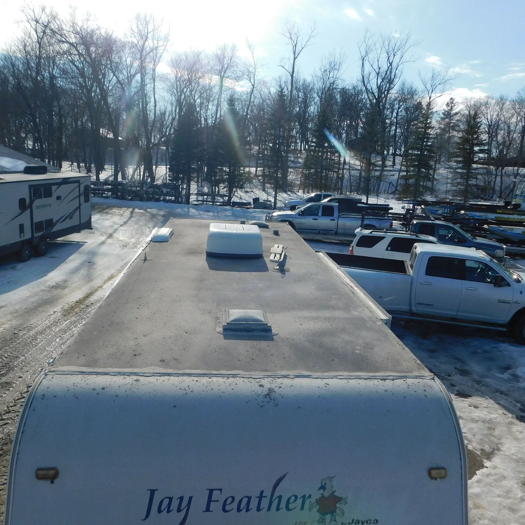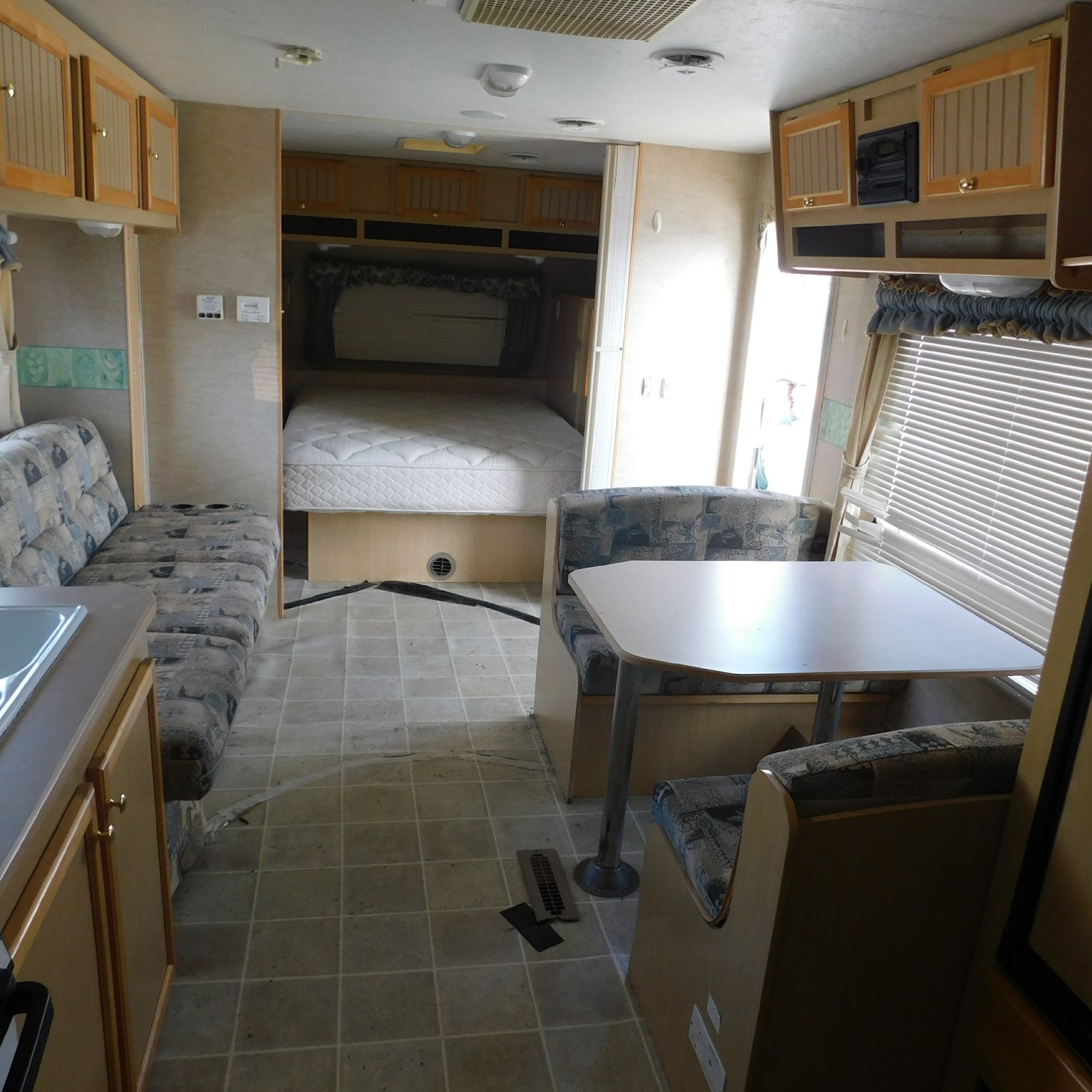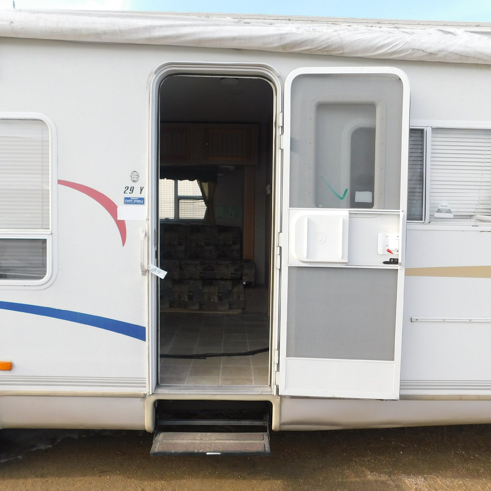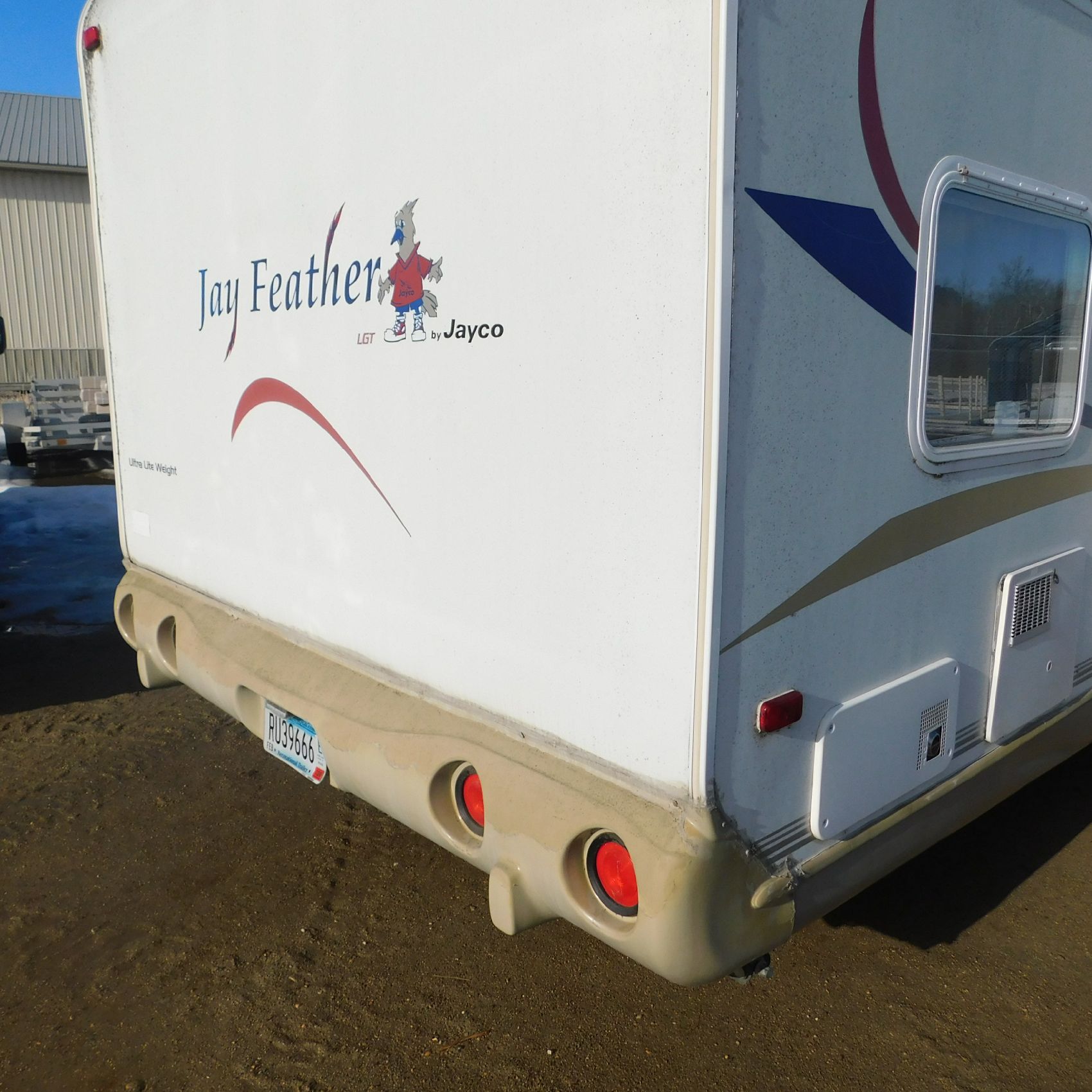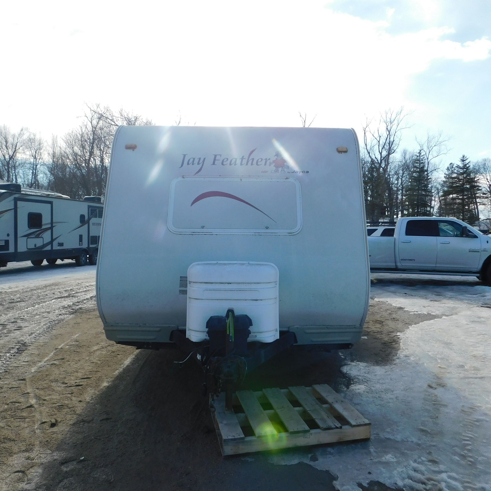 Coming to us is Stock # 1814 2005 Jayco Jay Feather LGT 29Y travel trailer camper that is 29FT in length a bumper style hitch and has one slide out in the living room area that comes to us with. This camper came to us with water damage, and the outside appears weathered with faded paint all around and some of the decals are either cracking/ peeling or in spots coming off. Starting at the front there is some mildew built up around the roof marker lamps and the rest looks ok, on the drivers side you will notice the wheels have some surface rust, the rear of the camper the finish on the plastic bumper is peeling off, the left side of the bumper is hanging a little loose and unfastened on one part. On the passenger side the awning appears to be not too good of shape, and we did not deploy it for pictures for that reason. The roof appears to be in ok shape from what we could see. On the inside of the camper the linoleum flooring is taped up in areas and looks water damaged, as it is cracked and bowing in some areas and there are noticeable water stains, the main floor seems sturdy but could have water damage also that we cannot see because it is covered. This camper is being sold AS-IS and is ready for the next buyer to fix it up and enjoy. Good luck bidding on this item.
