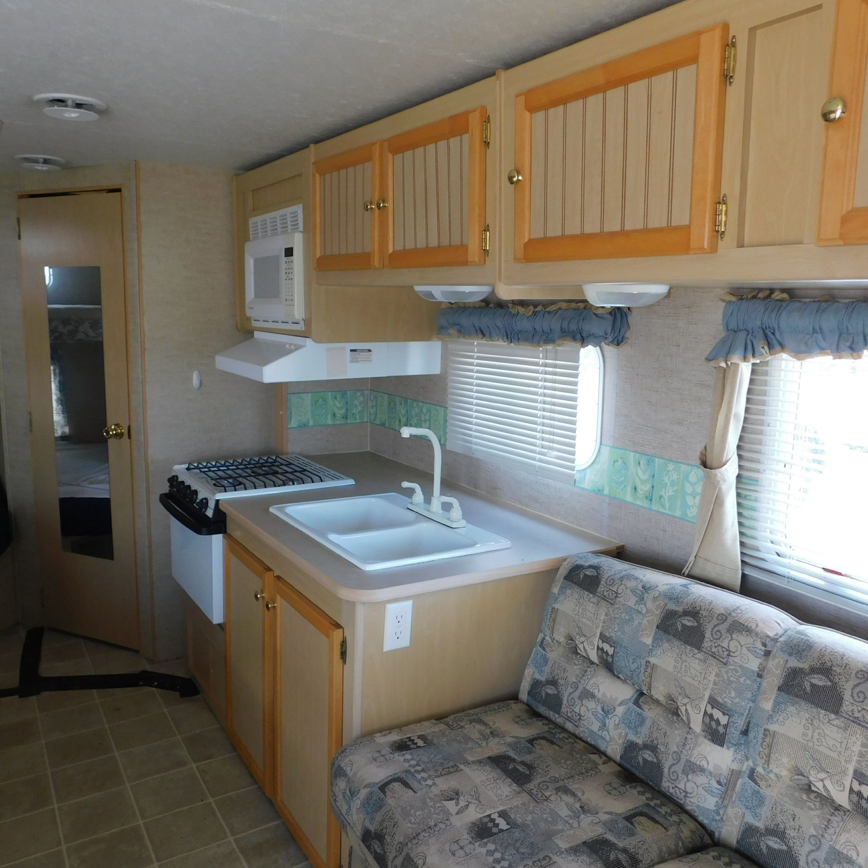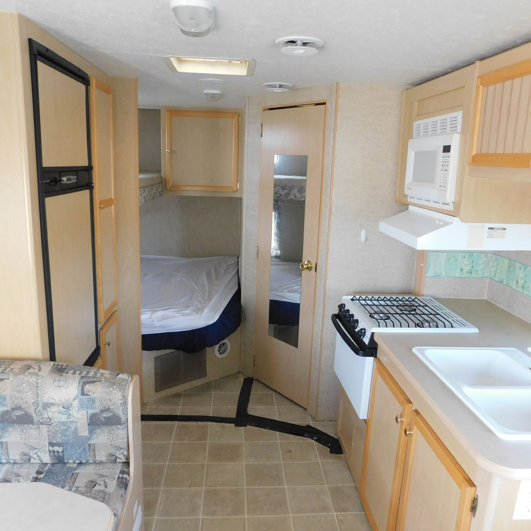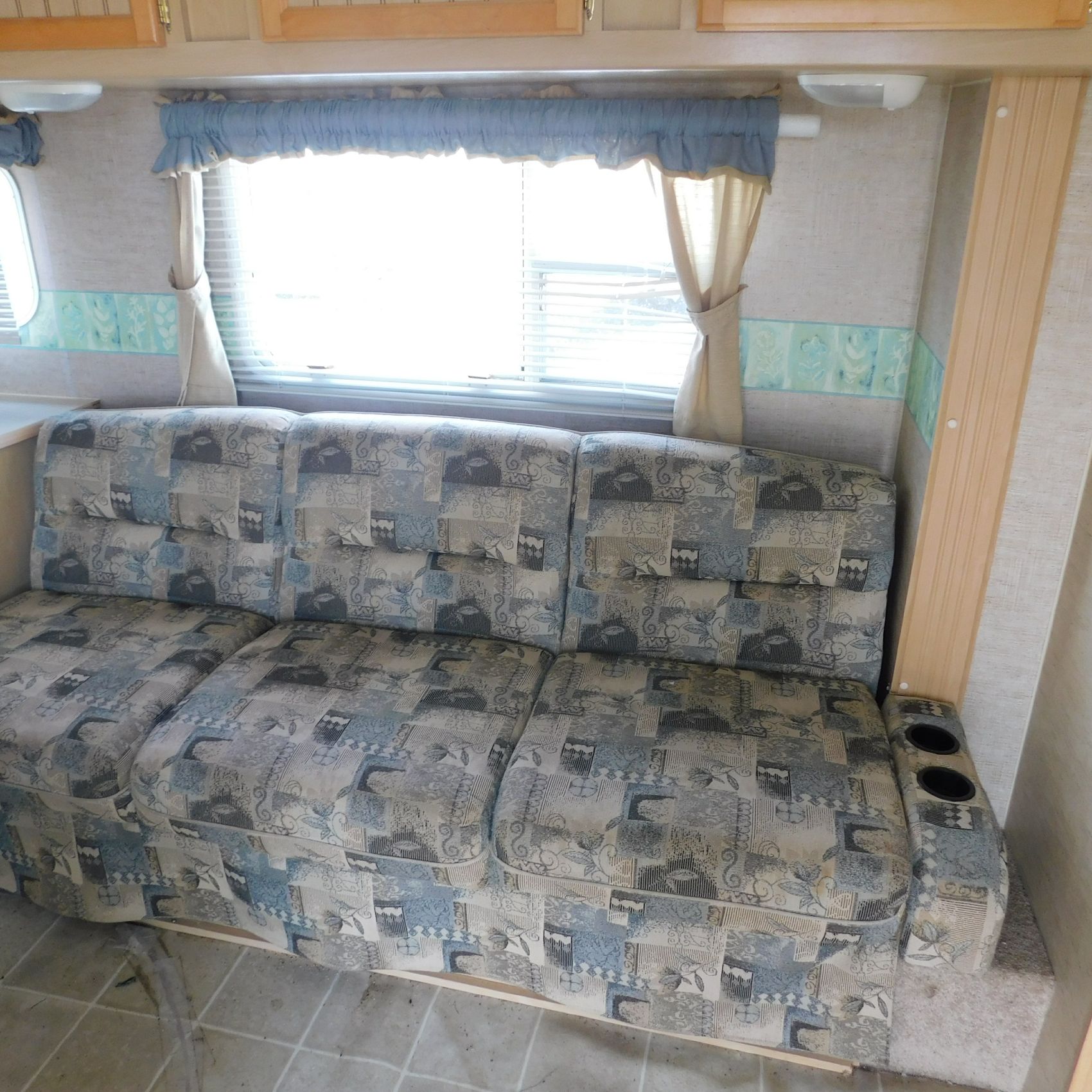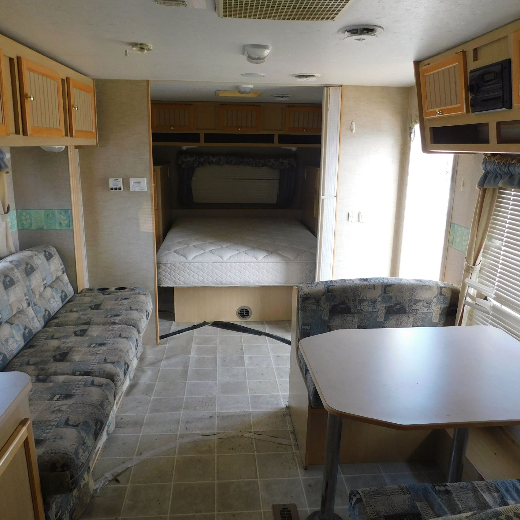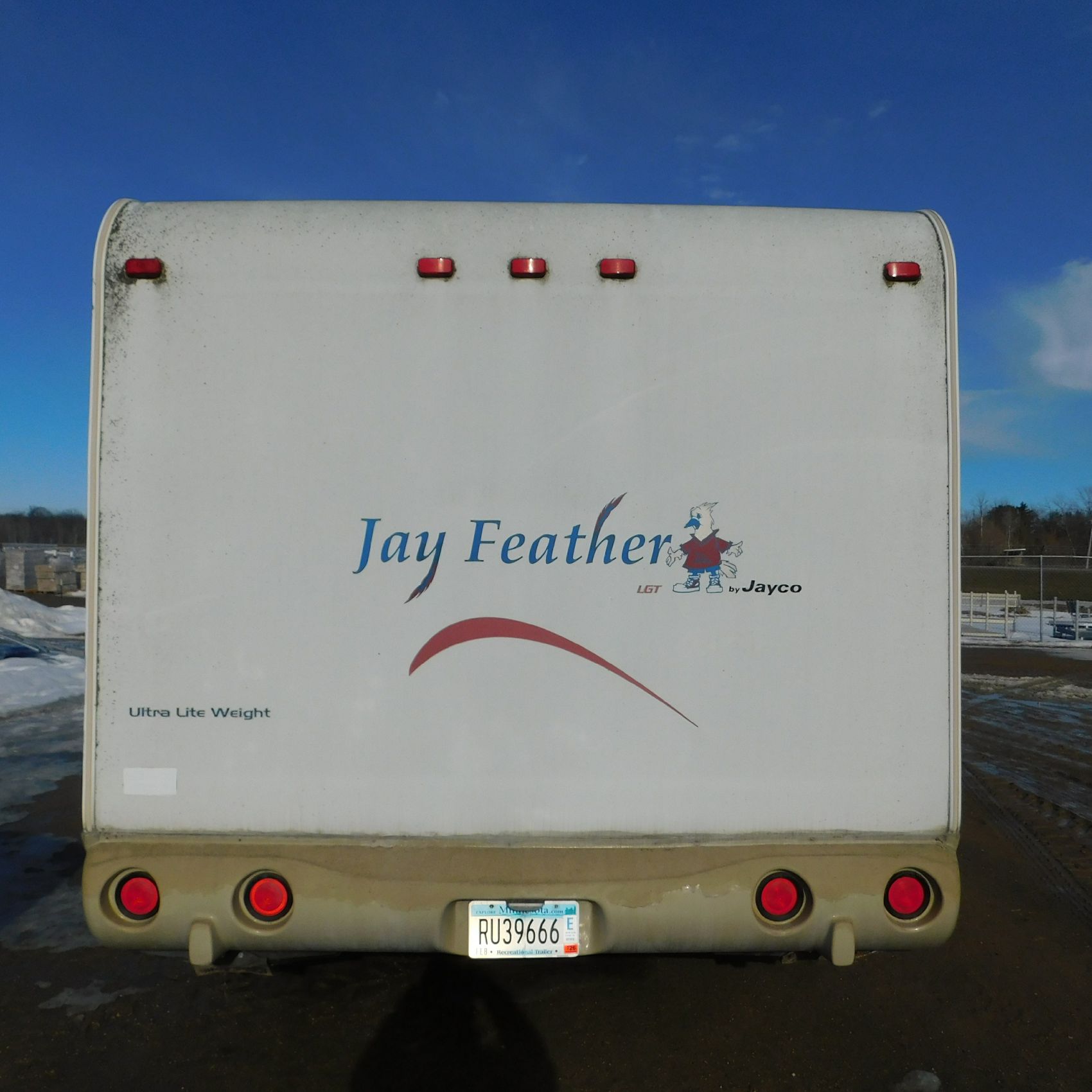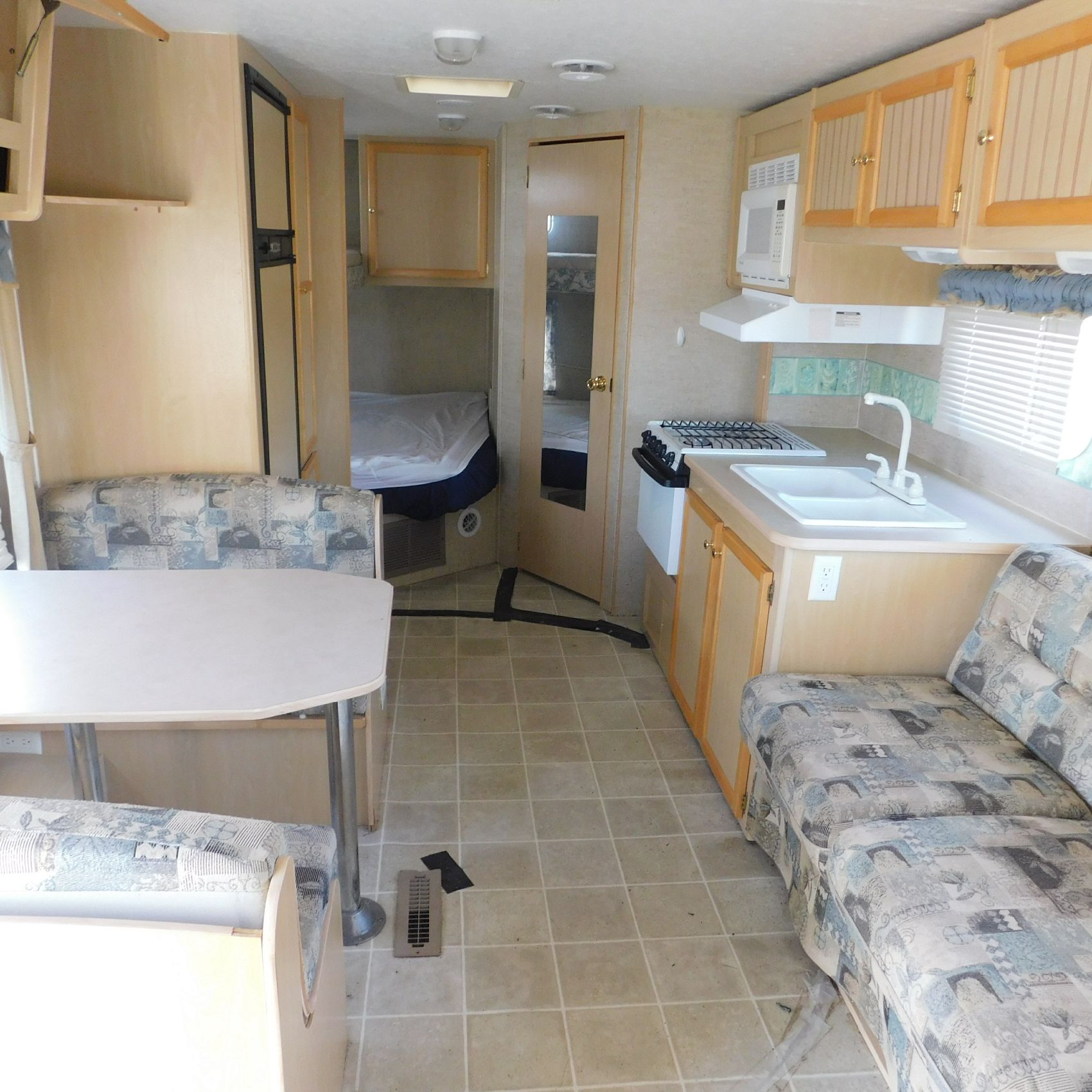 Coming to us is Stock # 1814 2005 Jayco Jay Feather LGT 29Y travel trailer camper that is 29FT in length a bumper style hitch and has one slide out in the living room area that comes to us with. This camper came to us with water damage, and the outside appears weathered with faded paint all around and some of the decals are either cracking/ peeling or in spots coming off. Starting at the front there is some mildew built up around the roof marker lamps and the rest looks ok, on the drivers side you will notice the wheels have some surface rust, the rear of the camper the finish on the plastic bumper is peeling off, the left side of the bumper is hanging a little loose and unfastened on one part. On the passenger side the awning appears to be not too good of shape, and we did not deploy it for pictures for that reason. The roof appears to be in ok shape from what we could see. On the inside of the camper the linoleum flooring is taped up in areas and looks water damaged, as it is cracked and bowing in some areas and there are noticeable water stains, the main floor seems sturdy but could have water damage also that we cannot see because it is covered. This camper is being sold AS-IS and is ready for the next buyer to fix it up and enjoy. Good luck bidding on this item.