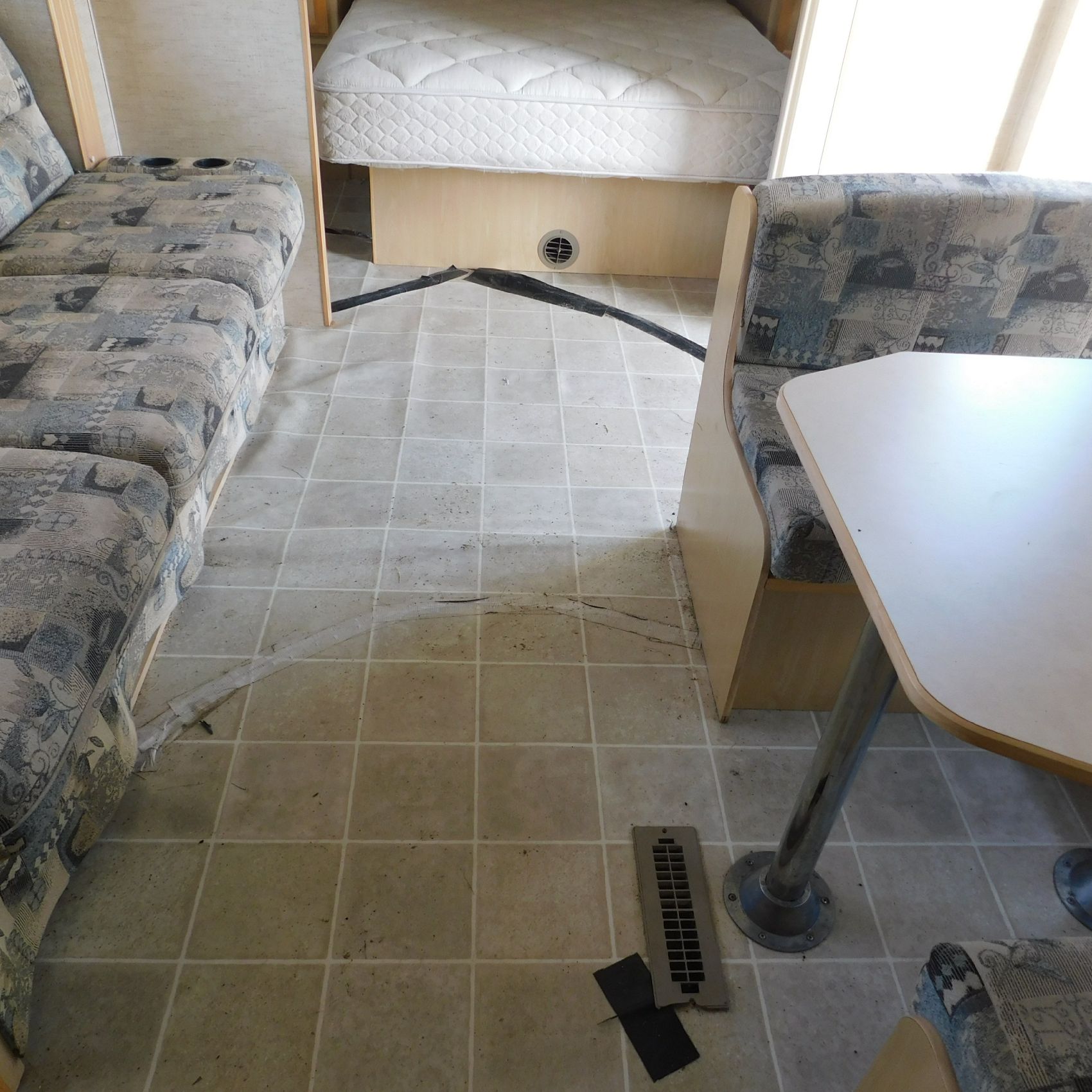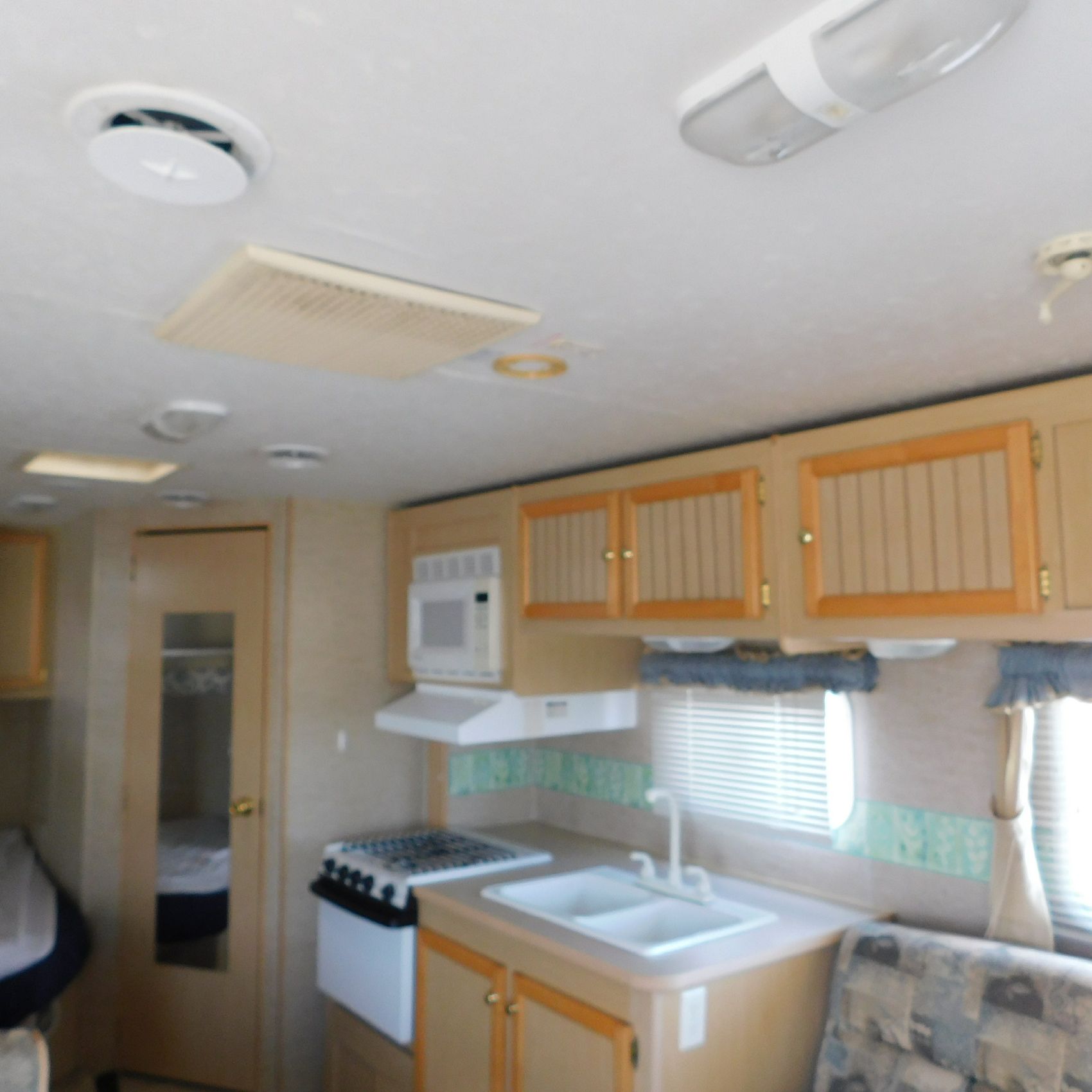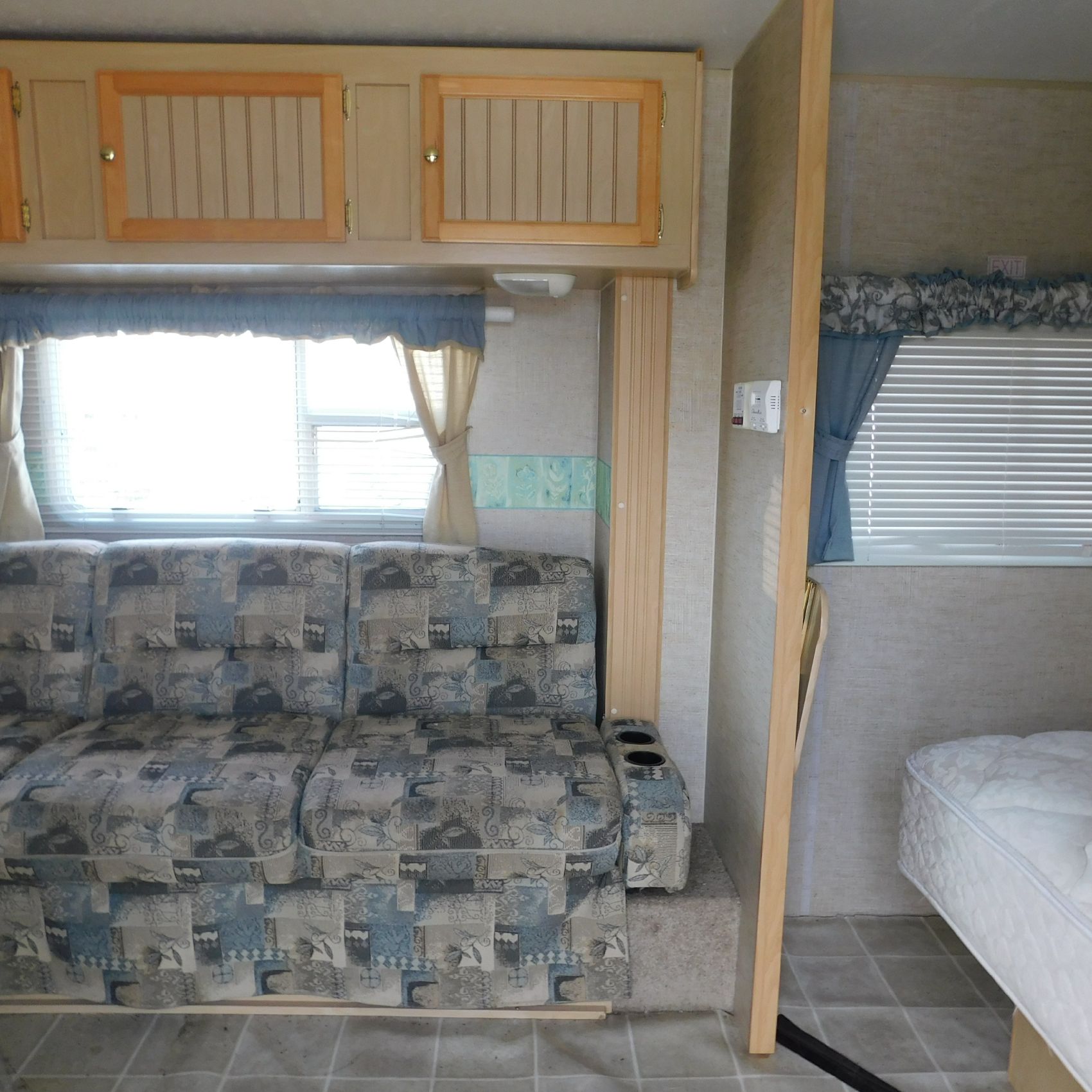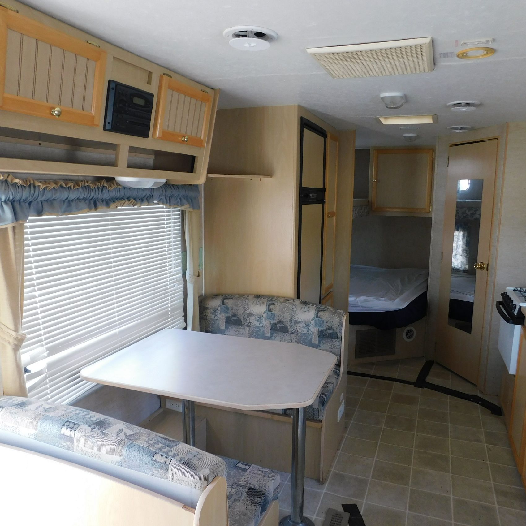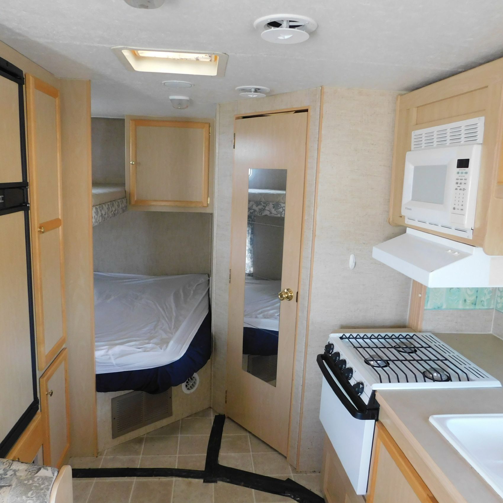 Coming to us is Stock # 1814 2005 Jayco Jay Feather LGT 29Y travel trailer camper that is 29FT in length a bumper style hitch and has one slide out in the living room area that comes to us with. This camper came to us with water damage, and the outside appears weathered with faded paint all around and some of the decals are either cracking/ peeling or in spots coming off. Starting at the front there is some mildew built up around the roof marker lamps and the rest looks ok, on the drivers side you will notice the wheels have some surface rust, the rear of the camper the finish on the plastic bumper is peeling off, the left side of the bumper is hanging a little loose and unfastened on one part. On the passenger side the awning appears to be not too good of shape, and we did not deploy it for pictures for that reason. The roof appears to be in ok shape from what we could see. On the inside of the camper the linoleum flooring is taped up in areas and looks water damaged, as it is cracked and bowing in some areas and there are noticeable water stains, the main floor seems sturdy but could have water damage also that we cannot see because it is covered. This camper is being sold AS-IS and is ready for the next buyer to fix it up and enjoy. Good luck bidding on this item.