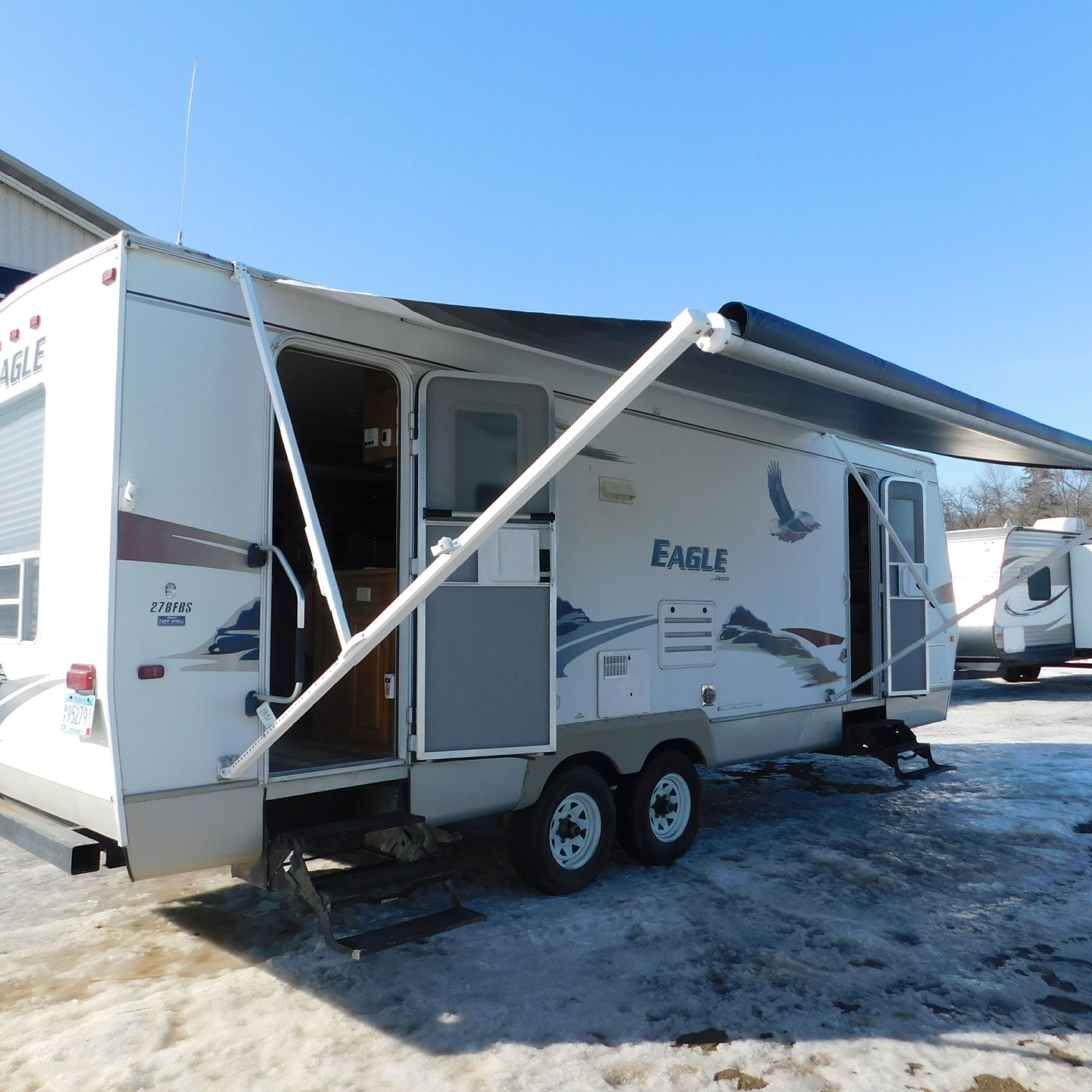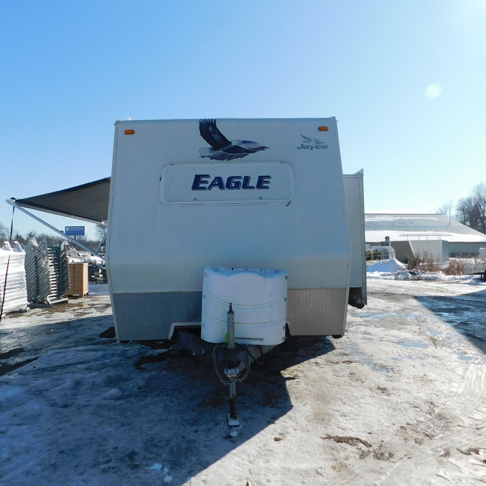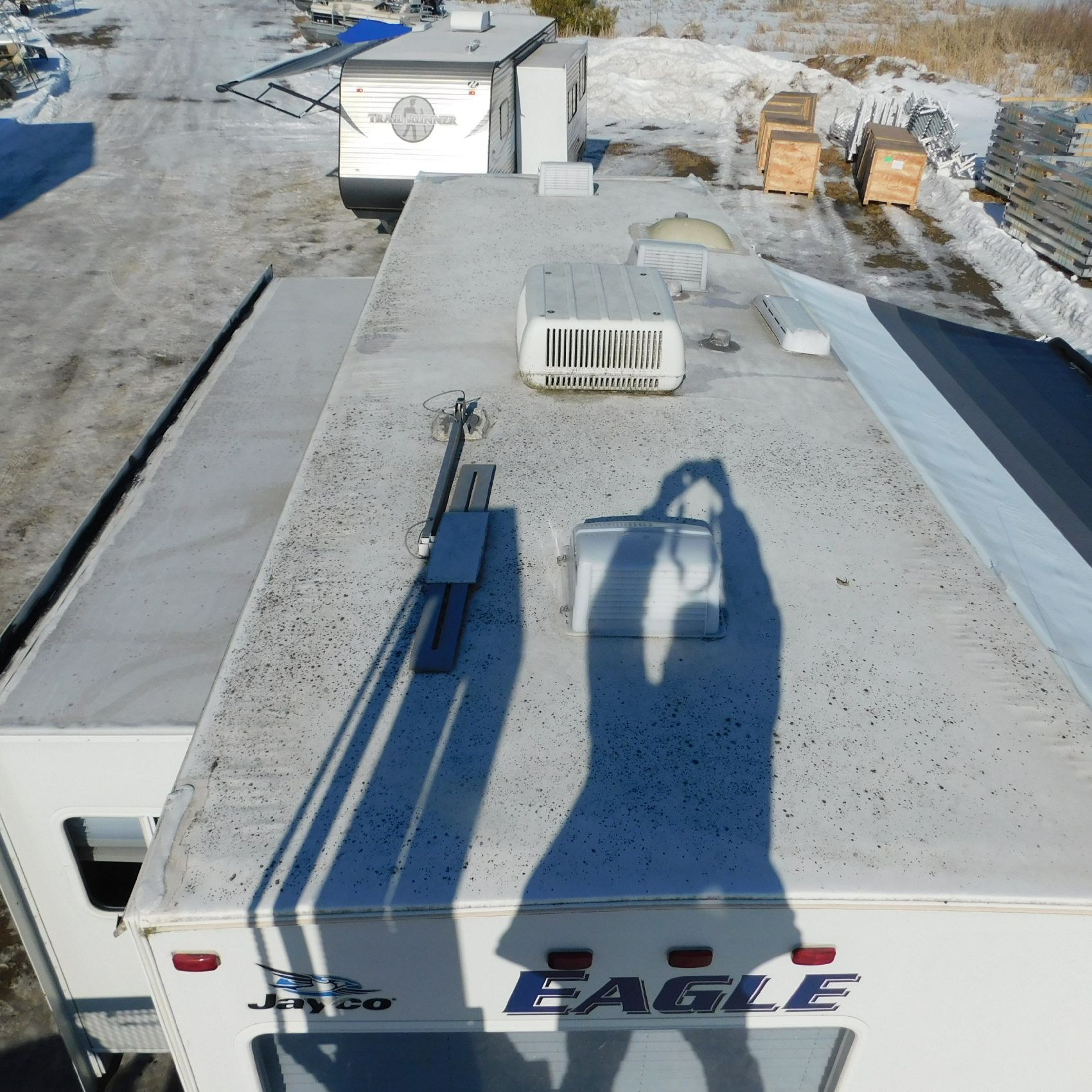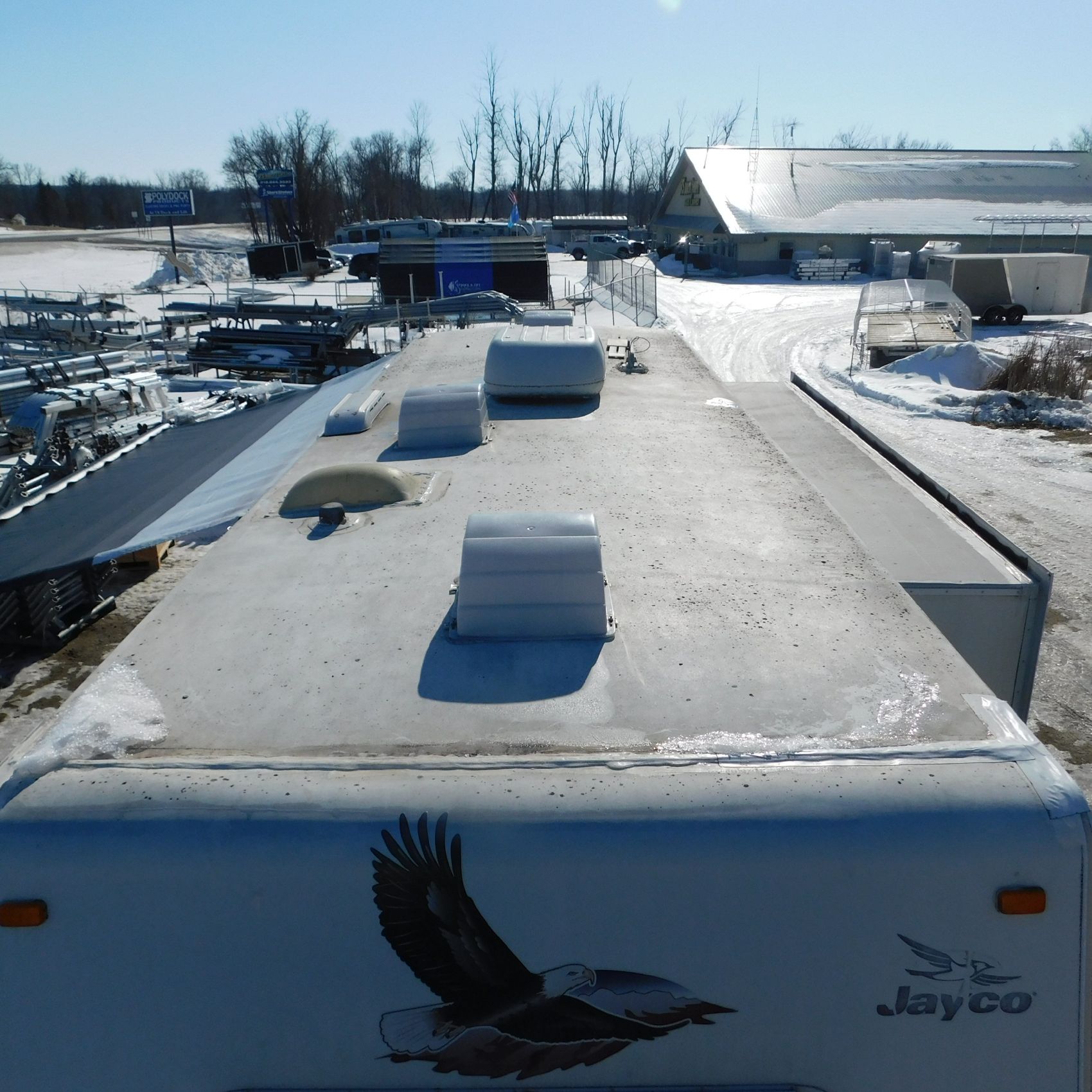 Coming to us is Stock #1831, a 2006 Jayco 278FBS Eagle travel trailer with a bumper‑style hitch. Based on the model number, it measures 28 feet in length, and the slide‑outs worked properly when tested. This camper was brought in due to roof damage—there is a hole in the roof, and water appears to have entered and spread through the roofing structure, causing soft spots and visible ripples in certain areas. However, the interior does not show noticeable signs of water damage.