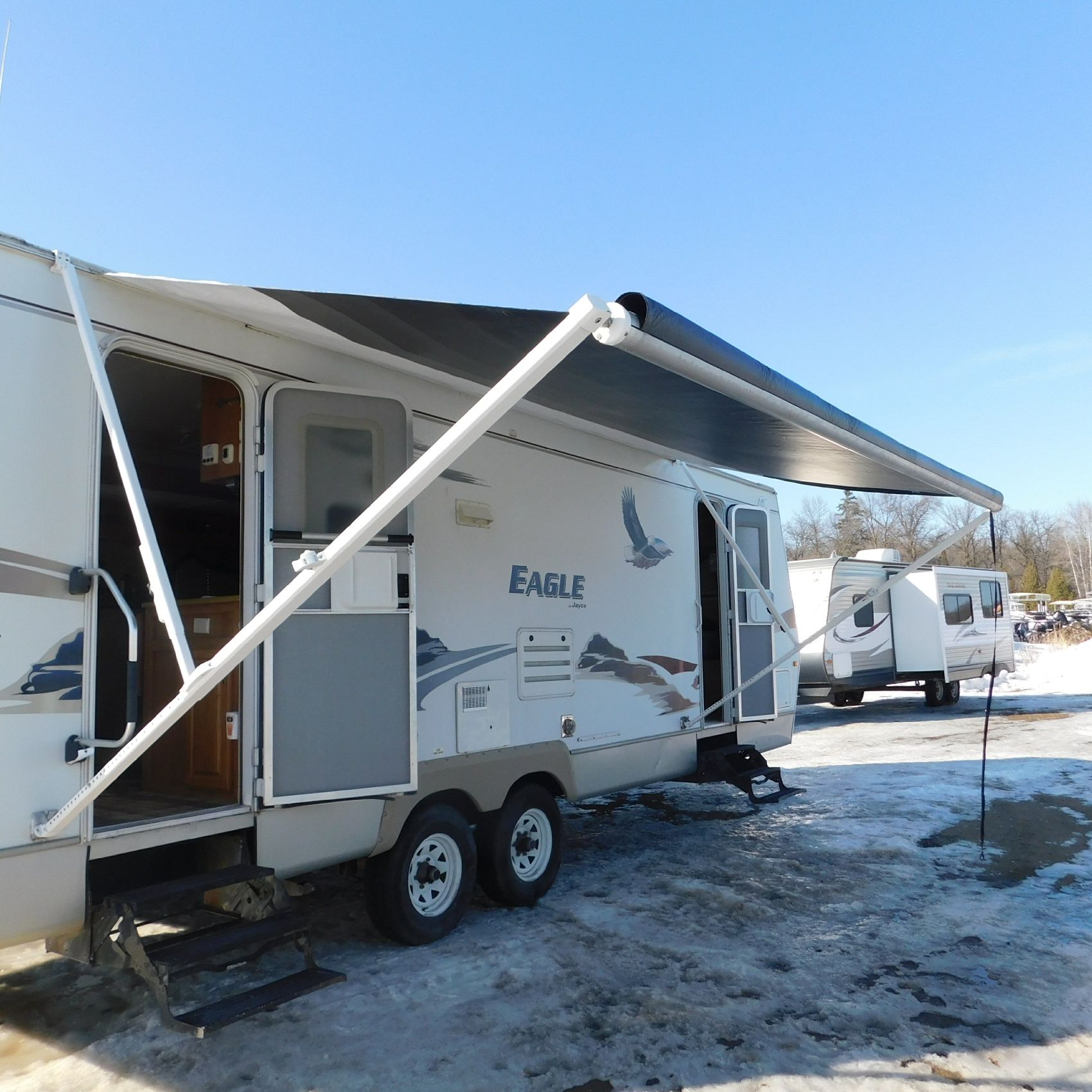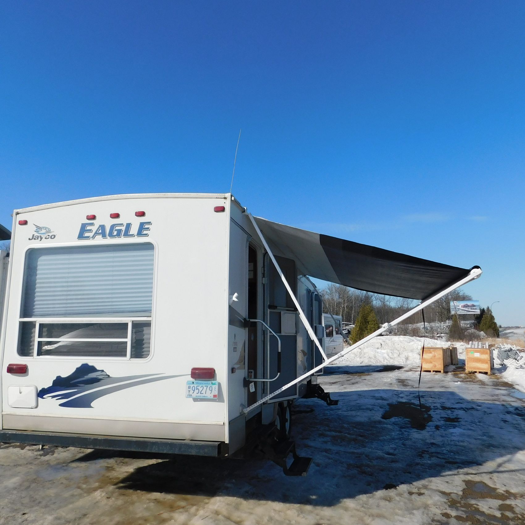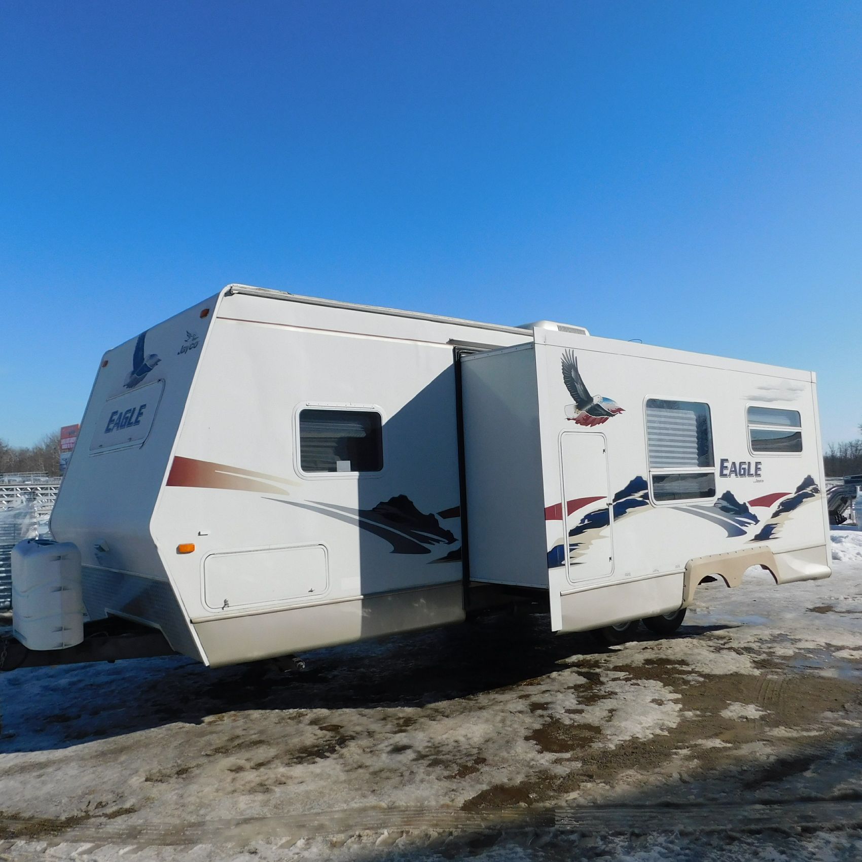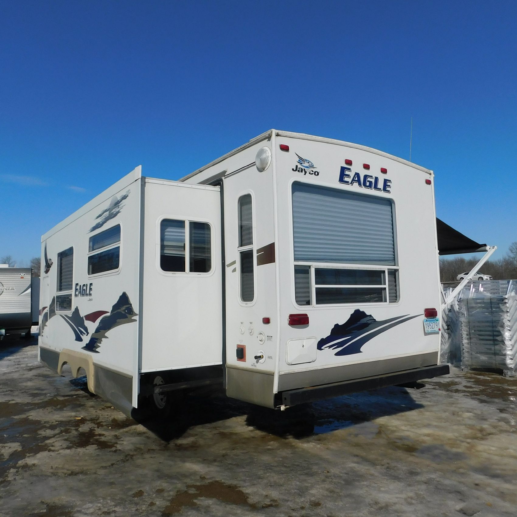 Coming to us is Stock #1831, a 2006 Jayco 278FBS Eagle travel trailer with a bumper‑style hitch. Based on the model number, it measures 28 feet in length, and the slide‑outs worked properly when tested. This camper was brought in due to roof damage—there is a hole in the roof, and water appears to have entered and spread through the roofing structure, causing soft spots and visible ripples in certain areas. However, the interior does not show noticeable signs of water damage.