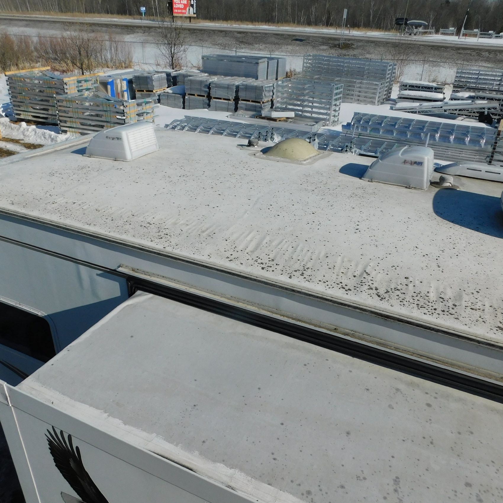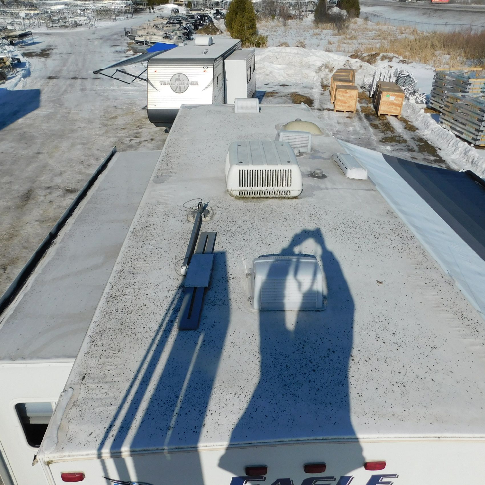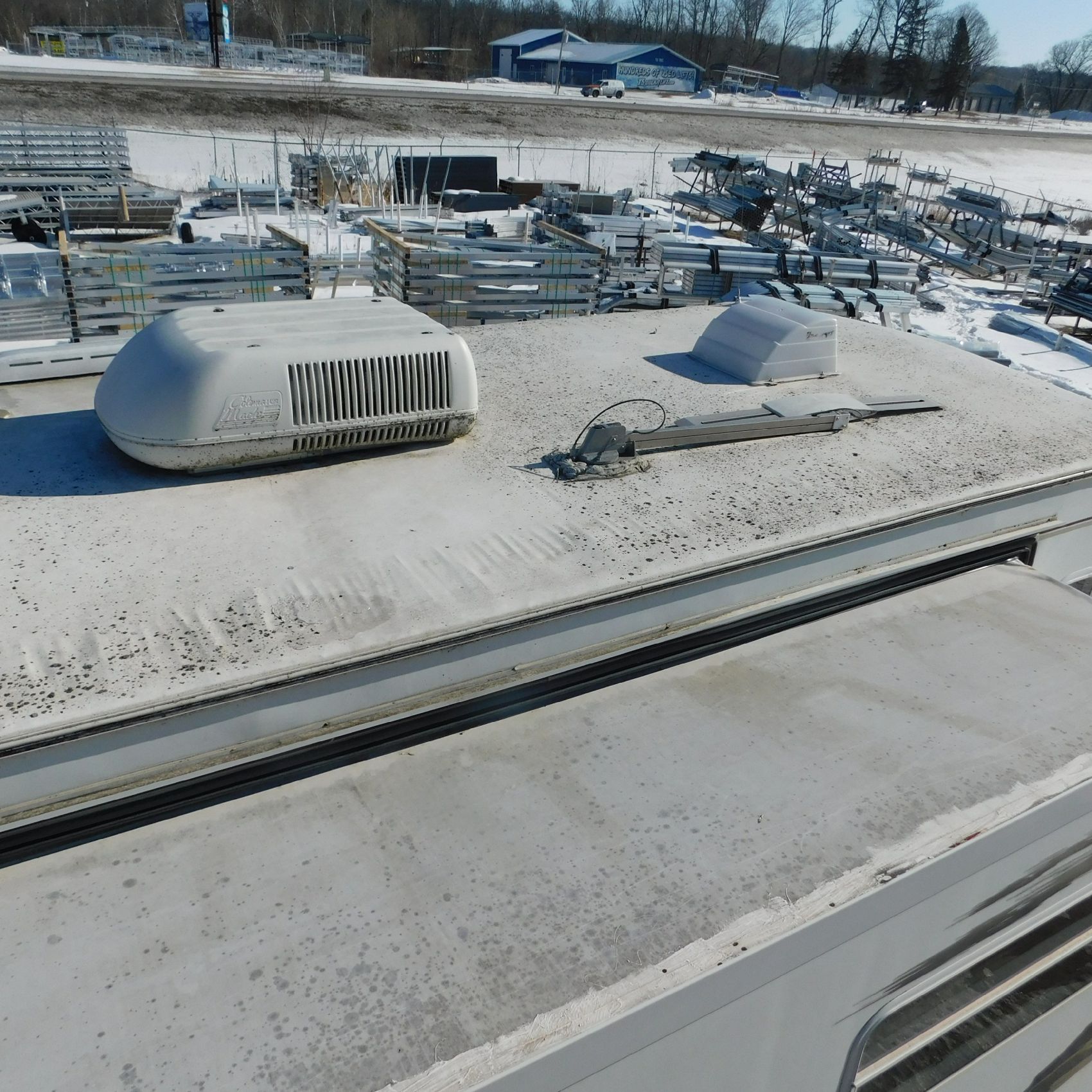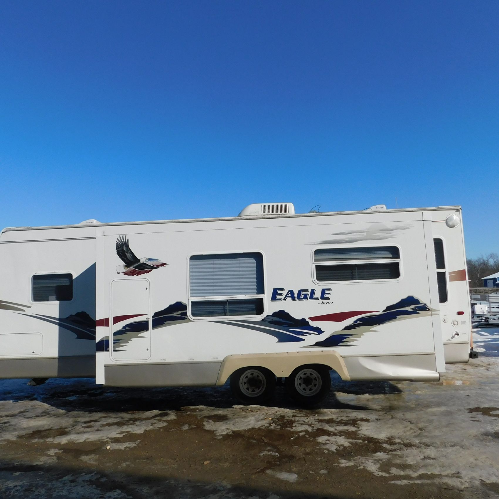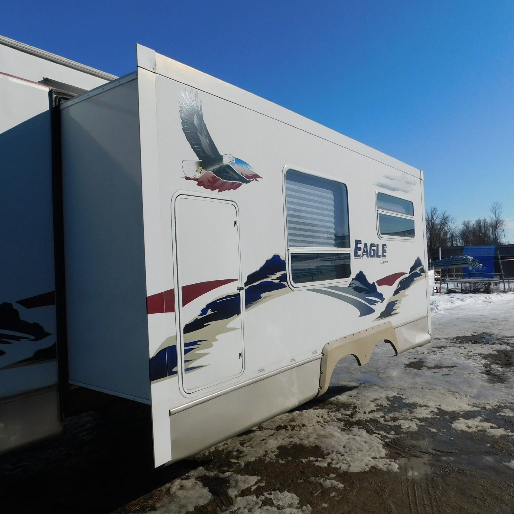 Coming to us is Stock #1831, a 2006 Jayco 278FBS Eagle travel trailer with a bumper‑style hitch. Based on the model number, it measures 28 feet in length, and the slide‑outs worked properly when tested. This camper was brought in due to roof damage—there is a hole in the roof, and water appears to have entered and spread through the roofing structure, causing soft spots and visible ripples in certain areas. However, the interior does not show noticeable signs of water damage.