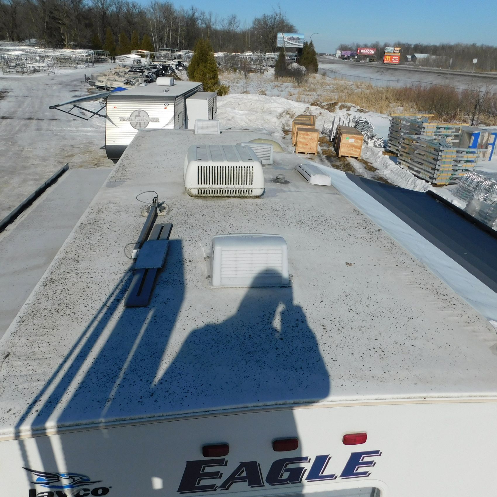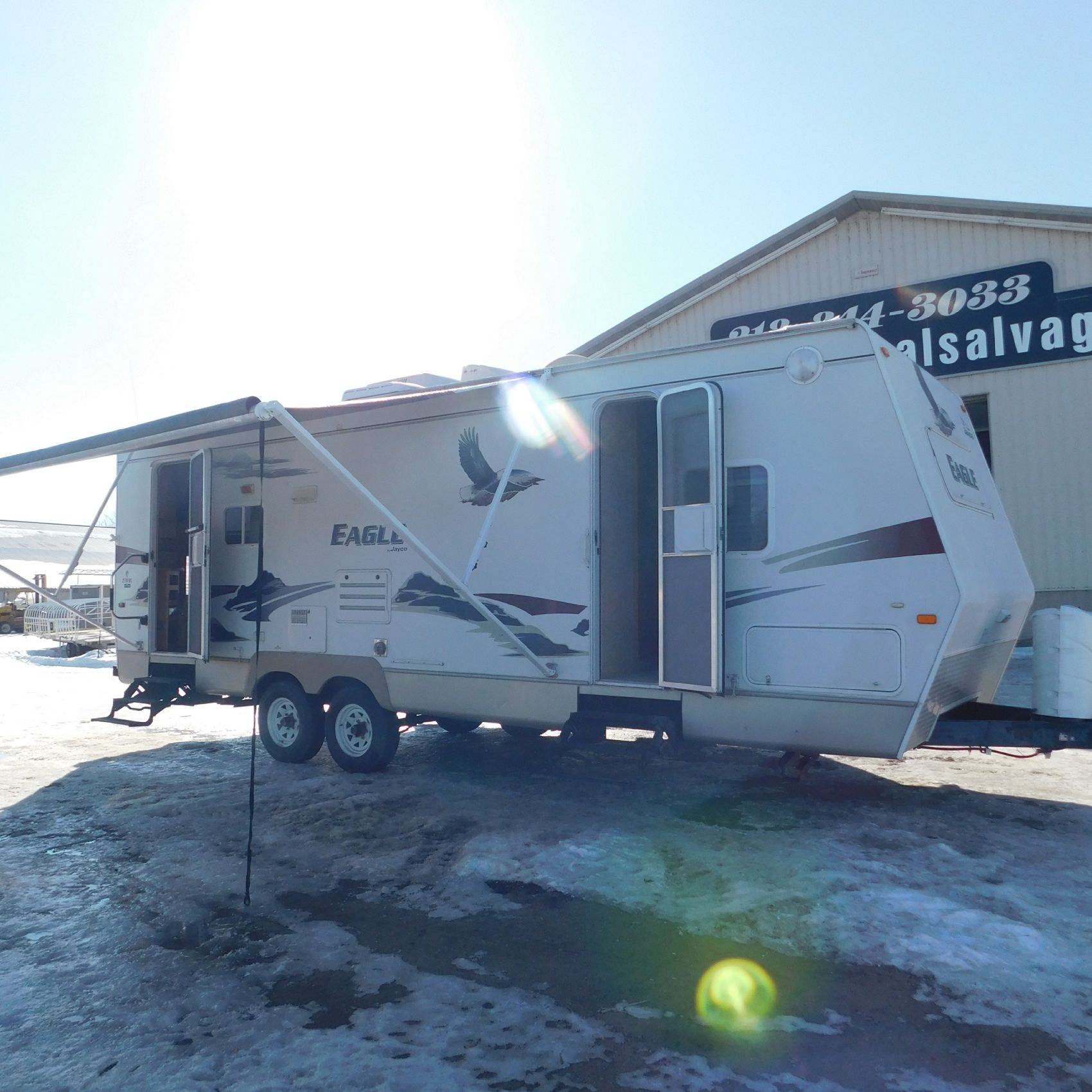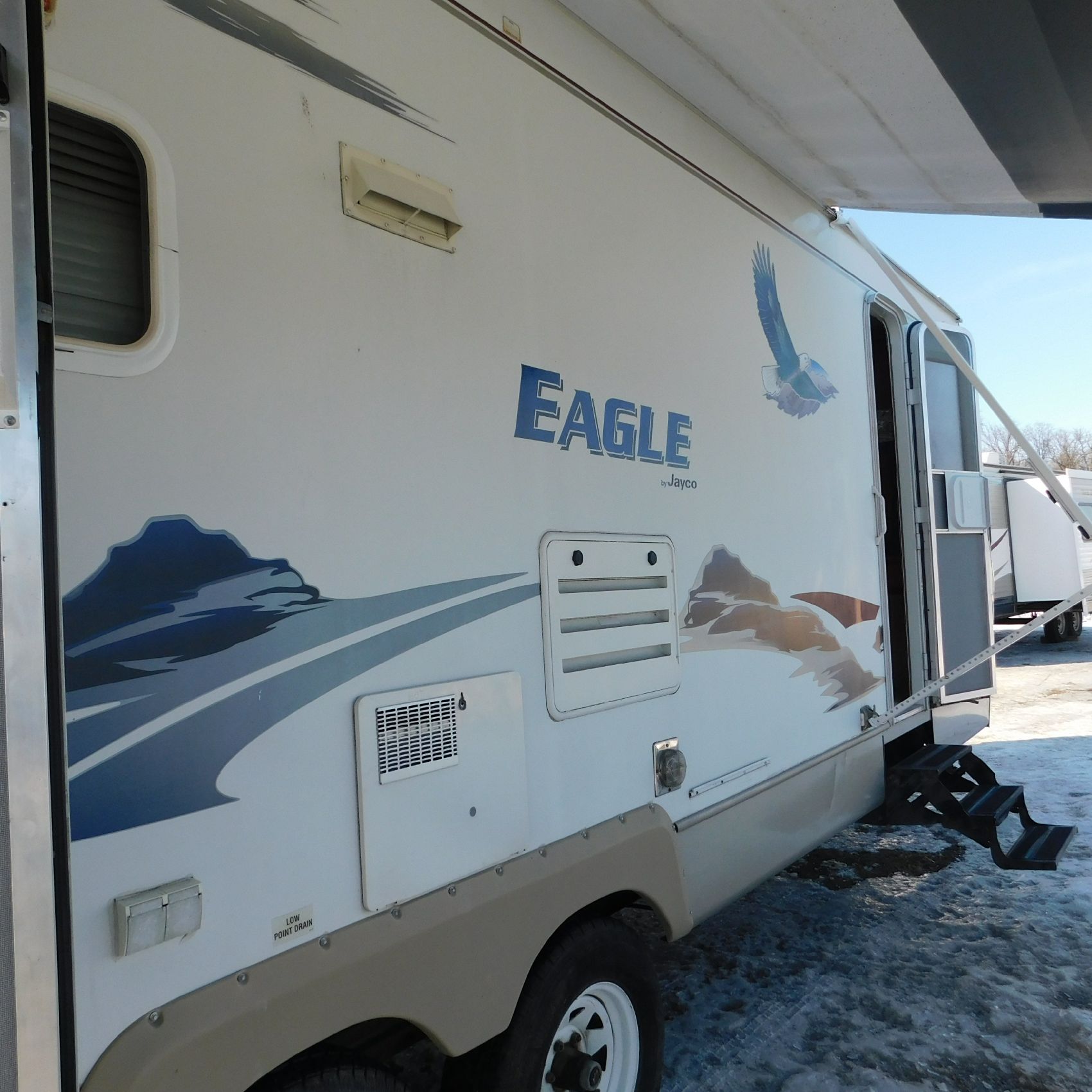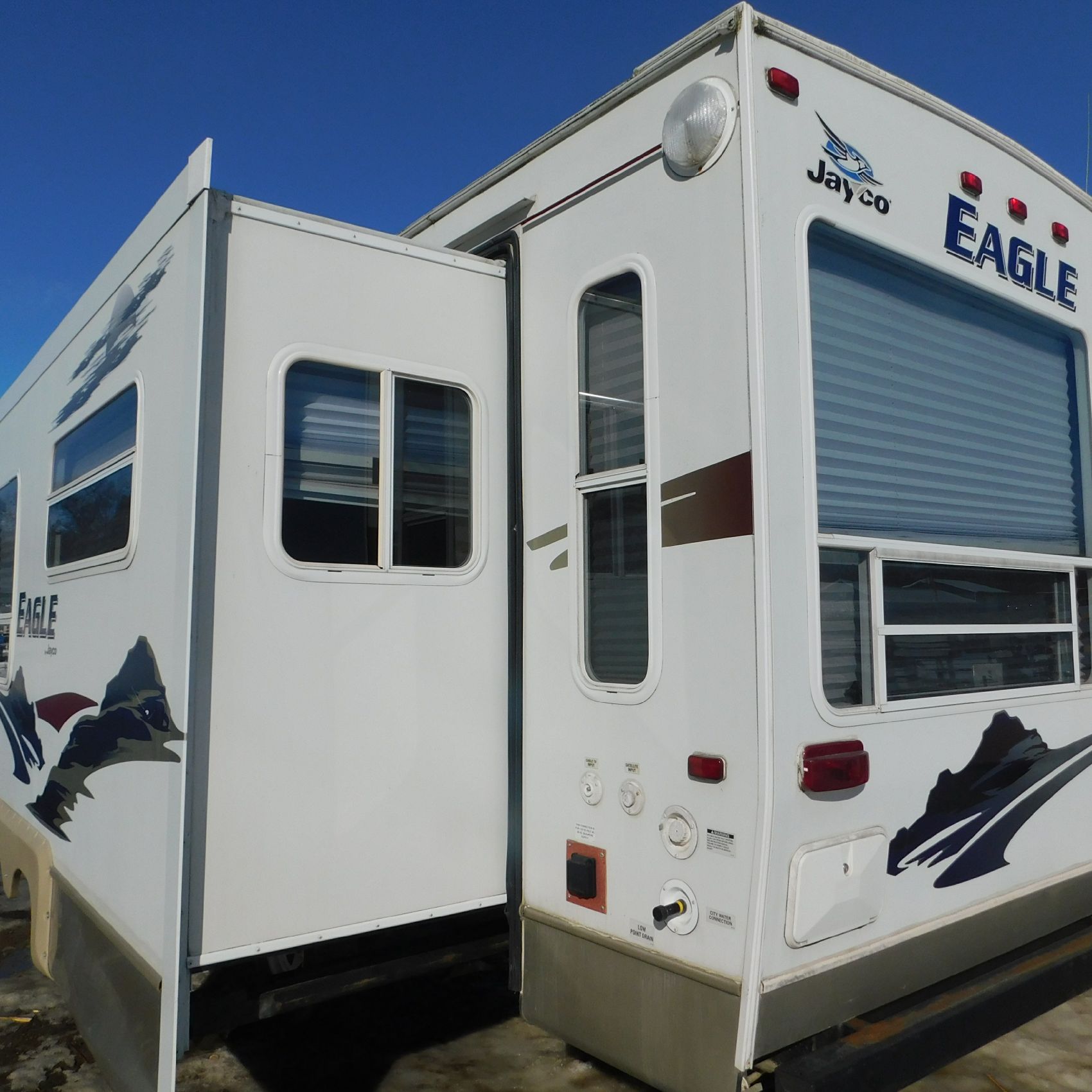 Coming to us is Stock #1831, a 2006 Jayco 278FBS Eagle travel trailer with a bumper‑style hitch. Based on the model number, it measures 28 feet in length, and the slide‑outs worked properly when tested. This camper was brought in due to roof damage—there is a hole in the roof, and water appears to have entered and spread through the roofing structure, causing soft spots and visible ripples in certain areas. However, the interior does not show noticeable signs of water damage.