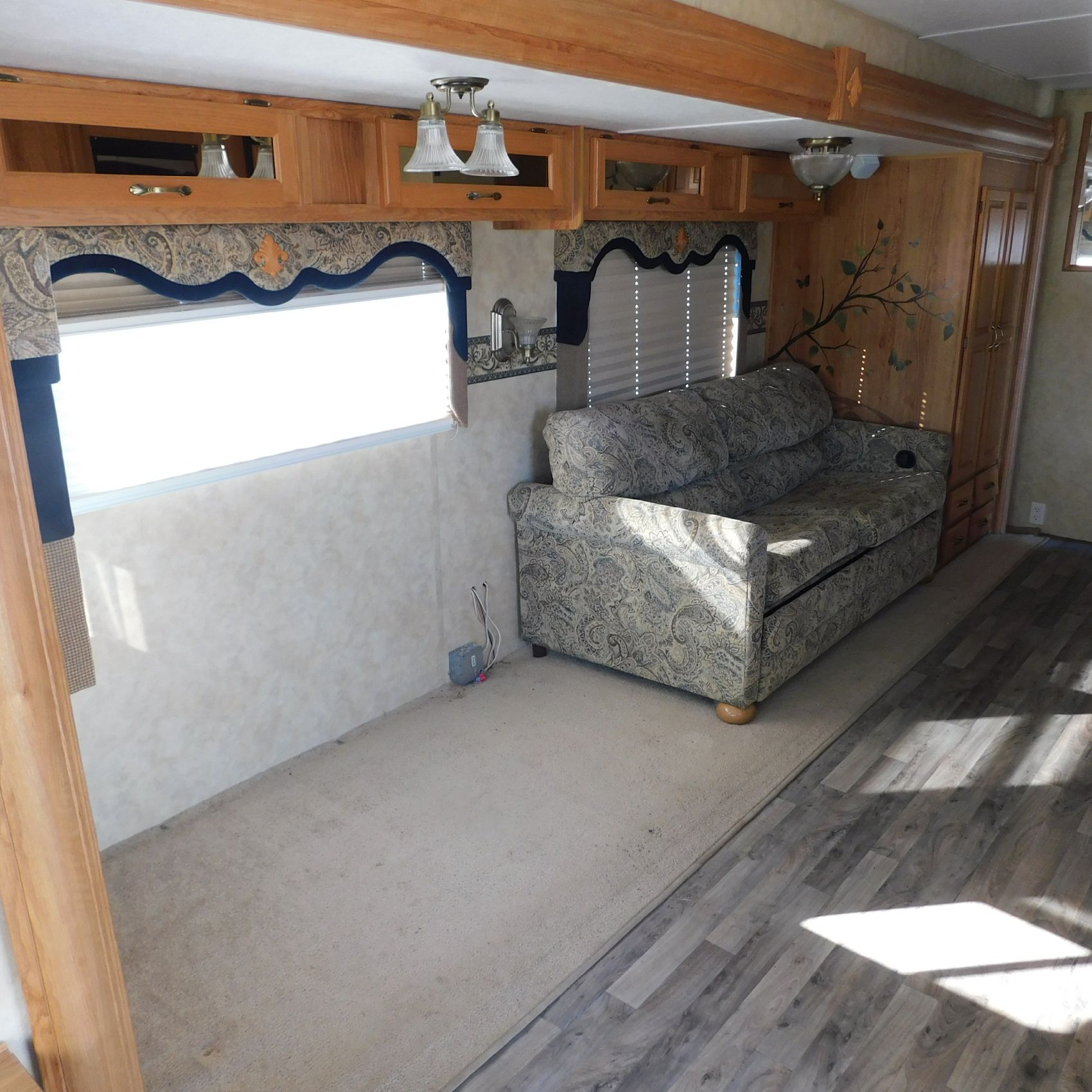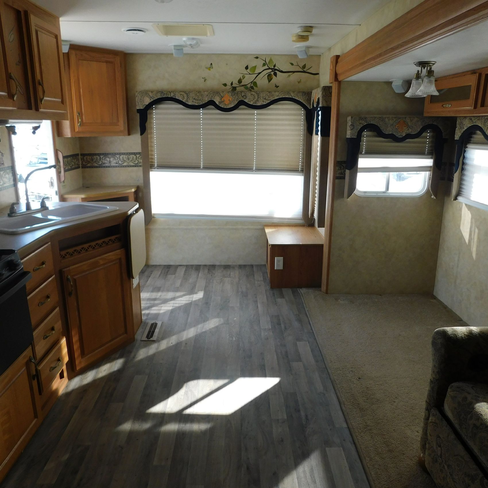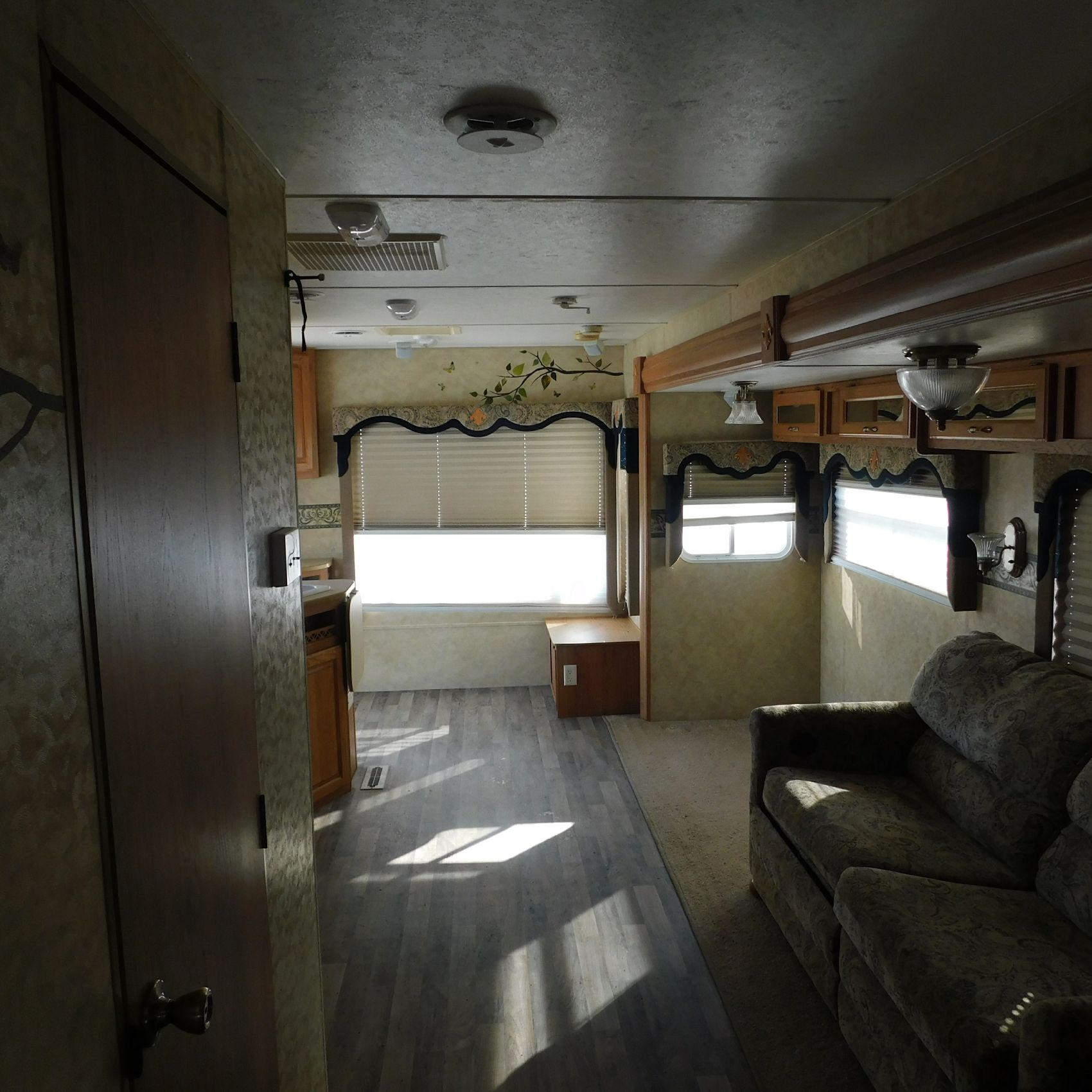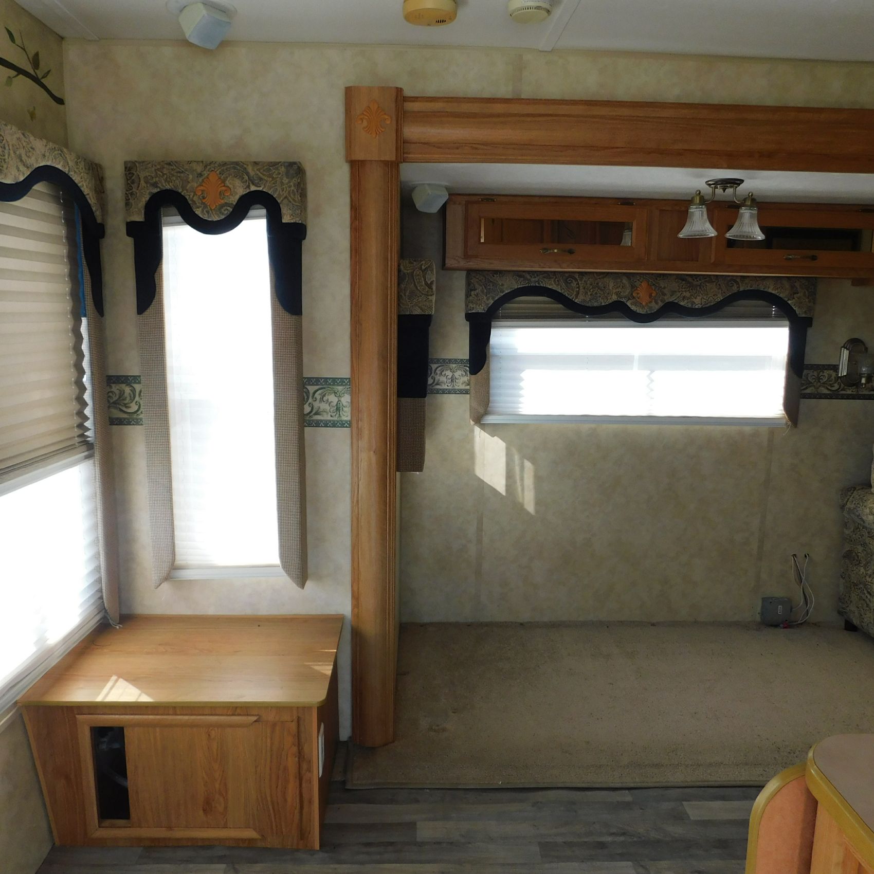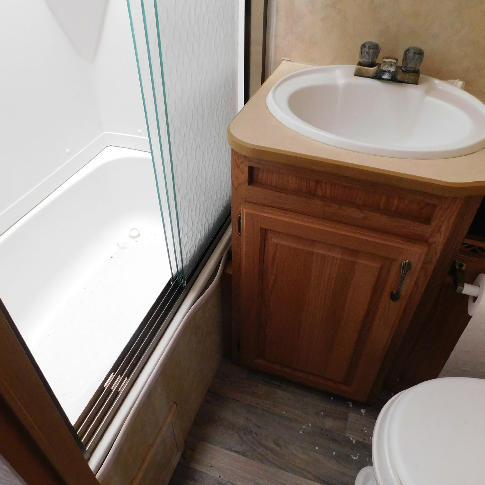 Inside, the trim is coming loose on the bathroom sink counter as well as on the exterior of the shower. The bathroom floor vent is broken but still in place. In the main living area, the table is missing—you can see the mounting holes in the floor where it used to be. The remainder of the interior presents well.