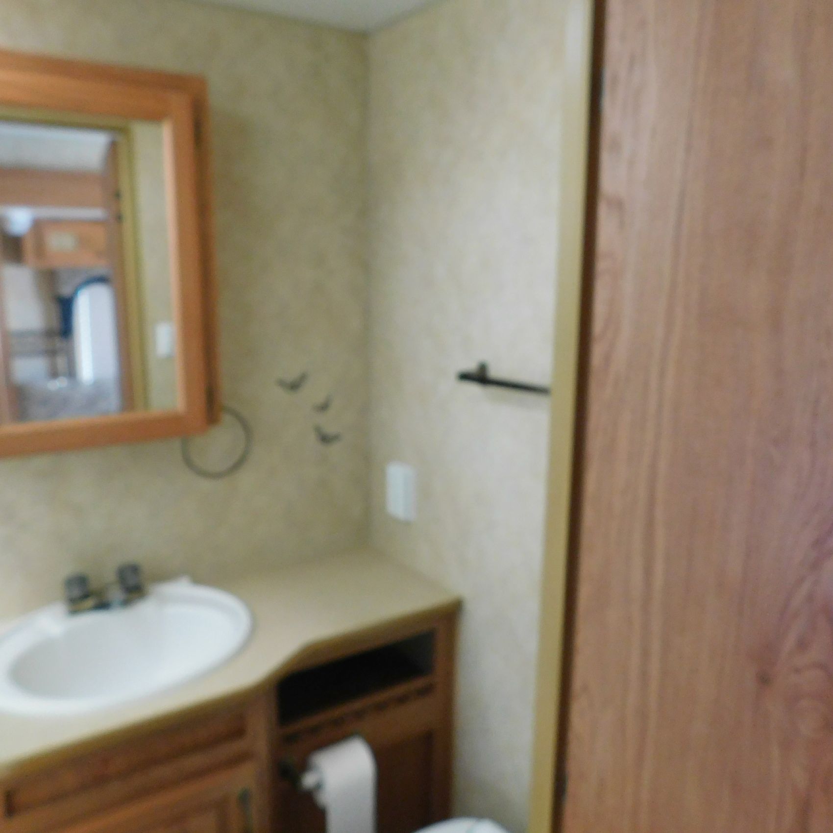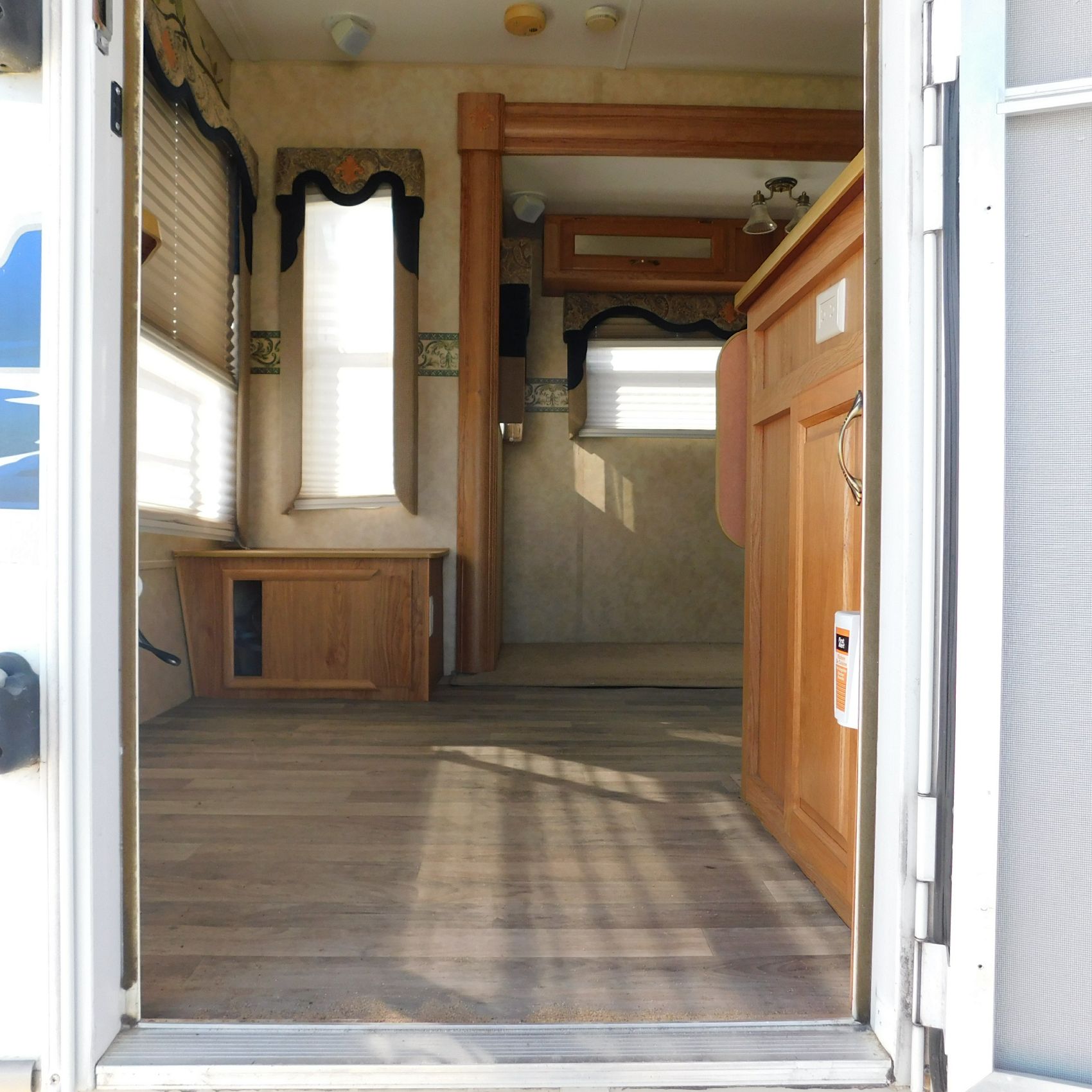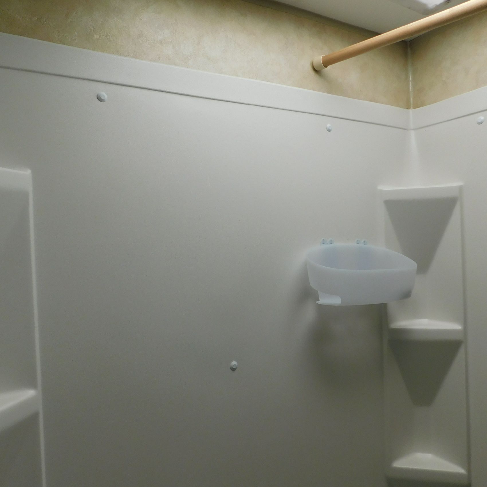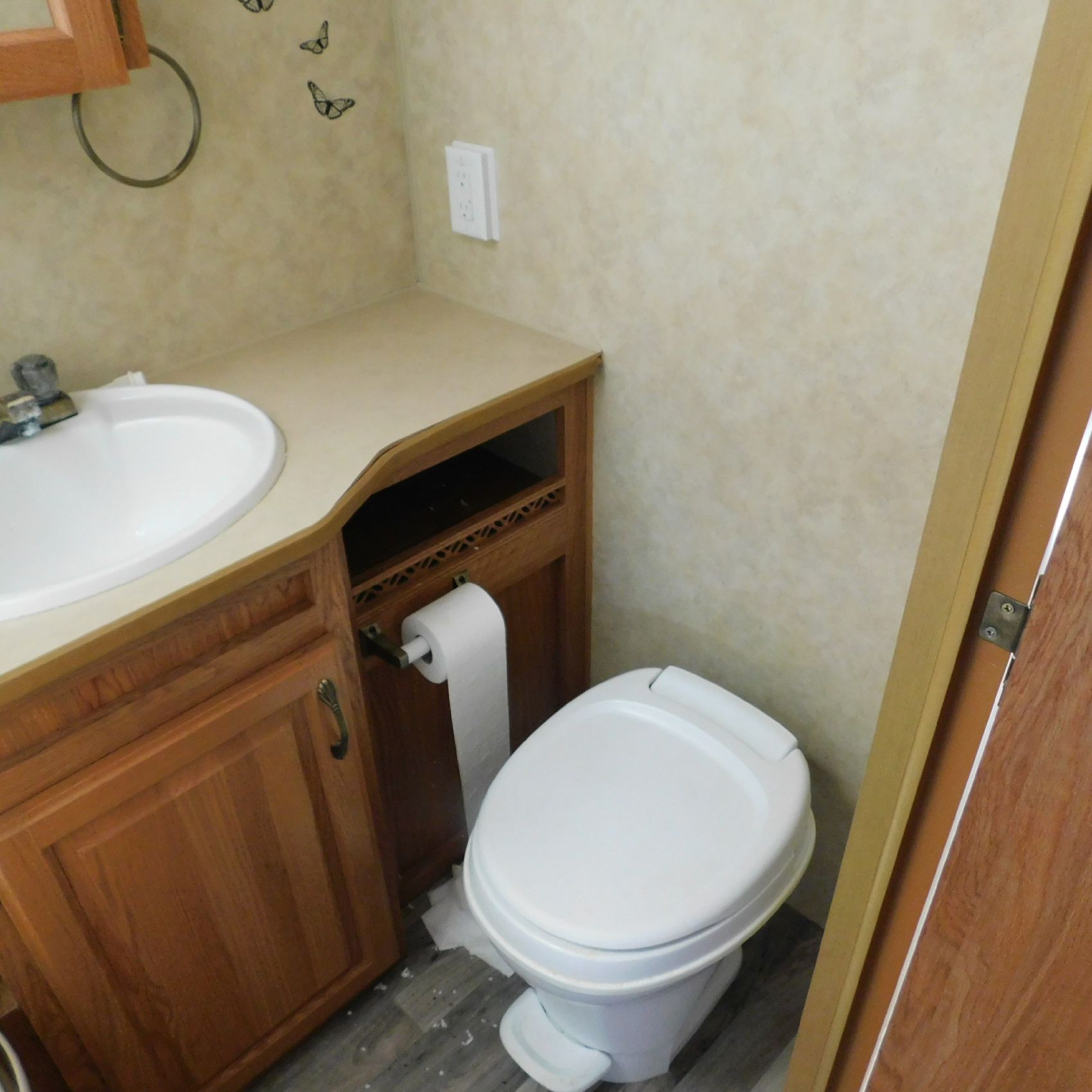Inside, the trim is coming loose on the bathroom sink counter as well as on the exterior of the shower. The bathroom floor vent is broken but still in place. In the main living area, the table is missing—you can see the mounting holes in the floor where it used to be. The remainder of the interior presents well.