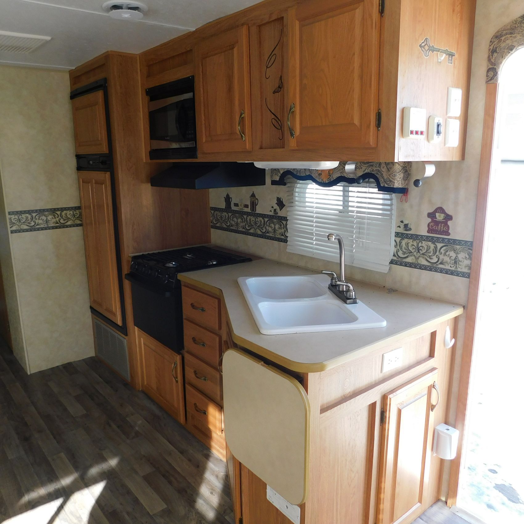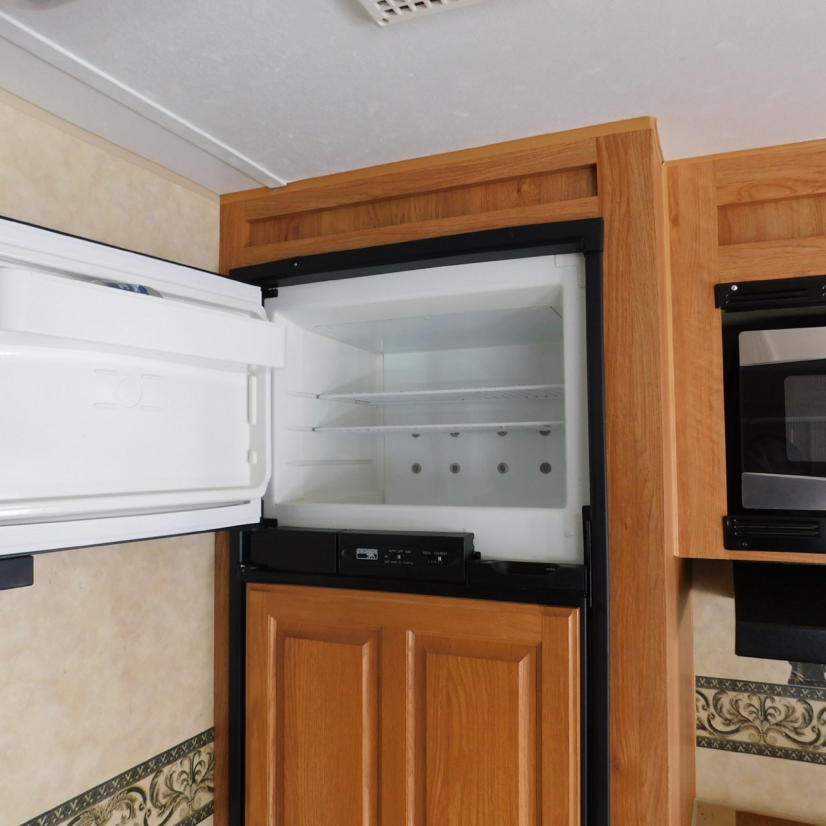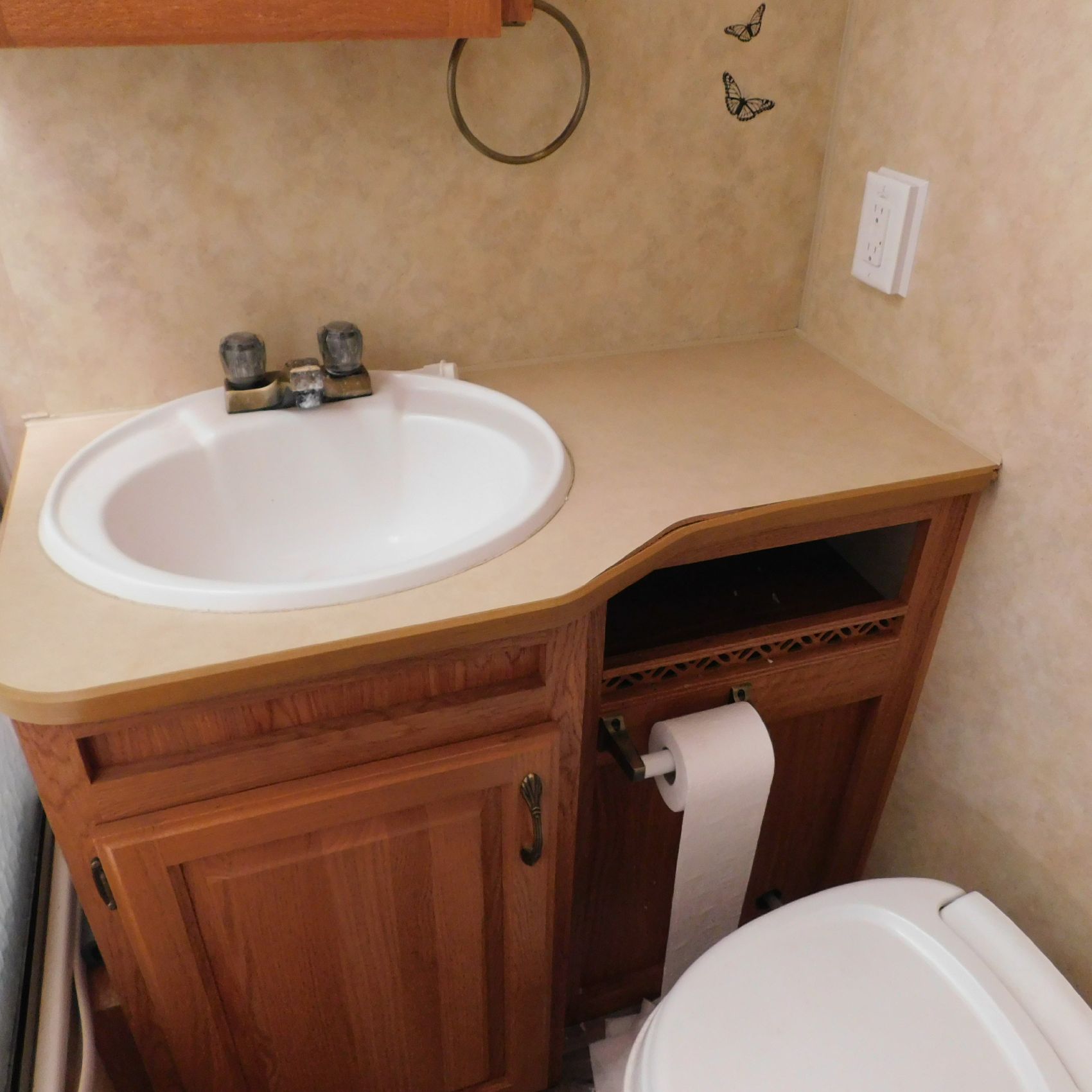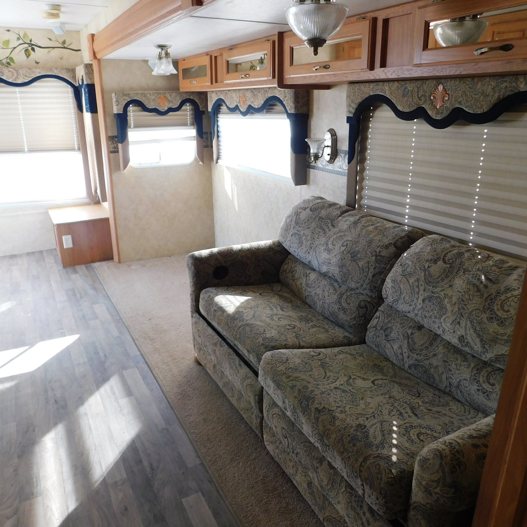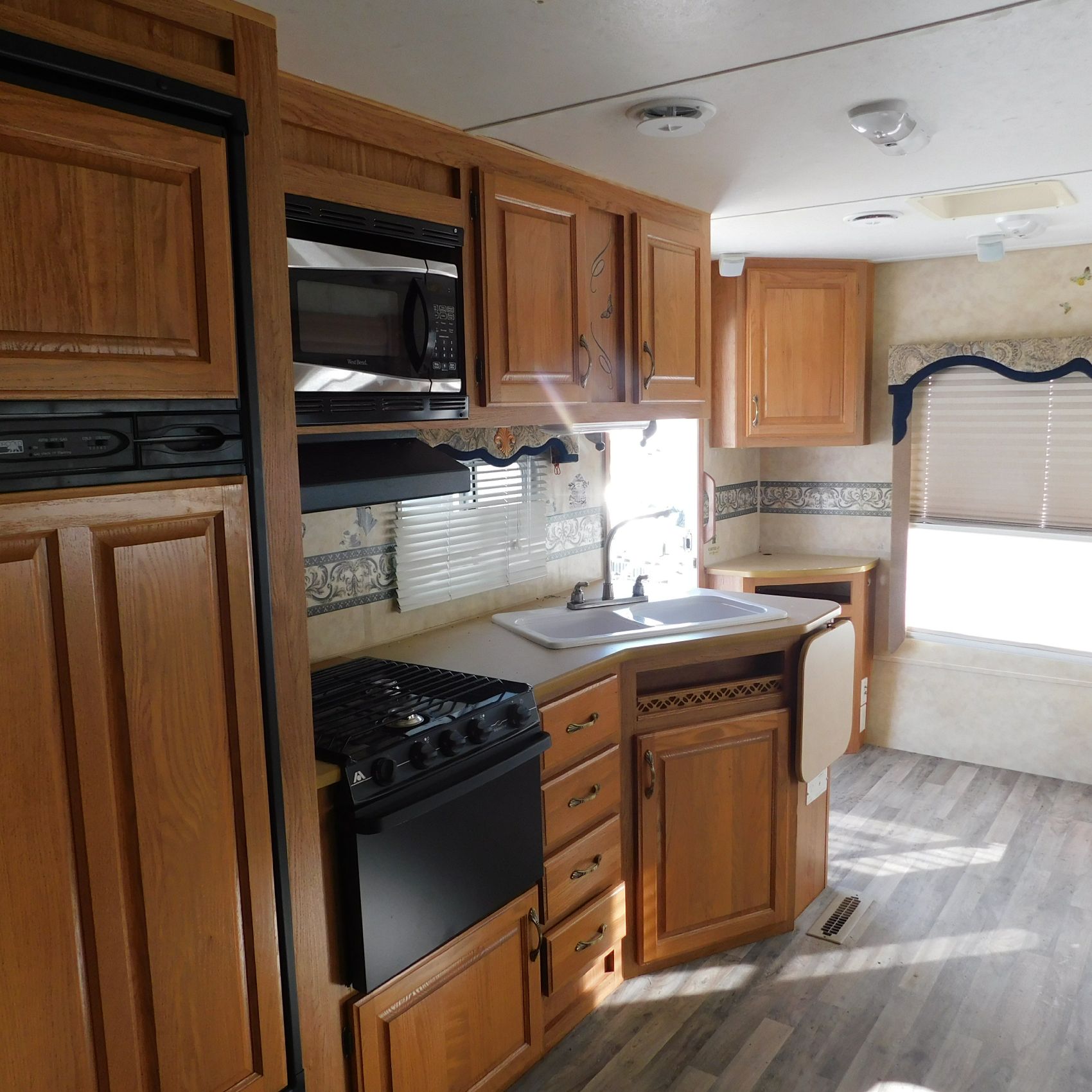 Inside, the trim is coming loose on the bathroom sink counter as well as on the exterior of the shower. The bathroom floor vent is broken but still in place. In the main living area, the table is missing—you can see the mounting holes in the floor where it used to be. The remainder of the interior presents well.