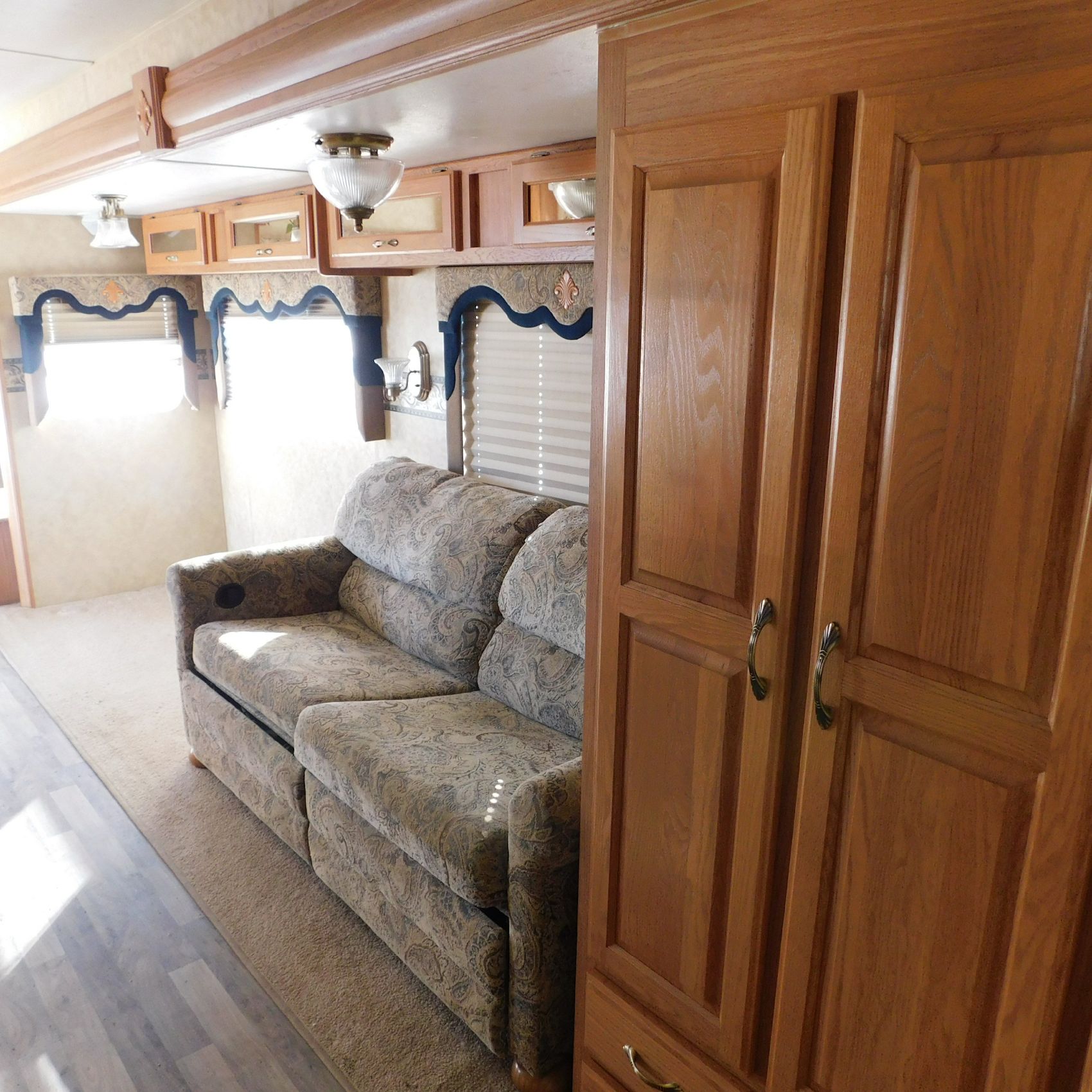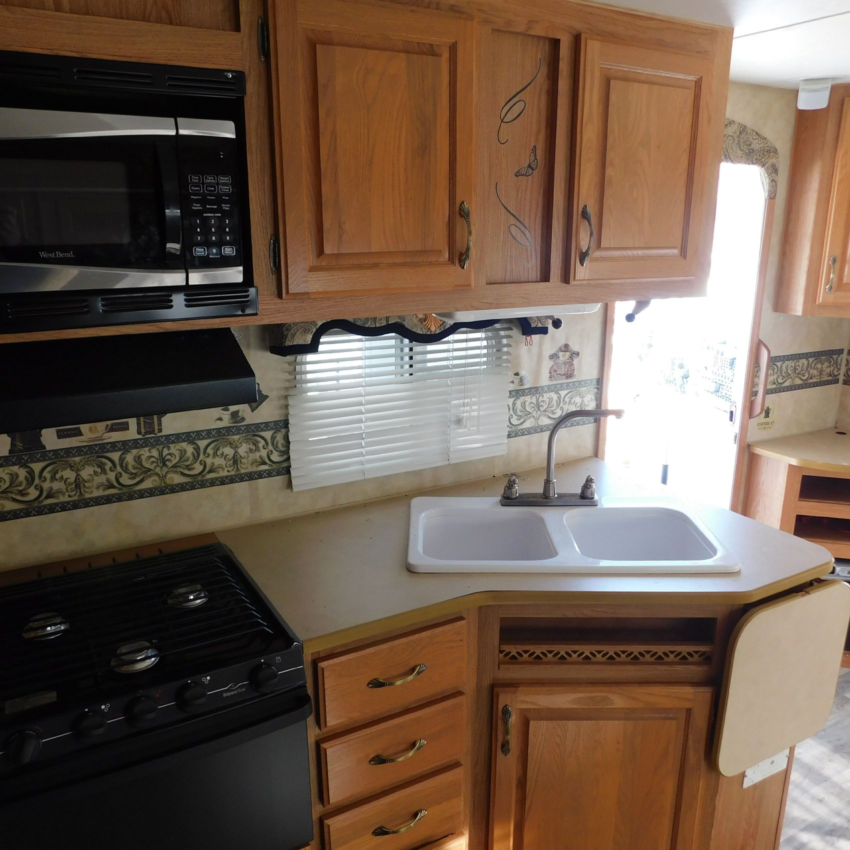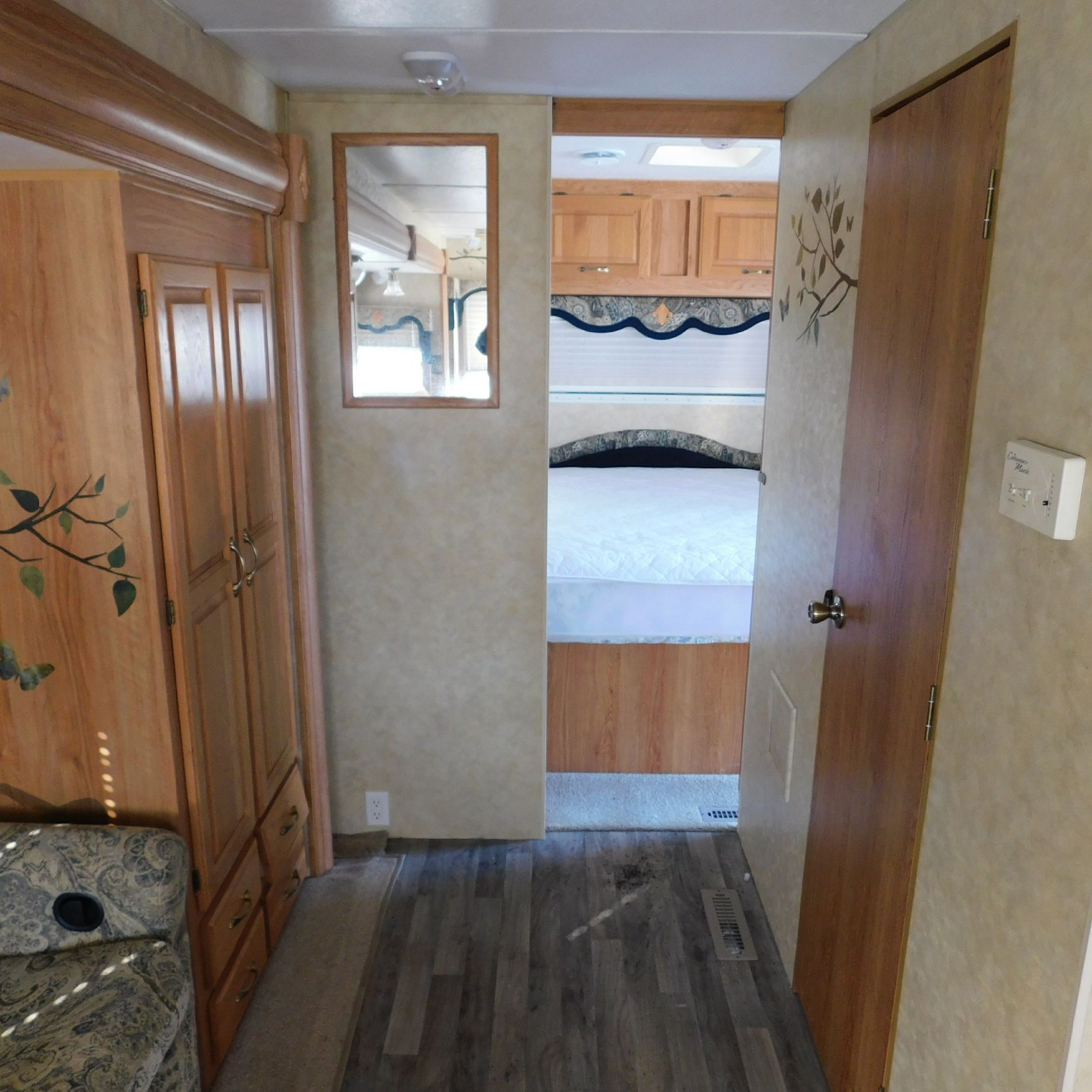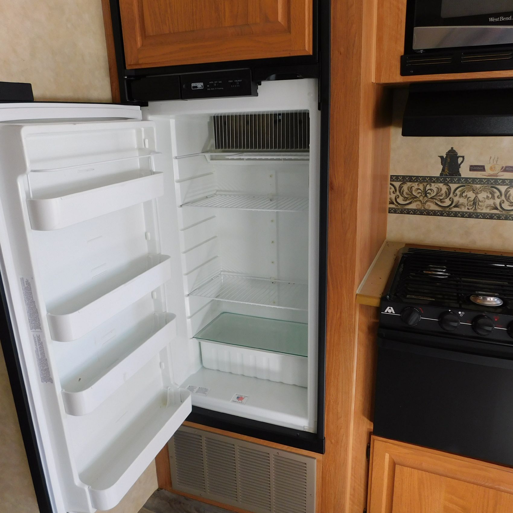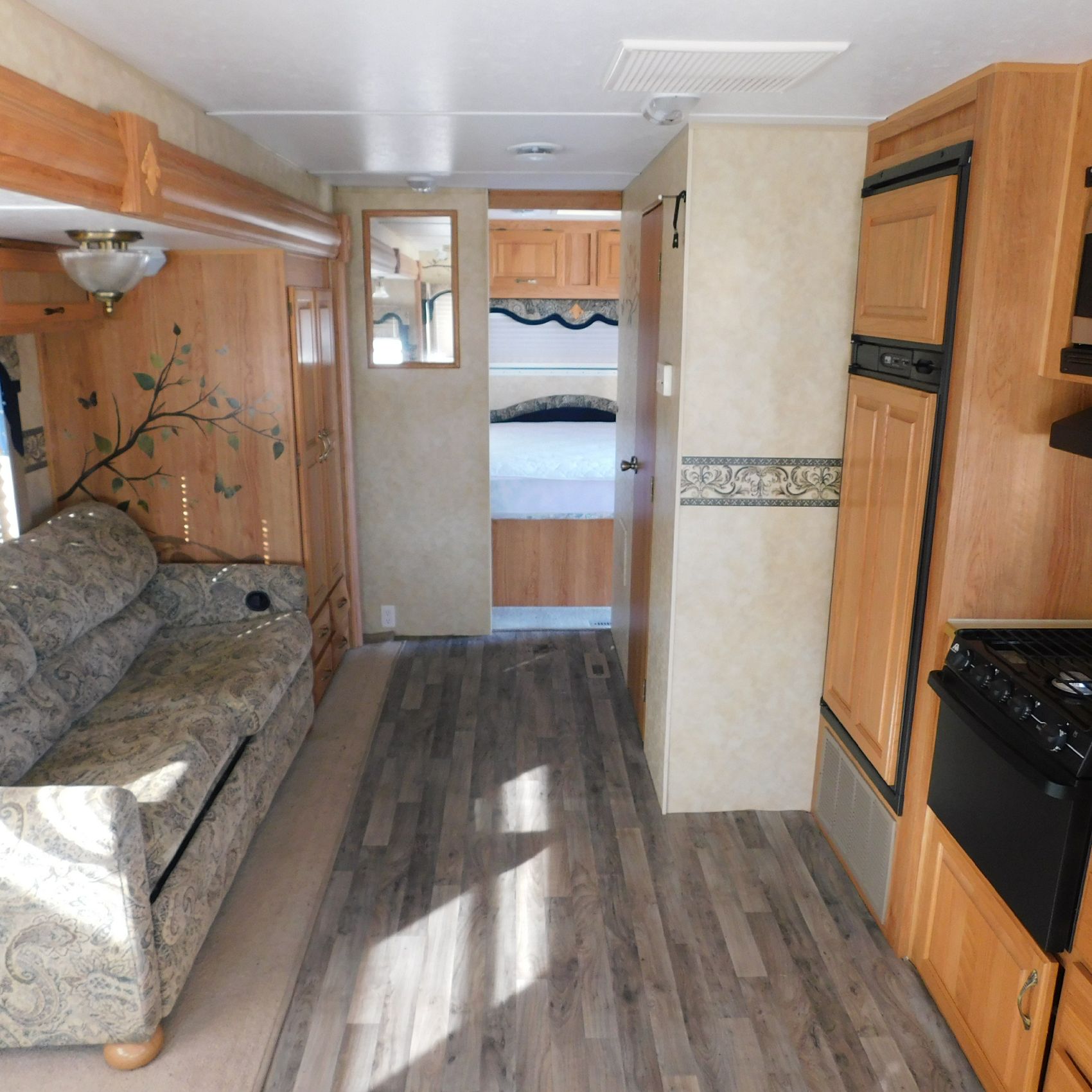 Inside, the trim is coming loose on the bathroom sink counter as well as on the exterior of the shower. The bathroom floor vent is broken but still in place. In the main living area, the table is missing—you can see the mounting holes in the floor where it used to be. The remainder of the interior presents well.