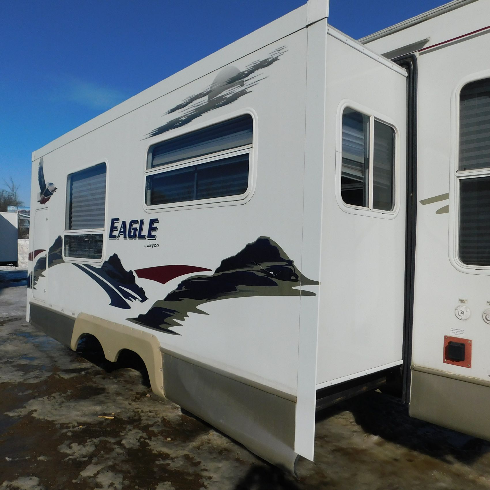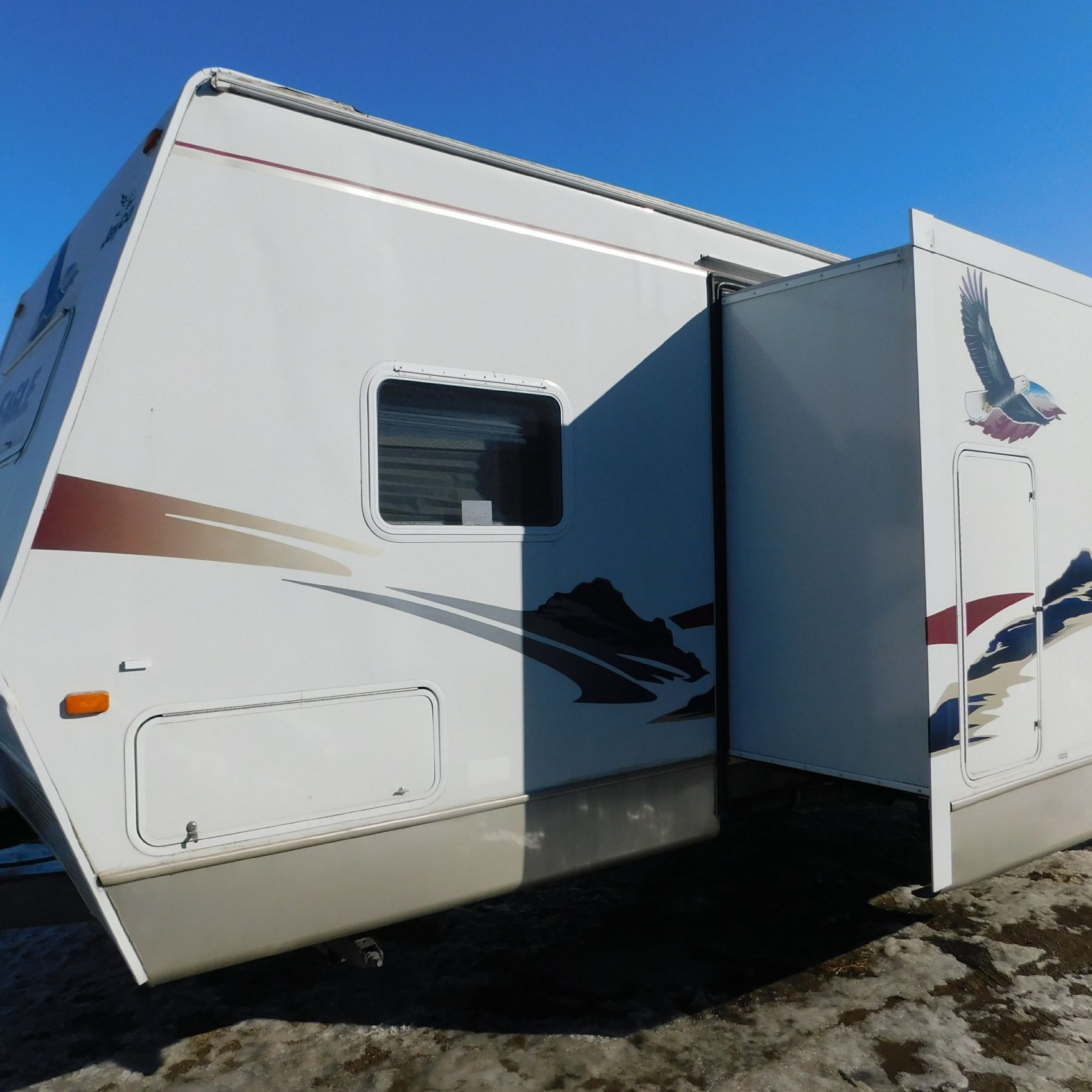 Along the driver’s side, the lower paneling strip beneath the slide-out has damage, including several larger dents, and there are additional dents, scratches, and scuffs on both sides of the slide-out.