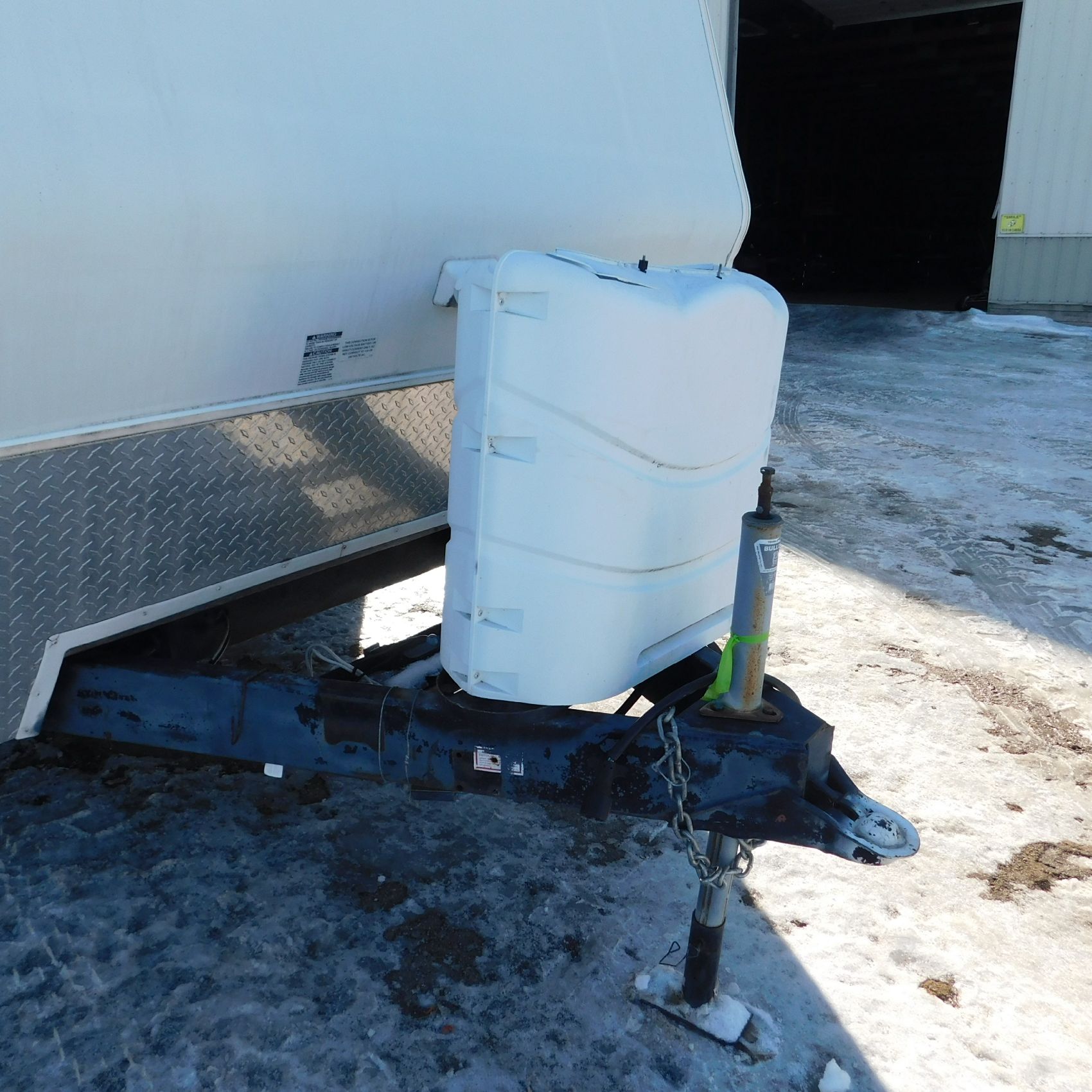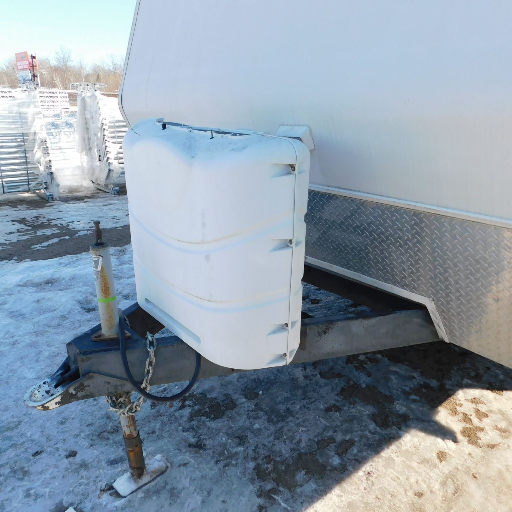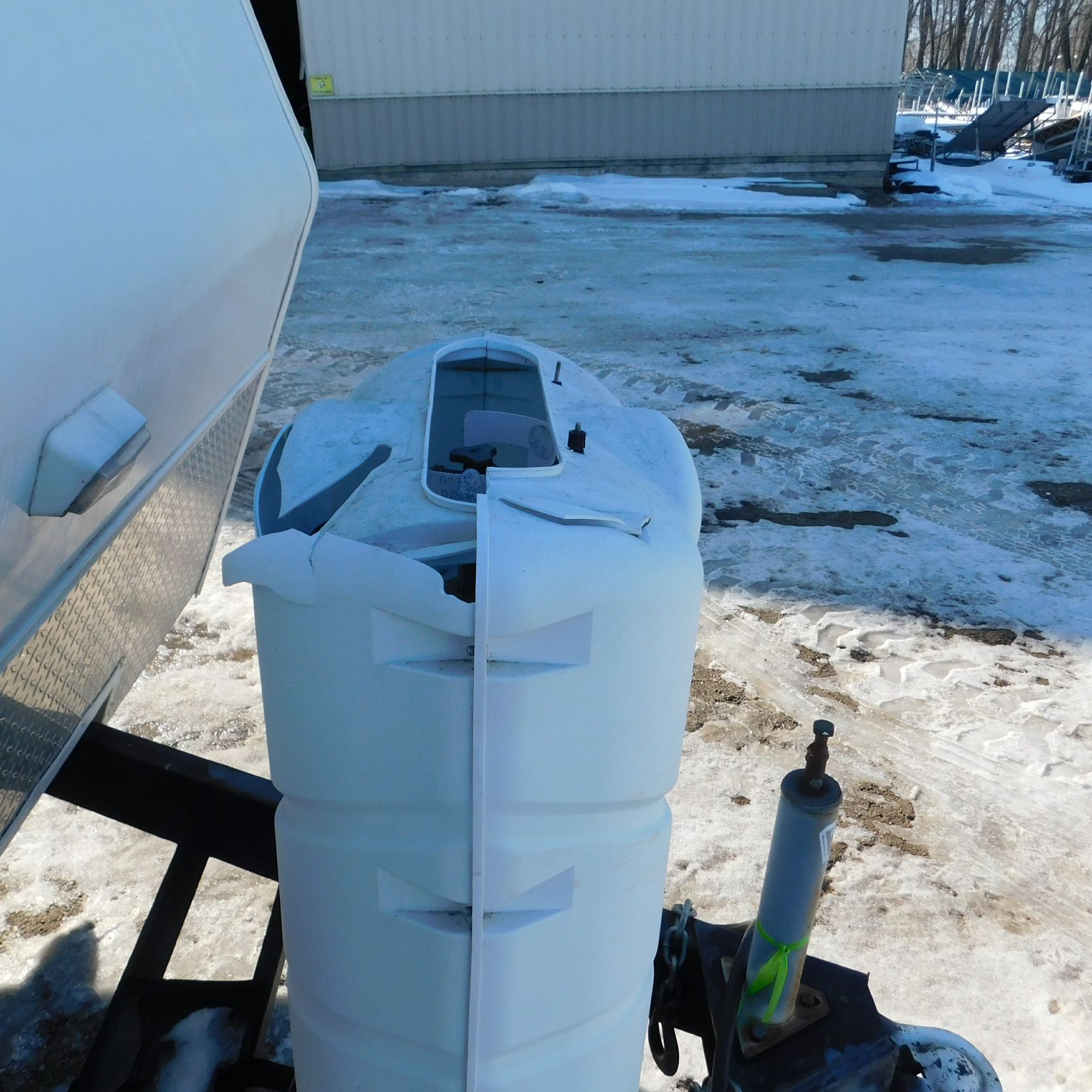 At the front of the camper, the propane tank cover is cracked and broken on the top, though the front wall of the camper itself appears to be in good shape.