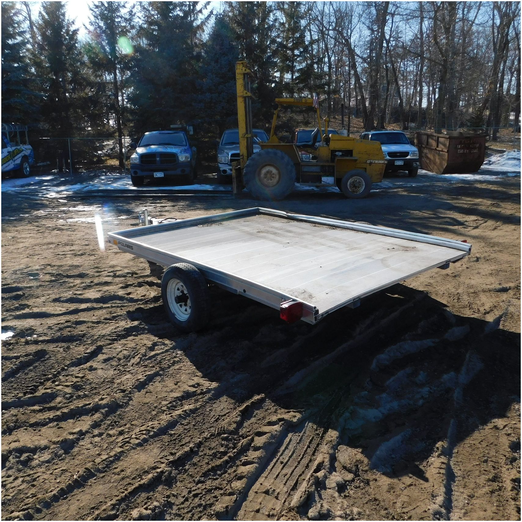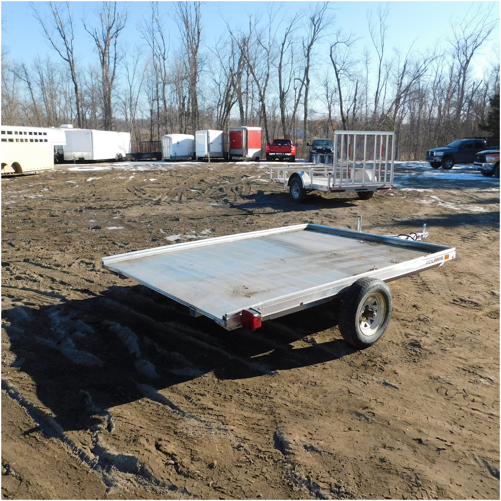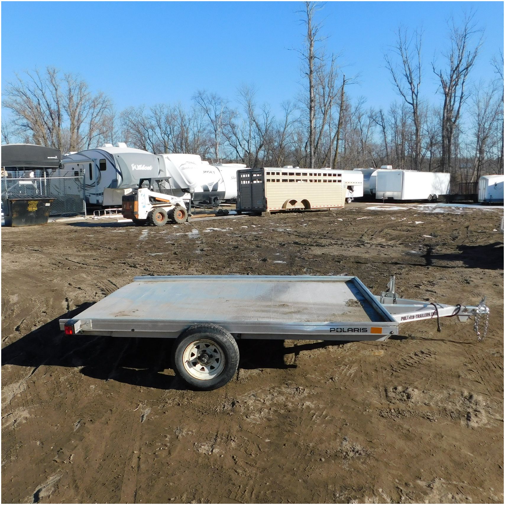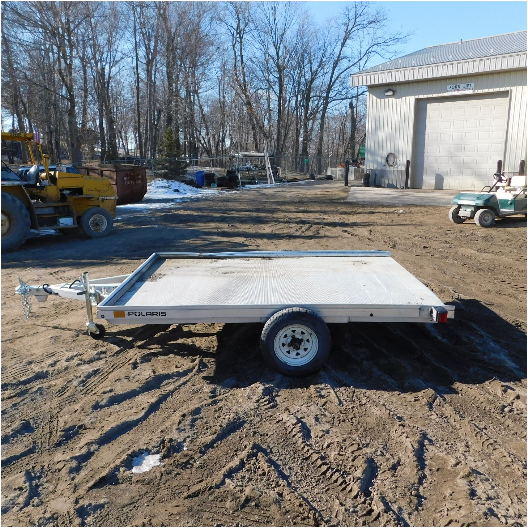 Up for auction is a 2022 Polaris Trailer. This utility trailer comes to us with some body damage. The trailer looks to have some fab work done or repairs. The title of the trailer states the size is 80×12’ but when we measure the trailer came out to 80×9’. The passenger side lip is bent up front and has a couple solid groove marks in the side. The rear driver side corner is bent down. The fenders are missing. The axle appears to be modified and welded. We are not sure how the trailer tows as we did not tow it and hauled it here. Good Luck Bidding on this Trailer!
