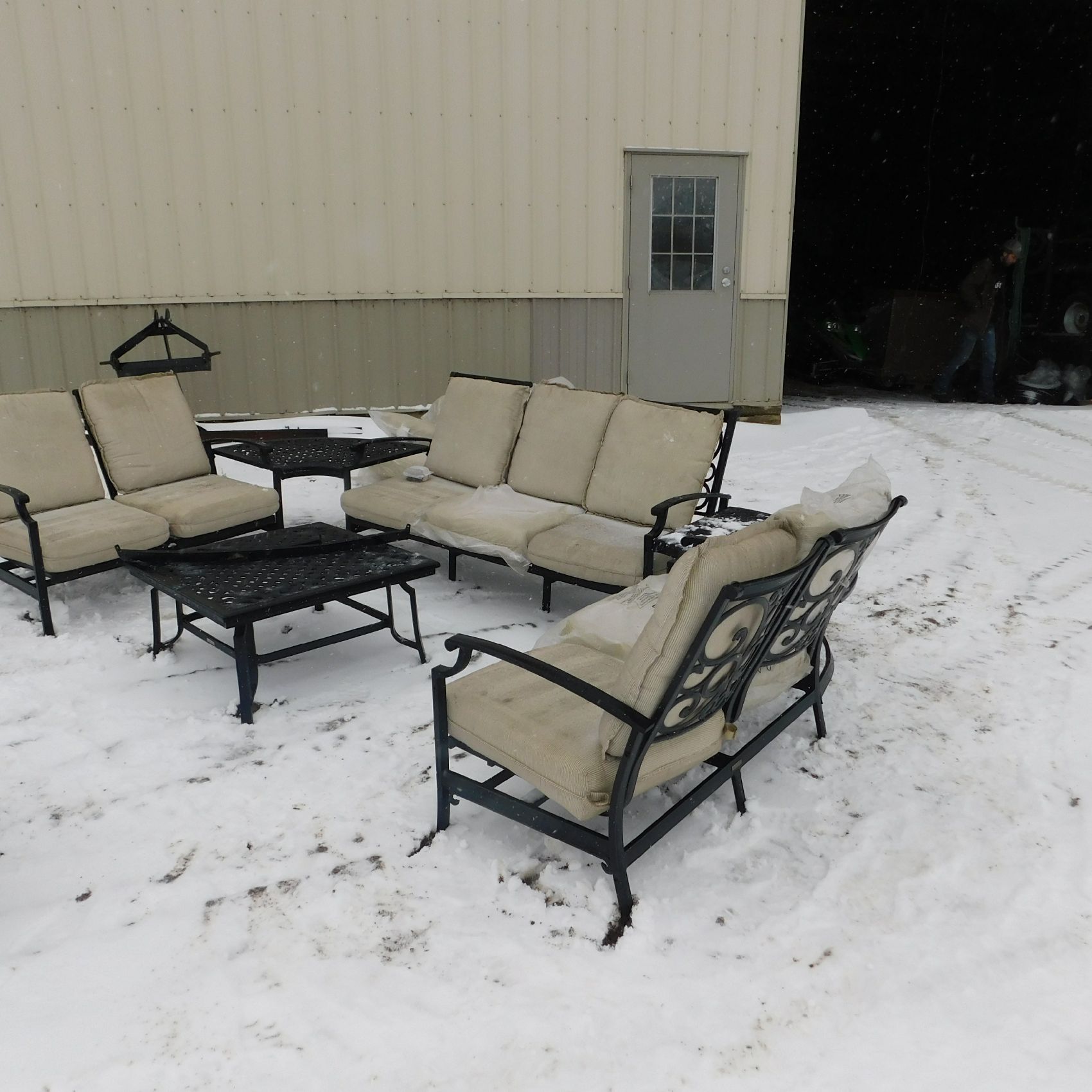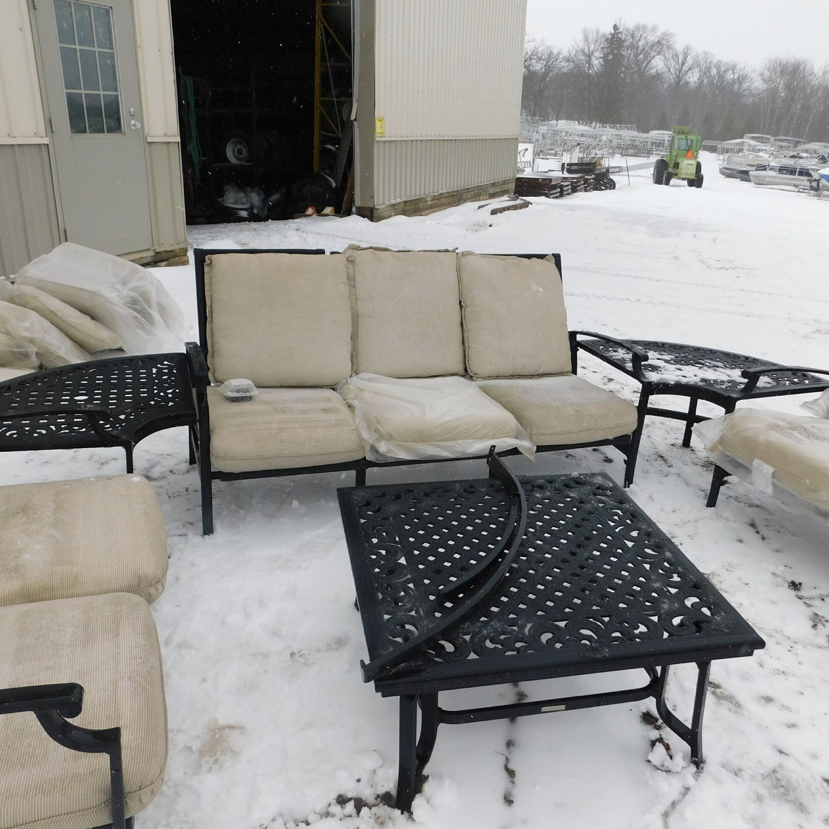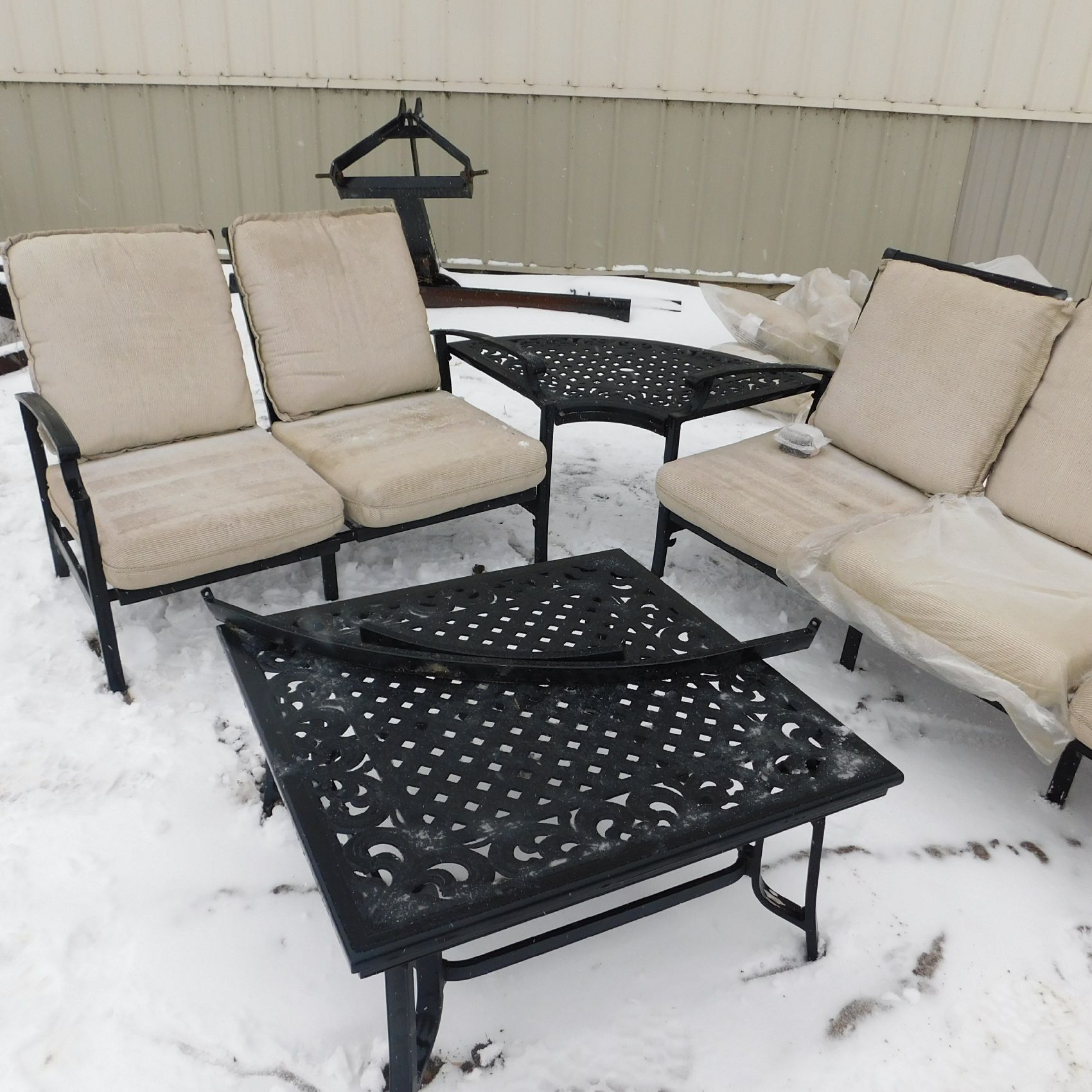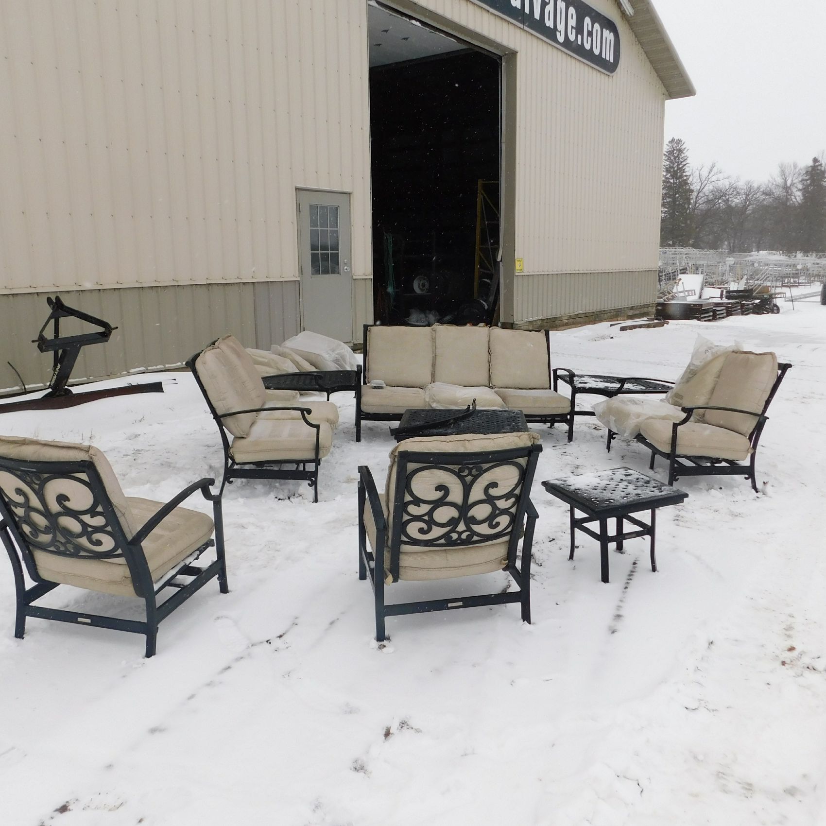 Coming to us as Stock #1903 is a Thomasville patio set that includes seating for nine with cushions: two single chairs, two dual chairs, one three‑seater chair, two corner end tables that attach to the furniture, one large round table, and one small square table. This set arrived with wind damage, and upon inspection there are weld cracks, bends in the furniture, and some dismantled pieces included. Aside from the noted issues and normal wear and tear, the set is in relatively decentshape overall and is being sold AS‑IS, ready for its next owner to enjoy. Good luck bidding on this item.