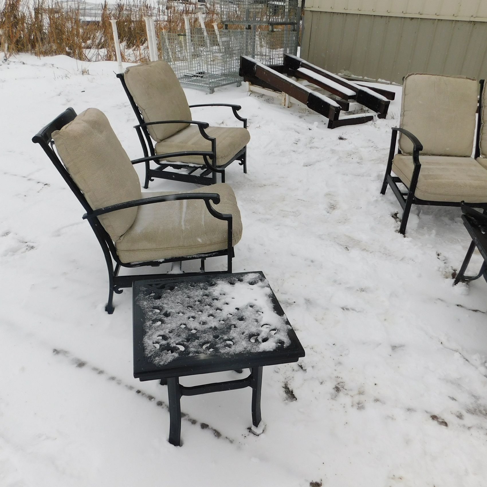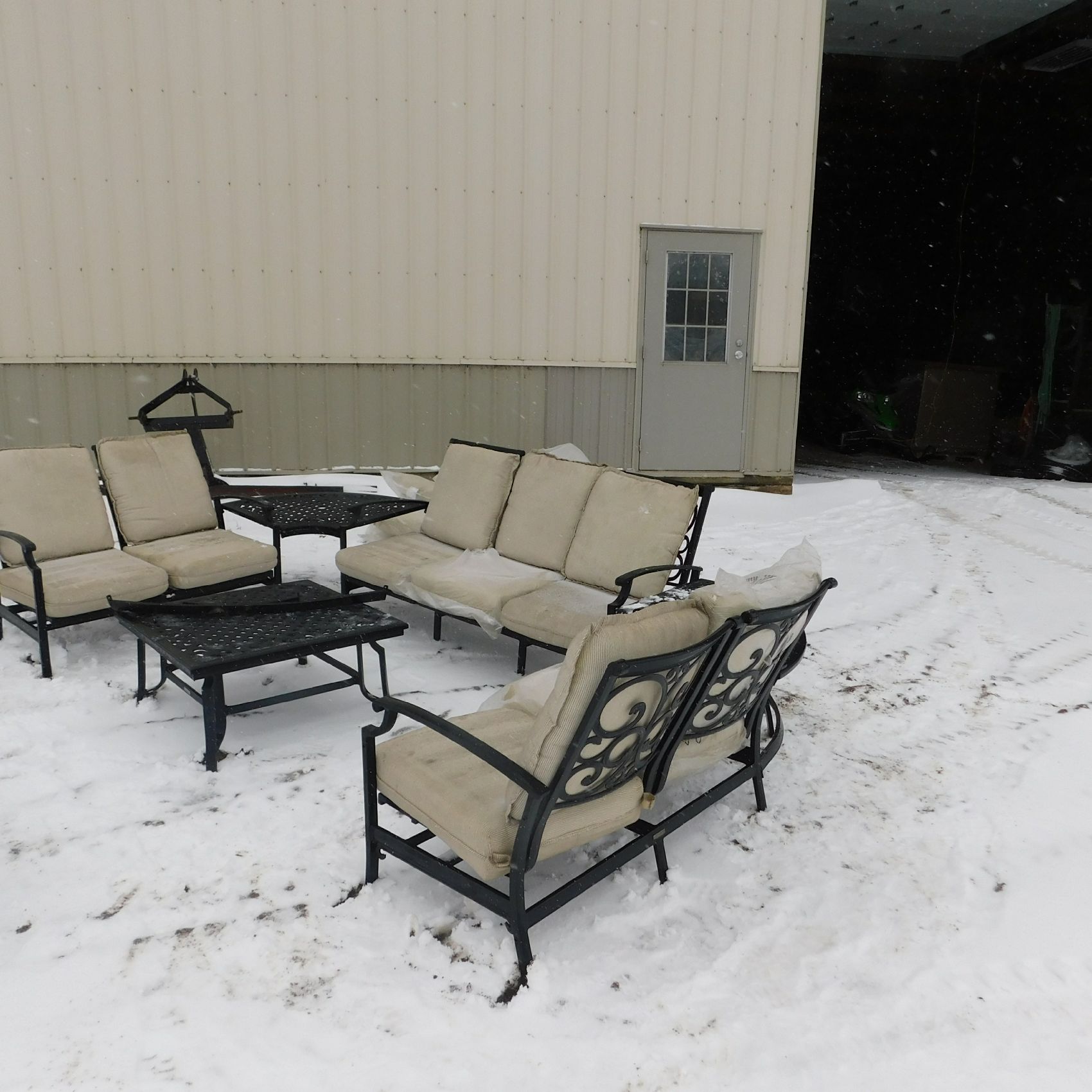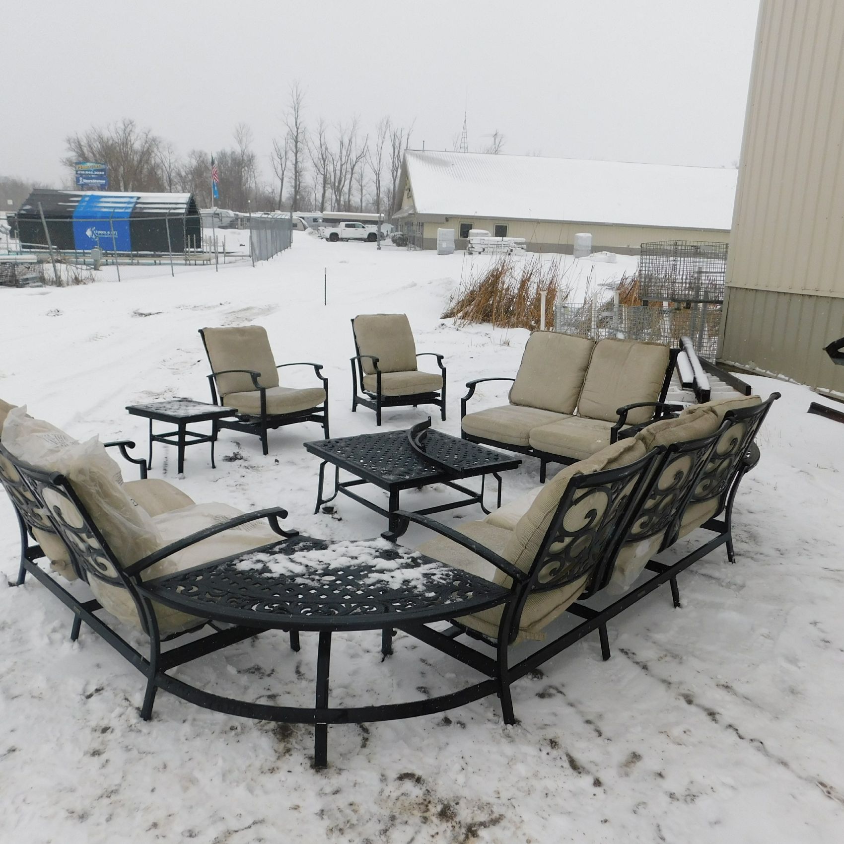 Coming to us as Stock #1903 is a Thomasville patio set that includes seating for nine with cushions: two single chairs, two dual chairs, one three‑seater chair, two corner end tables that attach to the furniture, one large round table, and one small square table. This set arrived with wind damage, and upon inspection there are weld cracks, bends in the furniture, and some dismantled pieces included. Aside from the noted issues and normal wear and tear, the set is in relatively decentshape overall and is being sold AS‑IS, ready for its next owner to enjoy. Good luck bidding on this item.