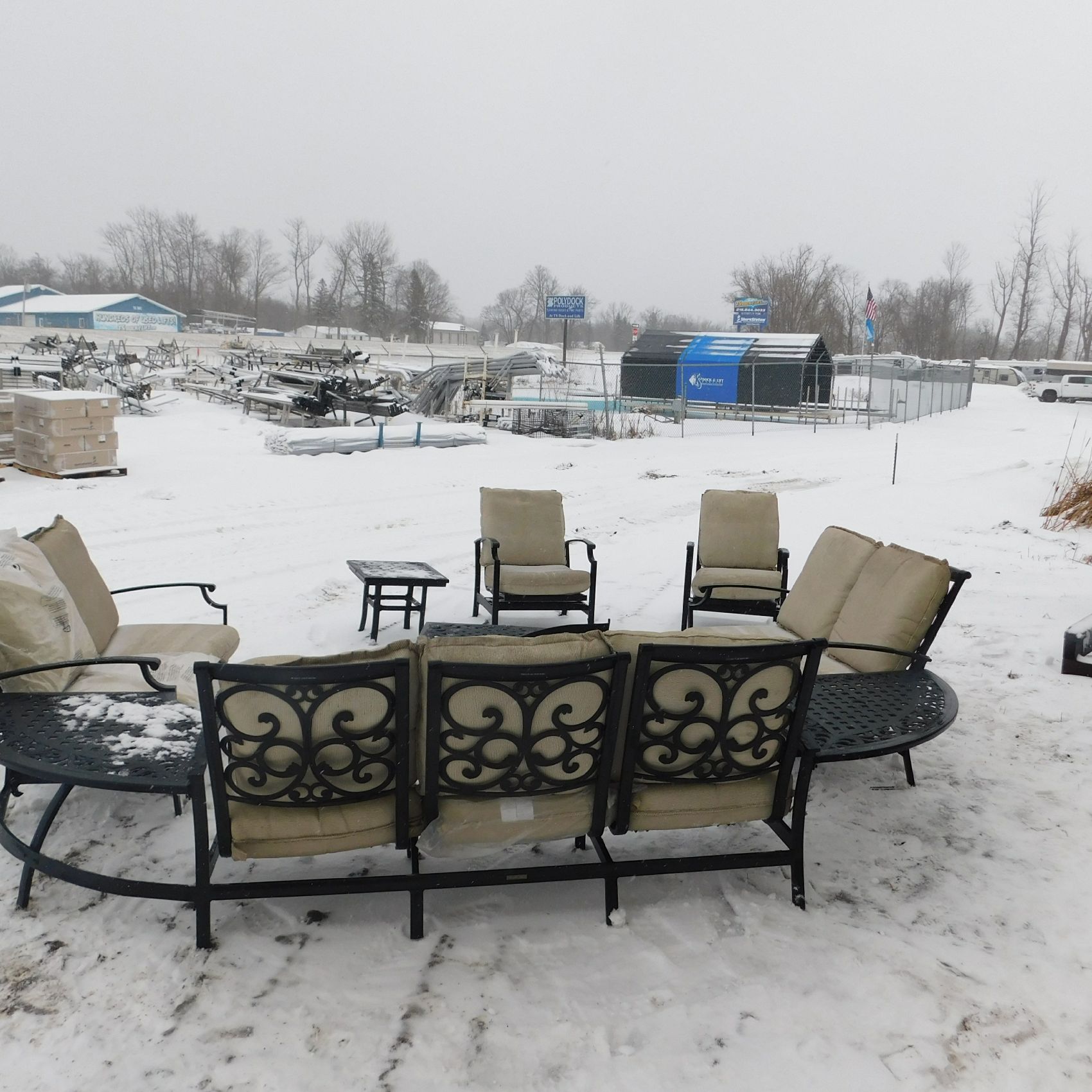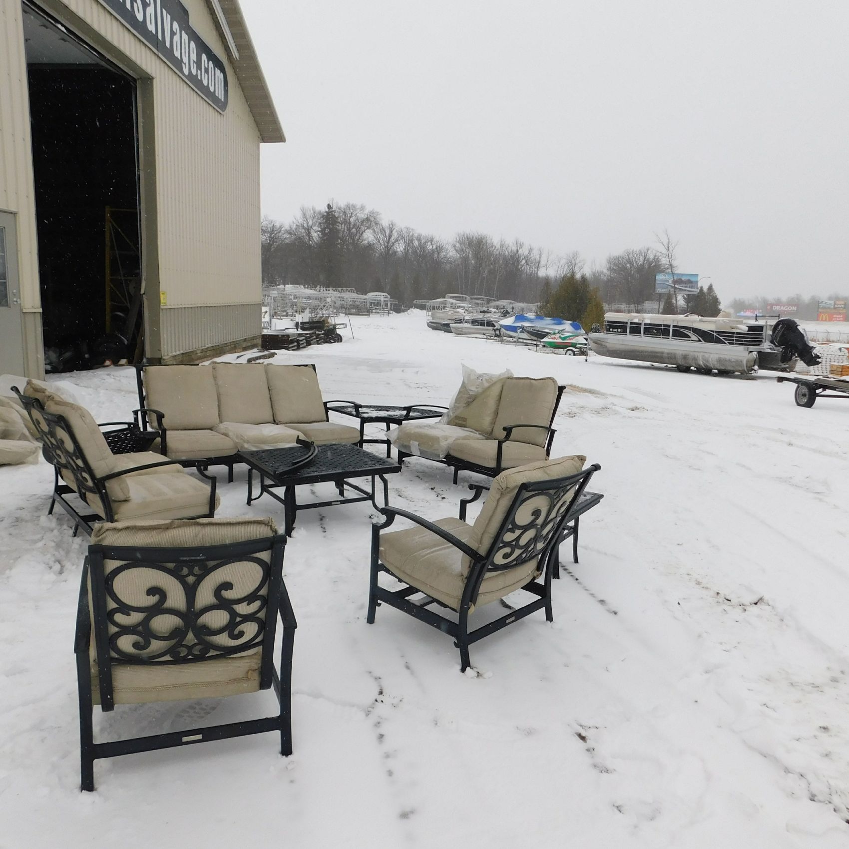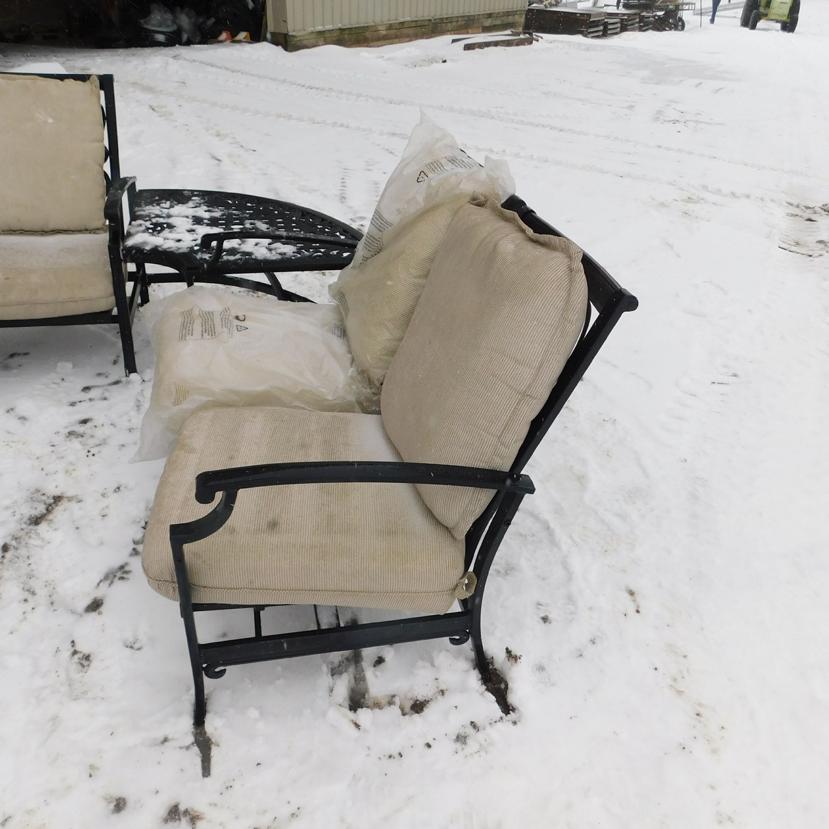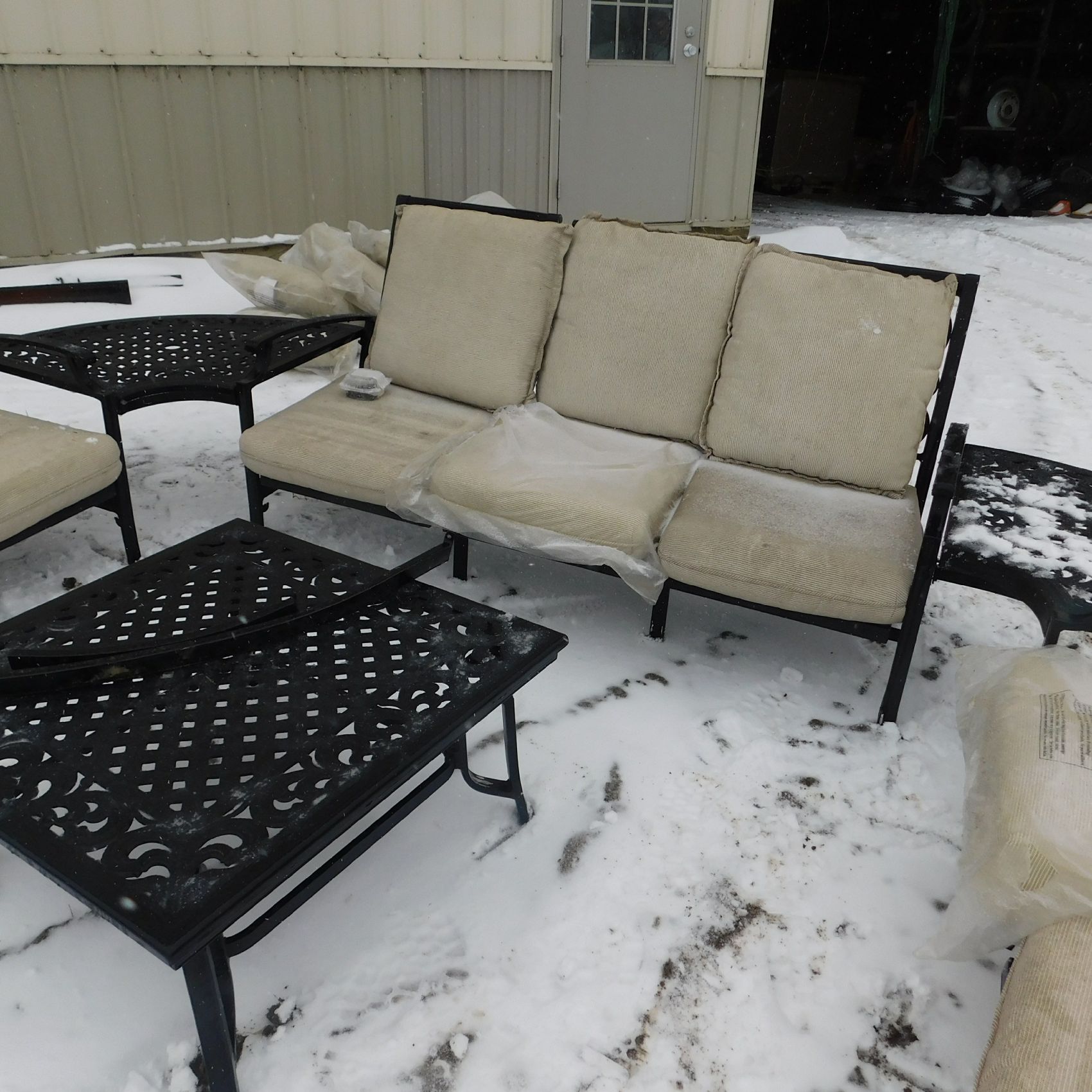 Coming to us as Stock #1903 is a Thomasville patio set that includes seating for nine with cushions: two single chairs, two dual chairs, one three‑seater chair, two corner end tables that attach to the furniture, one large round table, and one small square table. This set arrived with wind damage, and upon inspection there are weld cracks, bends in the furniture, and some dismantled pieces included. Aside from the noted issues and normal wear and tear, the set is in relatively decentshape overall and is being sold AS‑IS, ready for its next owner to enjoy. Good luck bidding on this item.