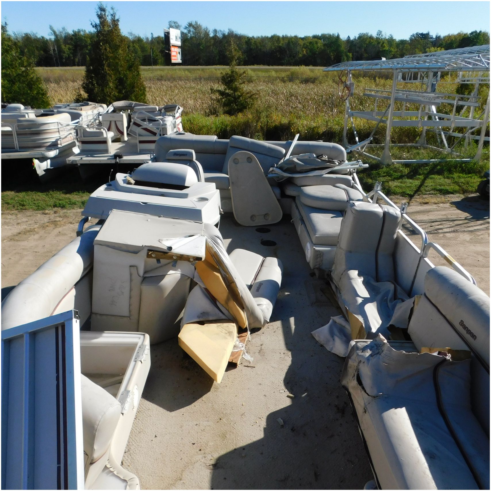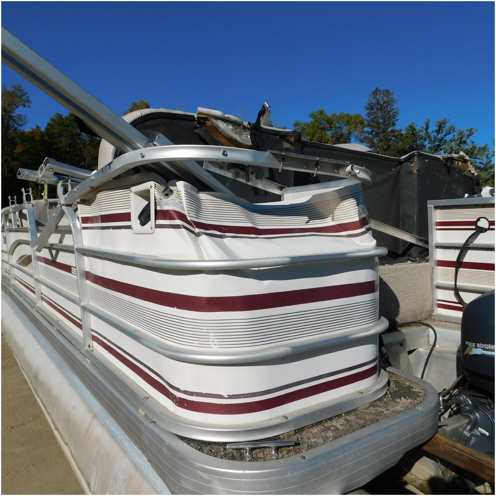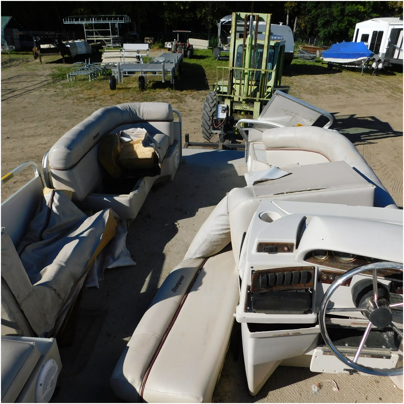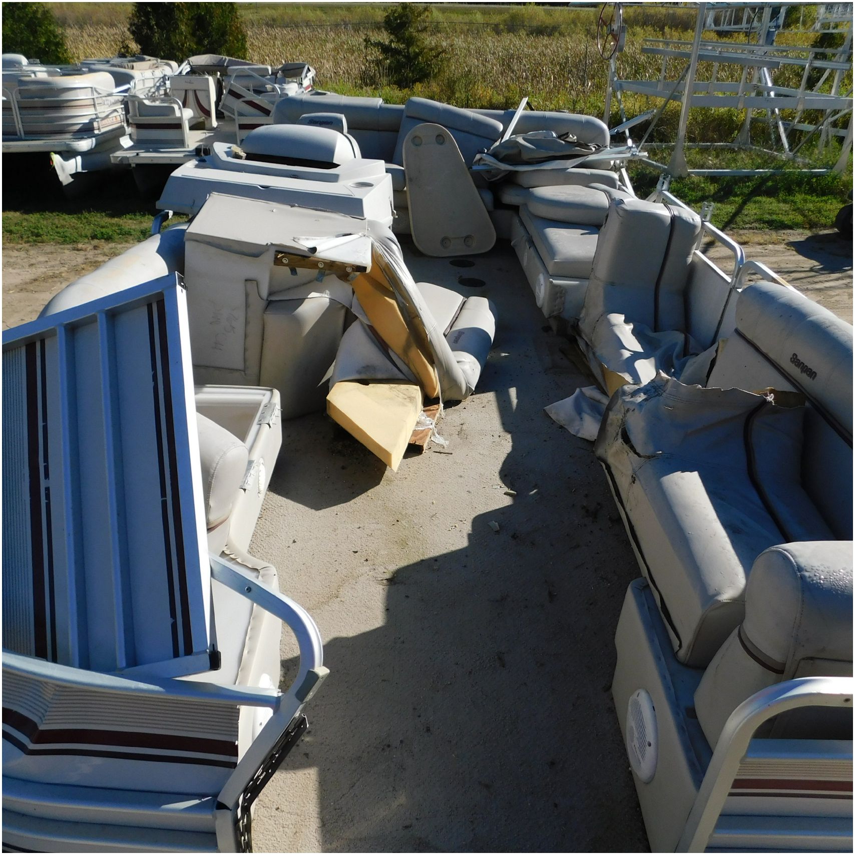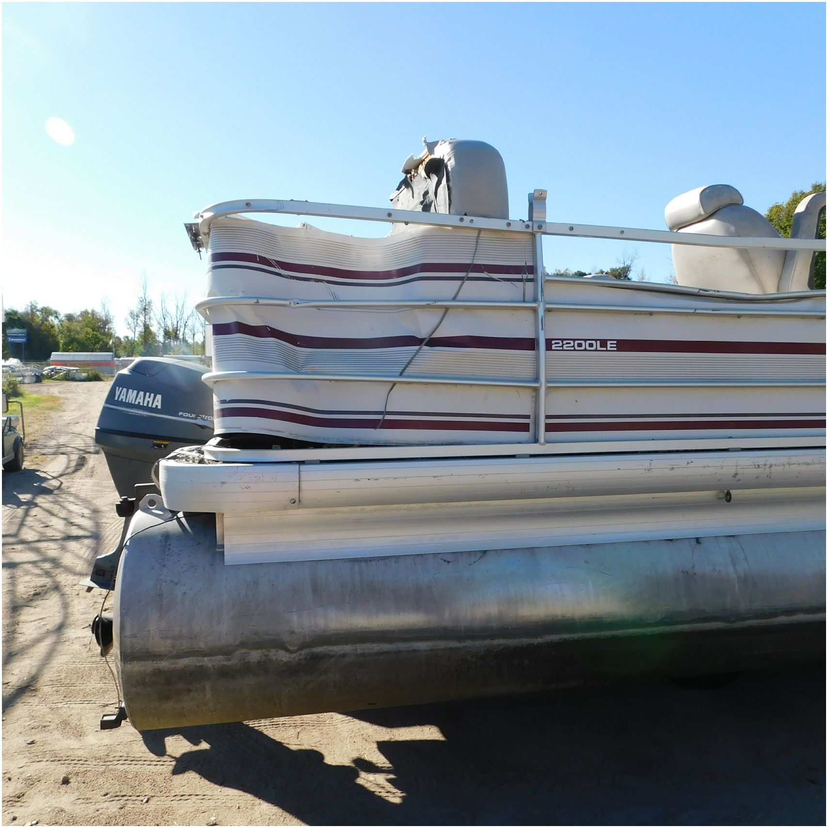 Up for auction is a 2000 San Pan 2200LE. This 22’ pontoon comes to us from being flipped and submerged. We are unsure of the exact year of the motor but we think the pontoon is equipped with a 2000 Yamaha F40TLR matching the year of the boat. The motor was started and that was it. The motor will need further inspection before any sort of use. The motor itself is weathered and paint is peeling. The front door is broke off and the railing is bent up good. The port side railing is tweaked and the siding is dented towards the rear. The stern railing is bent and the siding is dented up pretty good. The starboard side is really dented and the rails are pretty bent up. The starboard side door is also broke out. The toons are scuffed up, weathered and lake stained. The inside is completely all messed up from the roll over. The seats all around are ripped, not secure and just placed. The steering counsel is out of whack and cracked. The carpet is weathered. TRAILER NOT INCLUDED! Good Luck Bidding on this pontoon!