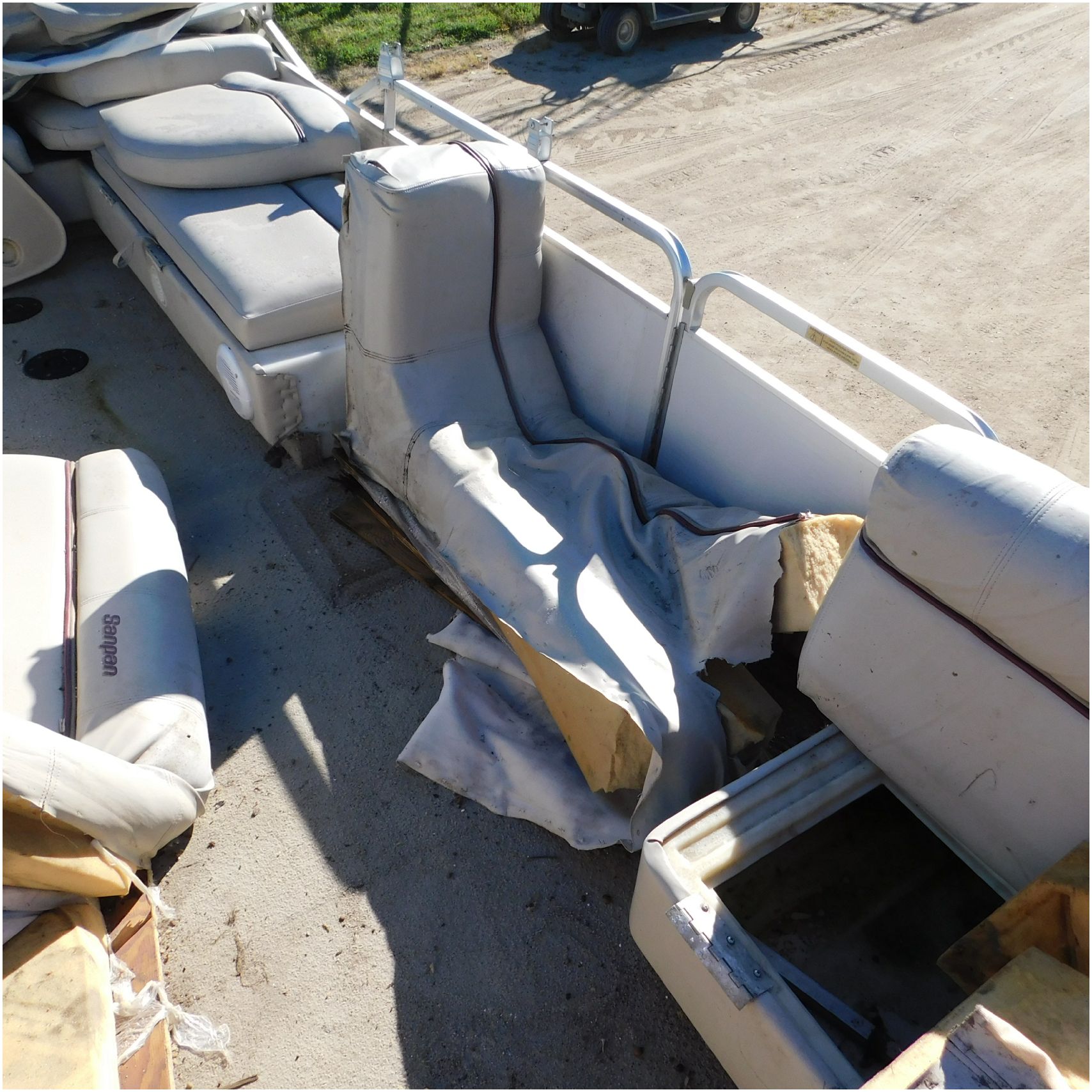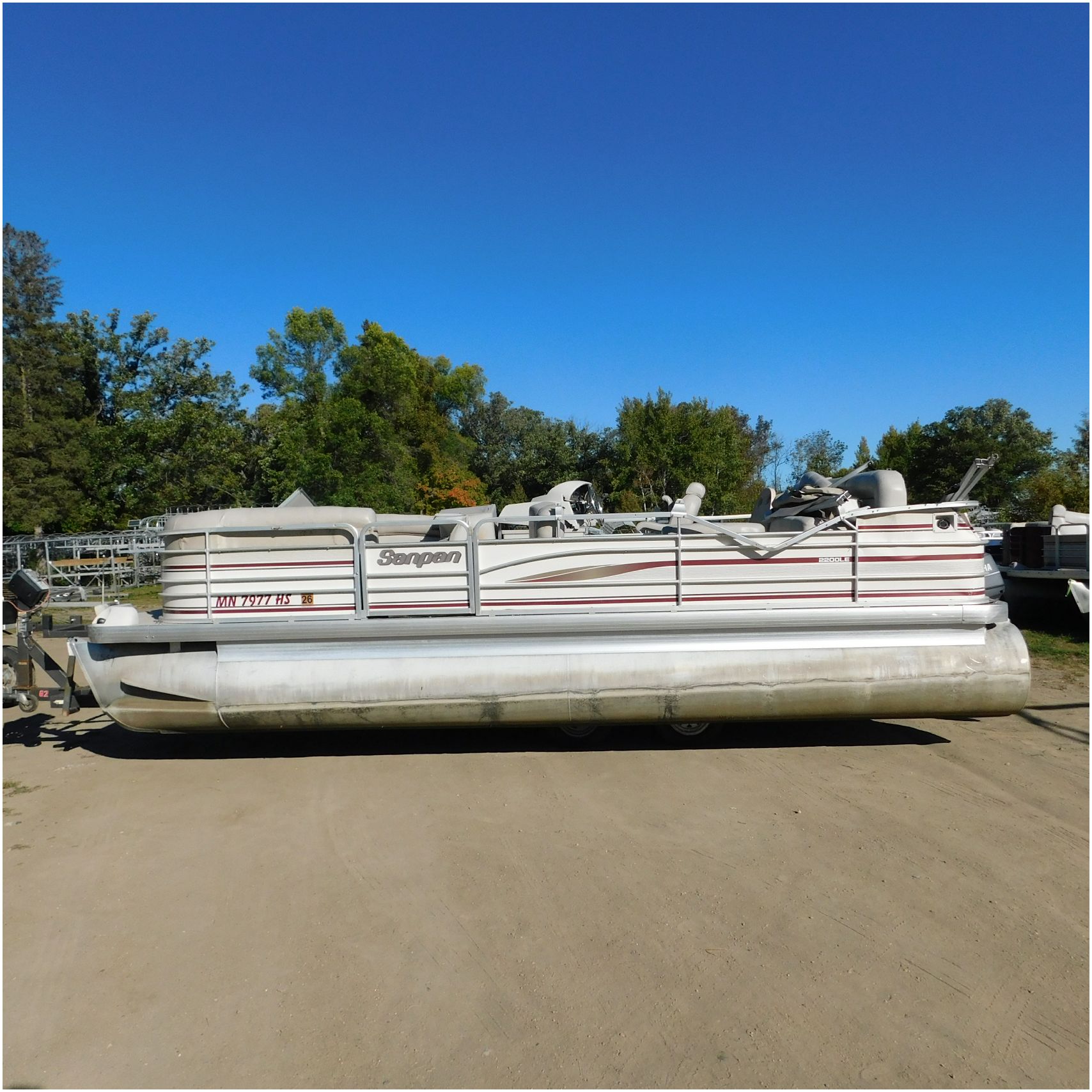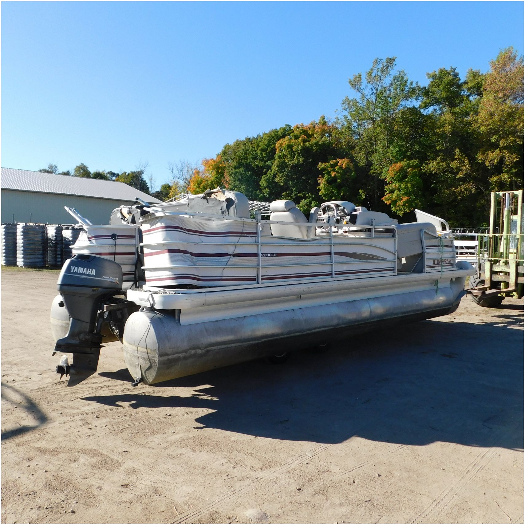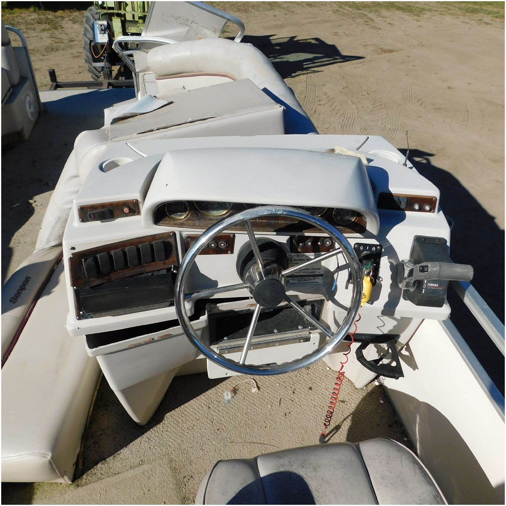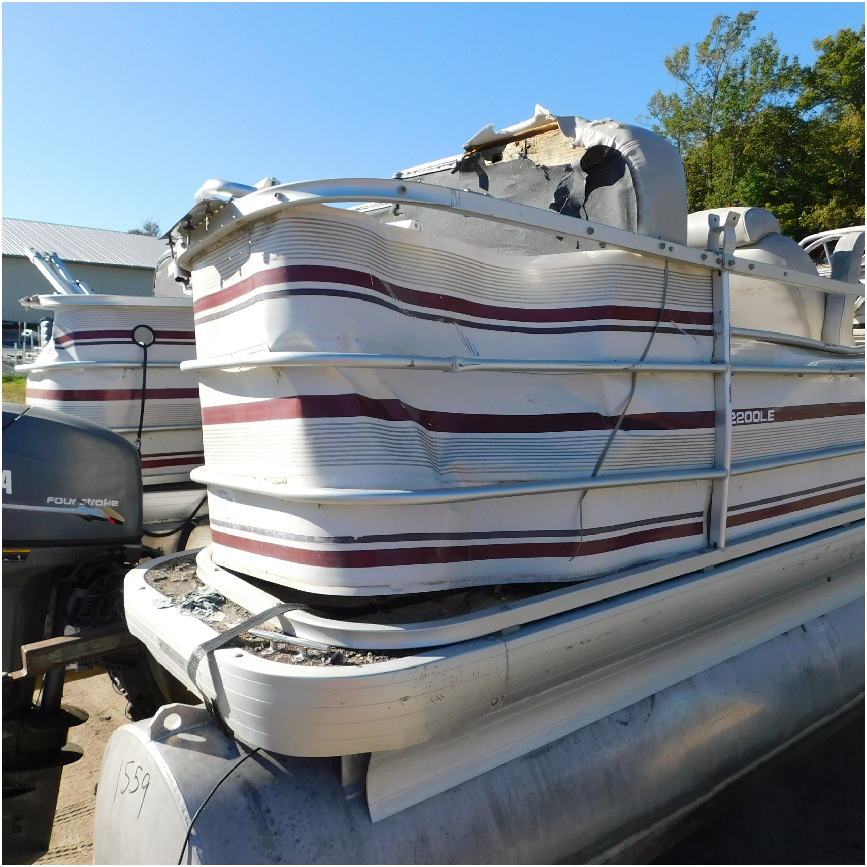 Up for auction is a 2000 San Pan 2200LE. This 22’ pontoon comes to us from being flipped and submerged. We are unsure of the exact year of the motor but we think the pontoon is equipped with a 2000 Yamaha F40TLR matching the year of the boat. The motor was started and that was it. The motor will need further inspection before any sort of use. The motor itself is weathered and paint is peeling. The front door is broke off and the railing is bent up good. The port side railing is tweaked and the siding is dented towards the rear. The stern railing is bent and the siding is dented up pretty good. The starboard side is really dented and the rails are pretty bent up. The starboard side door is also broke out. The toons are scuffed up, weathered and lake stained. The inside is completely all messed up from the roll over. The seats all around are ripped, not secure and just placed. The steering counsel is out of whack and cracked. The carpet is weathered. TRAILER NOT INCLUDED! Good Luck Bidding on this pontoon!