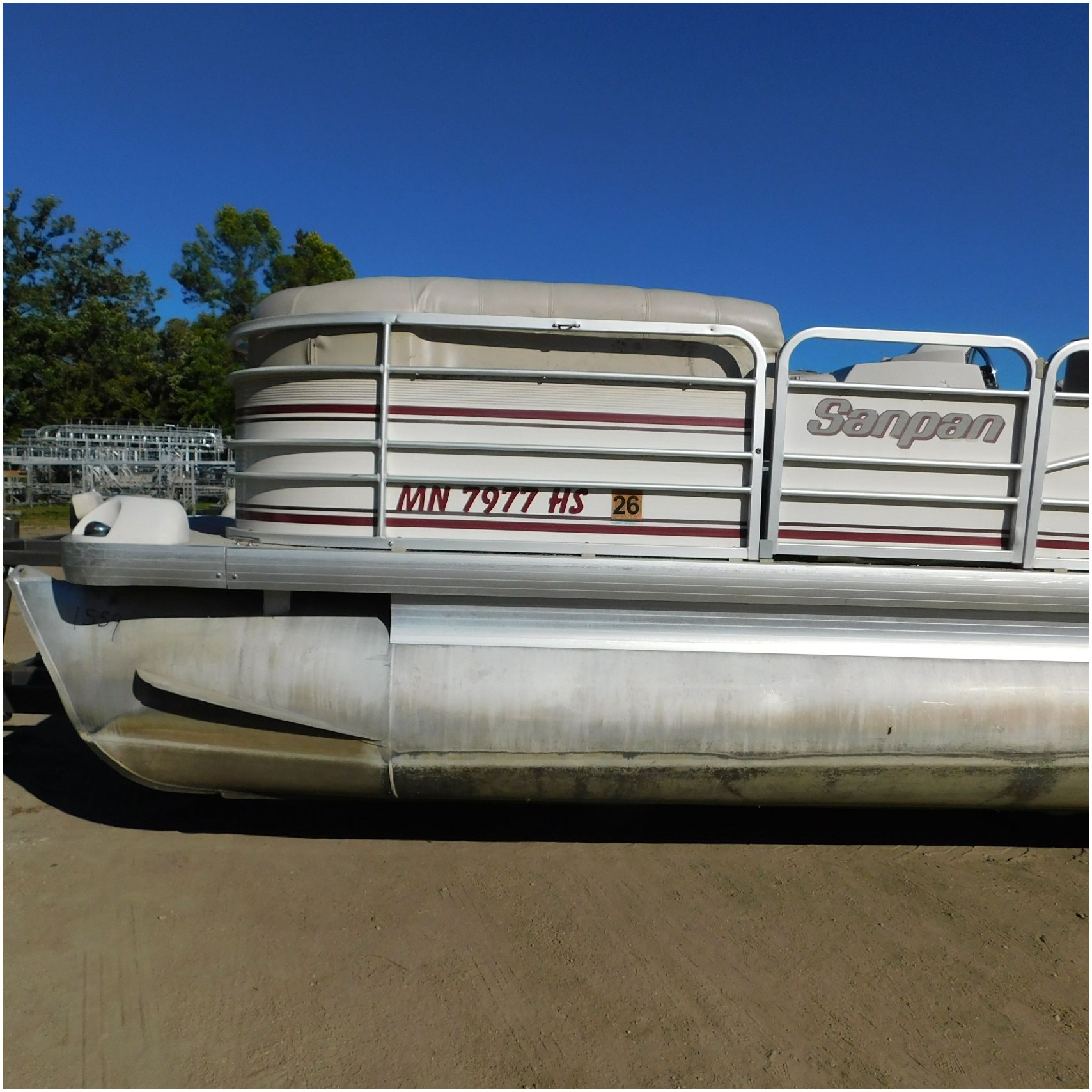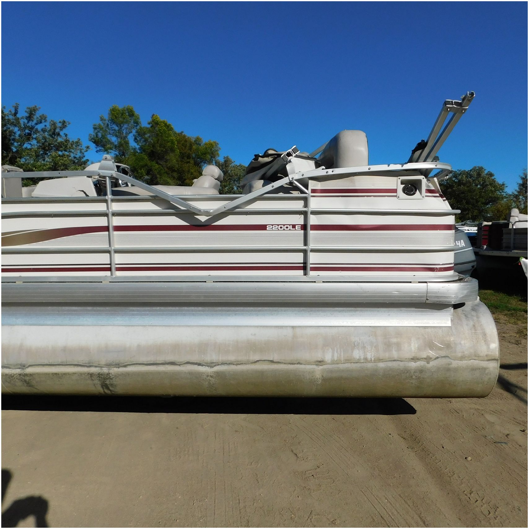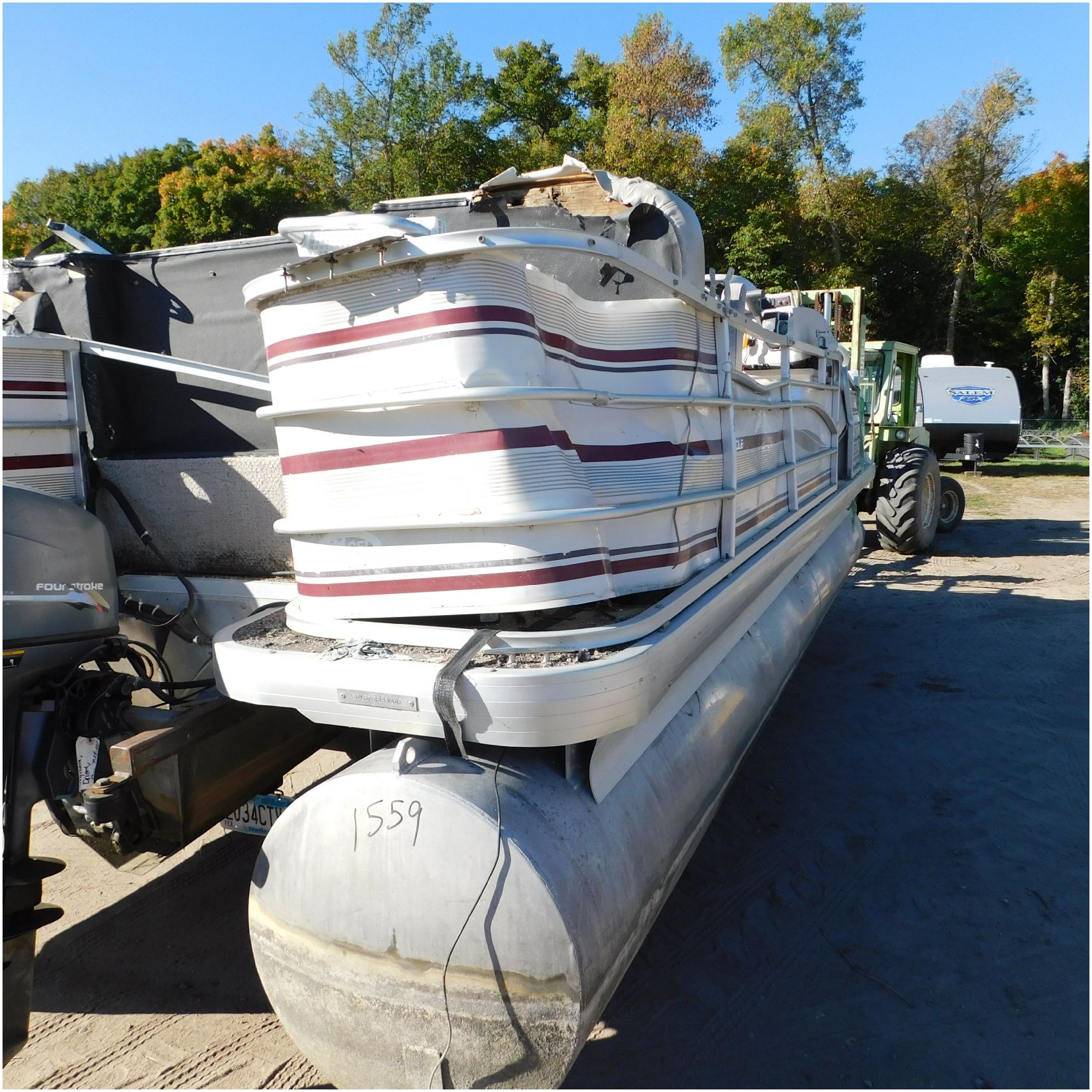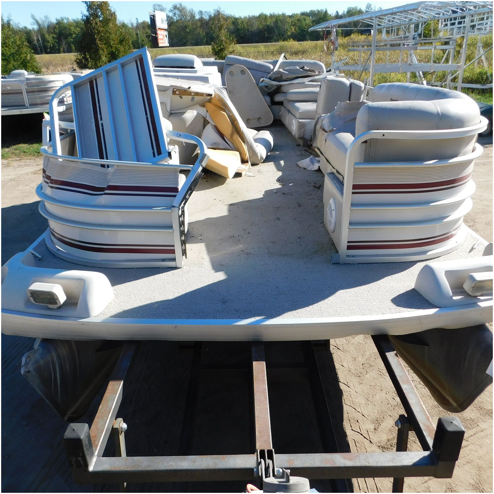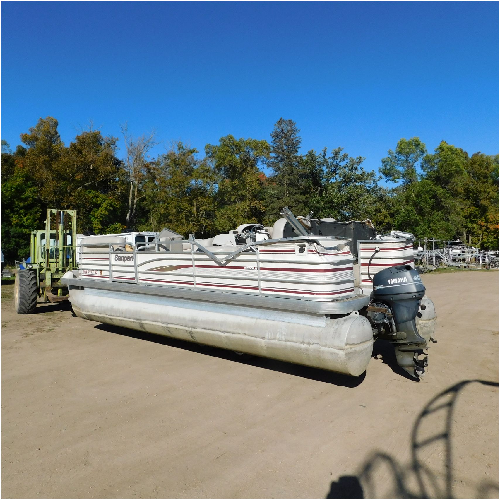 Up for auction is a 2000 San Pan 2200LE. This 22’ pontoon comes to us from being flipped and submerged. We are unsure of the exact year of the motor but we think the pontoon is equipped with a 2000 Yamaha F40TLR matching the year of the boat. The motor was started and that was it. The motor will need further inspection before any sort of use. The motor itself is weathered and paint is peeling. The front door is broke off and the railing is bent up good. The port side railing is tweaked and the siding is dented towards the rear. The stern railing is bent and the siding is dented up pretty good. The starboard side is really dented and the rails are pretty bent up. The starboard side door is also broke out. The toons are scuffed up, weathered and lake stained. The inside is completely all messed up from the roll over. The seats all around are ripped, not secure and just placed. The steering counsel is out of whack and cracked. The carpet is weathered. TRAILER NOT INCLUDED! Good Luck Bidding on this pontoon!