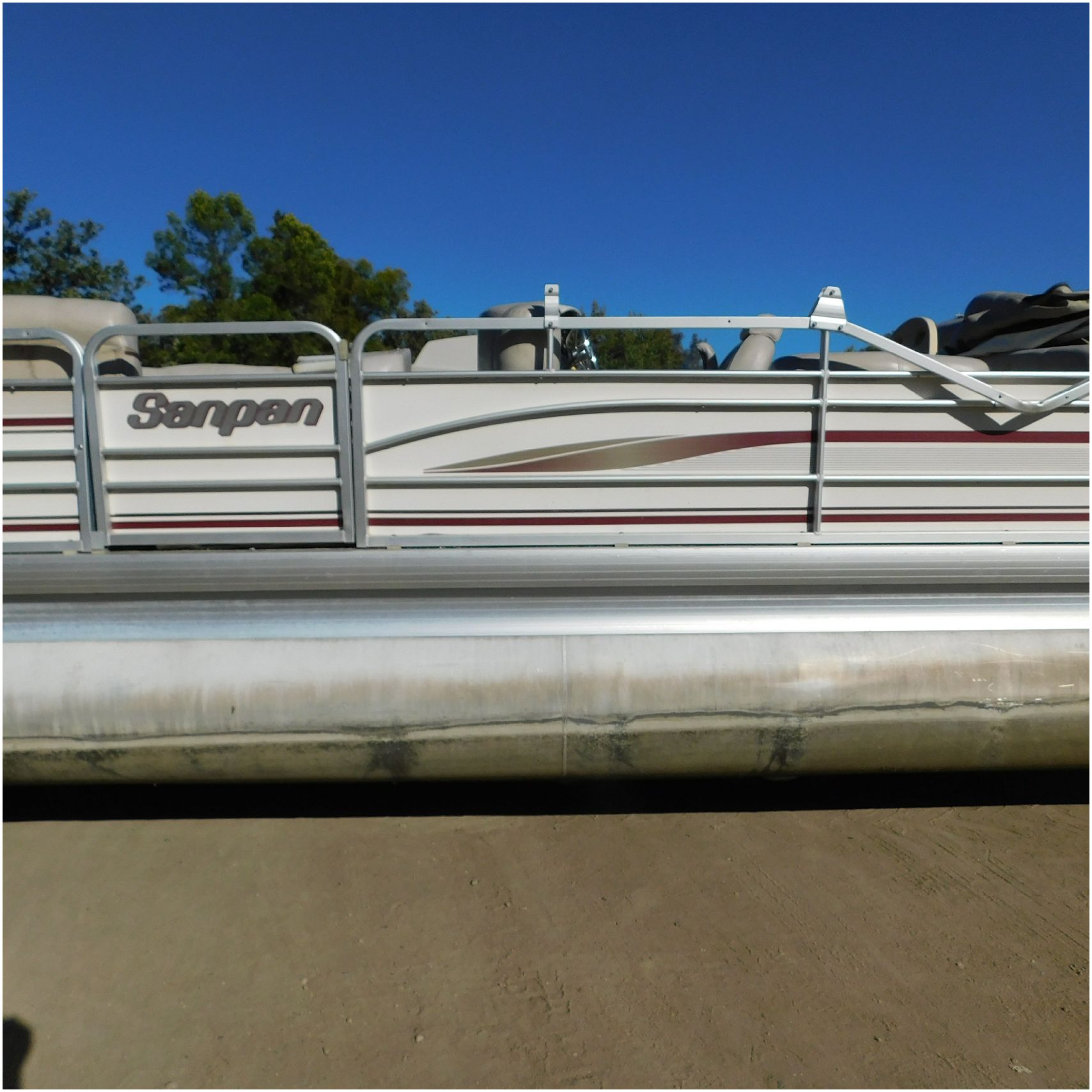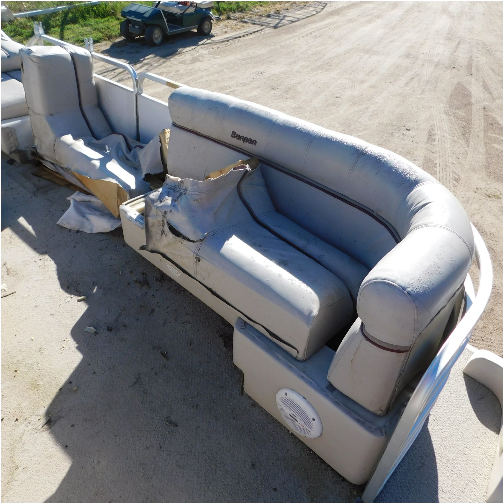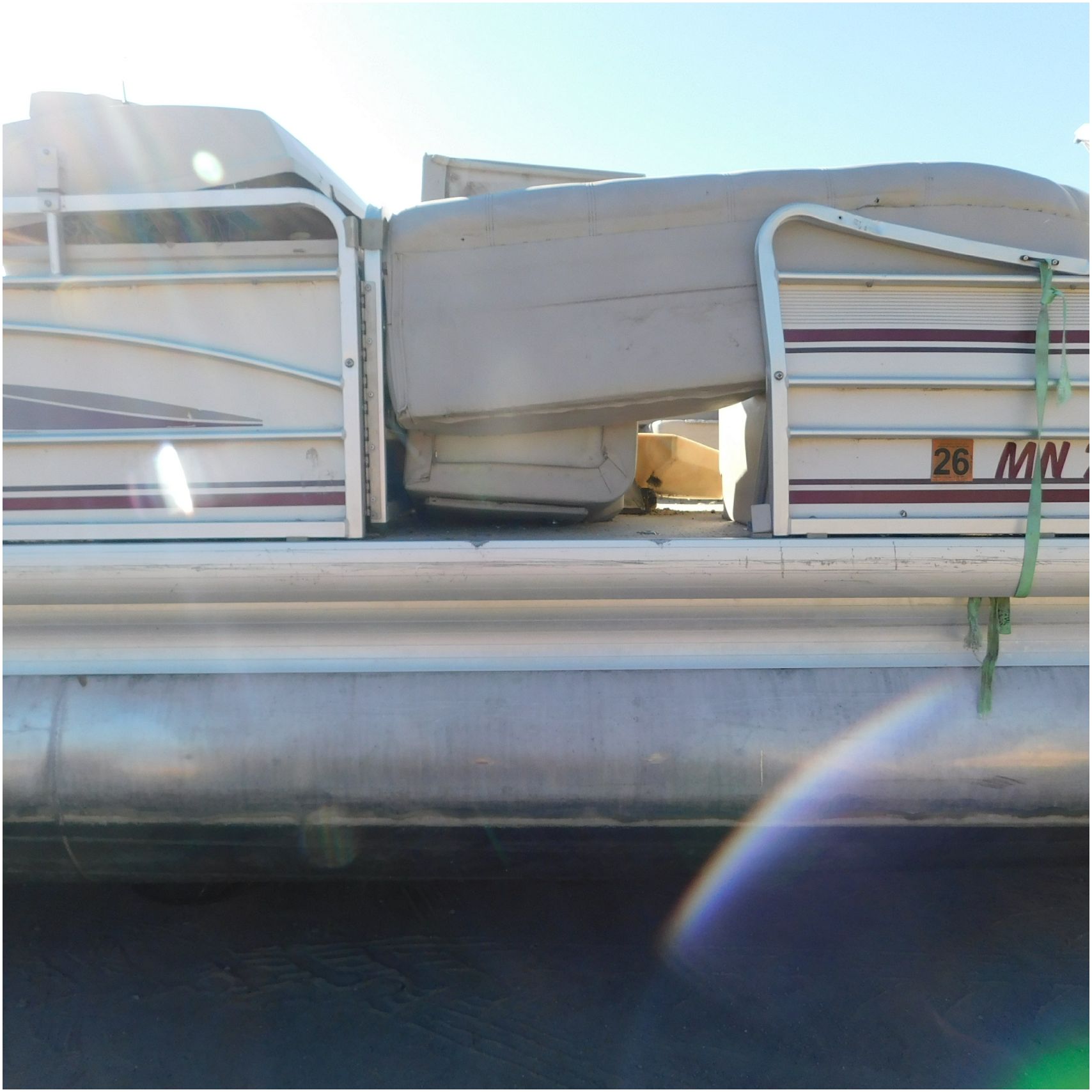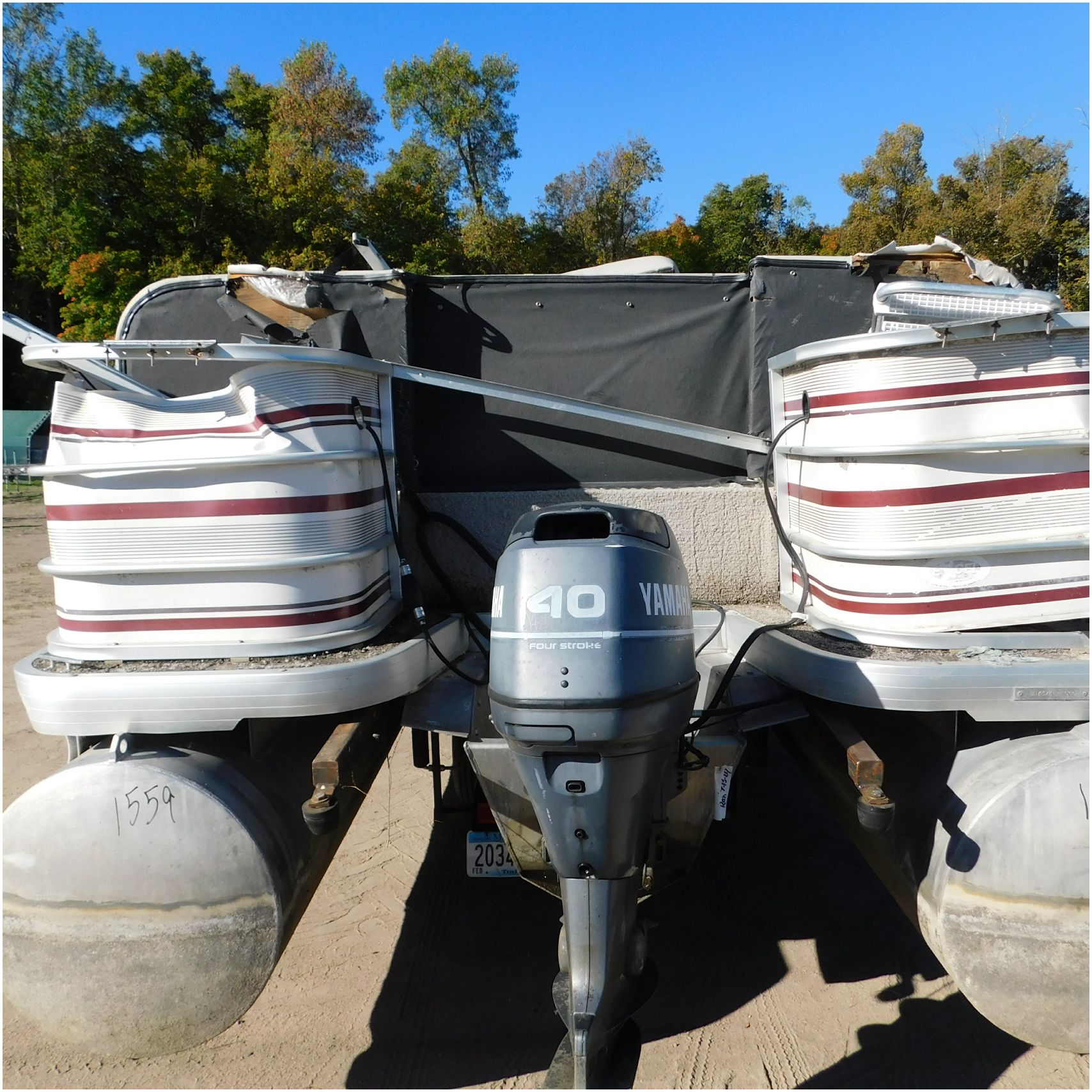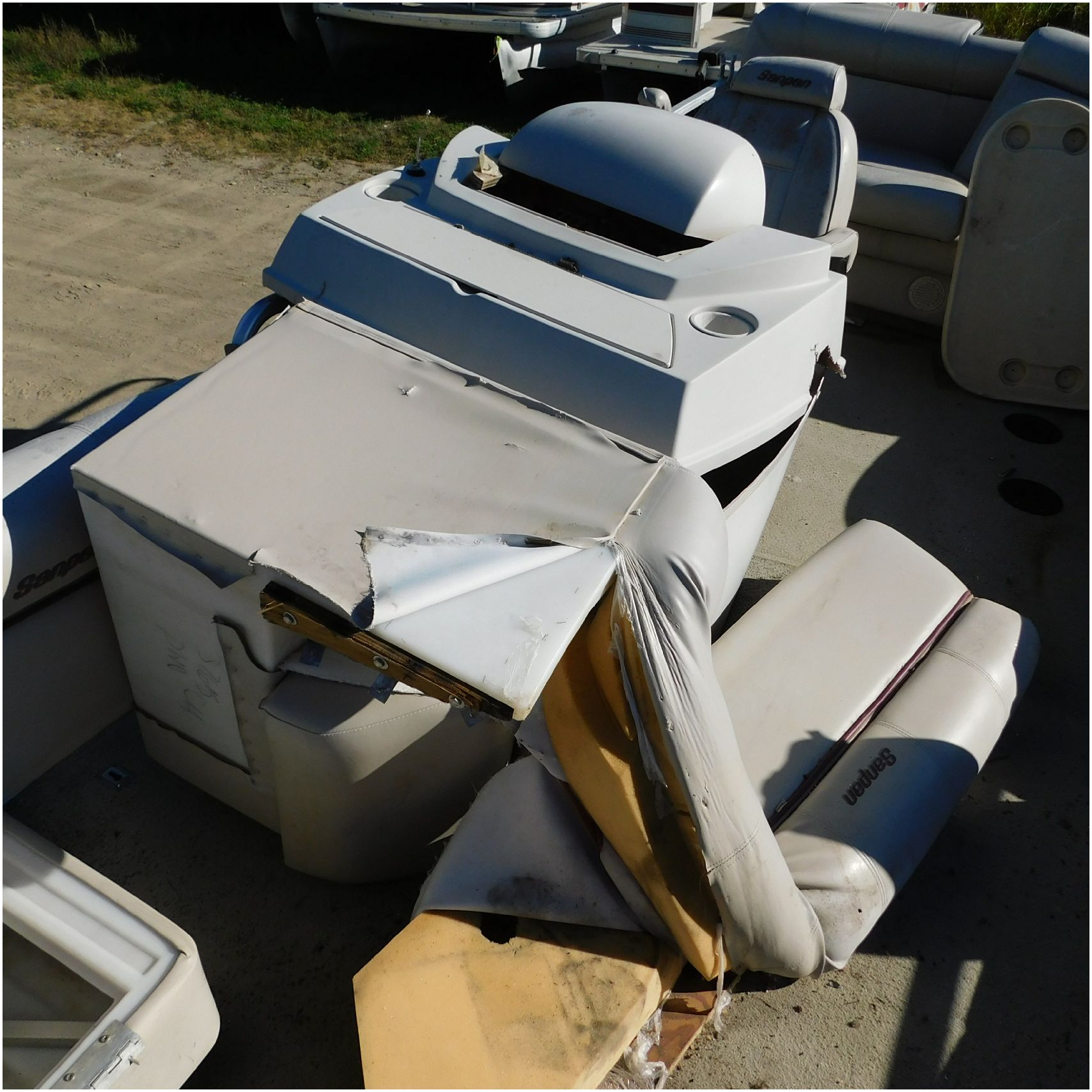 Up for auction is a 2000 San Pan 2200LE. This 22’ pontoon comes to us from being flipped and submerged. We are unsure of the exact year of the motor but we think the pontoon is equipped with a 2000 Yamaha F40TLR matching the year of the boat. The motor was started and that was it. The motor will need further inspection before any sort of use. The motor itself is weathered and paint is peeling. The front door is broke off and the railing is bent up good. The port side railing is tweaked and the siding is dented towards the rear. The stern railing is bent and the siding is dented up pretty good. The starboard side is really dented and the rails are pretty bent up. The starboard side door is also broke out. The toons are scuffed up, weathered and lake stained. The inside is completely all messed up from the roll over. The seats all around are ripped, not secure and just placed. The steering counsel is out of whack and cracked. The carpet is weathered. TRAILER NOT INCLUDED! Good Luck Bidding on this pontoon!