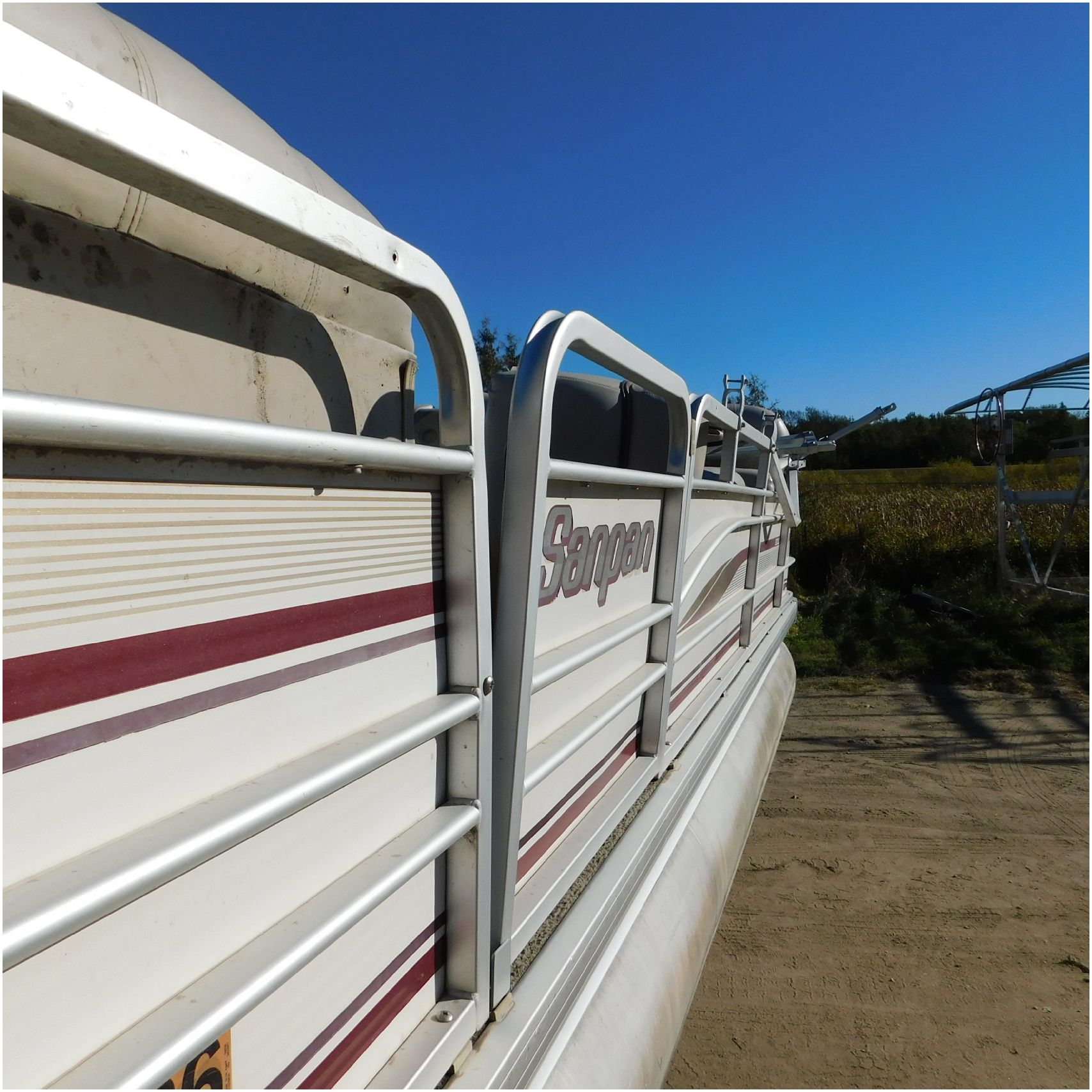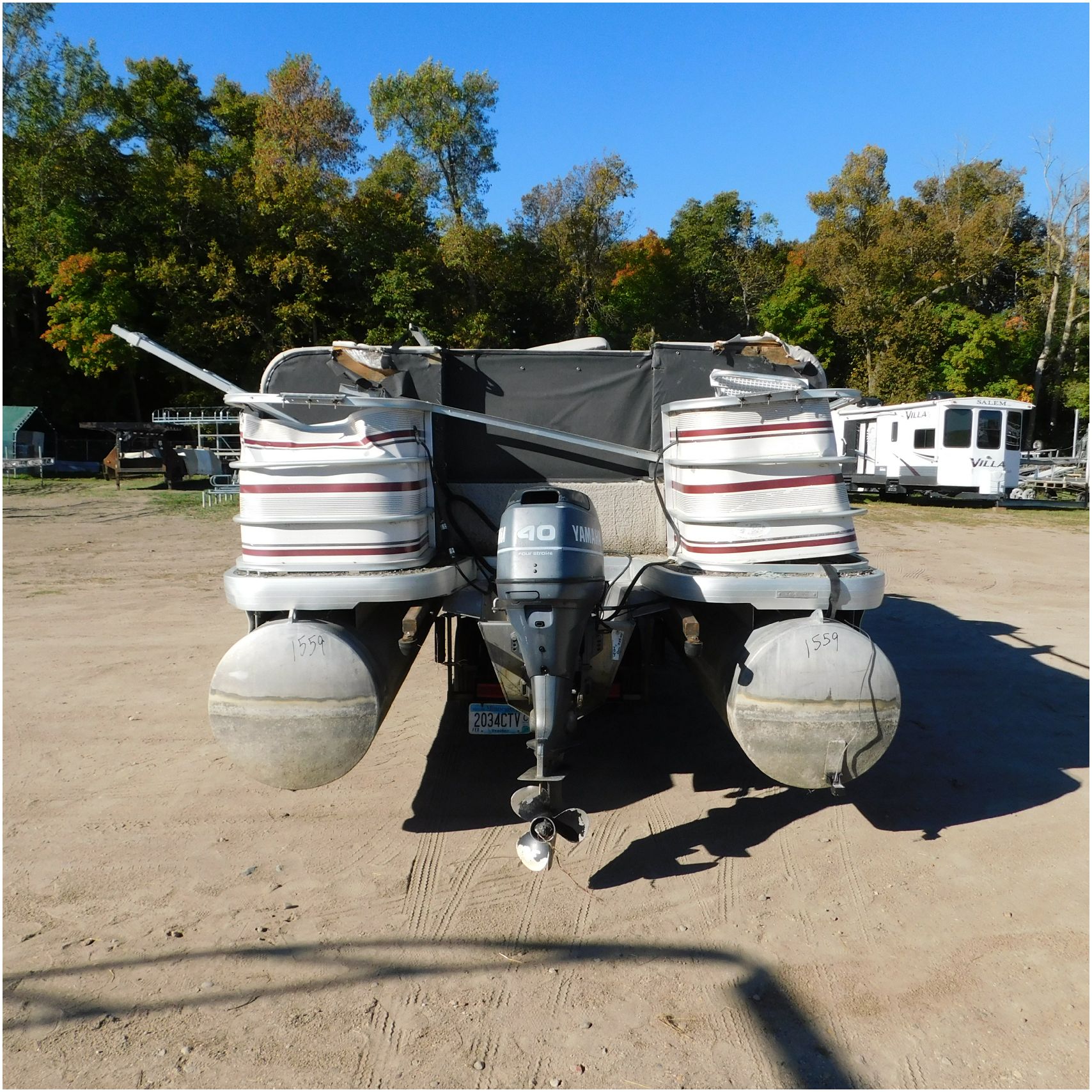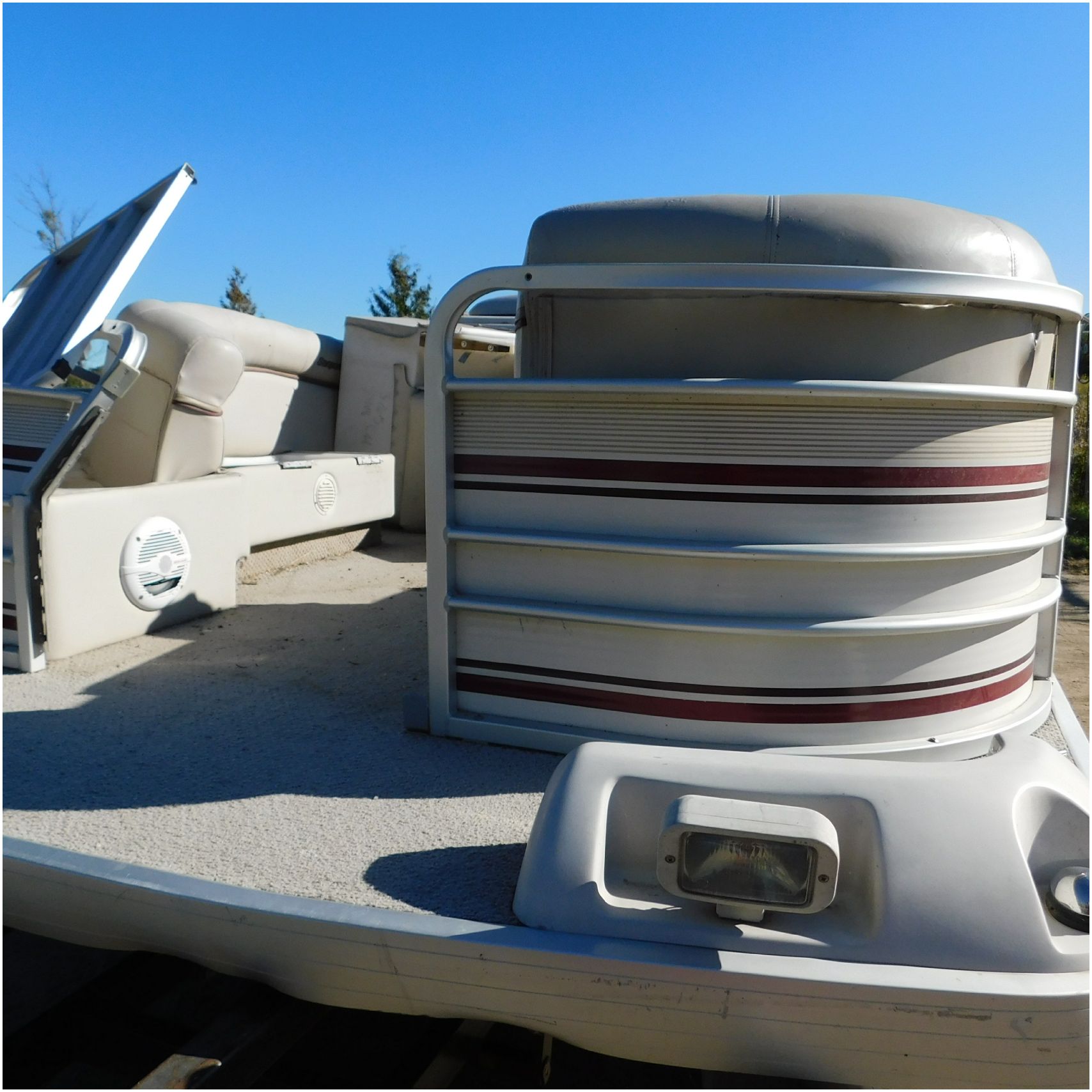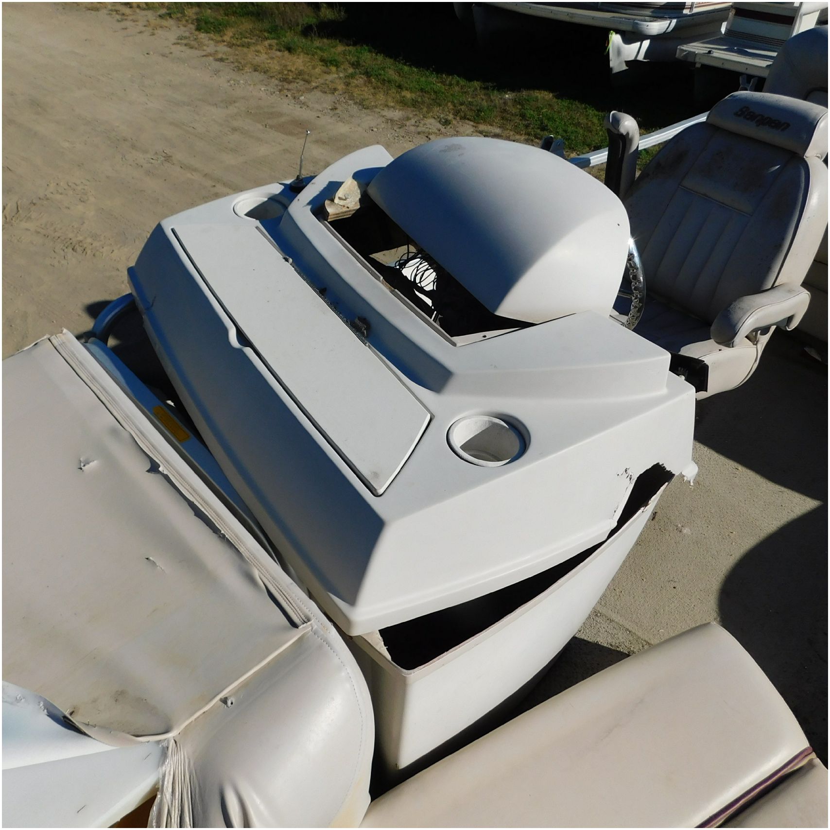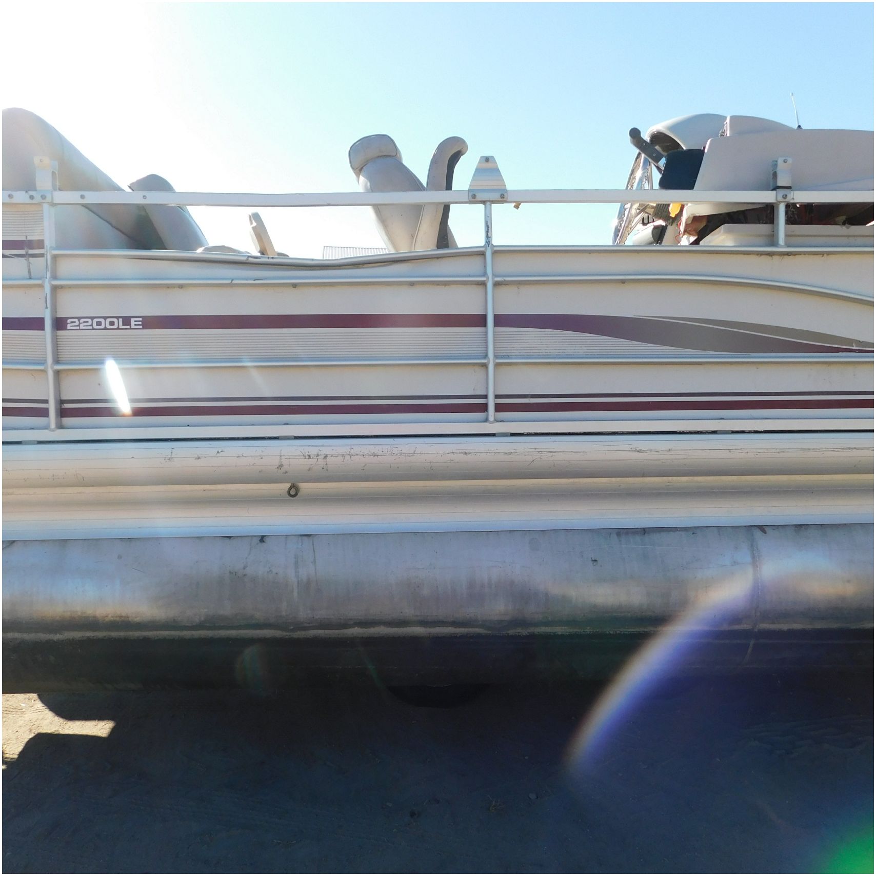Up for auction is a 2000 San Pan 2200LE. This 22’ pontoon comes to us from being flipped and submerged. We are unsure of the exact year of the motor but we think the pontoon is equipped with a 2000 Yamaha F40TLR matching the year of the boat. The motor was started and that was it. The motor will need further inspection before any sort of use. The motor itself is weathered and paint is peeling. The front door is broke off and the railing is bent up good. The port side railing is tweaked and the siding is dented towards the rear. The stern railing is bent and the siding is dented up pretty good. The starboard side is really dented and the rails are pretty bent up. The starboard side door is also broke out. The toons are scuffed up, weathered and lake stained. The inside is completely all messed up from the roll over. The seats all around are ripped, not secure and just placed. The steering counsel is out of whack and cracked. The carpet is weathered. TRAILER NOT INCLUDED! Good Luck Bidding on this pontoon!