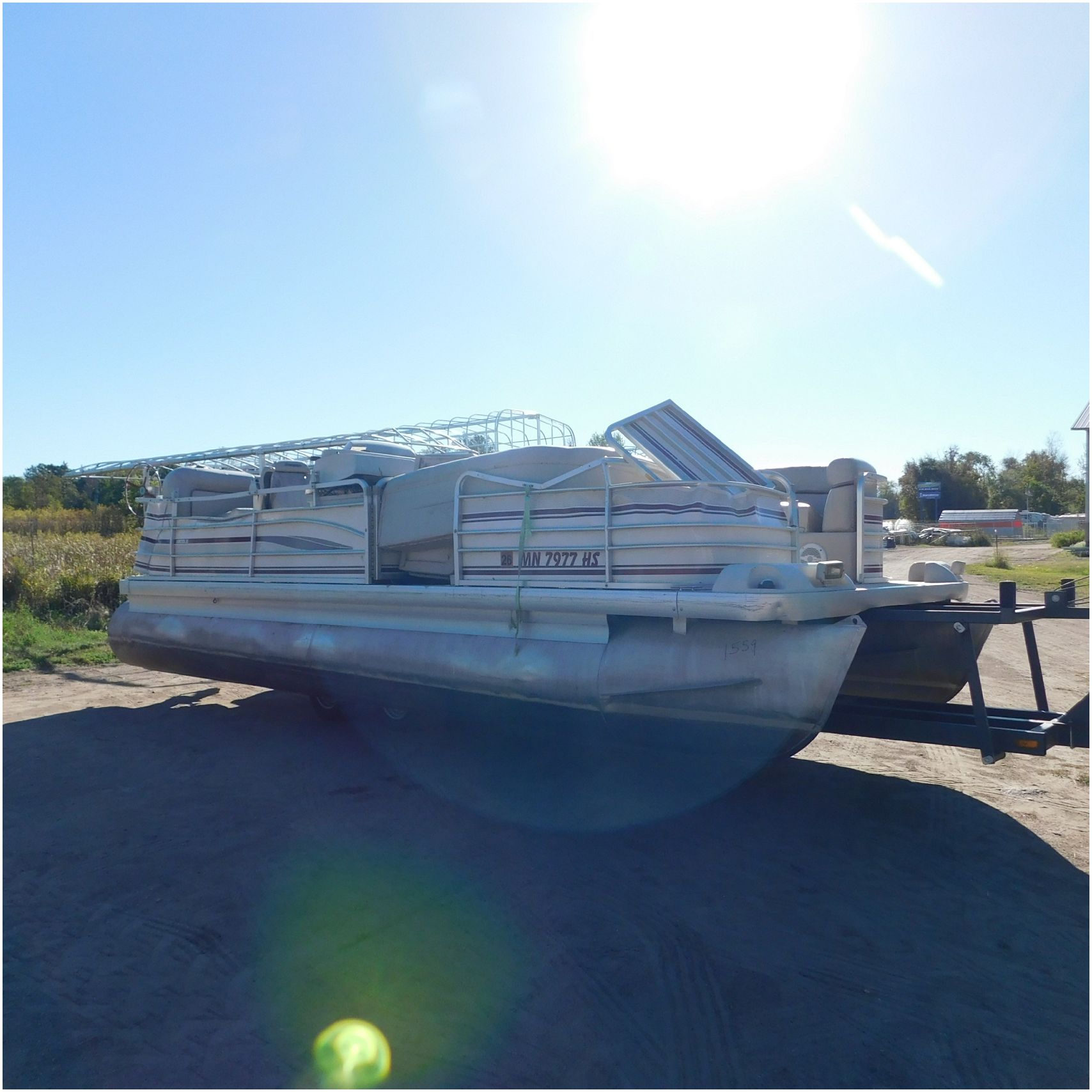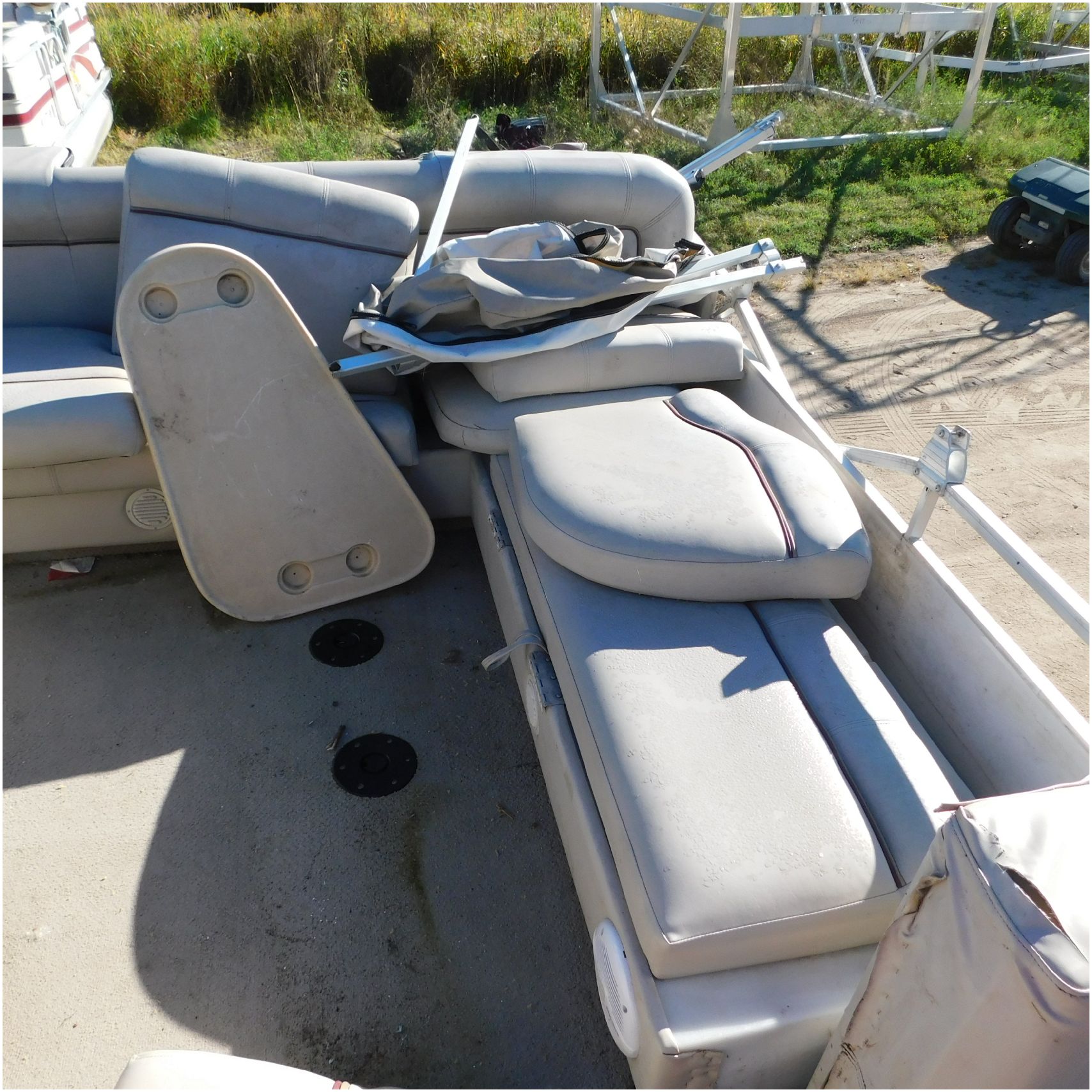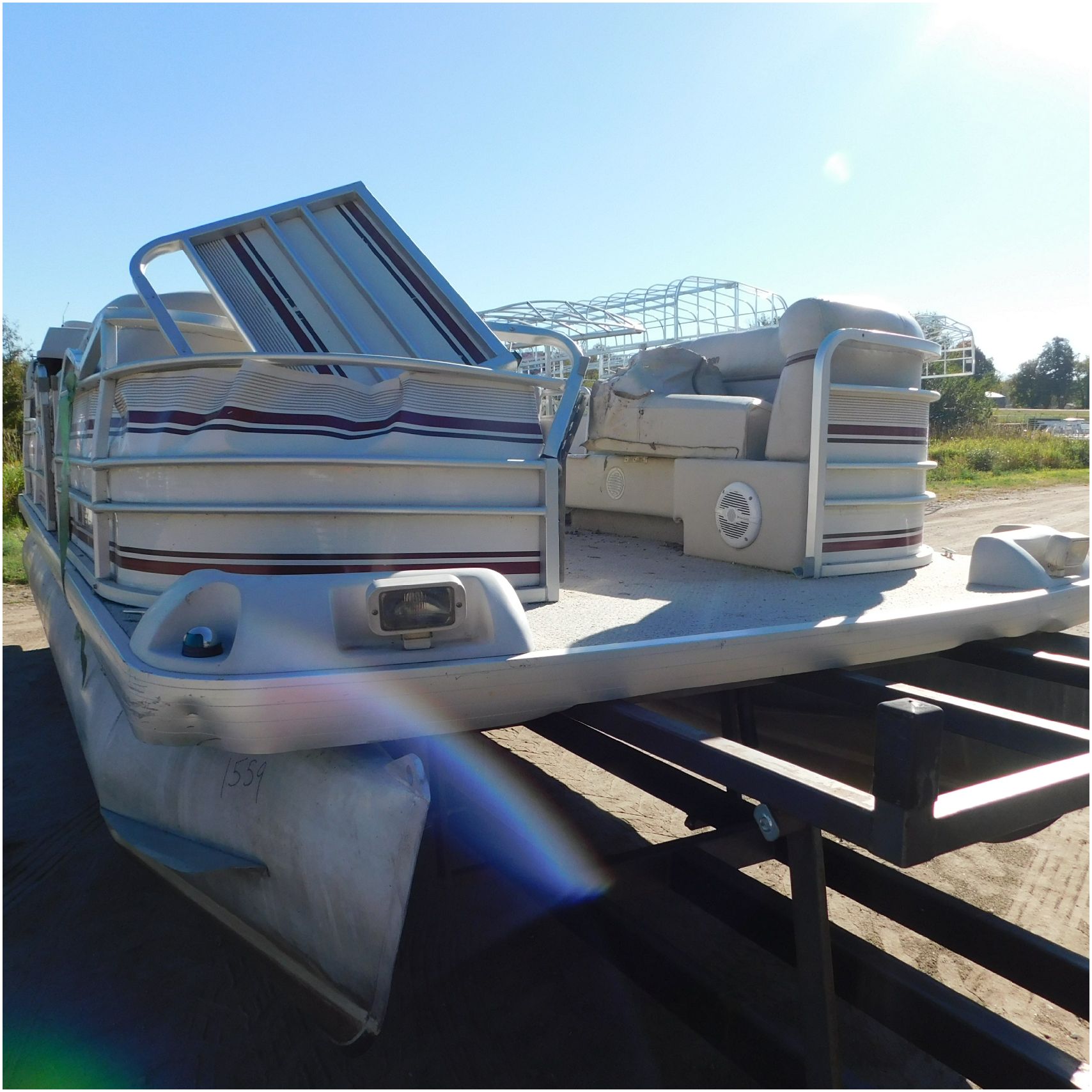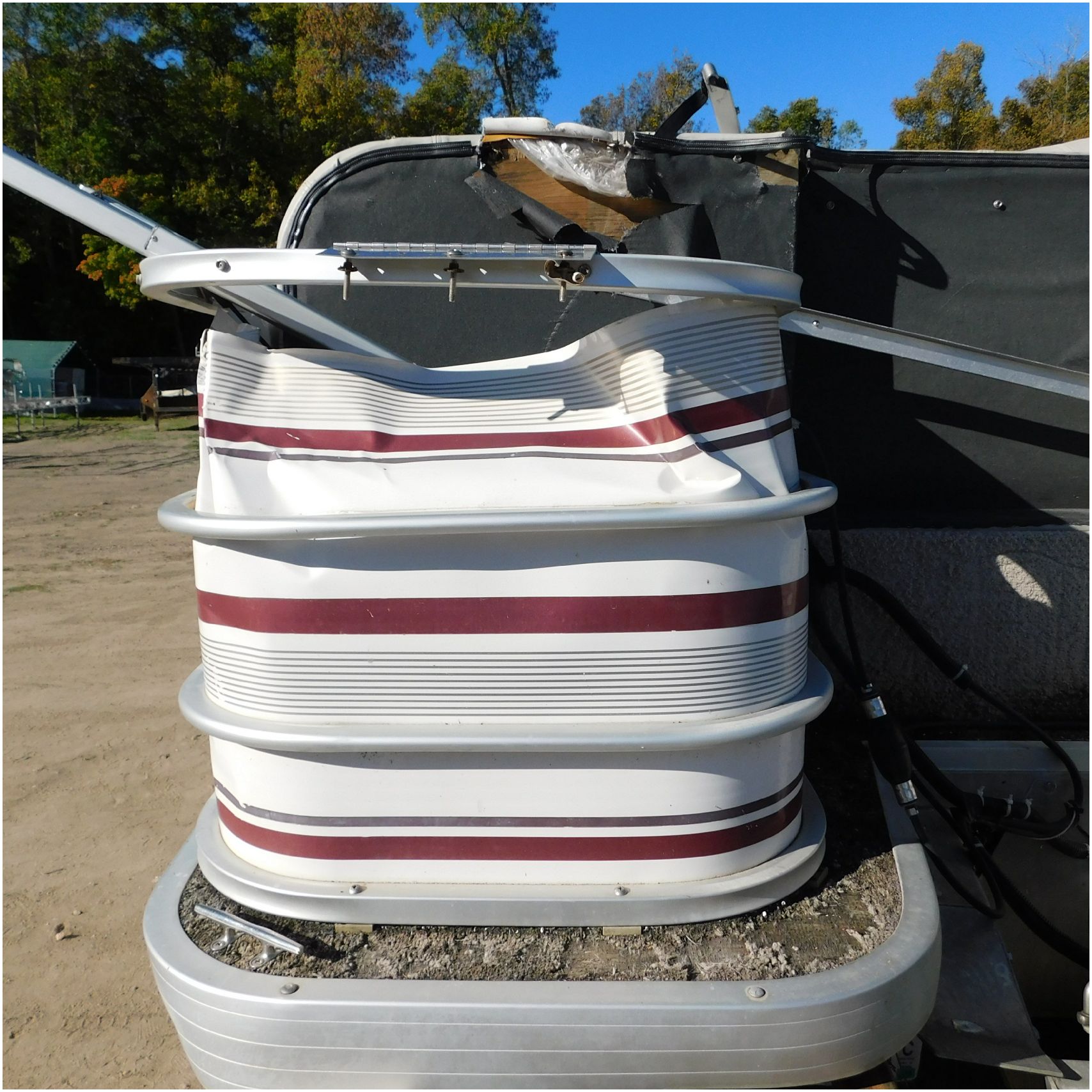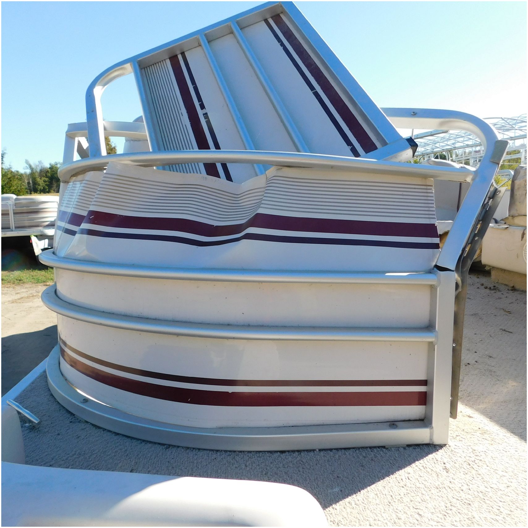 Up for auction is a 2000 San Pan 2200LE. This 22’ pontoon comes to us from being flipped and submerged. We are unsure of the exact year of the motor but we think the pontoon is equipped with a 2000 Yamaha F40TLR matching the year of the boat. The motor was started and that was it. The motor will need further inspection before any sort of use. The motor itself is weathered and paint is peeling. The front door is broke off and the railing is bent up good. The port side railing is tweaked and the siding is dented towards the rear. The stern railing is bent and the siding is dented up pretty good. The starboard side is really dented and the rails are pretty bent up. The starboard side door is also broke out. The toons are scuffed up, weathered and lake stained. The inside is completely all messed up from the roll over. The seats all around are ripped, not secure and just placed. The steering counsel is out of whack and cracked. The carpet is weathered. TRAILER NOT INCLUDED! Good Luck Bidding on this pontoon!
