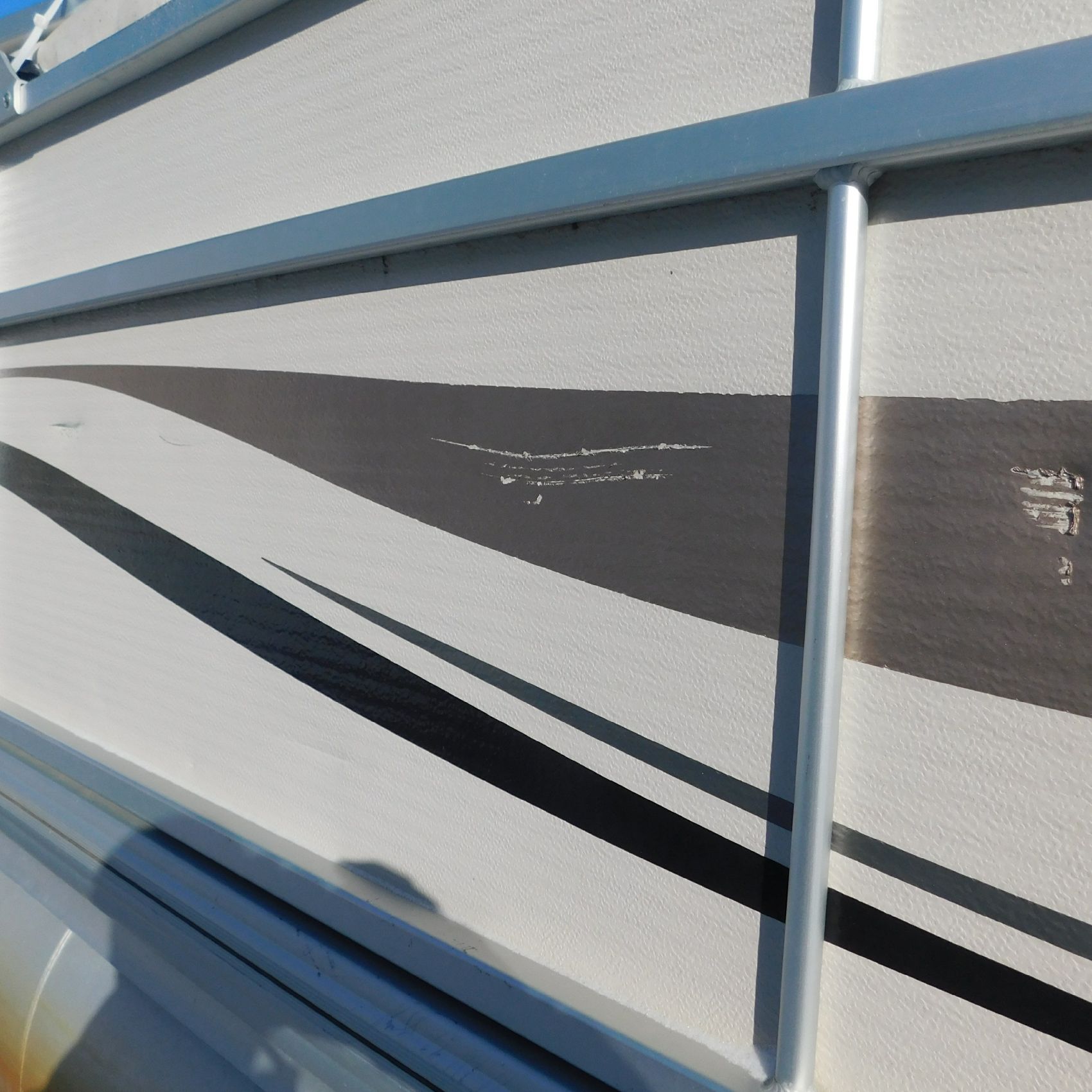 Starting at the front (Bow), there are scuffs on the center section of the trim, but aside from that, the front area appears to be in decent condition. Moving down the Port (Left) side, there are scratches on the railing and in the aluminum paneling, along with noticeable surface rust running along the entire pontoon on that side. At the Stern (Back), the Honda motor shows surface corrosion/rust and is weathered, and the rear sections of the pontoons also show surface rust; otherwise, the rest of the rear structure appears fine. On the Starboard (Right) side, the upper railing near the center is bent inward, and the railing toward the rear is scratched up.