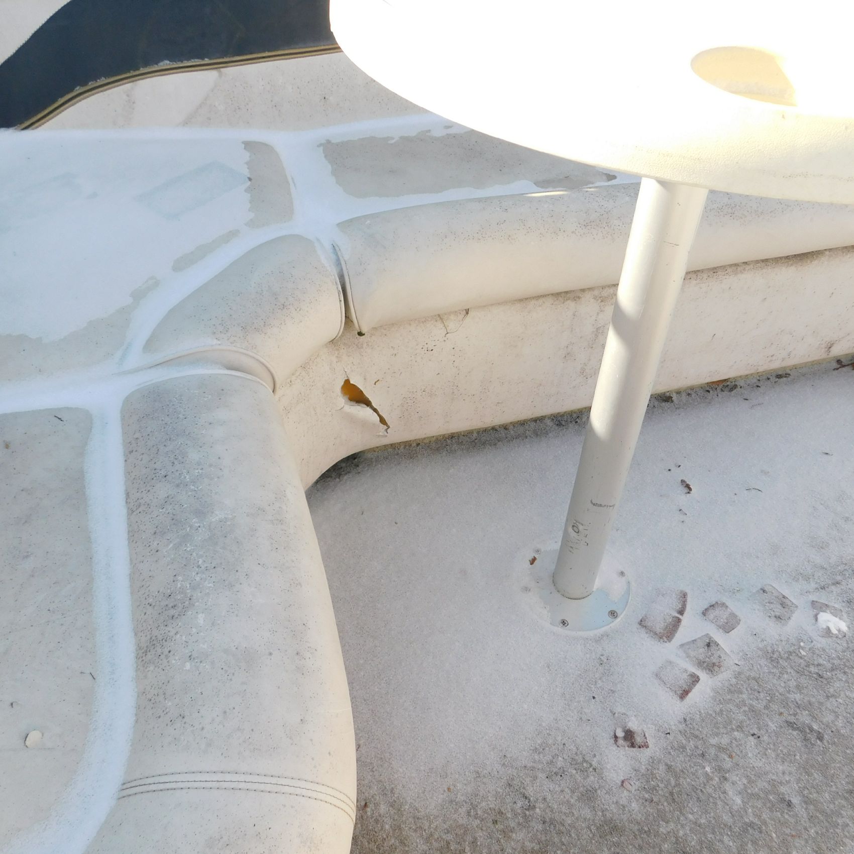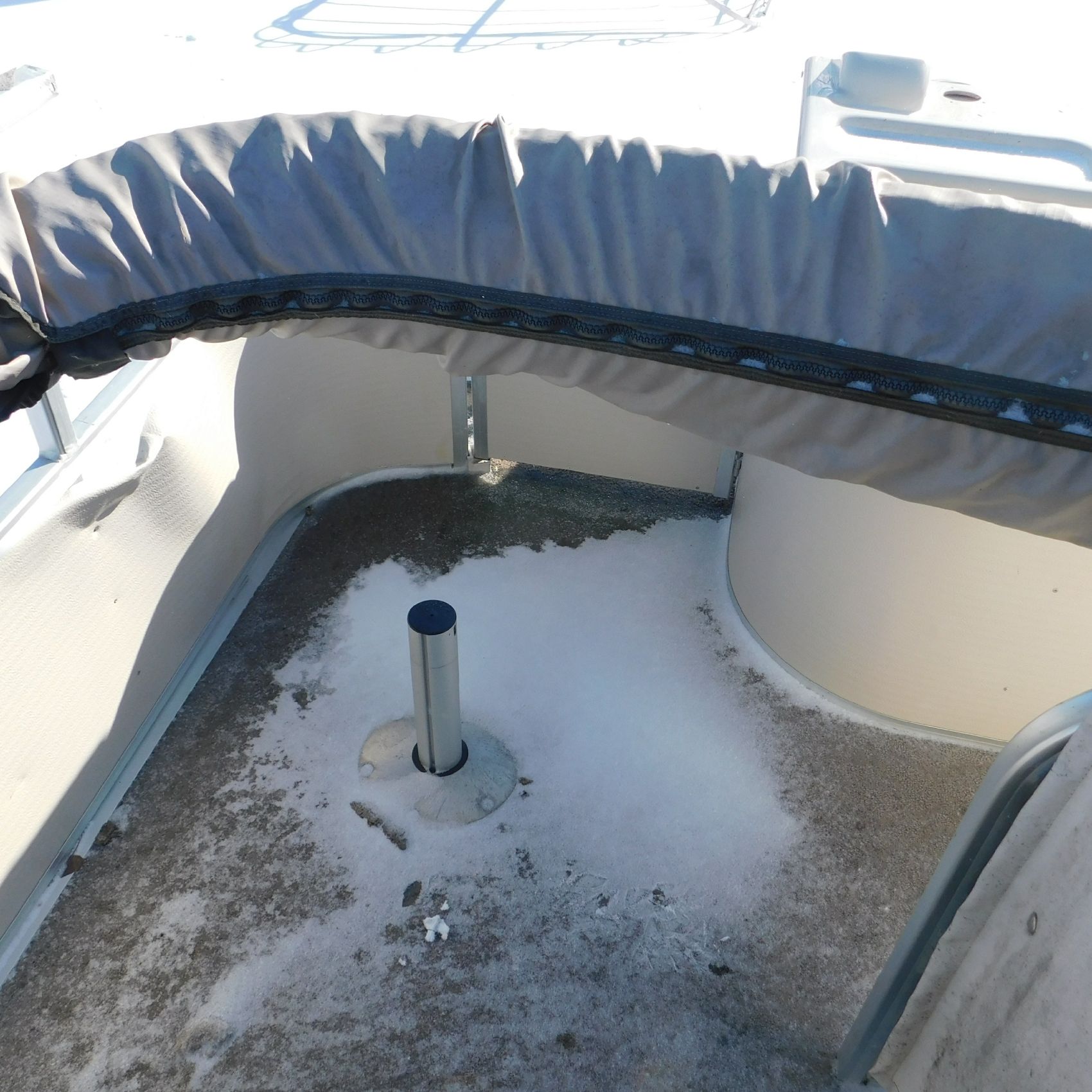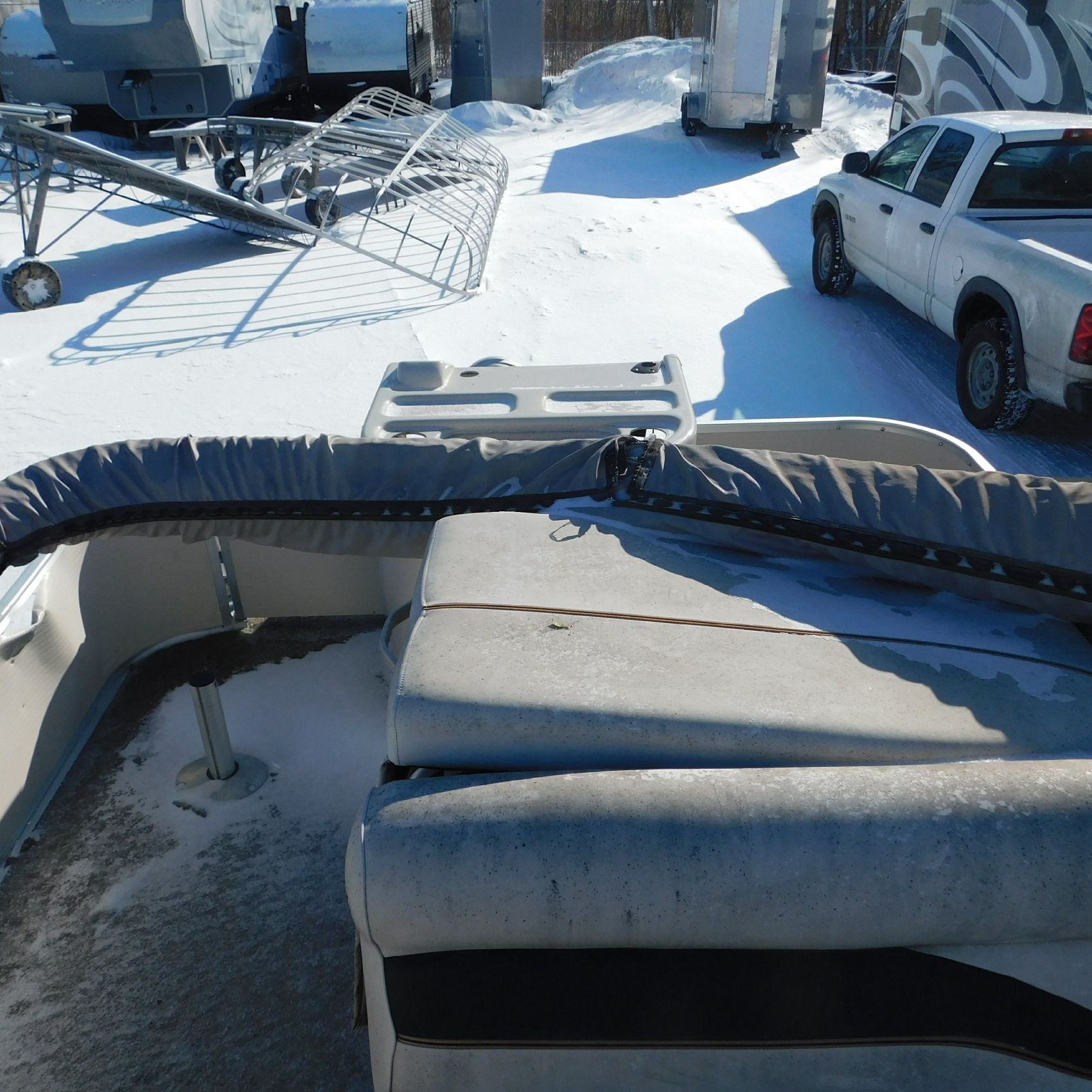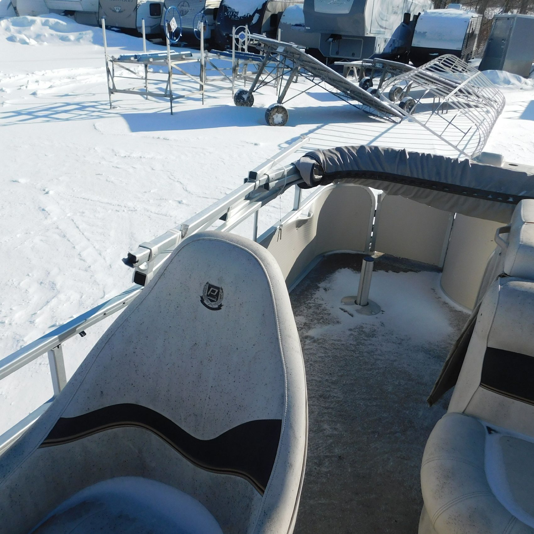 Inside the pontoon, the seating is very weathered. The two rear captain’s chairs are missing, along with one of the front captain’s chairs. There is a tear toward the bottom of the center bench seat and another rip in the driver’s seat. The flooring is moldy, and it’s possible—though not confirmed—that this pontoon may have been submerged at some point. The windshield is broken, and the Bimini top appears to be broken as well and currently zip‑tied to the frame. The hull and pontoons seem to be in okay structural condition, but they have not been lake‑tested.