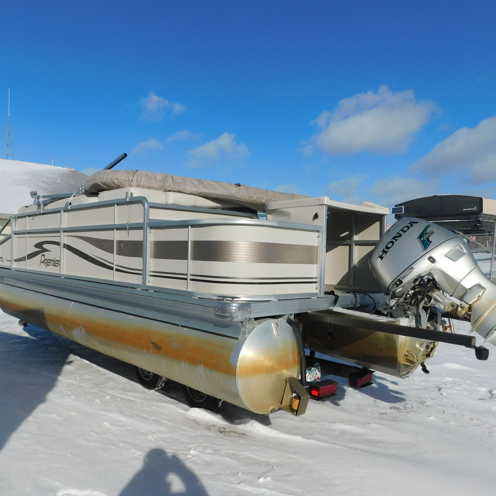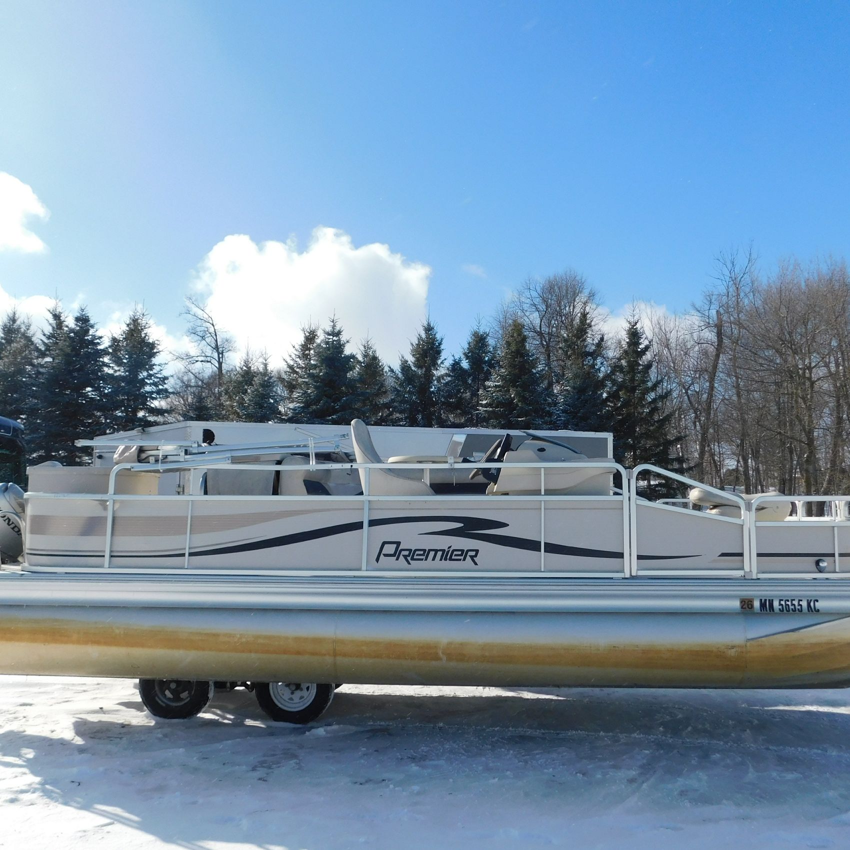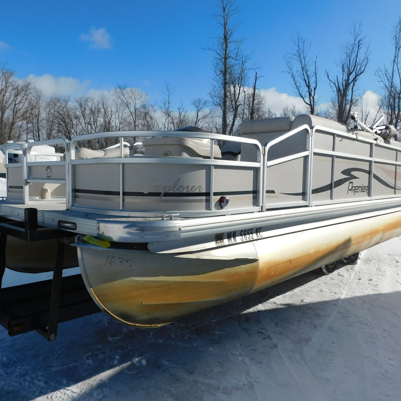 Coming to us is Stock #1635, a 2005 Premier 210 Explorer pontoon, 21 feet in length and equipped with a Honda 50HP 4‑Stroke that starts and runs. The battery and trailer are not included with this pontoon.