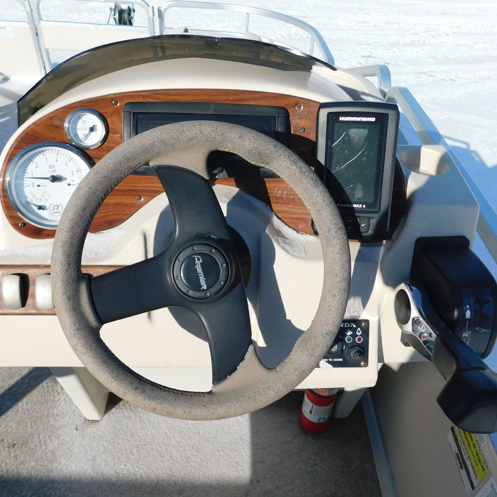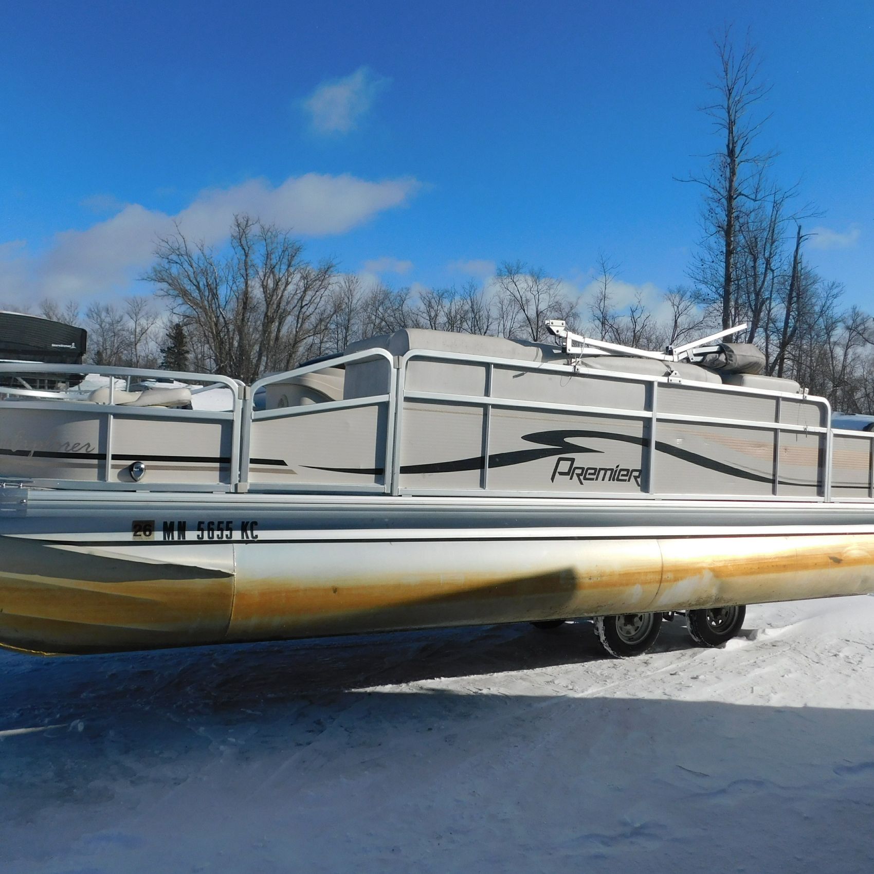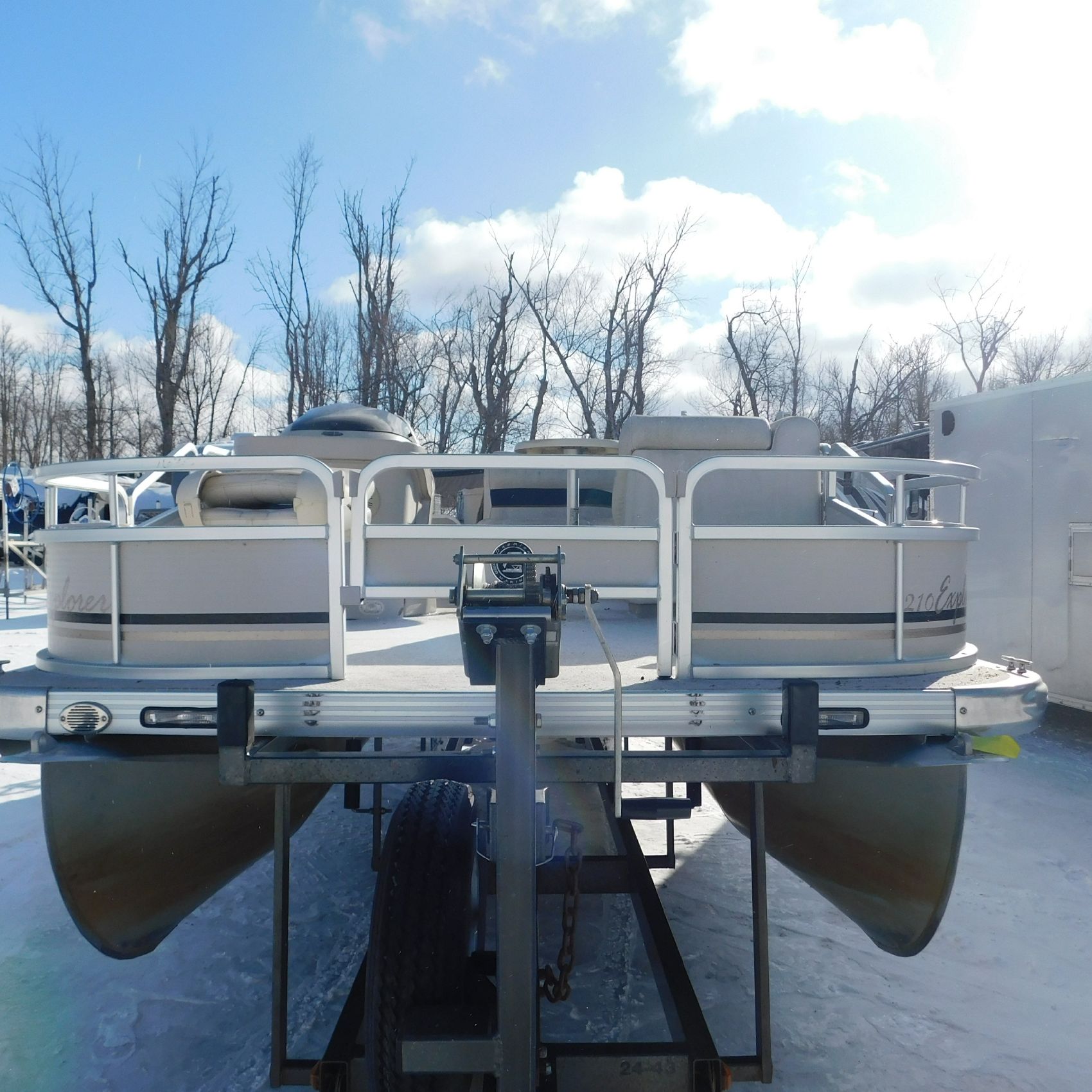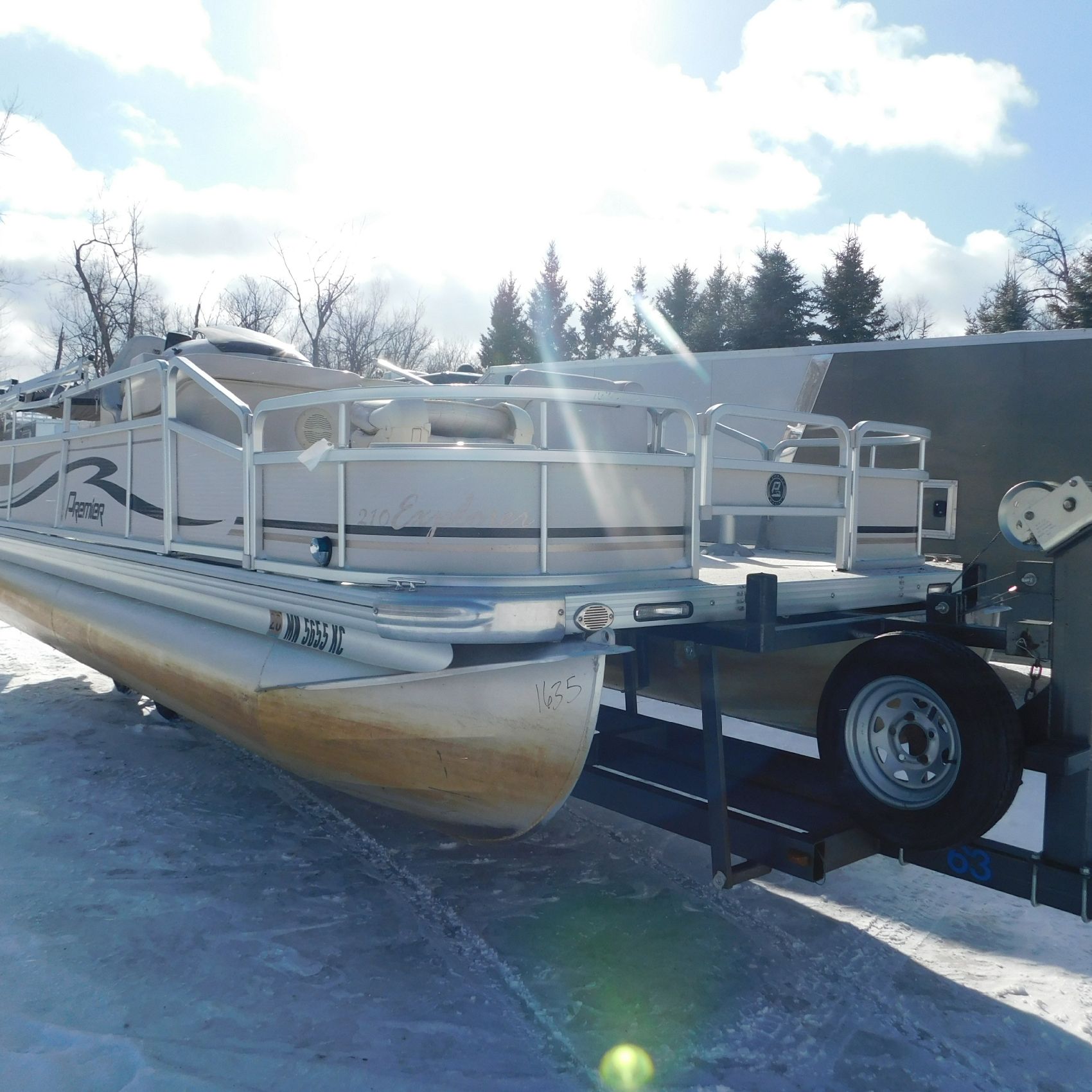 Coming to us is Stock #1635, a 2005 Premier 210 Explorer pontoon, 21 feet in length and equipped with a Honda 50HP 4‑Stroke that starts and runs. The battery and trailer are not included with this pontoon.