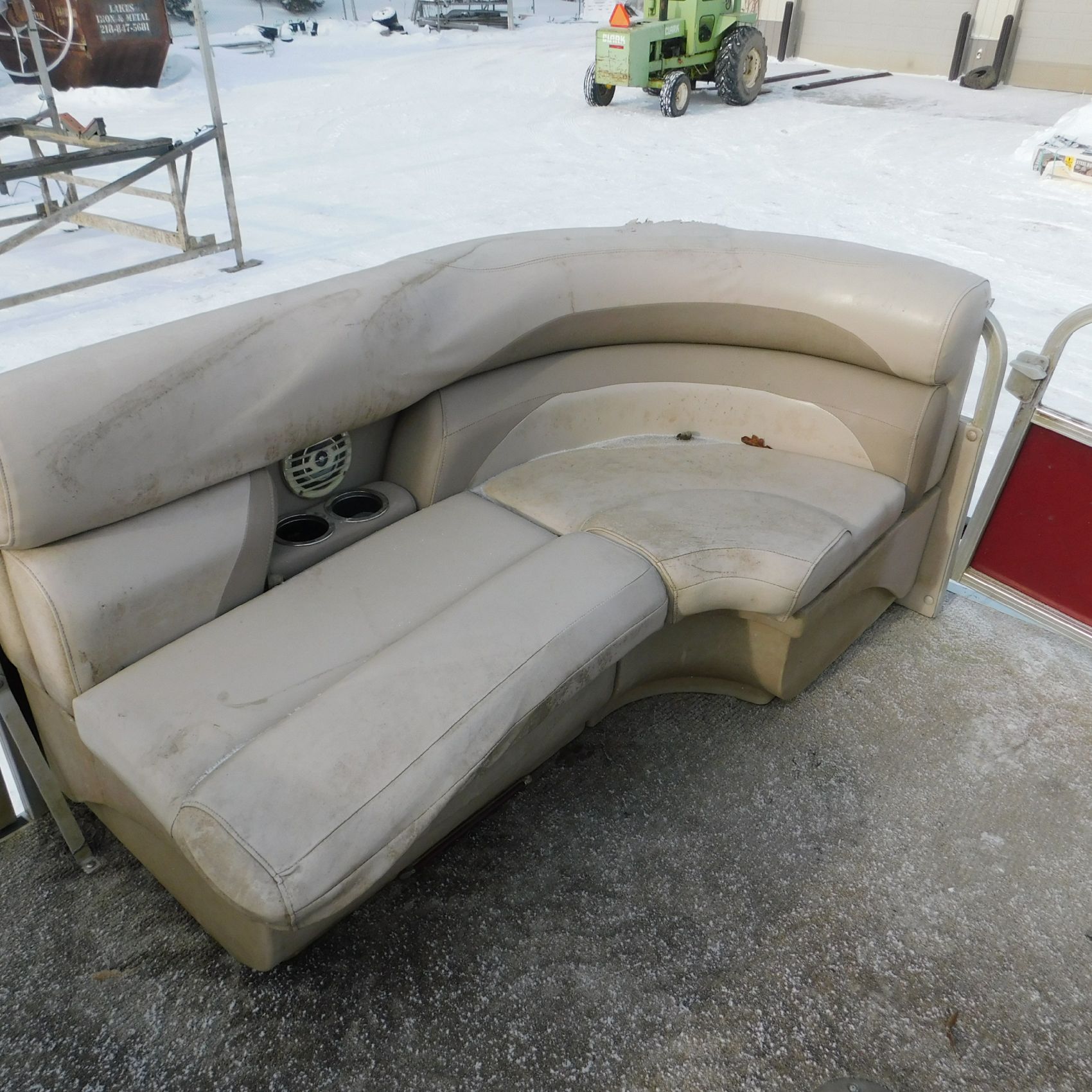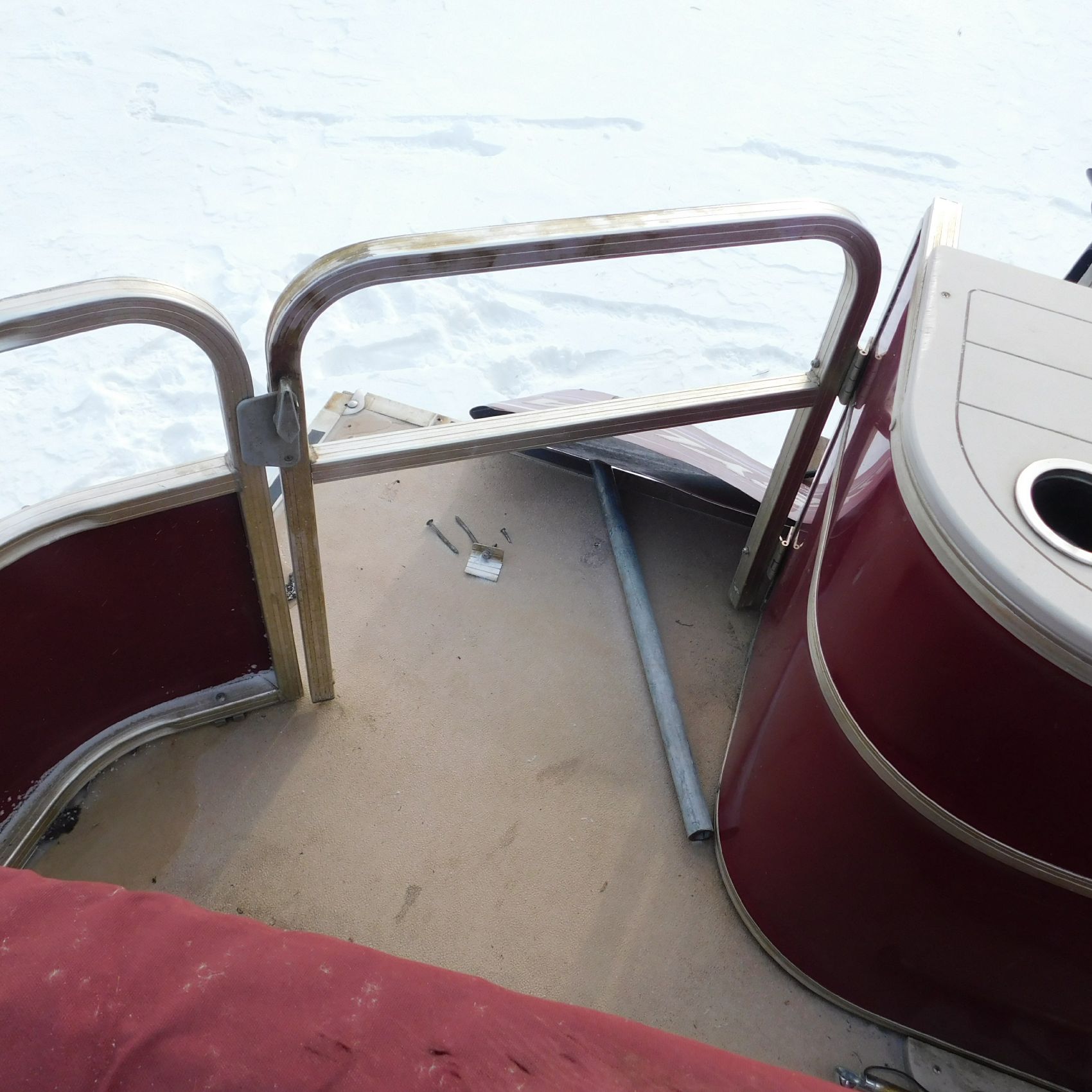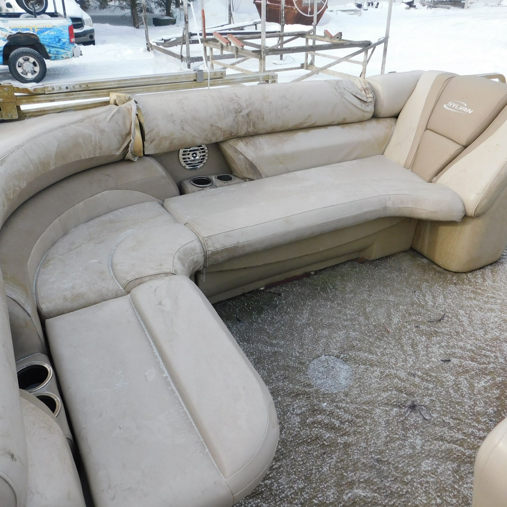 Moving to the Port (Left) side, the back of the center bench seat is ripped and torn and scuffed up, all the paneling is missing from the door all the way to the back, the toon has a large dent in the middle and noticeable scratches.